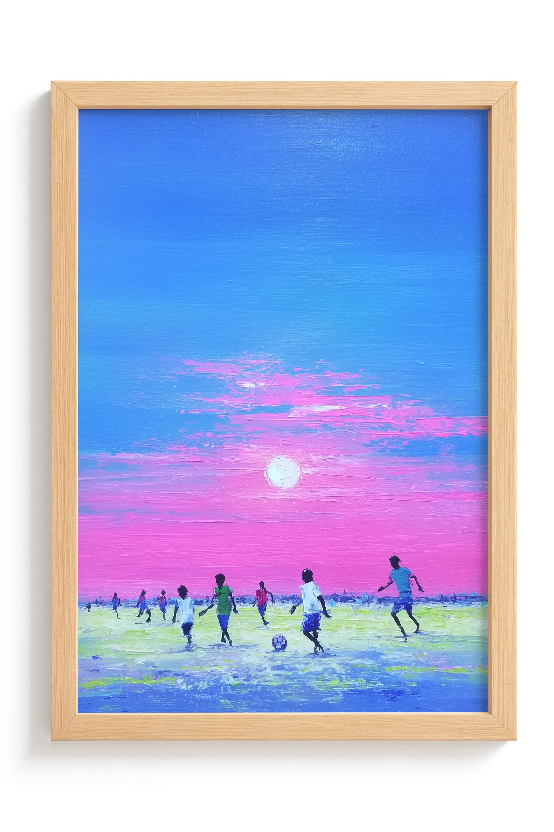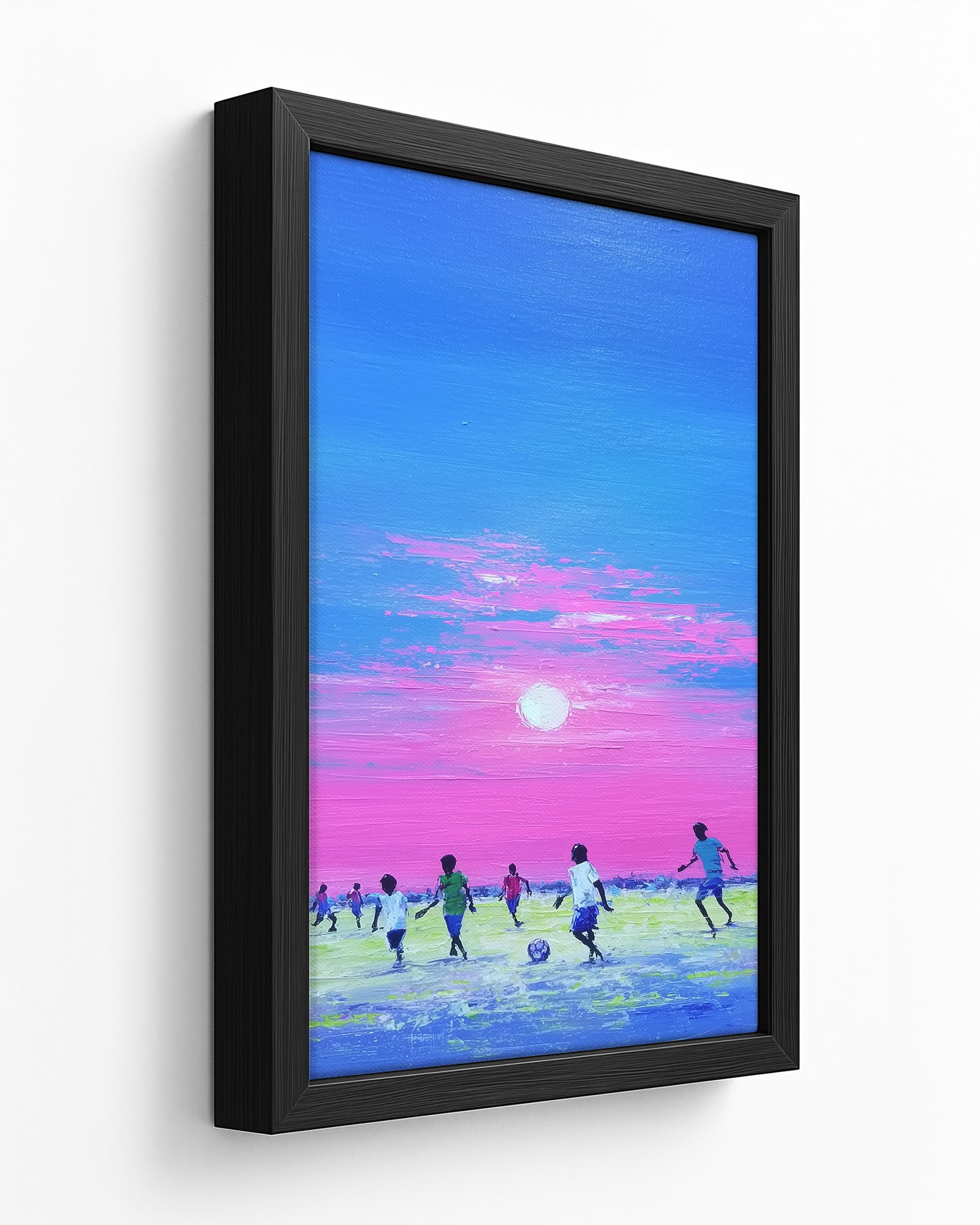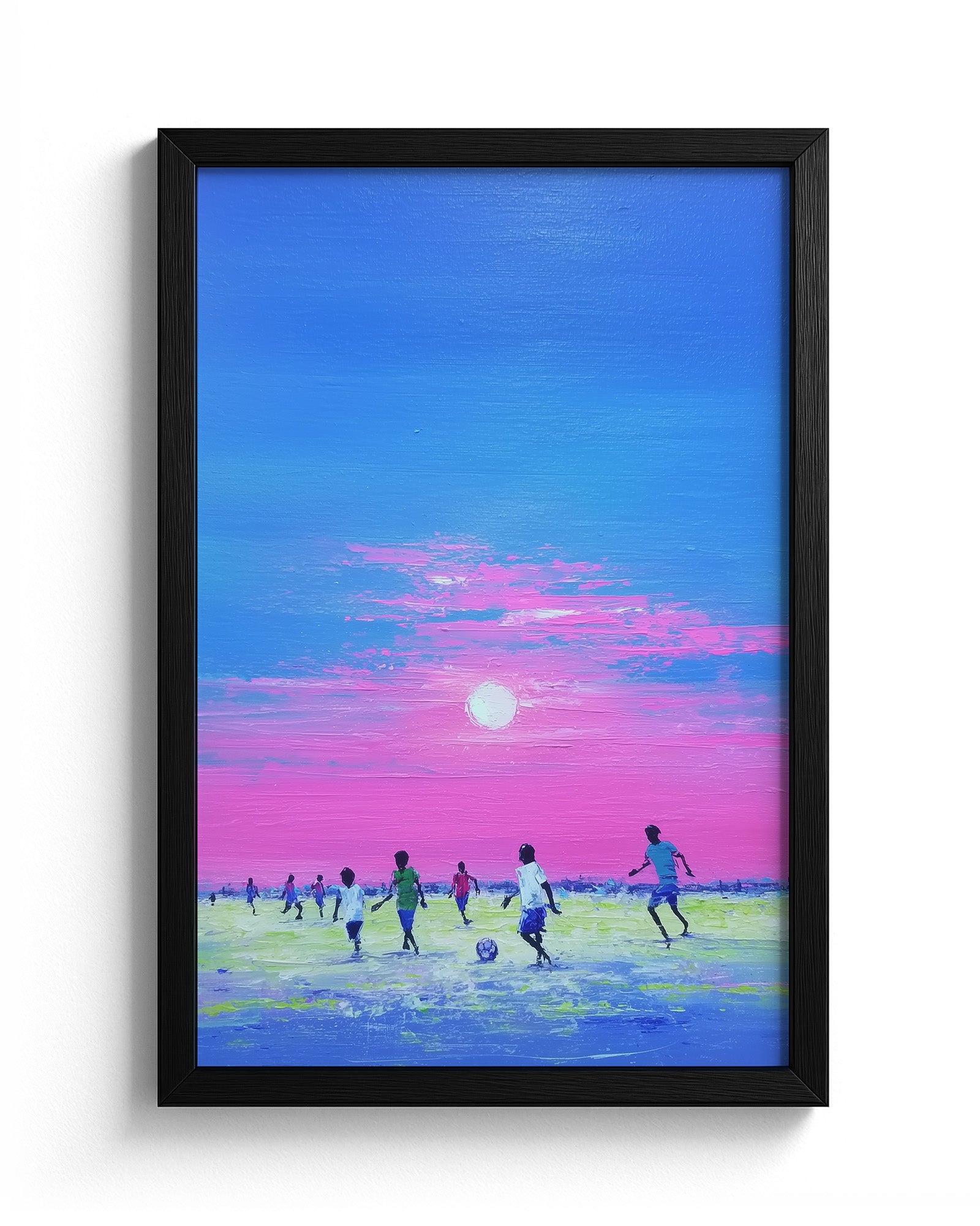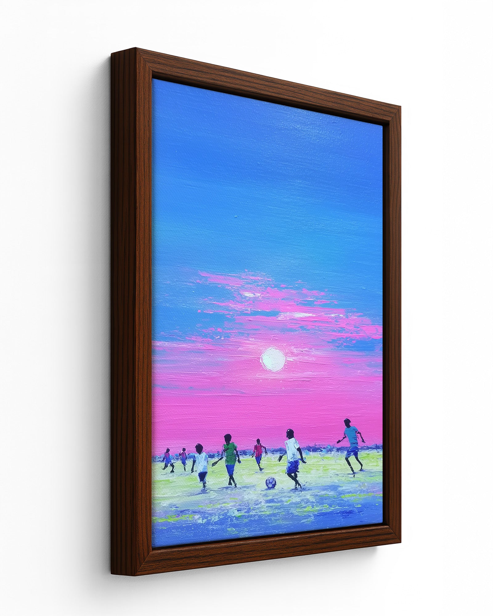 Evening Games: Art on Congo Childhood Joy, Embodied Freedom, and the Sacred Power of Children Playing in Congo's Light. This striking composition captures Congo children playing football barefoot on Congo ground beneath Congo's luminous sky, revealing how childhood play becomes primary expression of joy and freedom in the Congo.