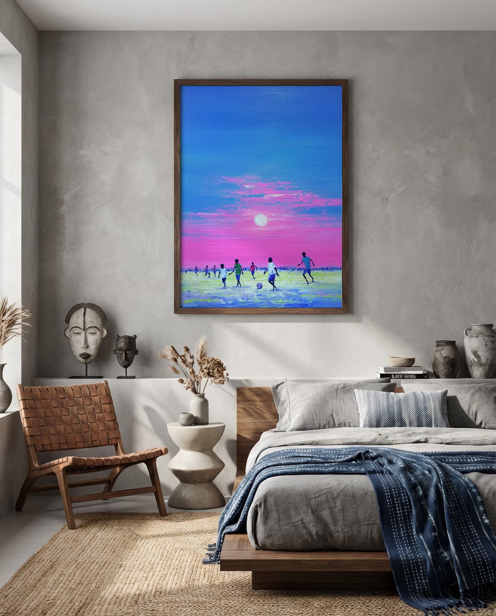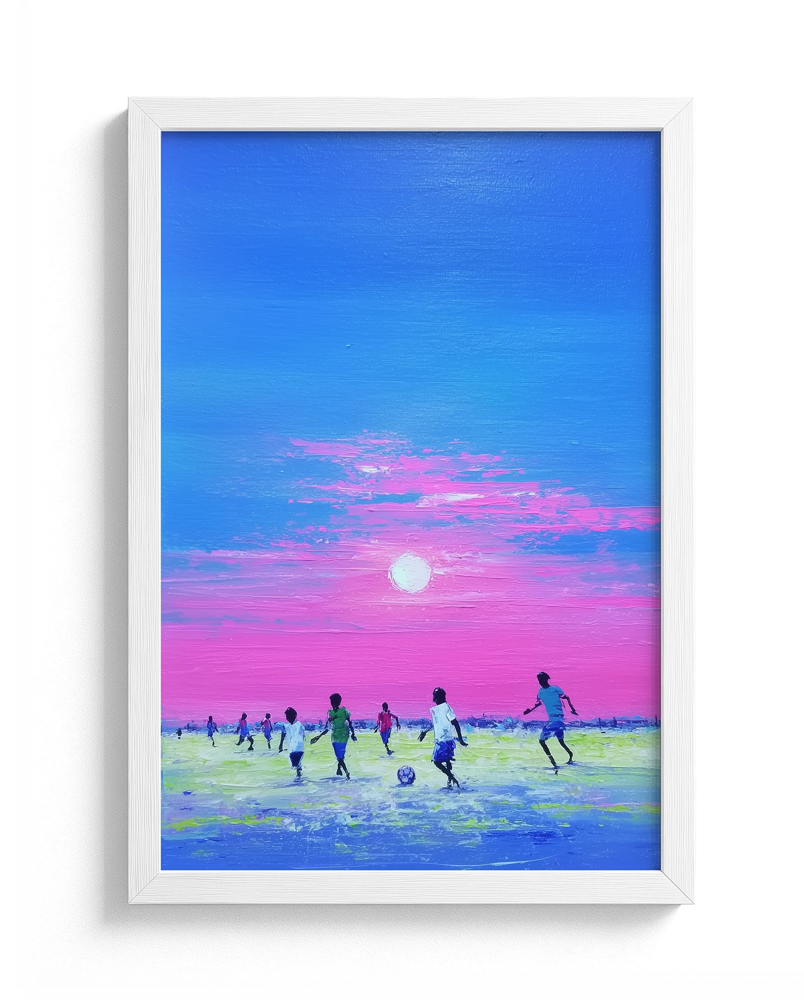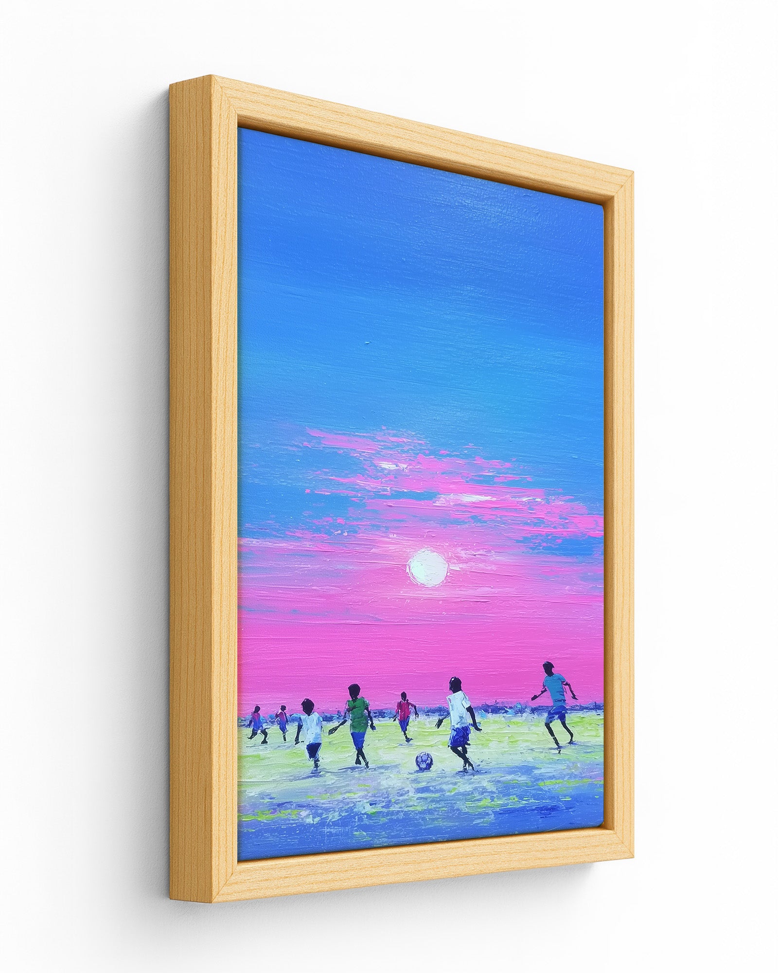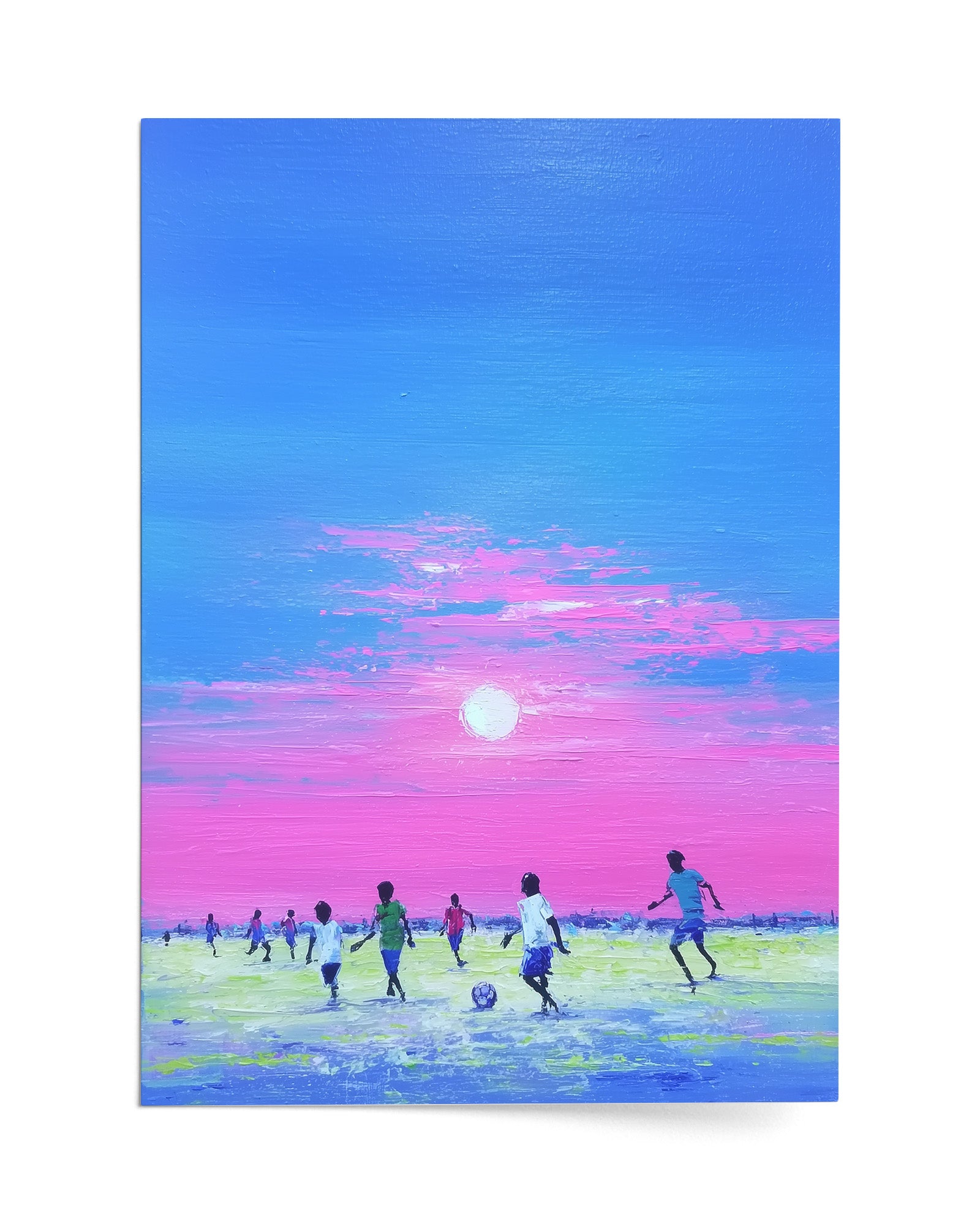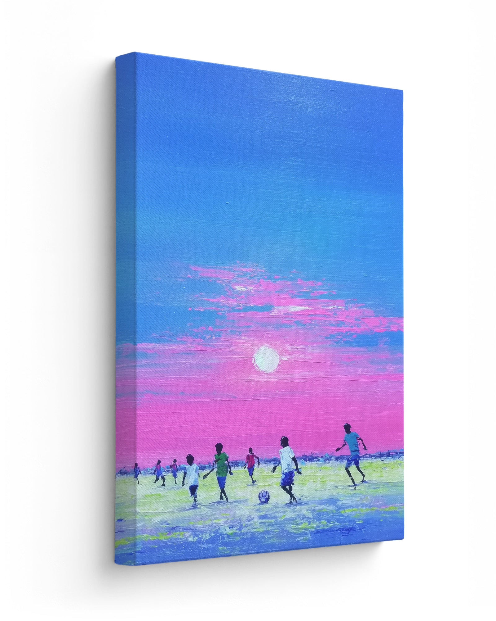 Evening Games: Art on Congo Childhood Joy, Embodied Freedom, and the Sacred Power of Children Playing in Congo's Light. This striking composition captures Congo children playing football barefoot on Congo ground beneath Congo's luminous sky, revealing how childhood play becomes primary expression of joy and freedom in the Congo.