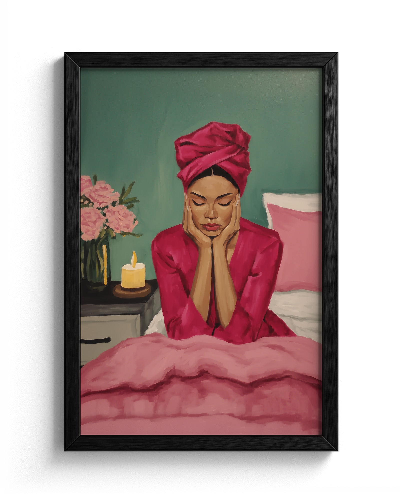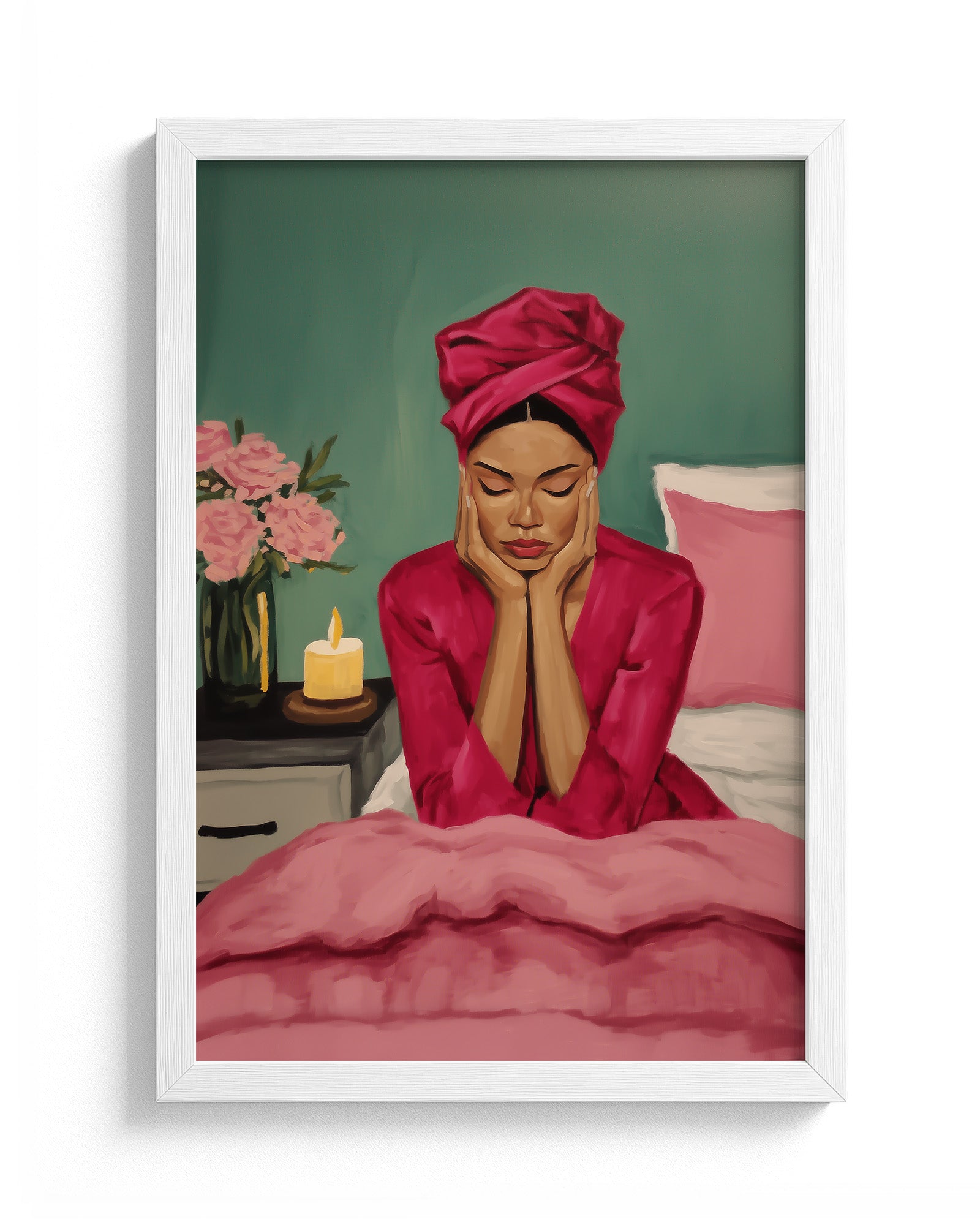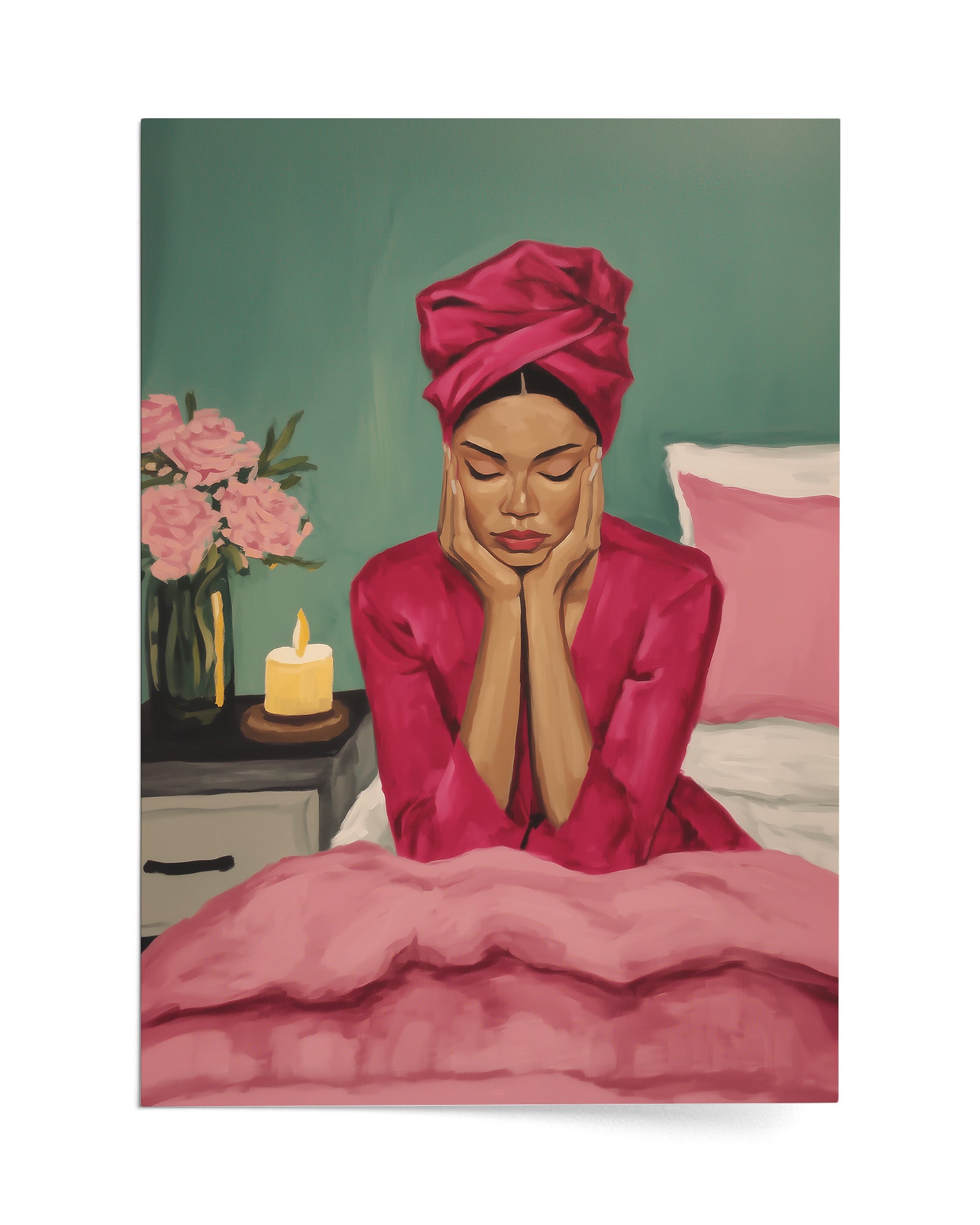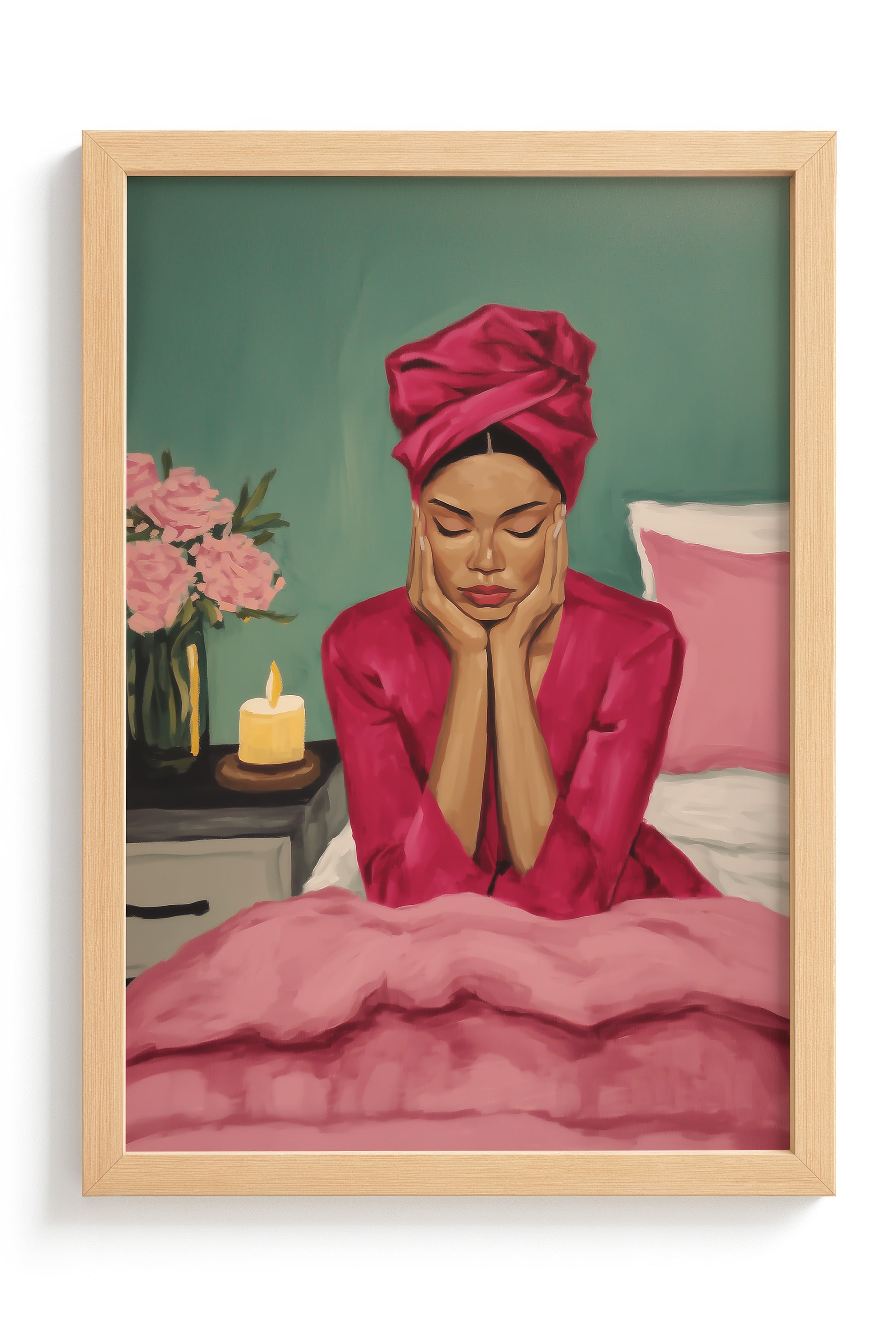 This beautiful artwork illustrates the sacred practice of pausing when emotions rise. The piece captures an intimate bedroom moment where self-care becomes a spiritual practice—a woman creating space for herself, or simply checking in with her own heart. The serenity of this piece reminds us that taking moments throughout the day to pause, breathe, and reconnect with yourself isn't indulgent—it's essential. It reminds us that the relationship you have with yourself deserves the same tender attention and love you give to others.