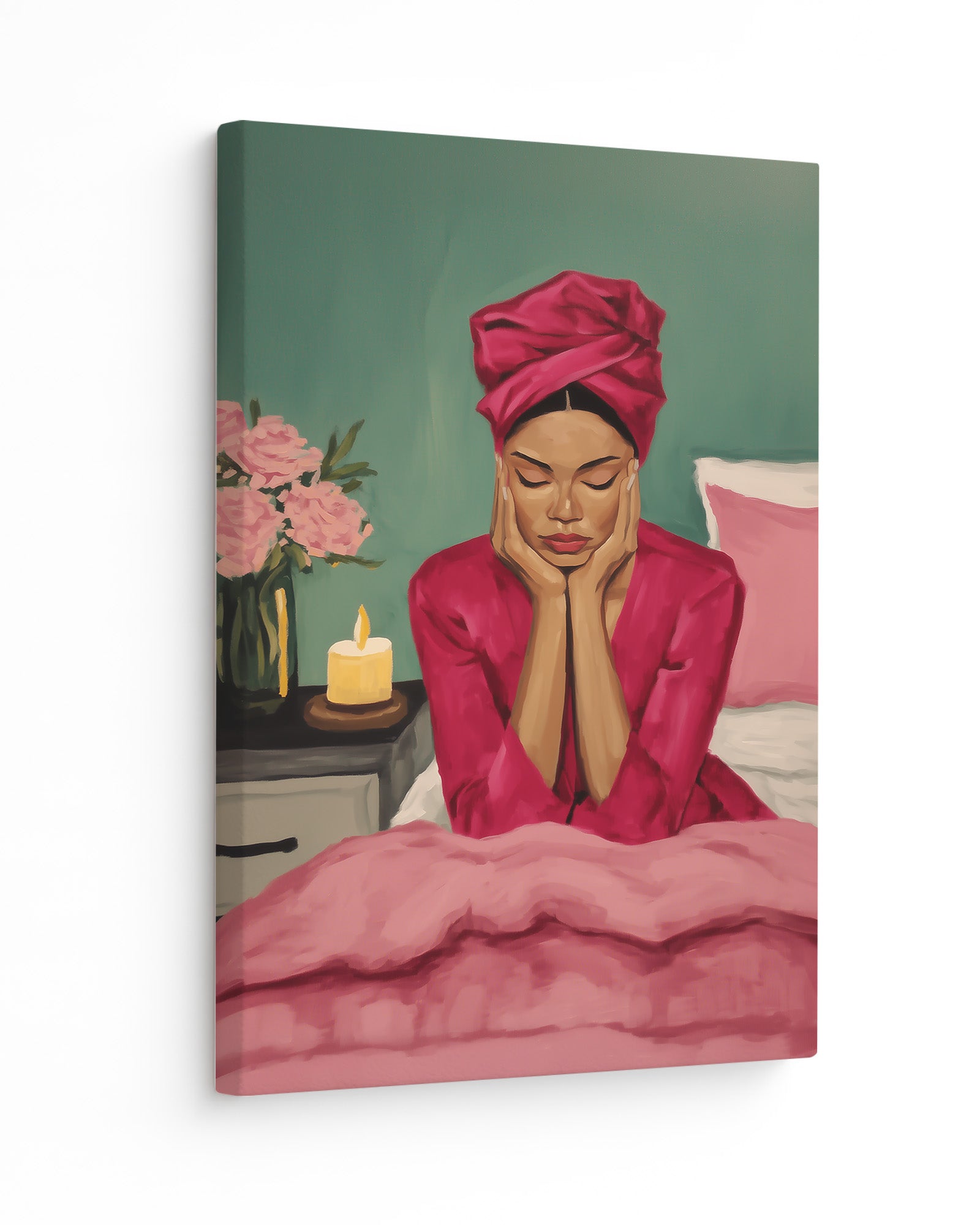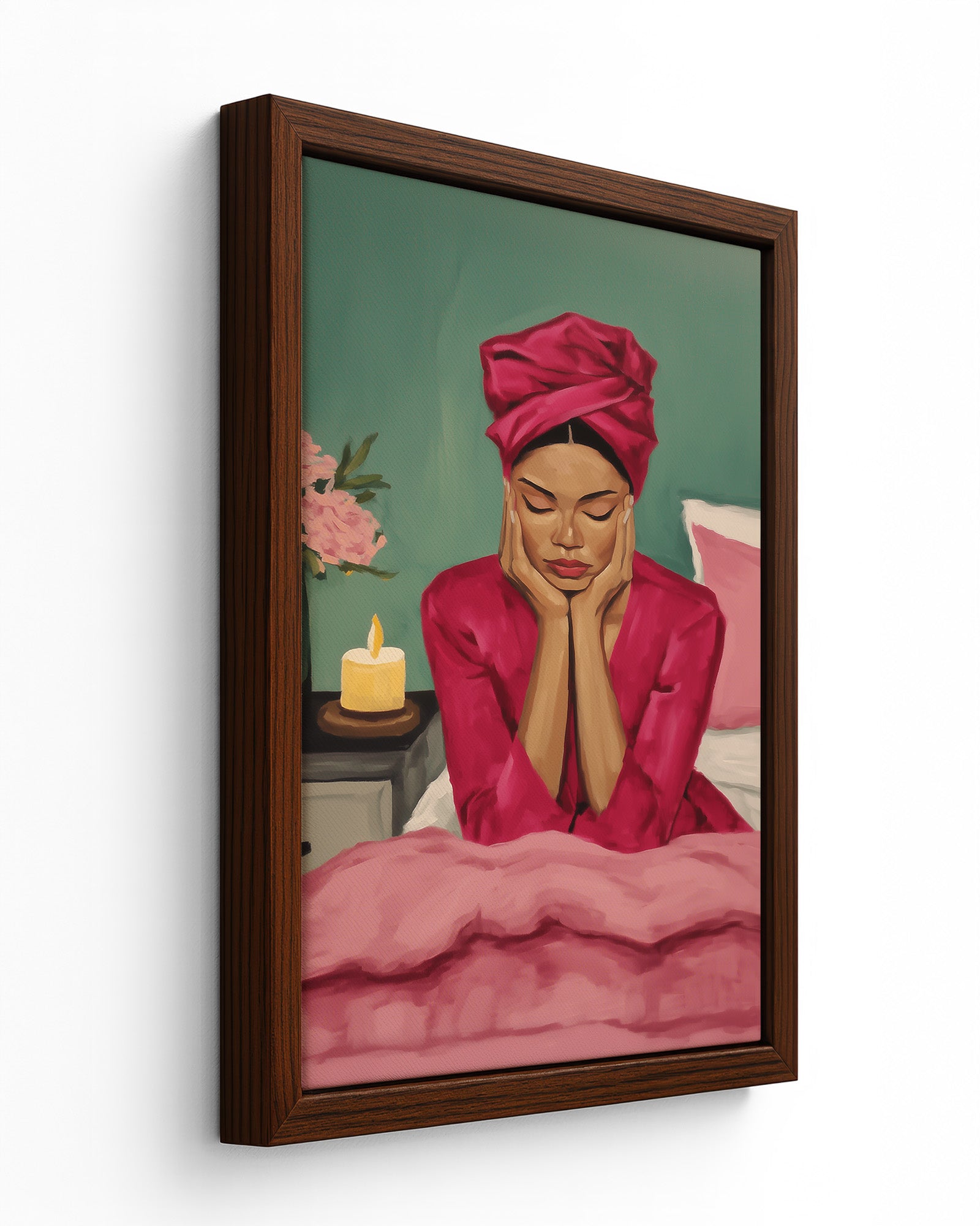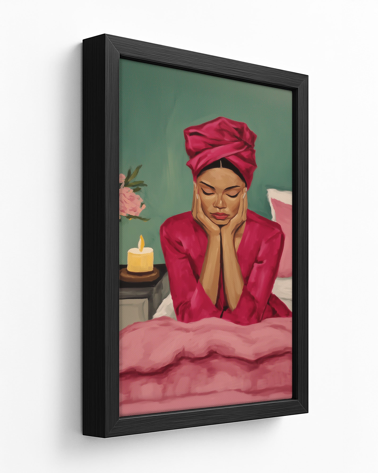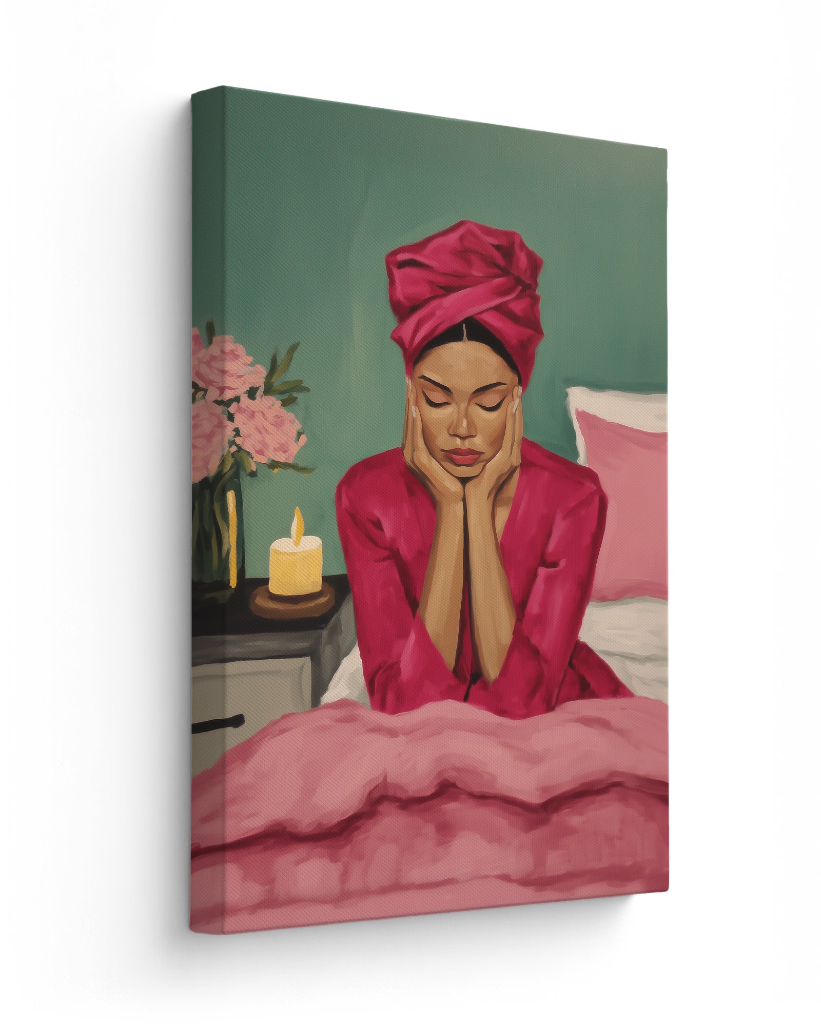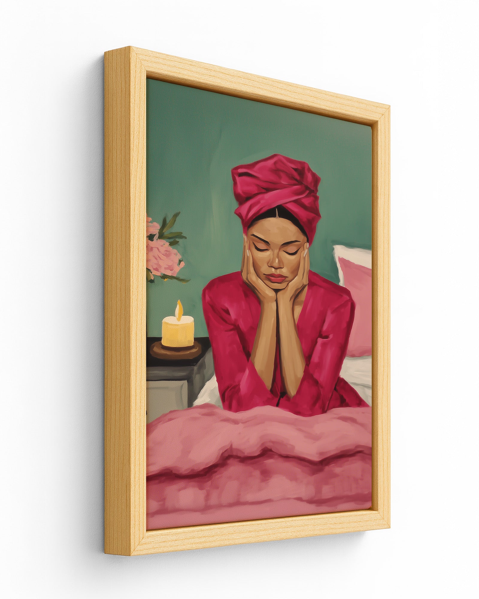 This beautiful artwork illustrates the sacred practice of pausing when emotions rise. The piece captures an intimate bedroom moment where self-care becomes a spiritual practice—a woman creating space for herself, or simply checking in with her own heart. The serenity of this piece reminds us that taking moments throughout the day to pause, breathe, and reconnect with yourself isn't indulgent—it's essential. It reminds us that the relationship you have with yourself deserves the same tender attention and love you give to others.