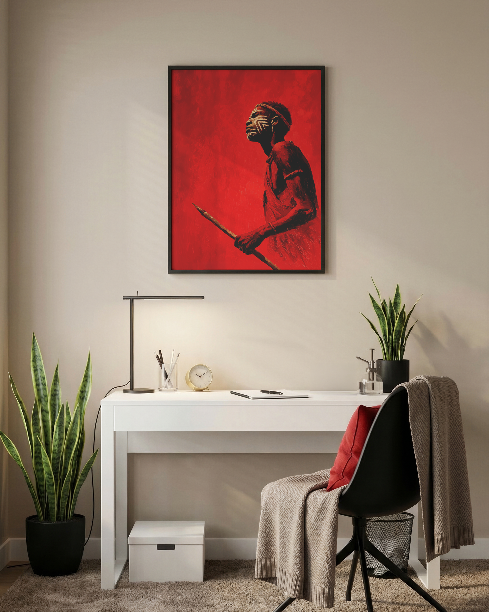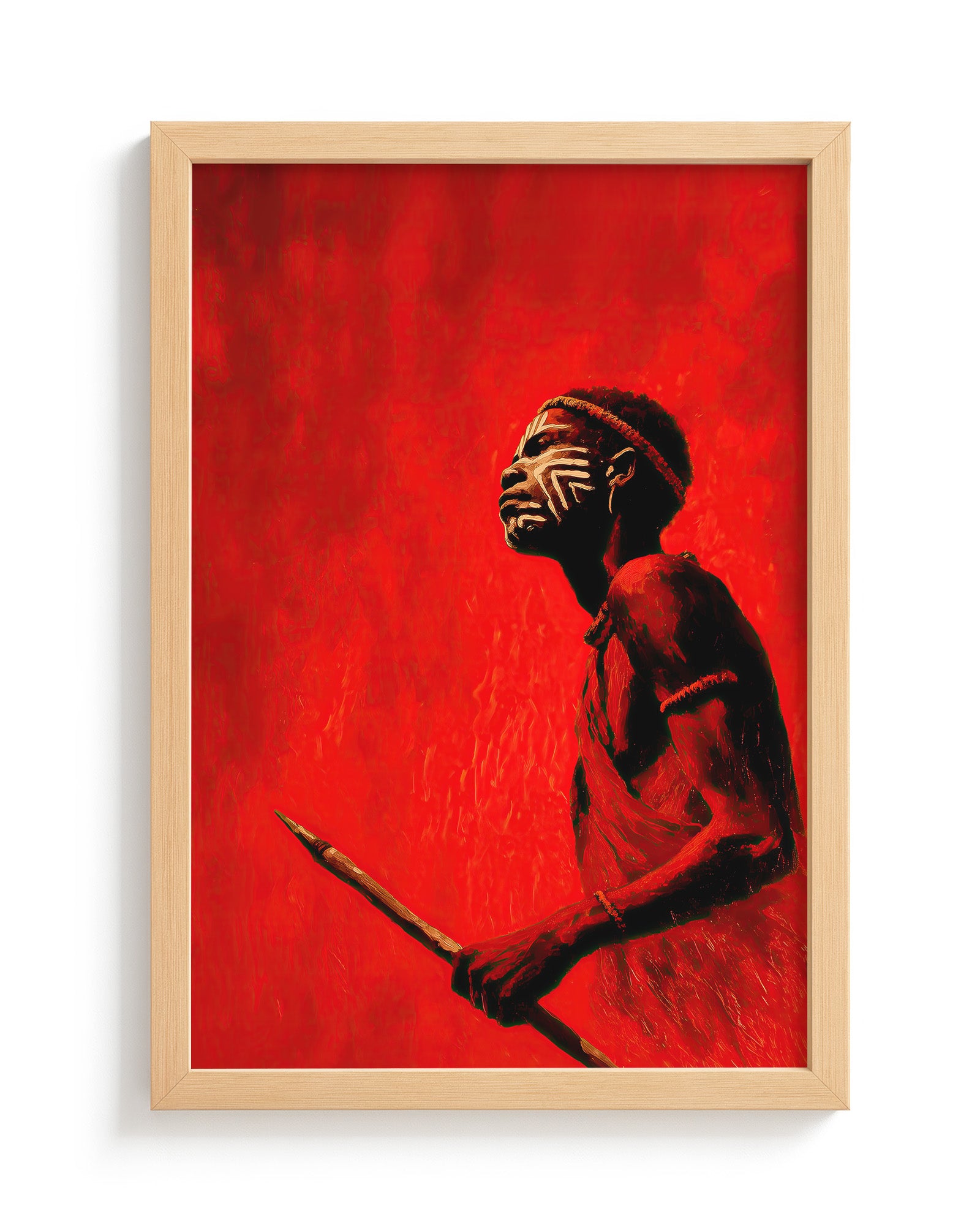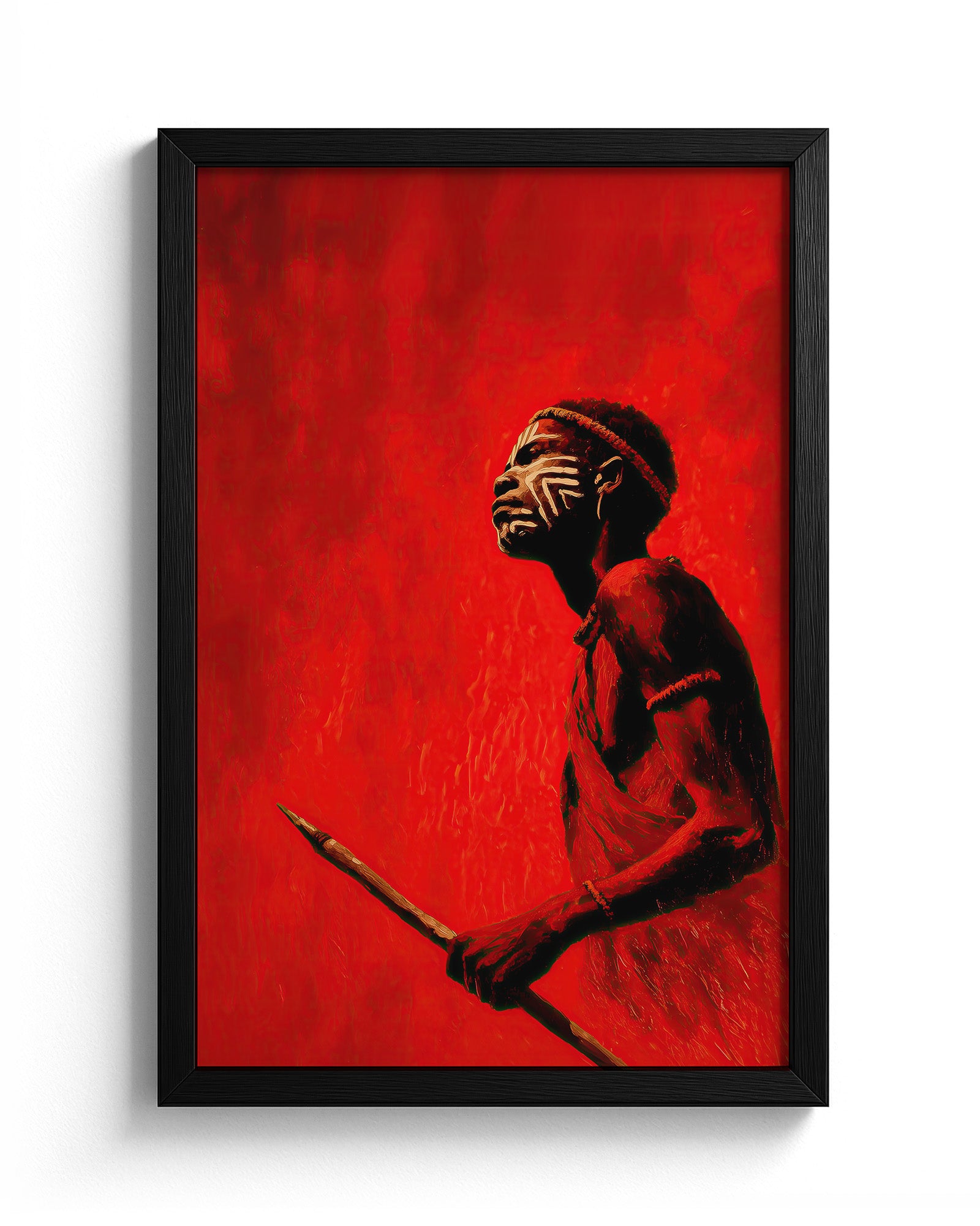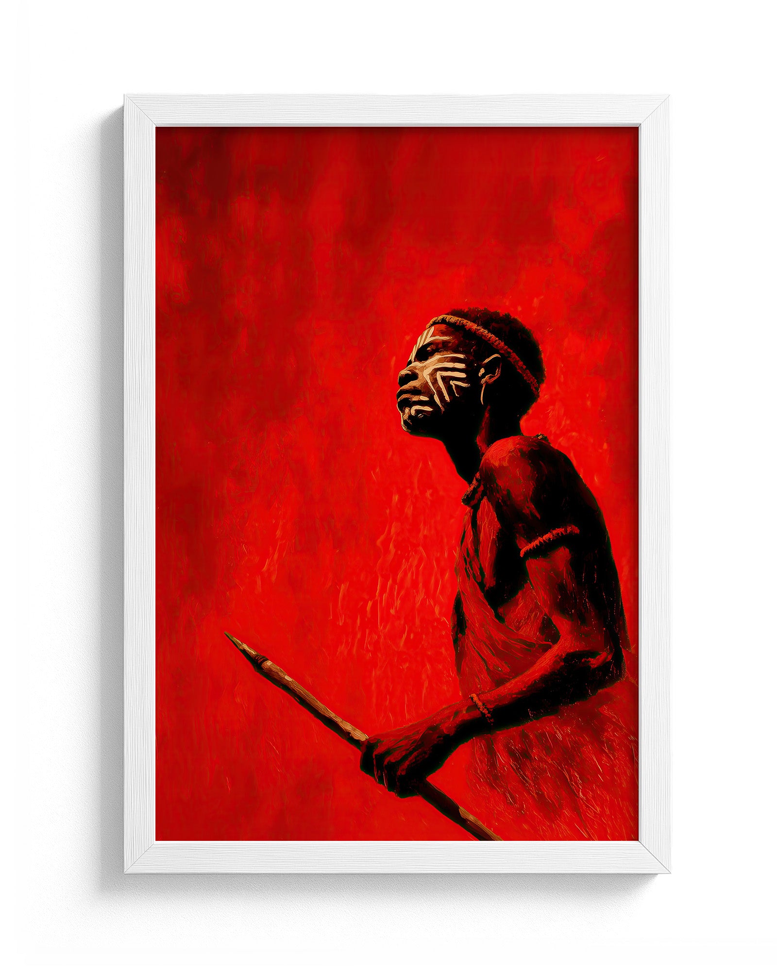Flame of the Valley is a powerful artwork capturing the strength and ceremonial beauty of traditional body painting from the Karo people of the Omo Valley. The figure stands against an intense red backdrop, holding a spear and gazing upward, adorned with striking white geometric face paint that reflects the rich artistic traditions of the region. The bold crimson palette symbolizes earth, sun, and vitality, while the minimalist composition draws attention to the intricate body art and cultural adornment. The result is a striking balance between contemporary visual design and timeless African inspiration.