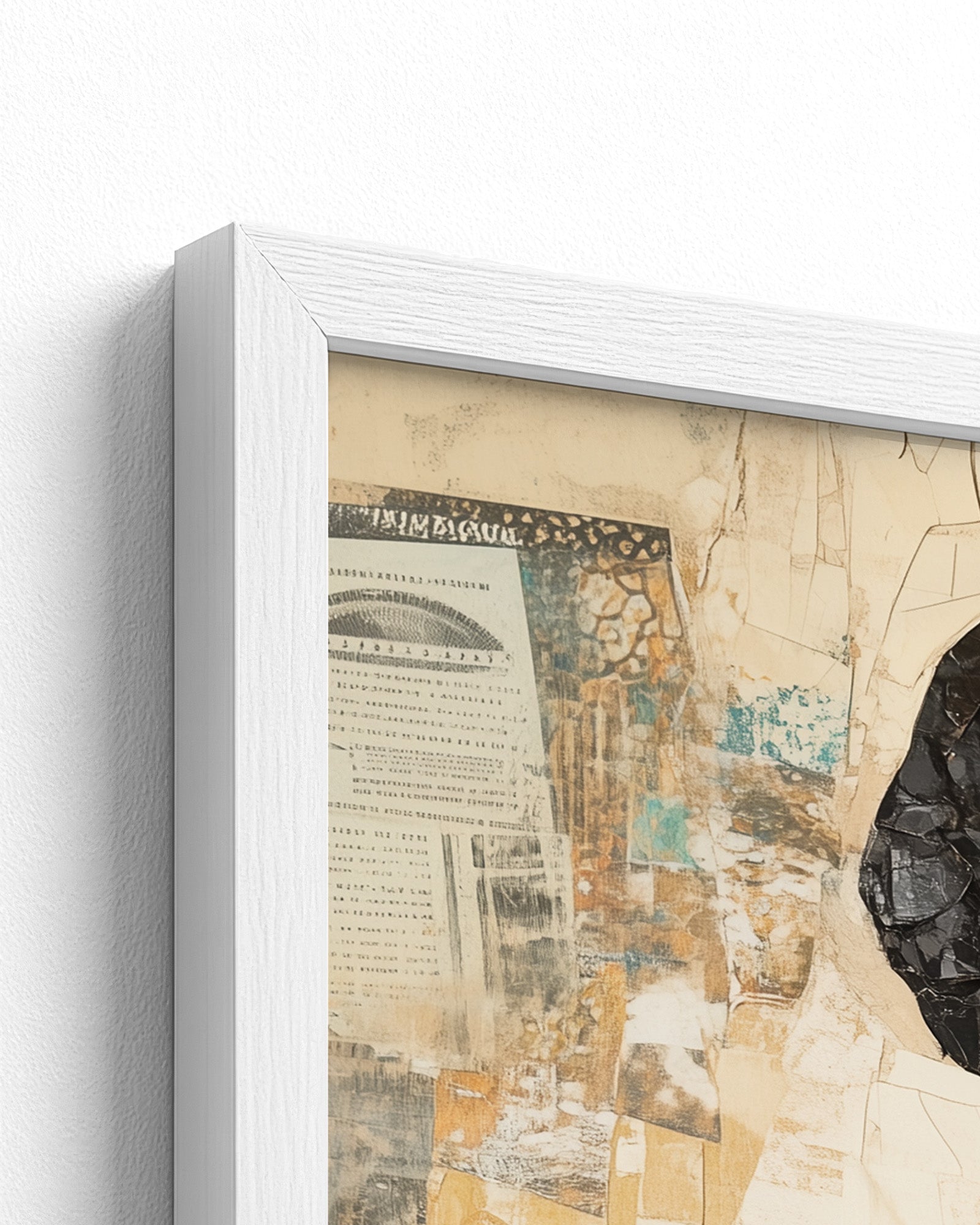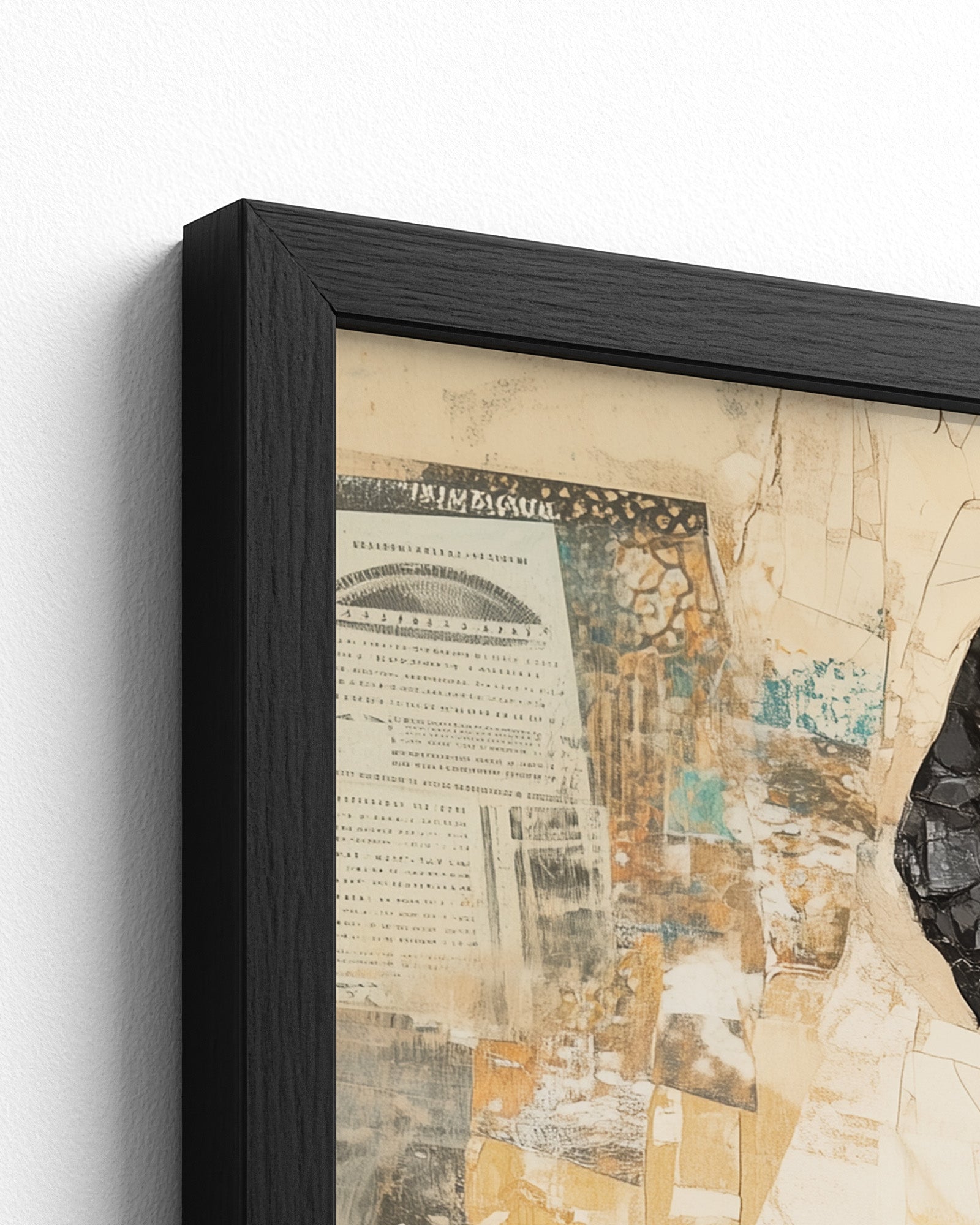 Elevate your space with this stunning minimalist collage art, celebrating African heritage and timeless elegance. A regal African woman, her silhouette adorned in vibrant, torn-paper textures, stands against a warm beige canvas.