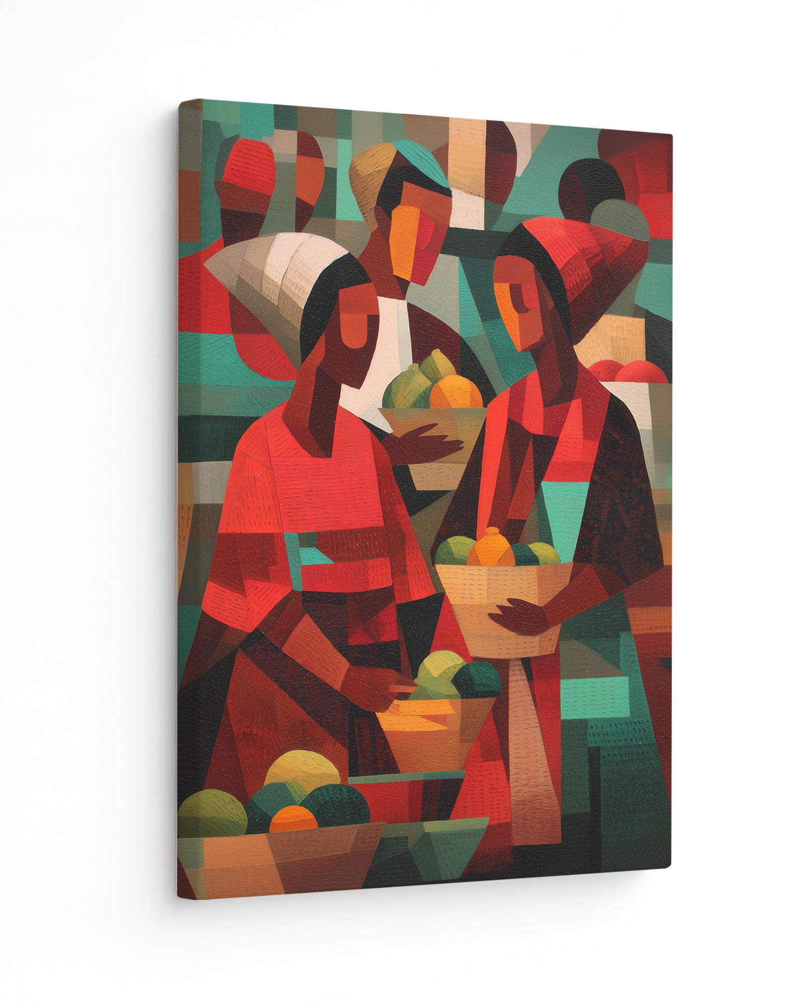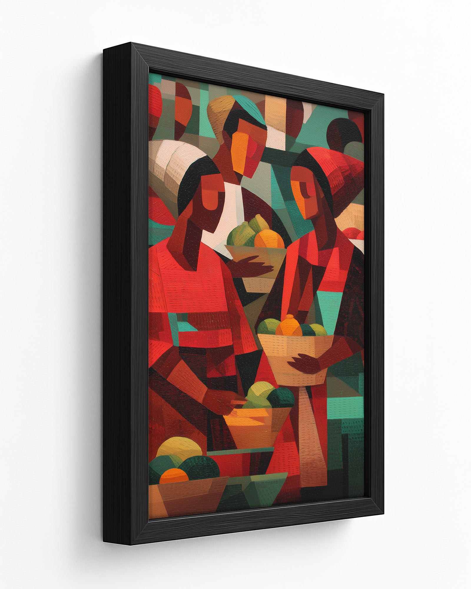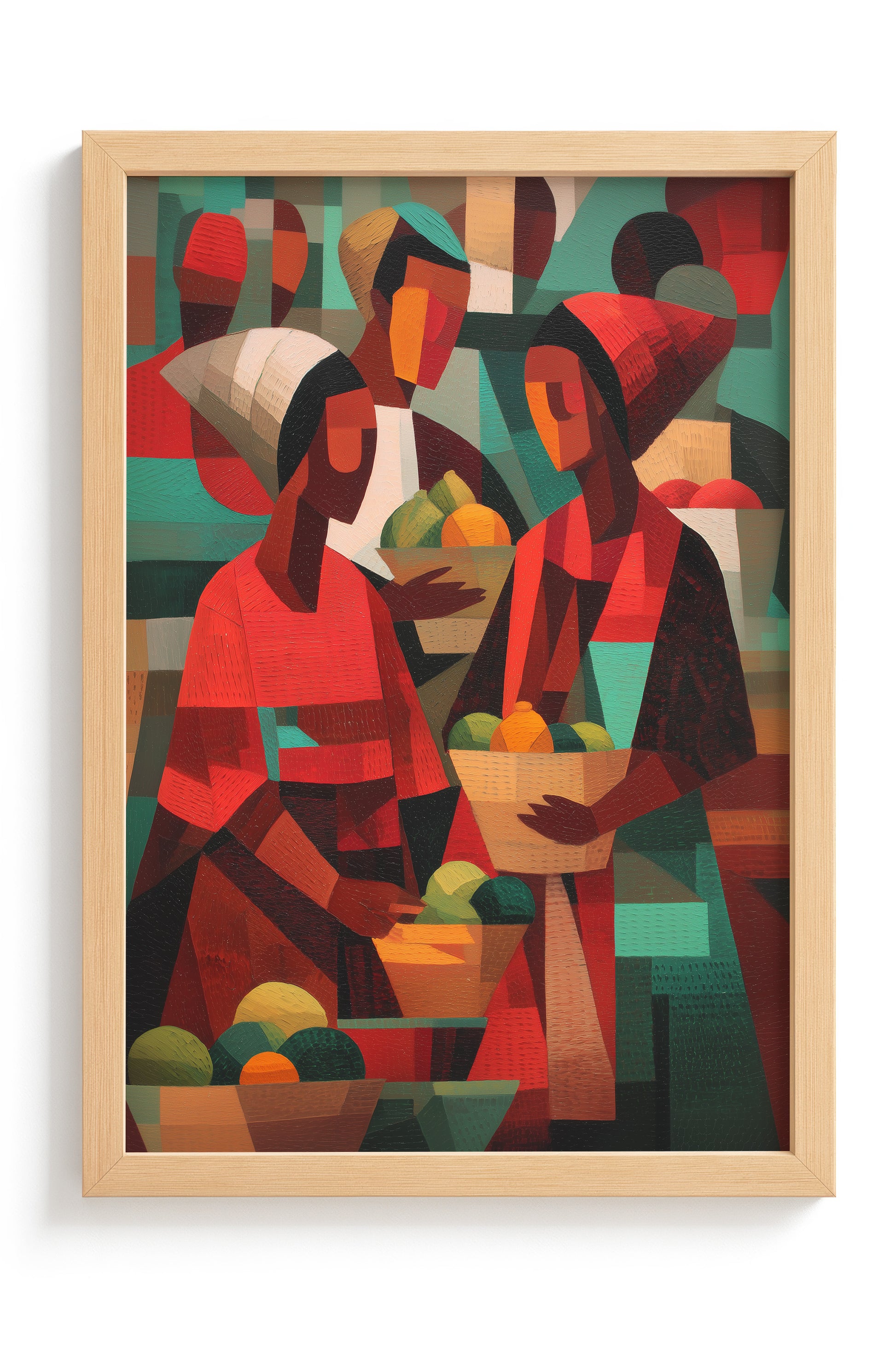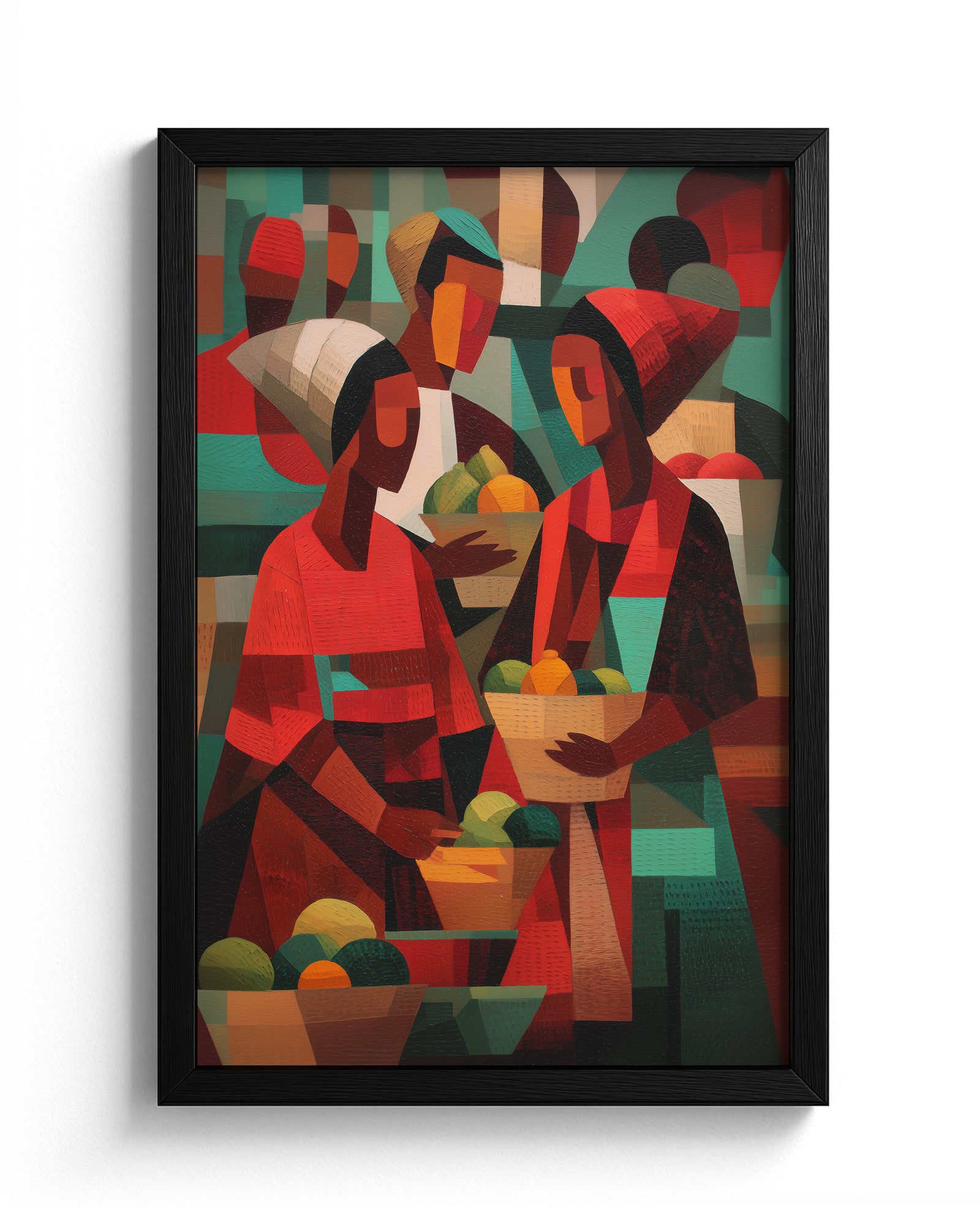Cubist-inspired Yoruba market scene of women exchanging baskets filled with fresh fruits and vegetables. Bold reds, greens, and oranges blend into a geometric rhythm, symbolizing abundance, trade, and cultural heritage.