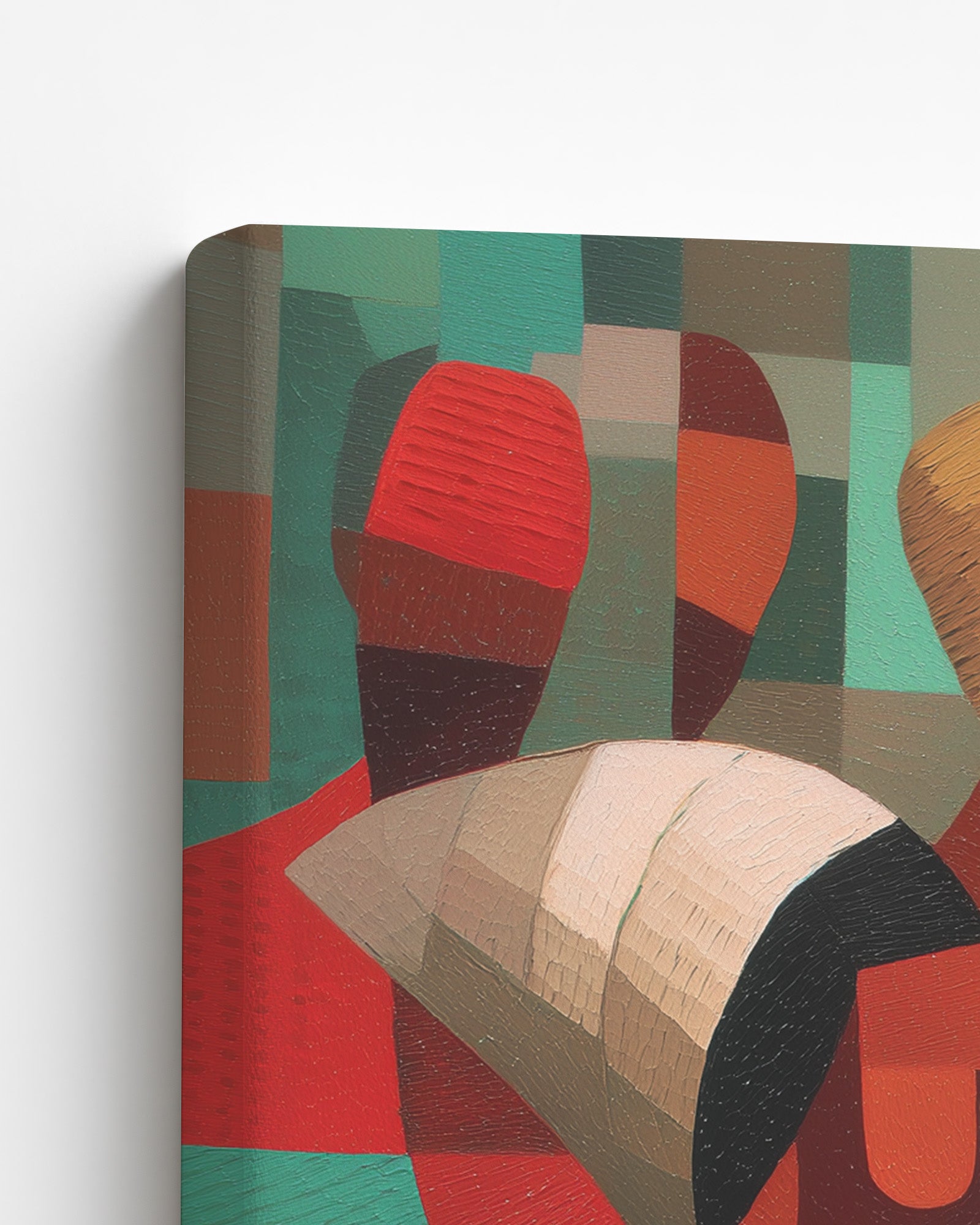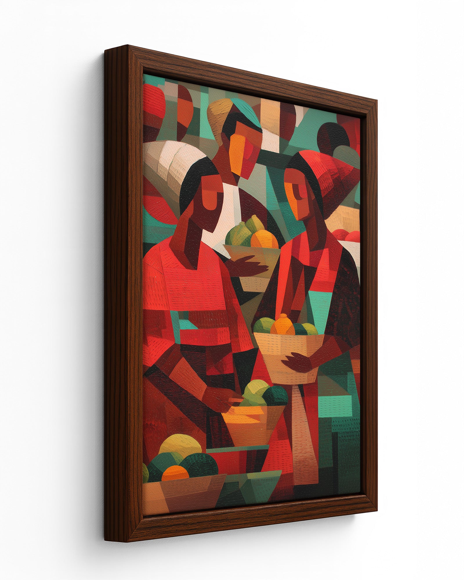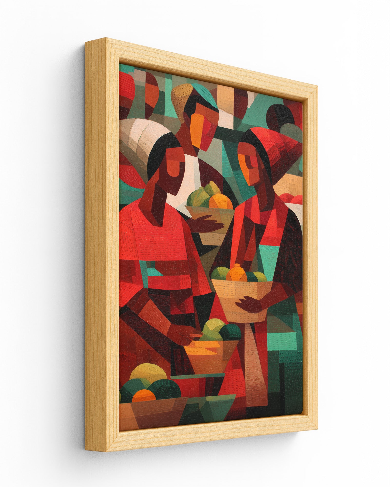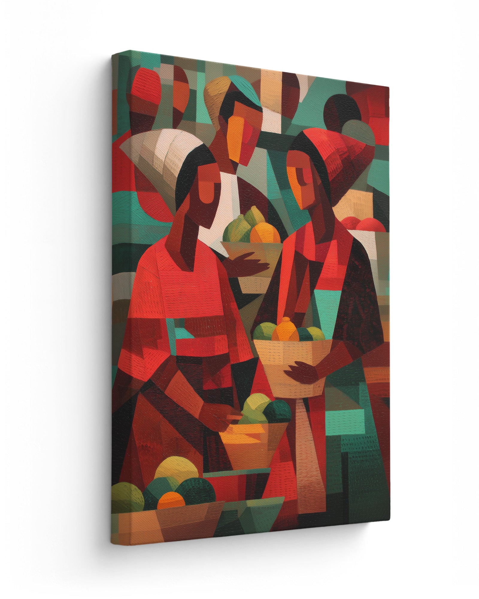 Cubist-inspired Yoruba market scene of women exchanging baskets filled with fresh fruits and vegetables. Bold reds, greens, and oranges blend into a geometric rhythm, symbolizing abundance, trade, and cultural heritage.