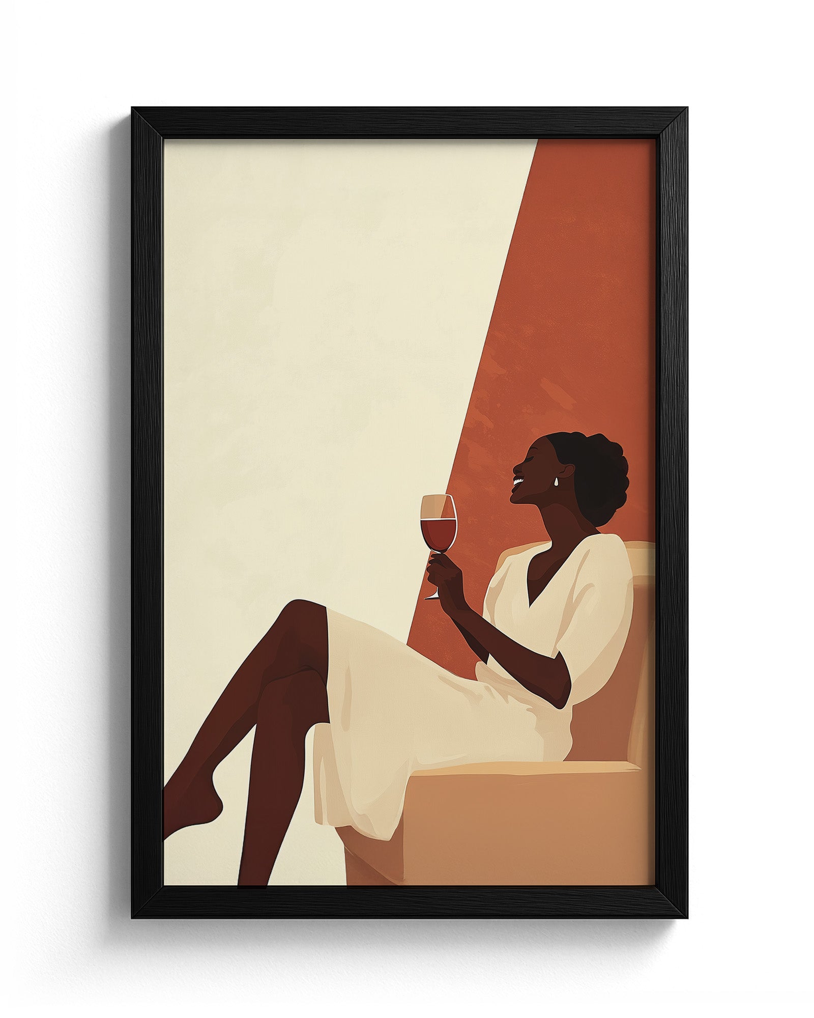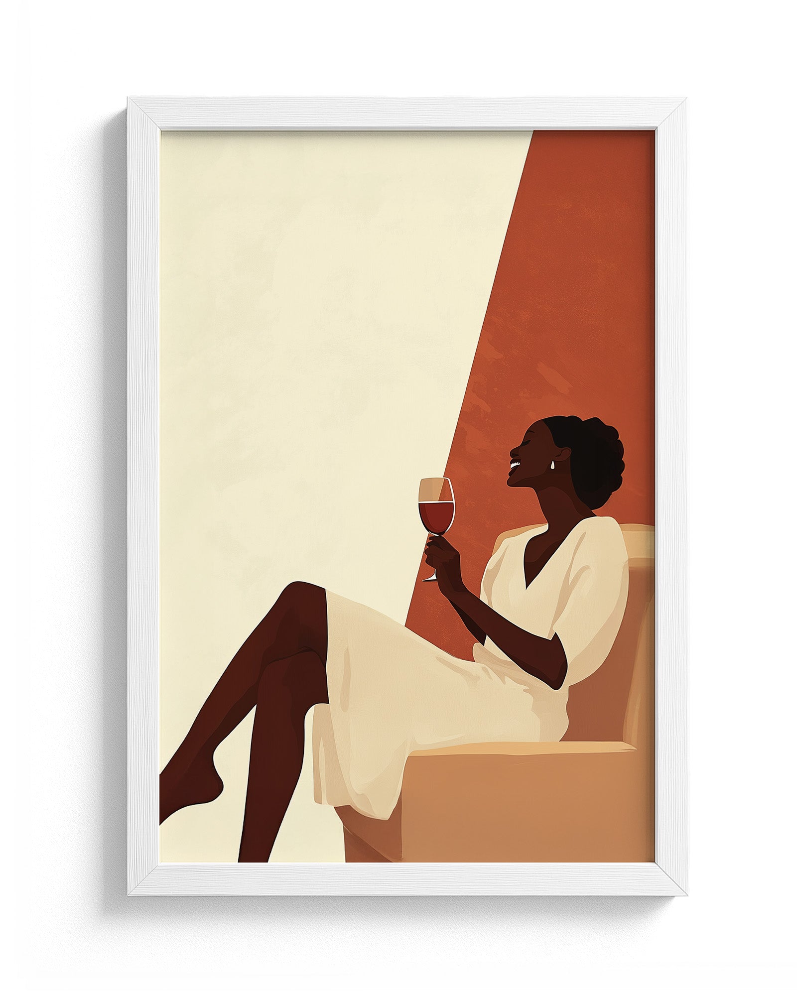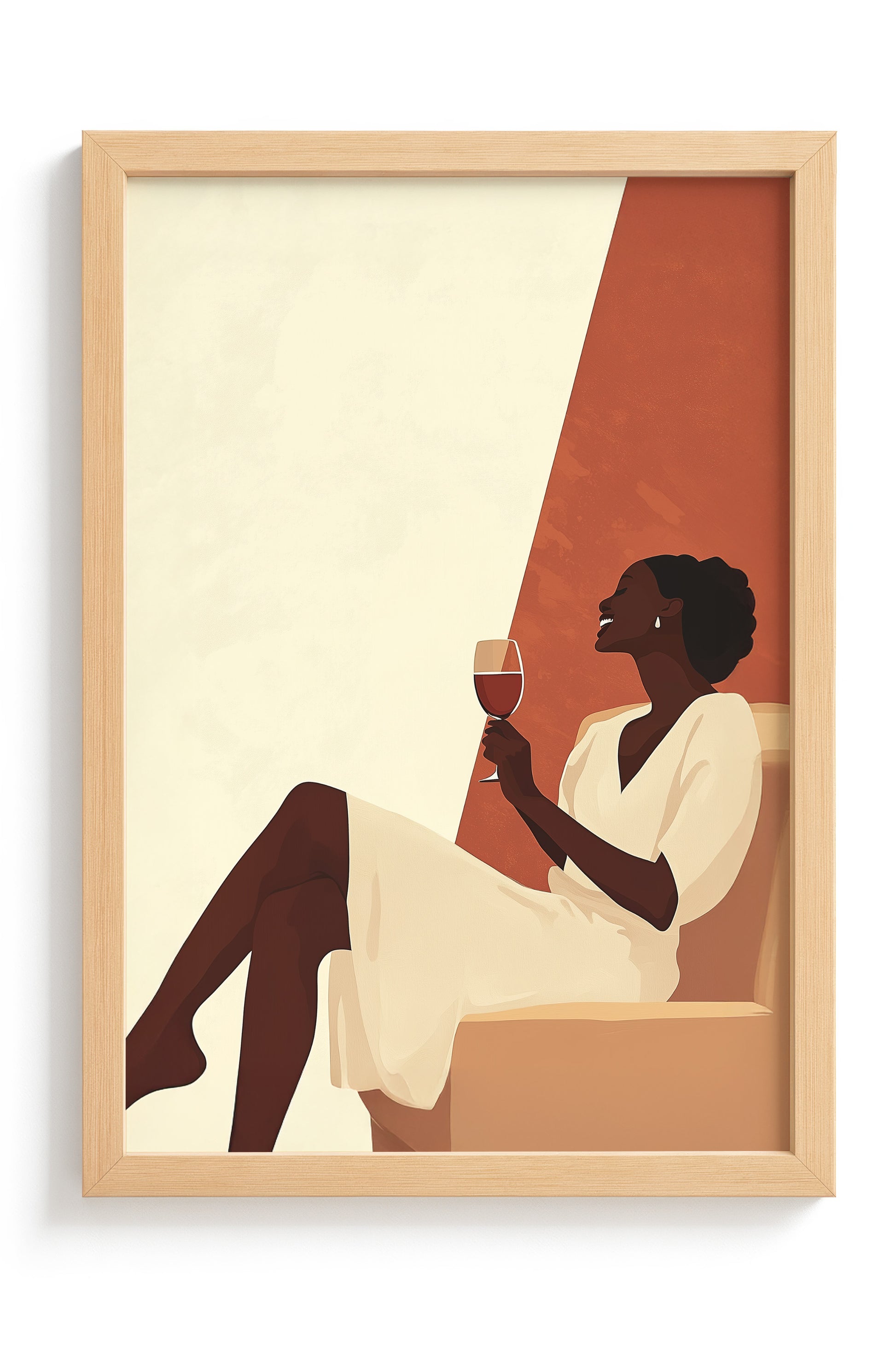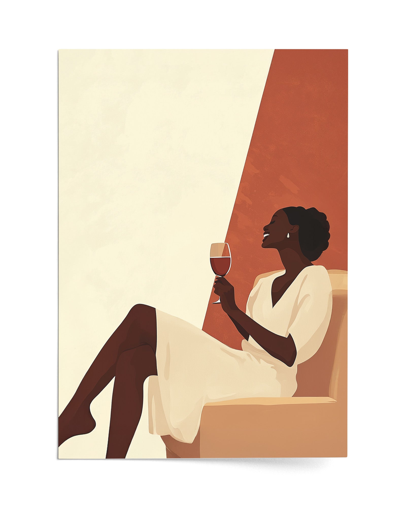 This joyful, minimalist illustration depicts a radiant woman in a flowing ivory dress, lost in laughter with a glass of red wine gently cradled in her hand. The bold composition pairs clean, modern shapes with a warm terracotta and cream palette, creating a harmonious contrast that draws the eye to her vibrant expression.