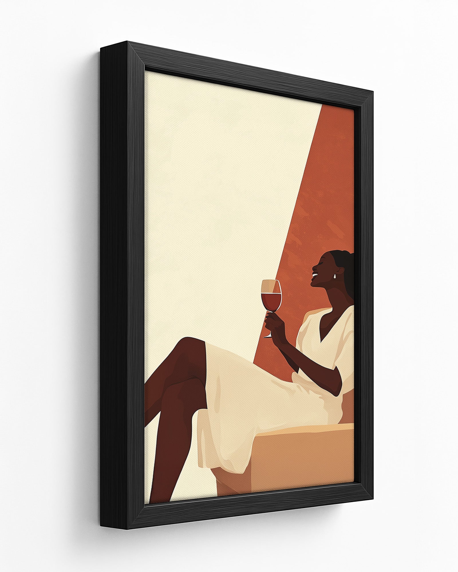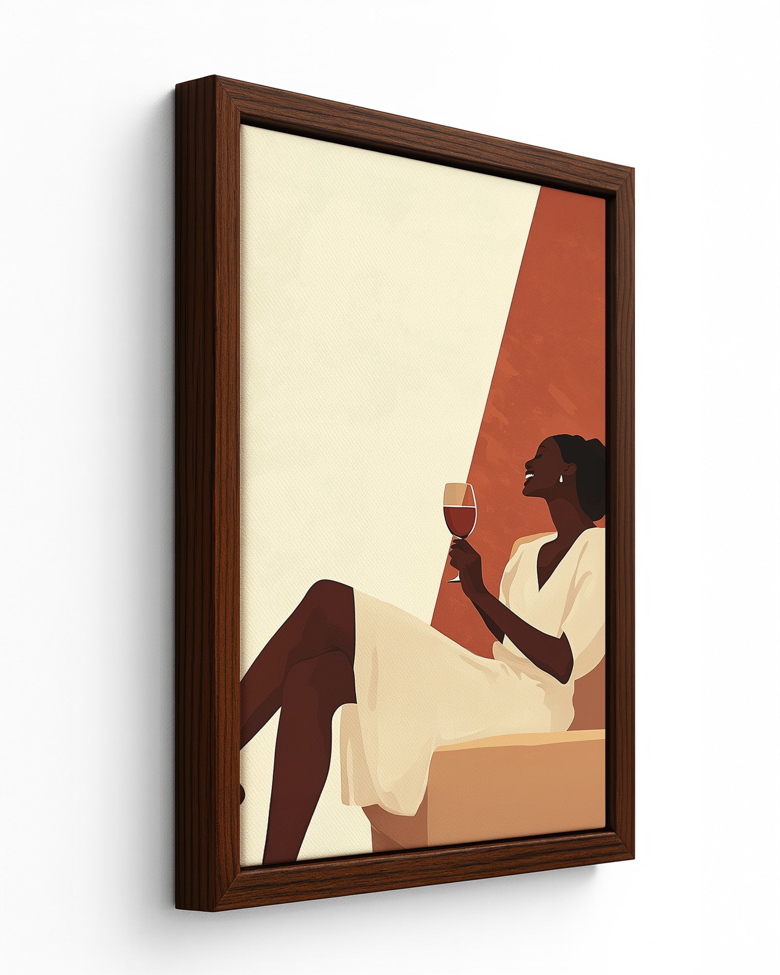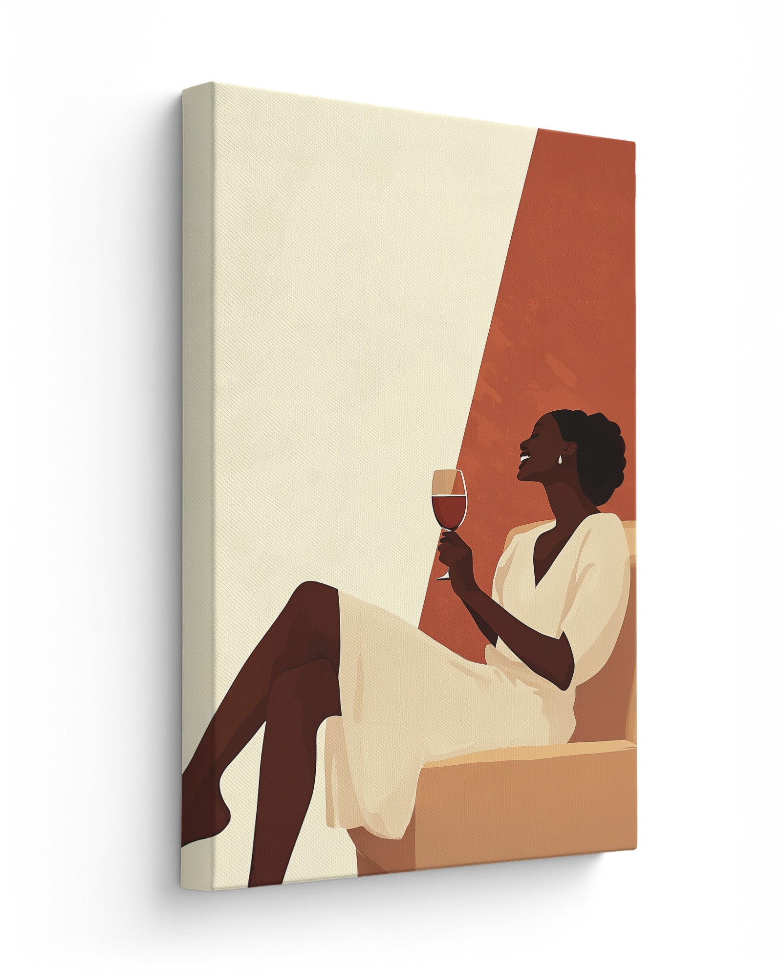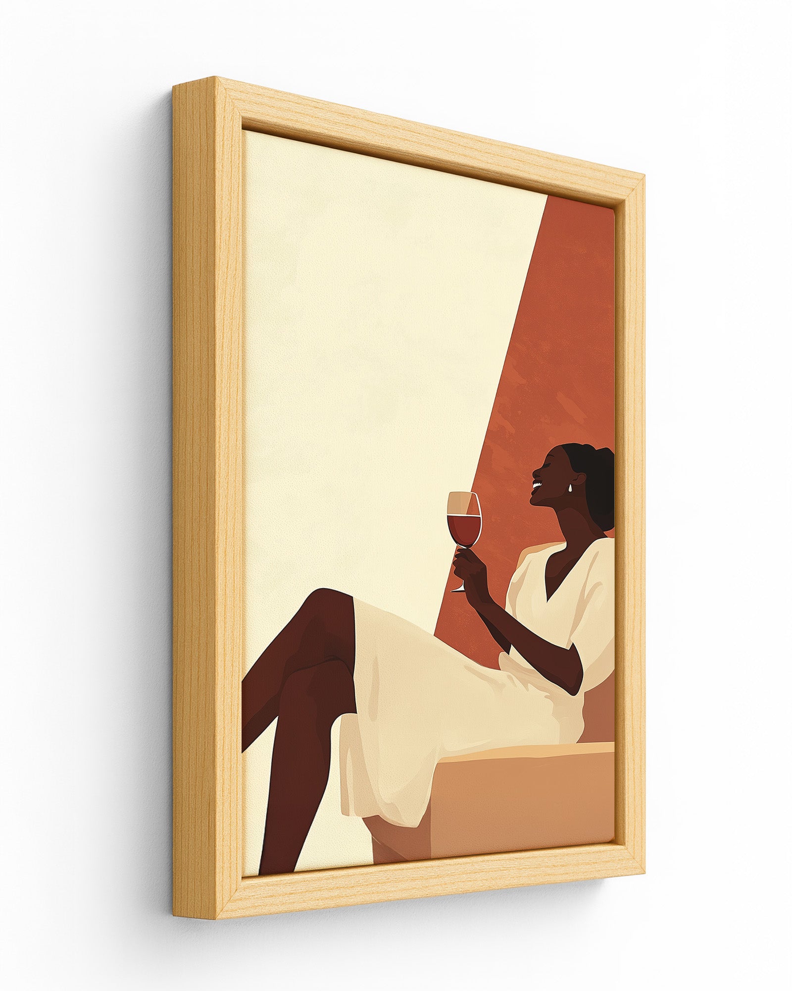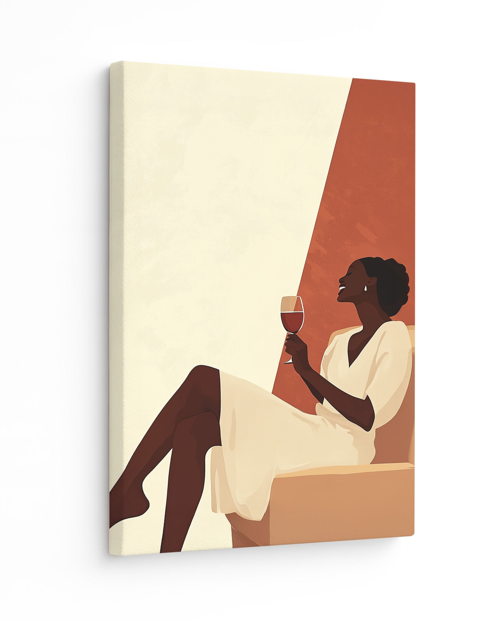 This joyful, minimalist illustration depicts a radiant woman in a flowing ivory dress, lost in laughter with a glass of red wine gently cradled in her hand. The bold composition pairs clean, modern shapes with a warm terracotta and cream palette, creating a harmonious contrast that draws the eye to her vibrant expression.