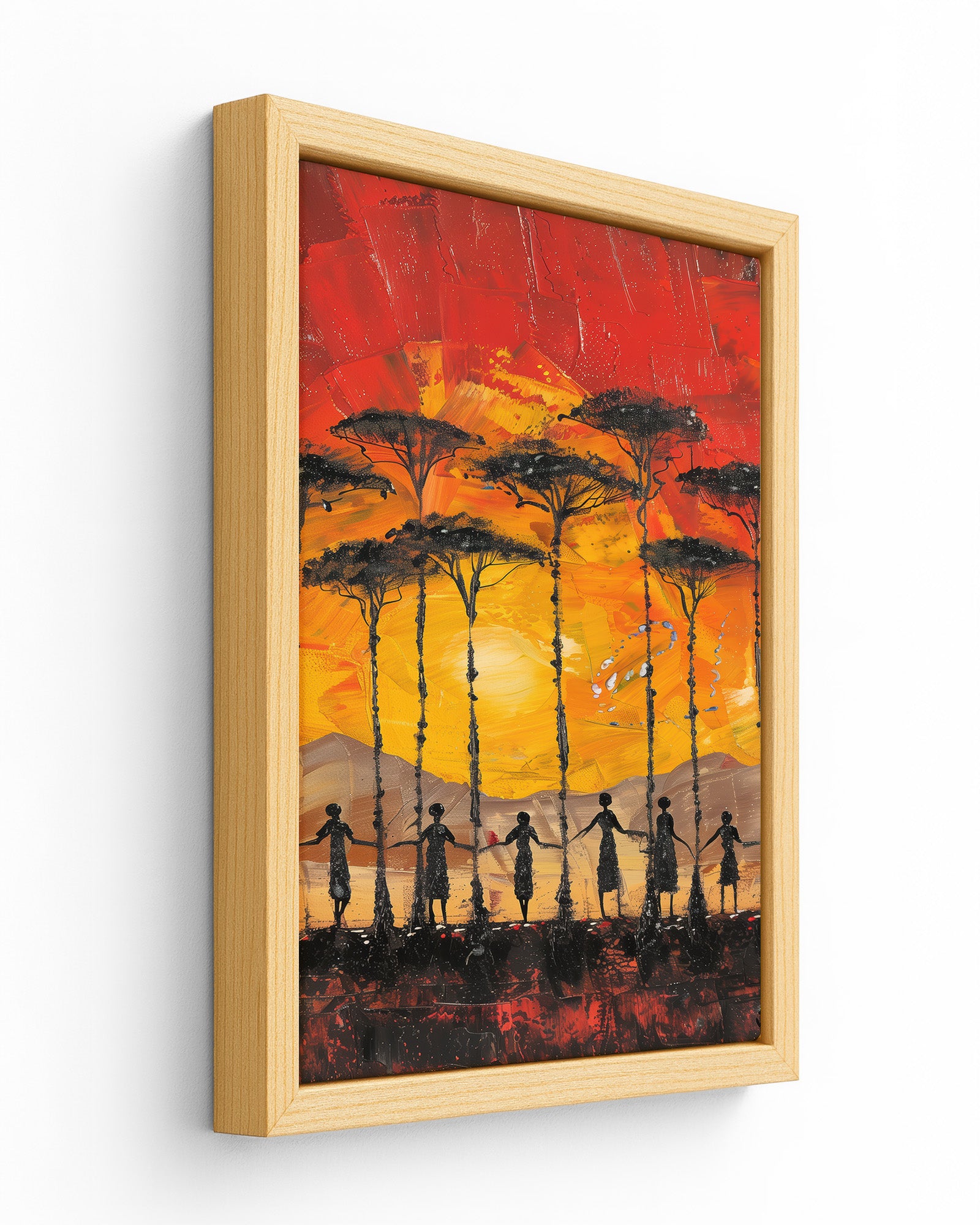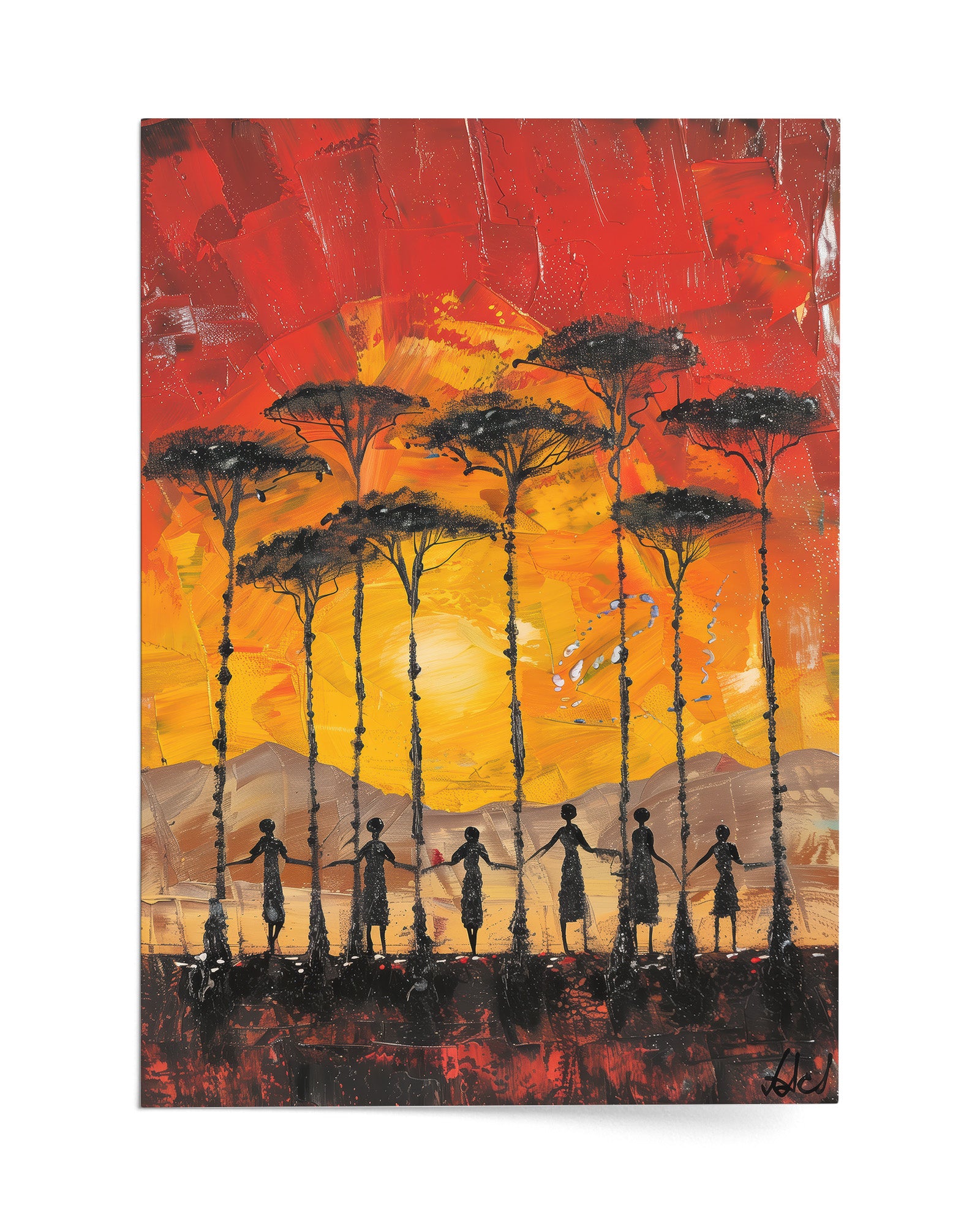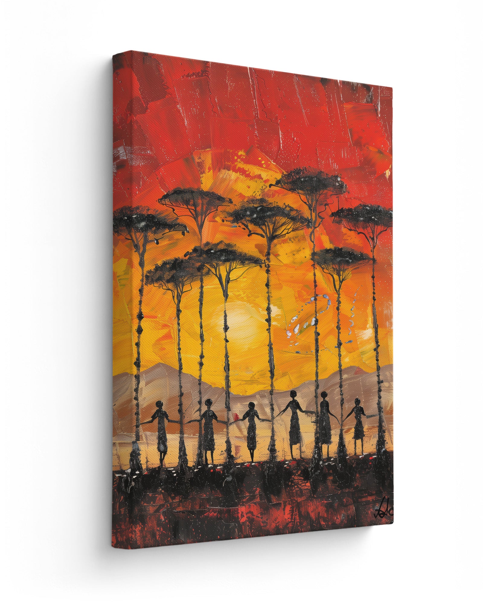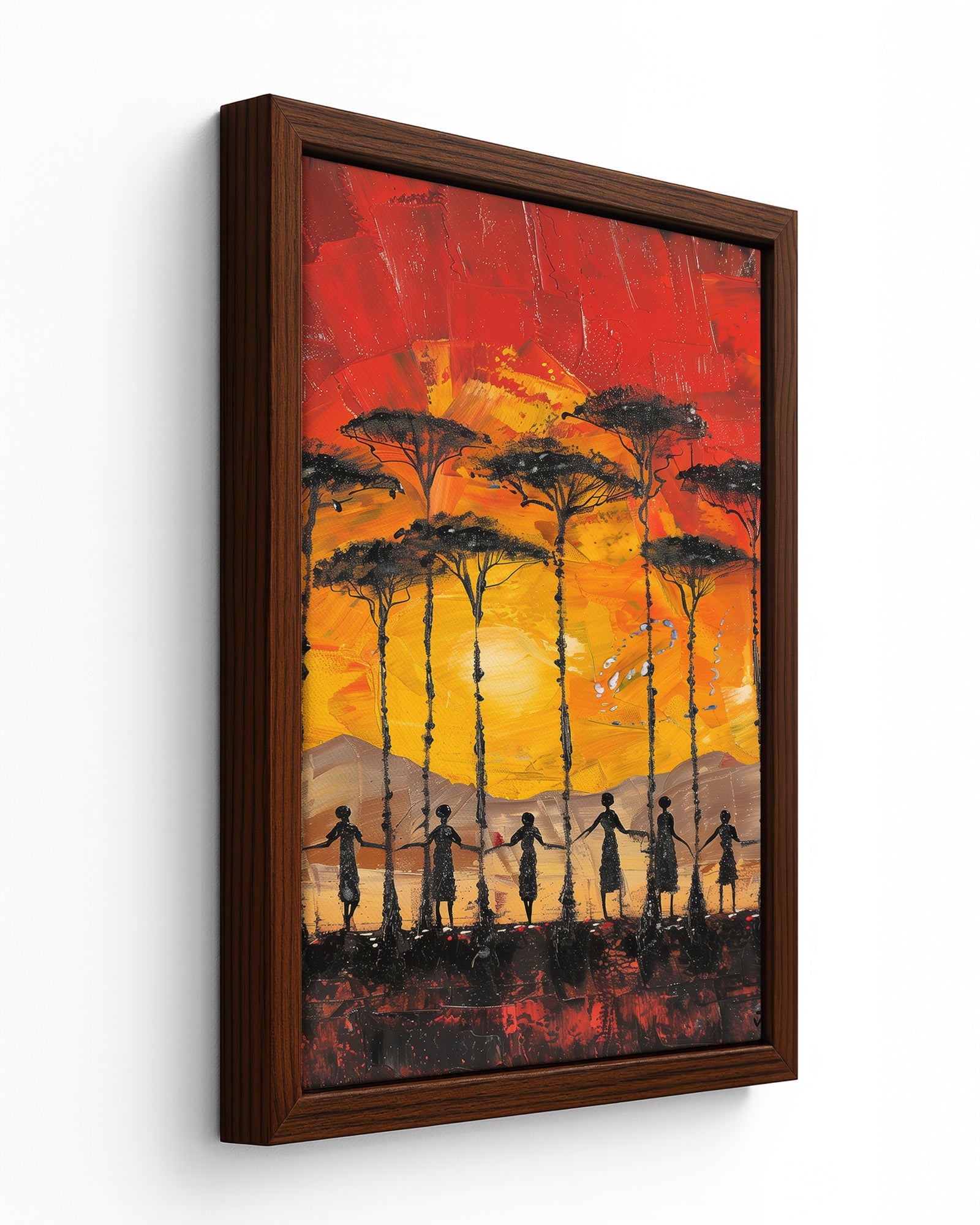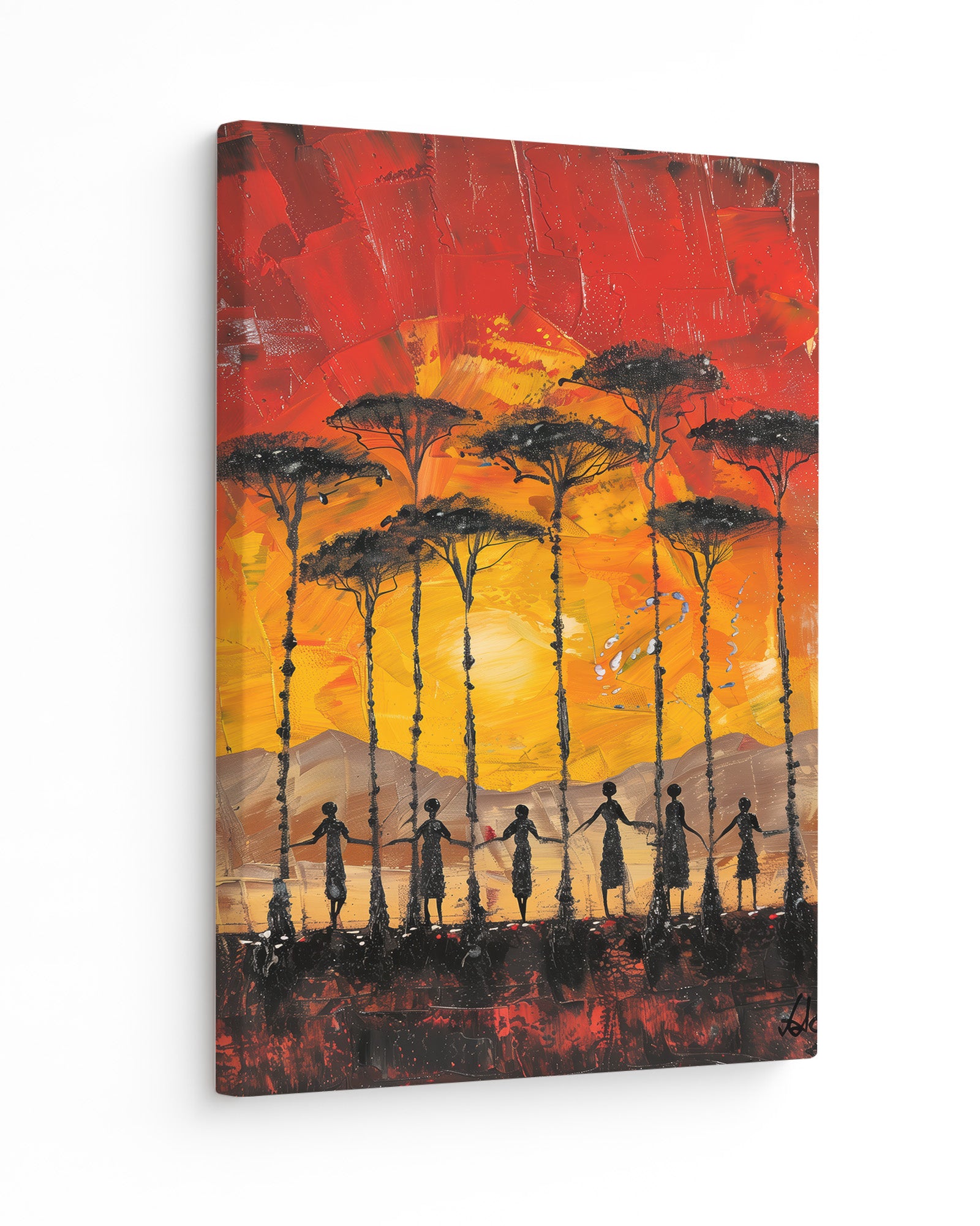 Immerse yourself in the warmth of an African sunset with this stunning acrylic painting. Featuring tall African trees, silhouettes of people strolling beneath their canopies, majestic mountains in the distance, and a glowing orange sky, this artwork captures the essence of the continent's beauty and serenity.