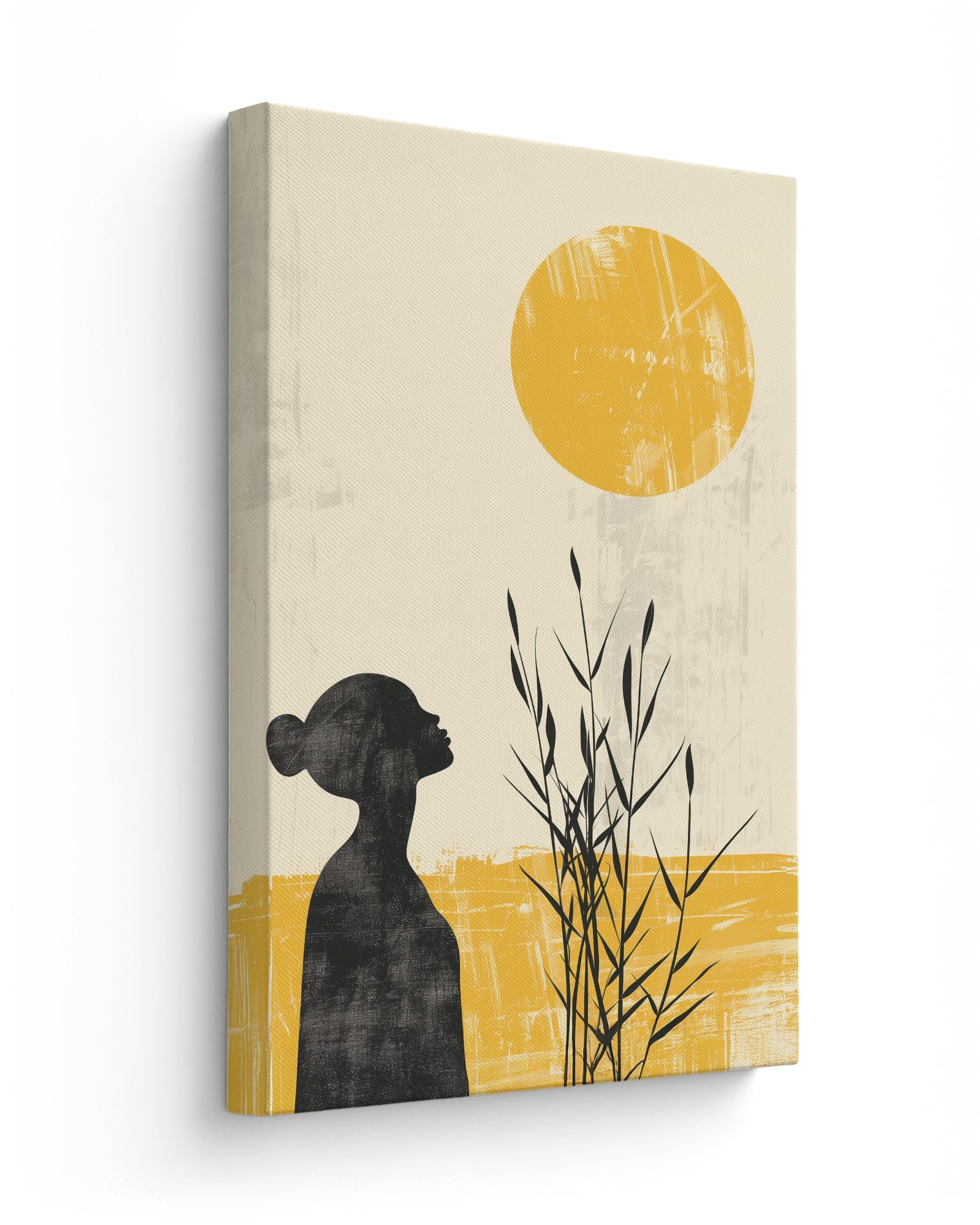A powerful silhouette of a woman standing against a warm beige background, looking up at the sun. Bathed in golden light, this evocative artwork symbolises hope, aspiration, and the pursuit of dreams, perfect for spaces that seek to inspire and reflect positive energy.