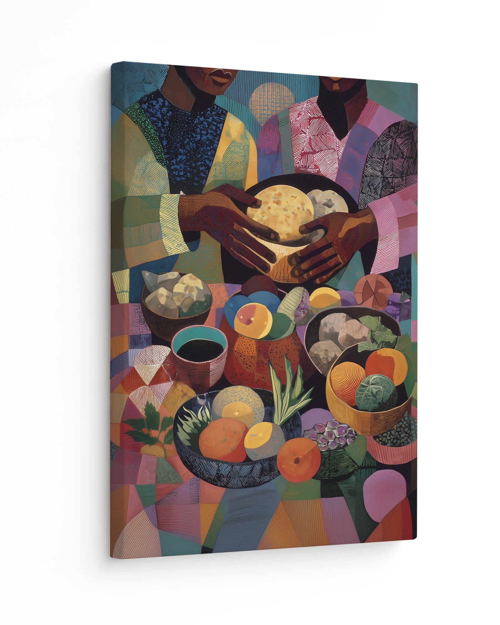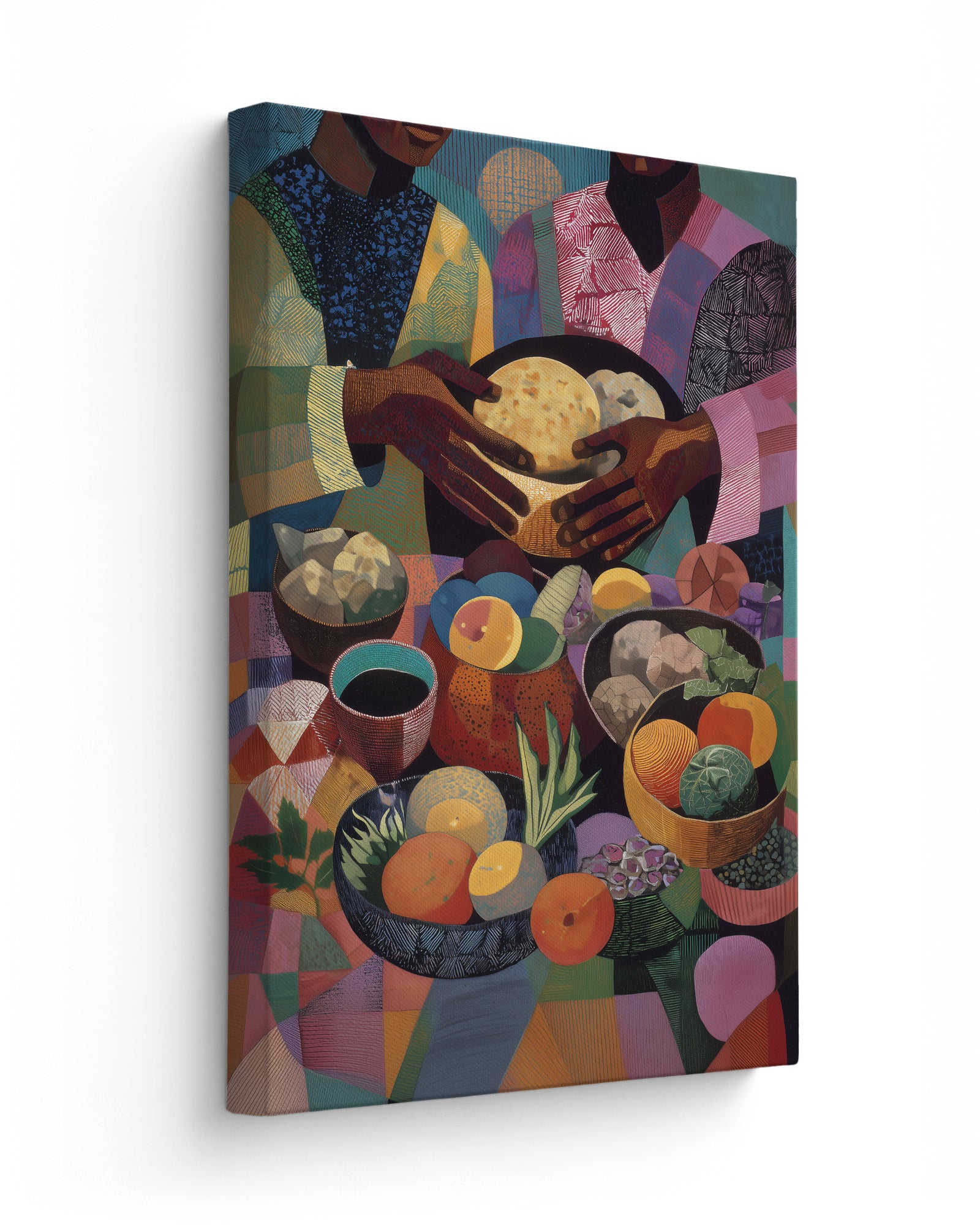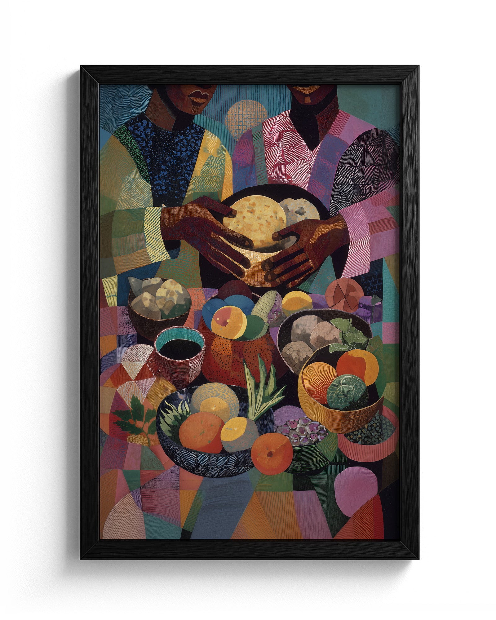 A cubist-inspired Yoruba artwork depicting two figures holding bread above a vibrant spread of fruits, vegetables, and bowls of traditional foods. Rich colors of red, gold, and green intertwine with textured patterns, celebrating community, abundance, and the spiritual bond between food, culture, and kinship.