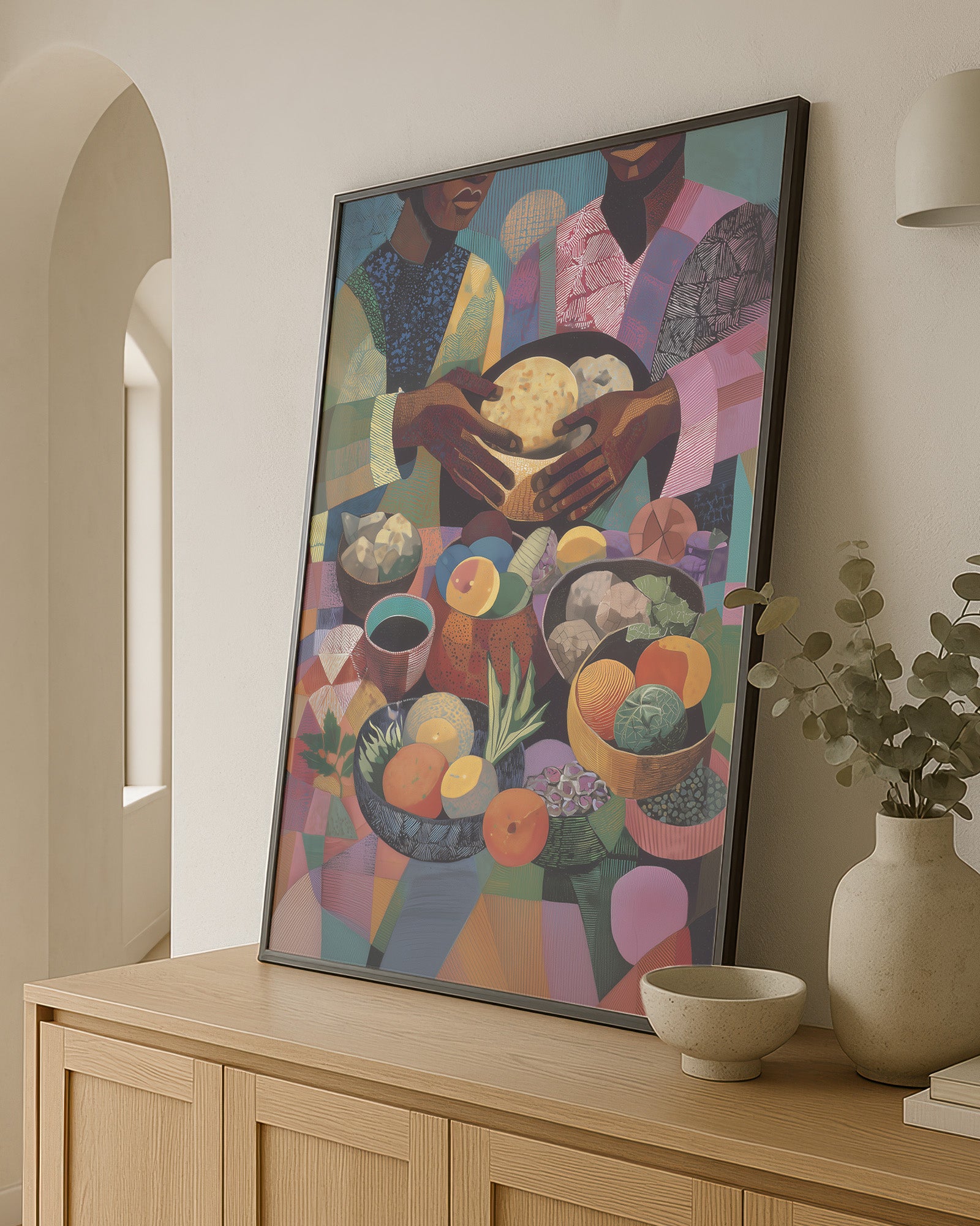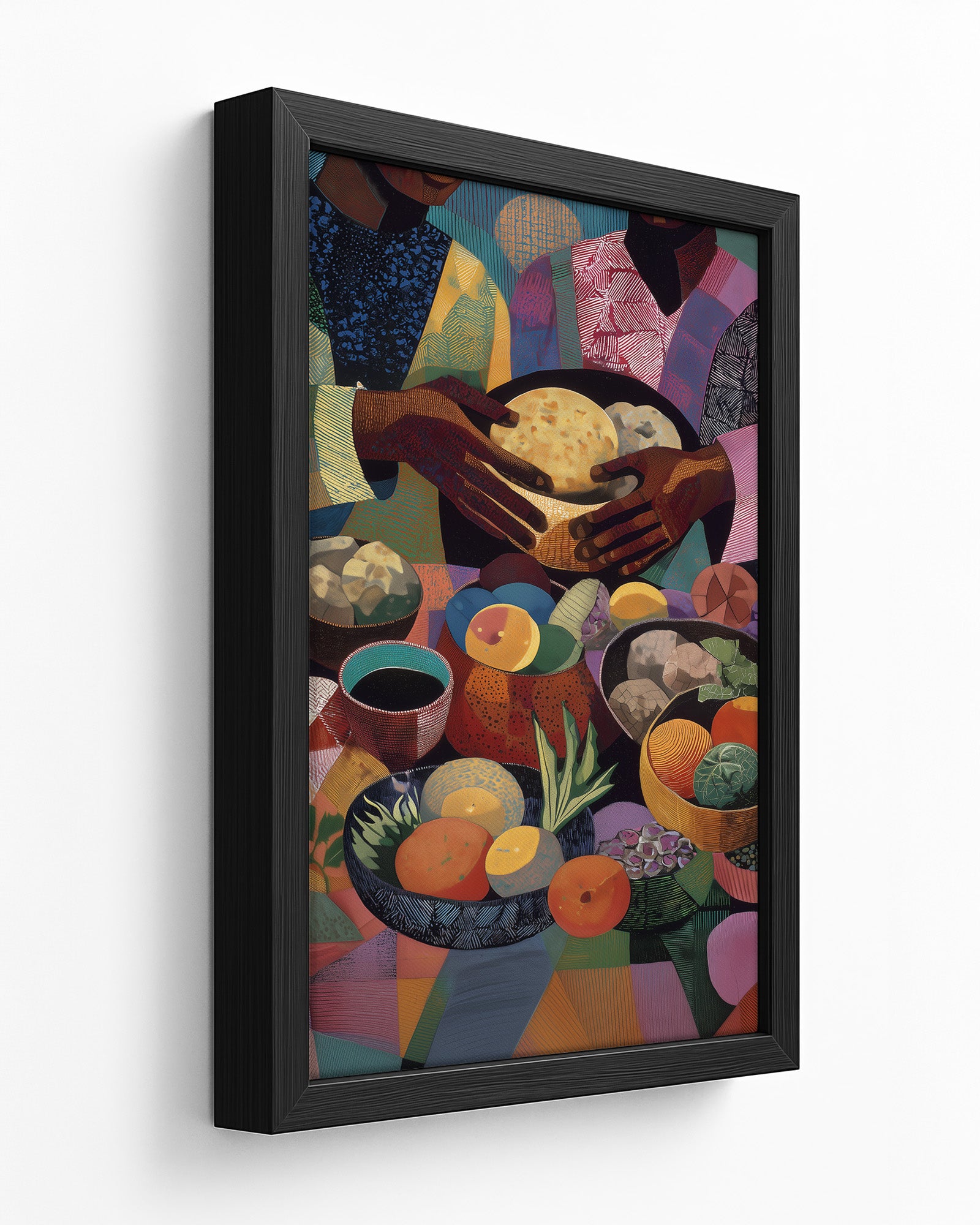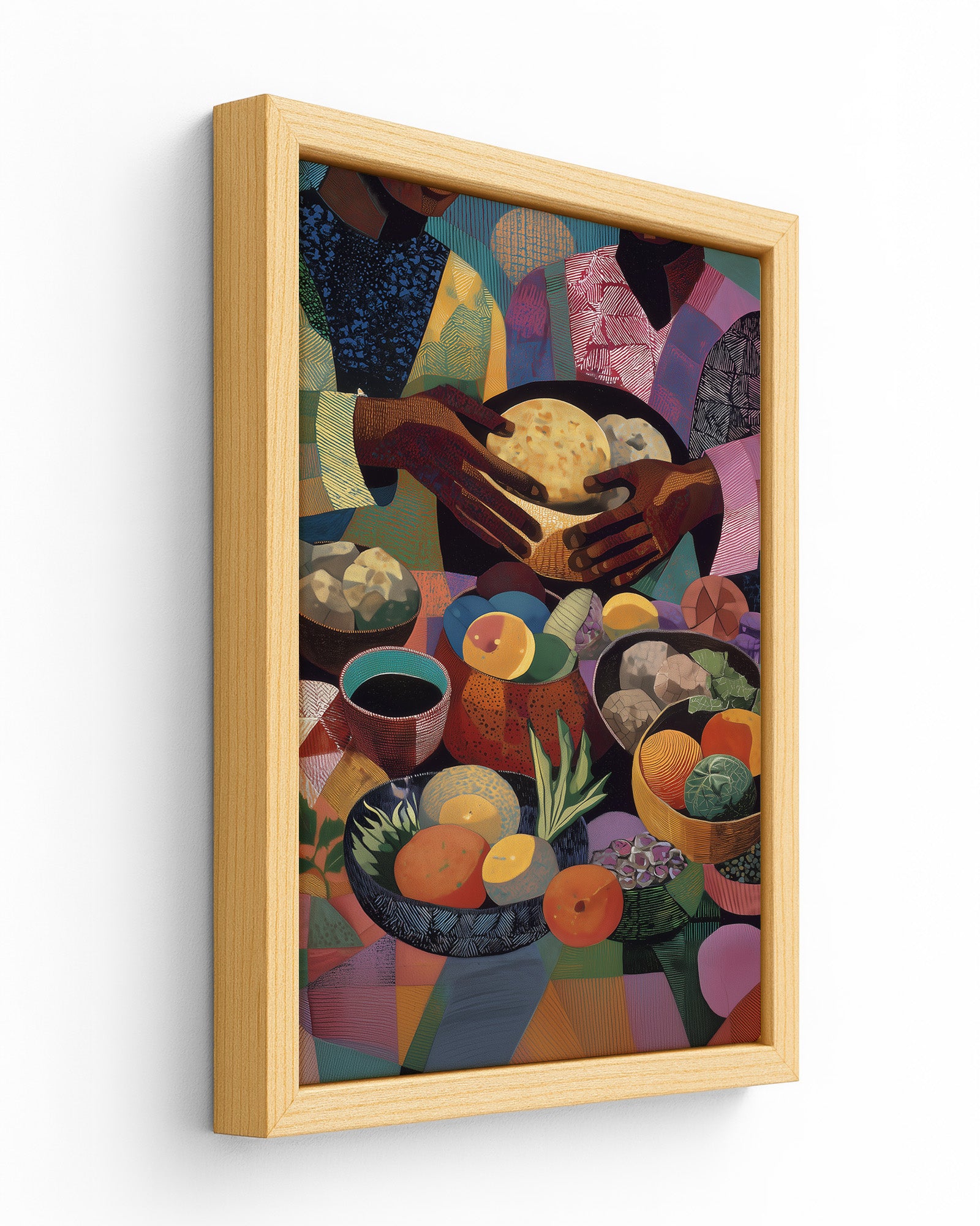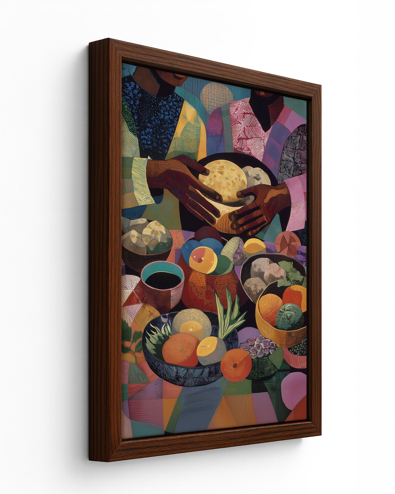 A cubist-inspired Yoruba artwork depicting two figures holding bread above a vibrant spread of fruits, vegetables, and bowls of traditional foods. Rich colors of red, gold, and green intertwine with textured patterns, celebrating community, abundance, and the spiritual bond between food, culture, and kinship.
