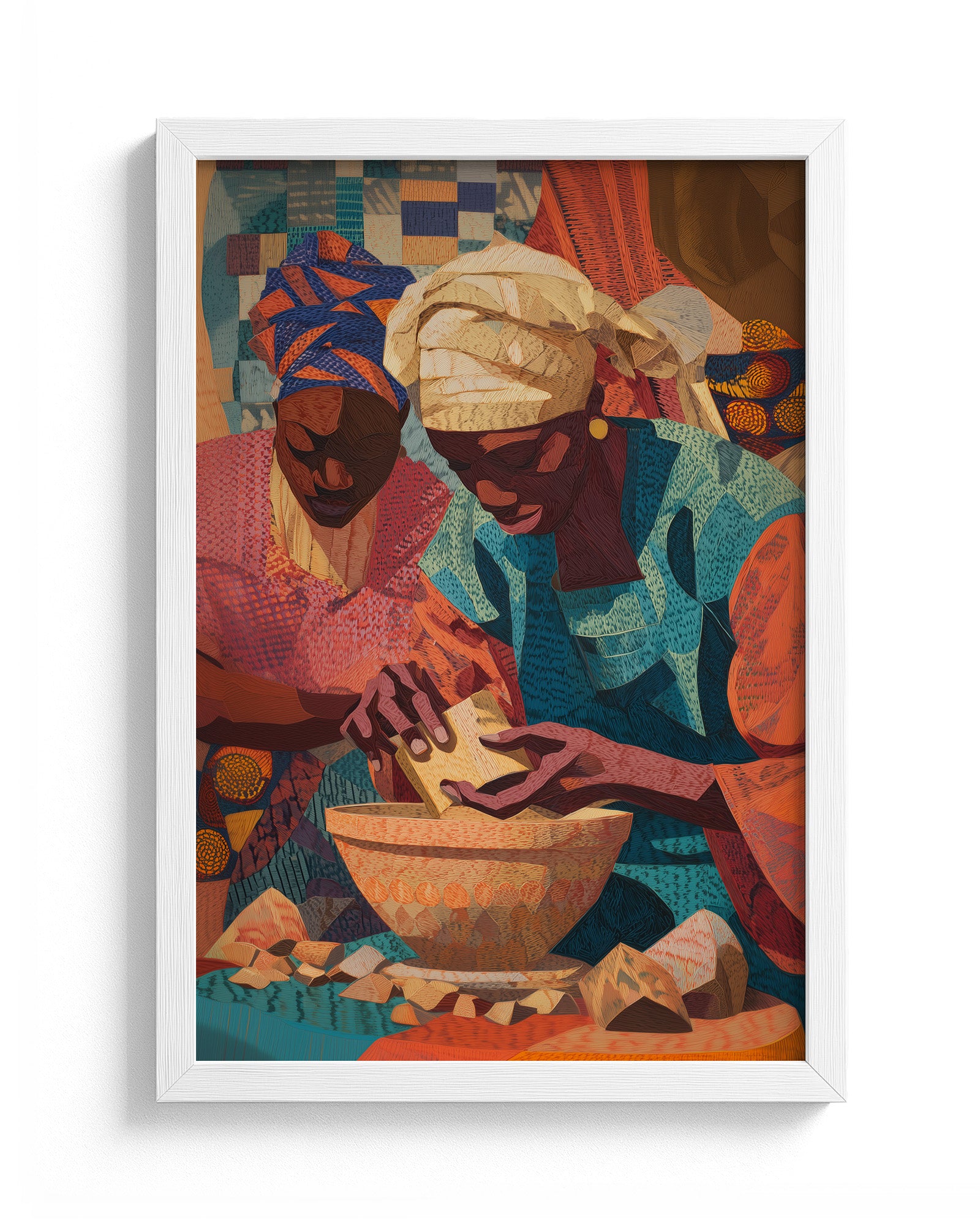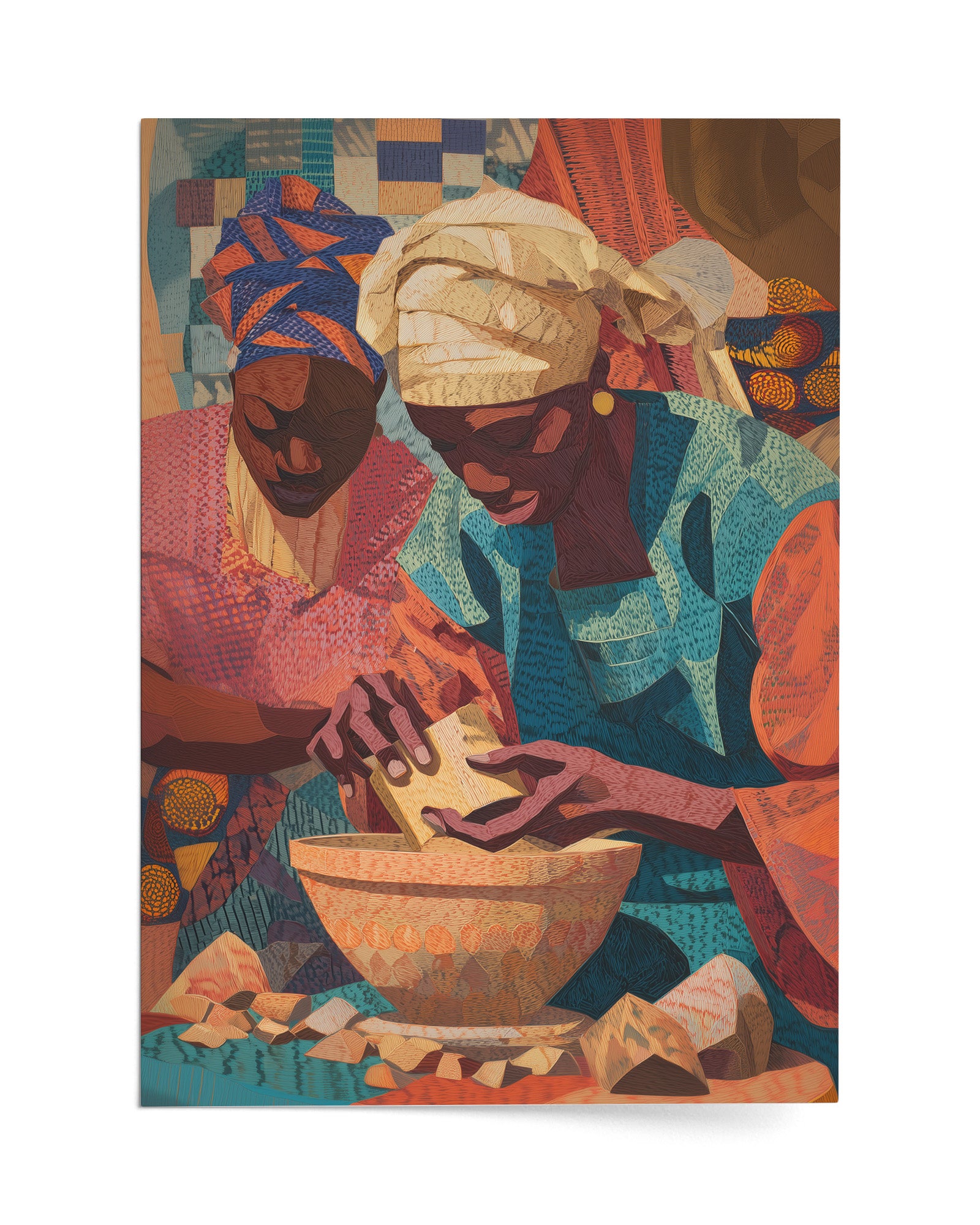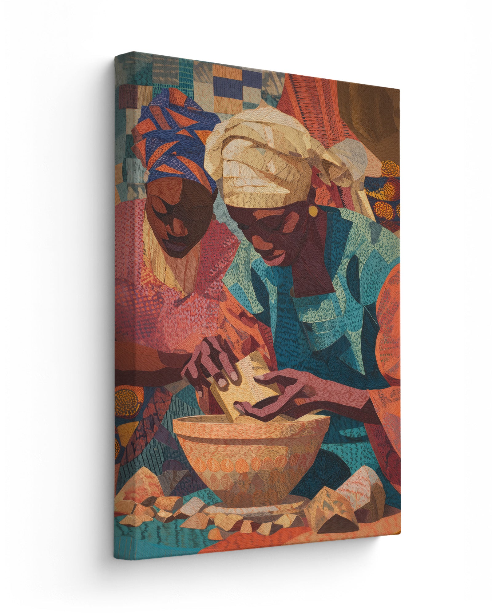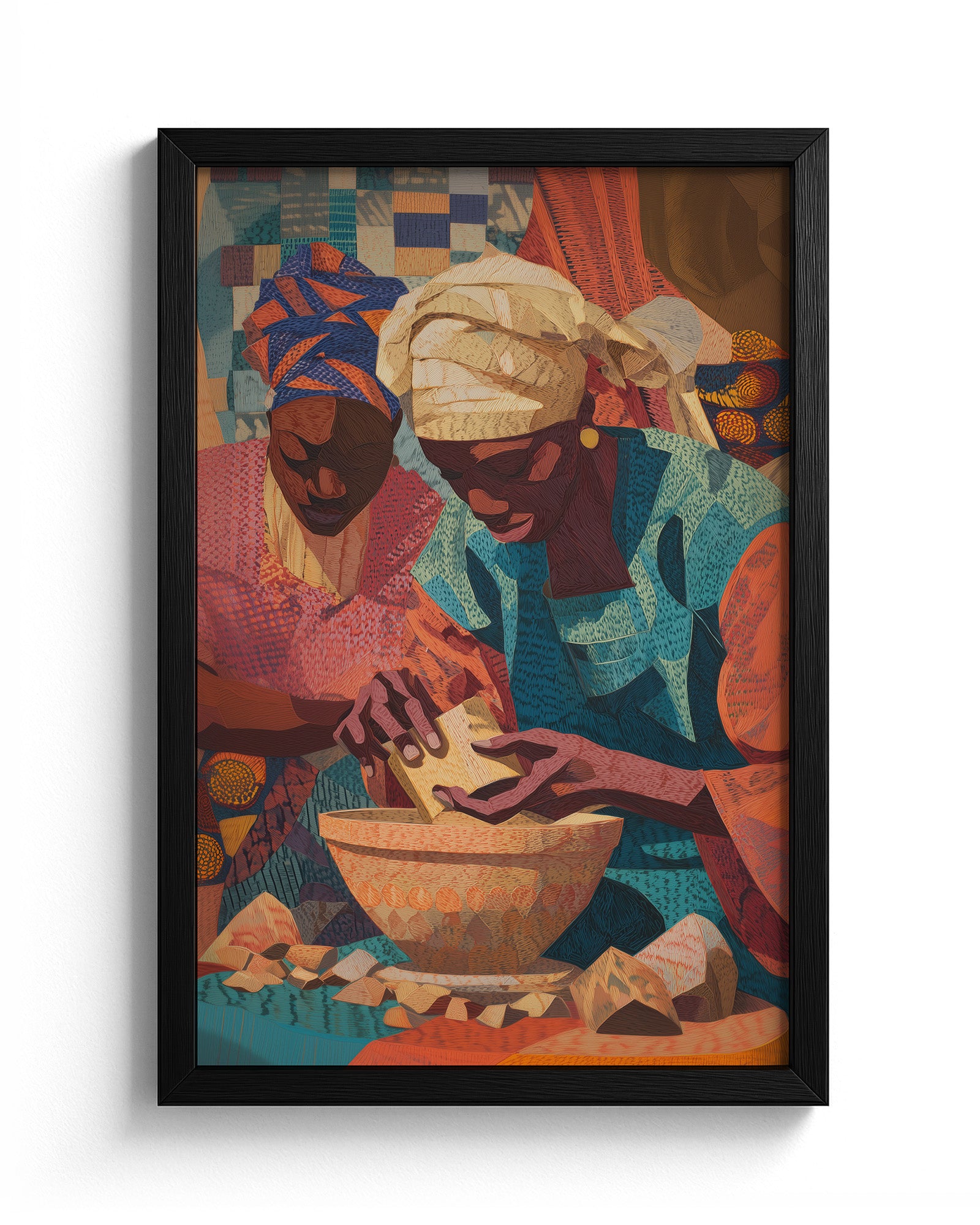 A Yoruba-inspired cubist painting depicting two women preparing yam in a large carved bowl. Their hands work with focus and care, surrounded by vibrant fabrics in teal, orange, and indigo tones. Geometric textures echo Yoruba textile and beadwork patterns, celebrating tradition, nourishment, and the communal spirit of food preparation.