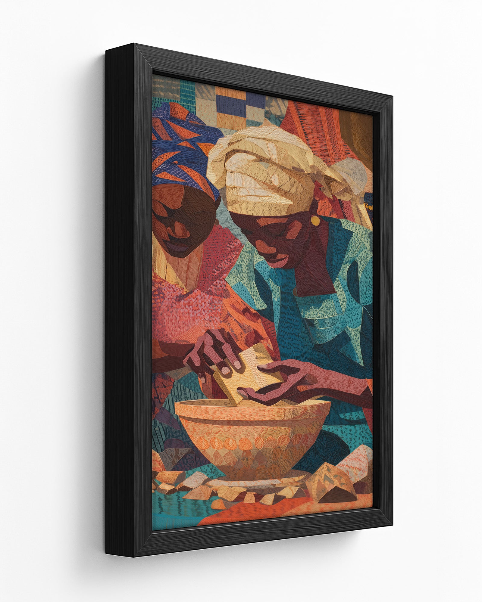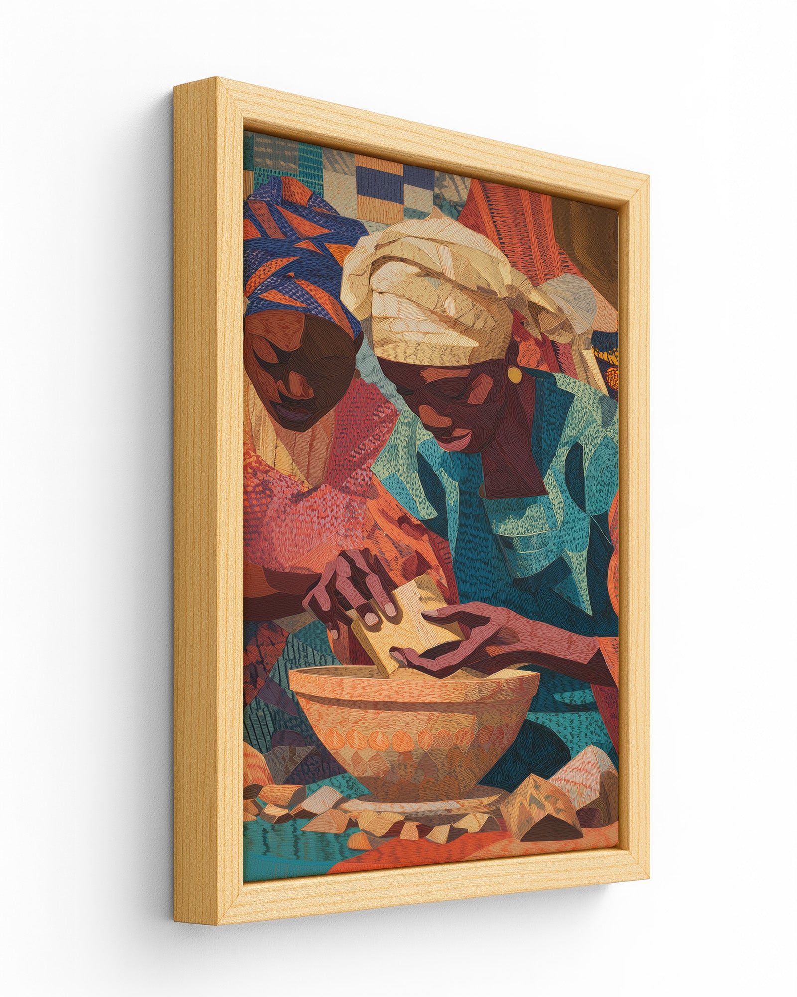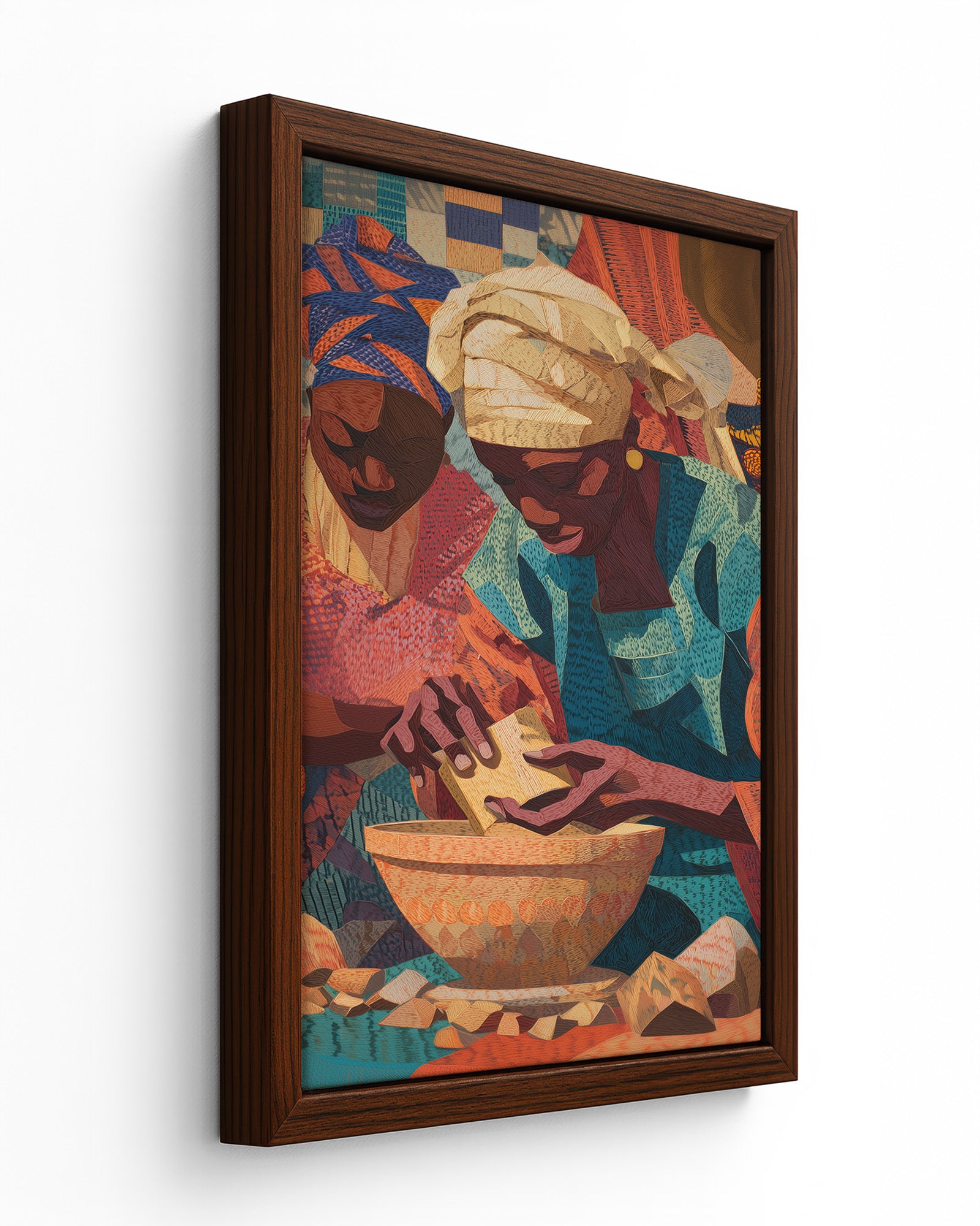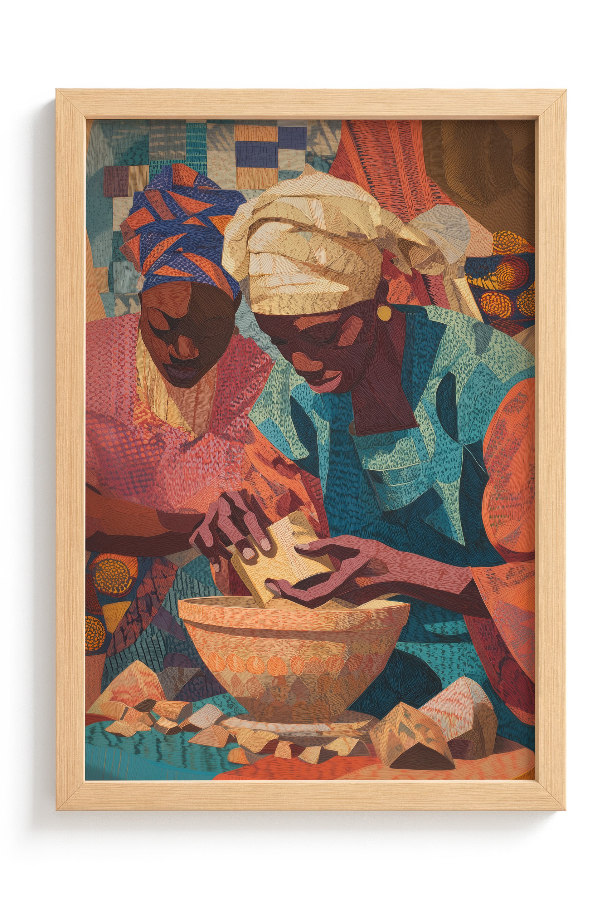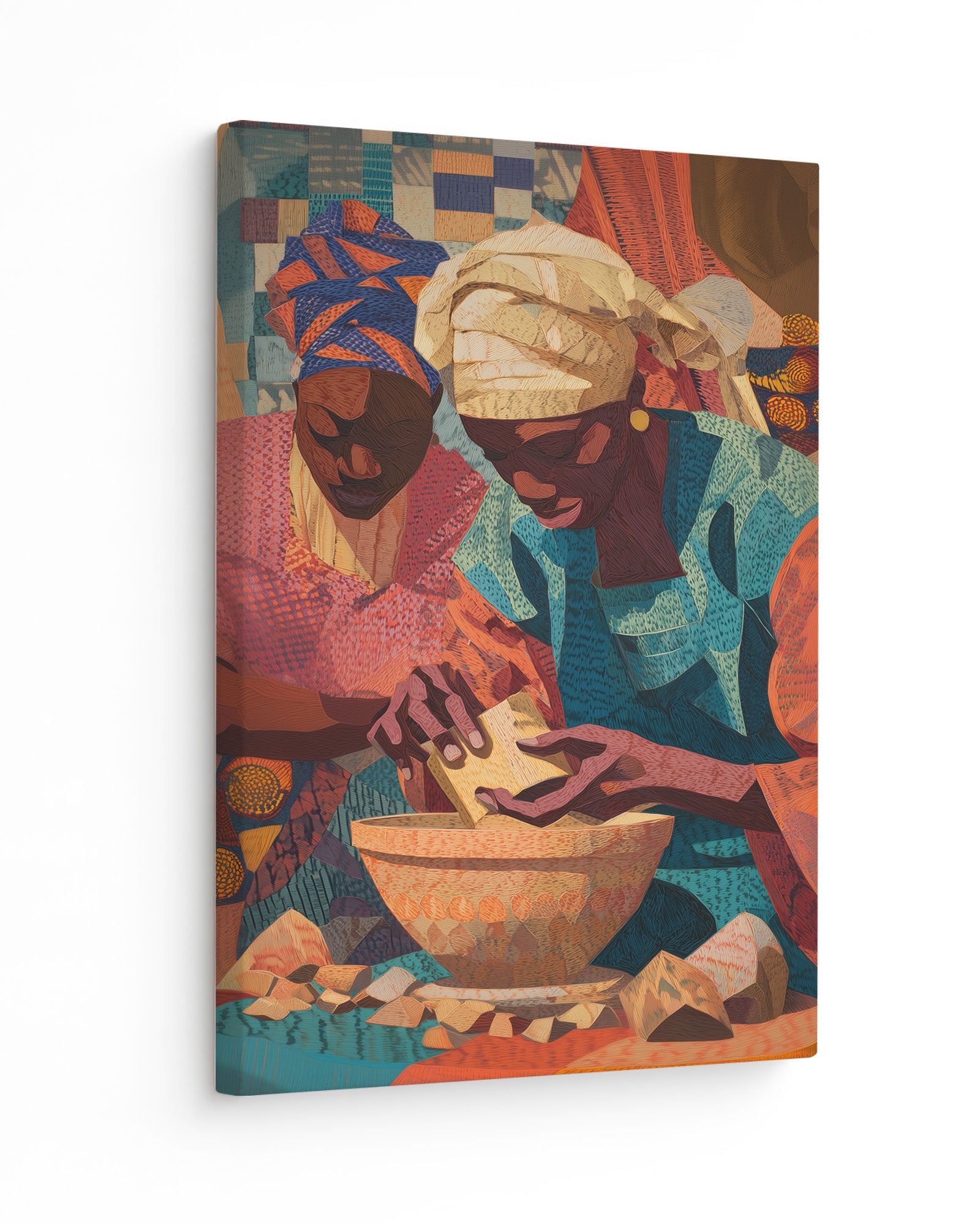 A Yoruba-inspired cubist painting depicting two women preparing yam in a large carved bowl. Their hands work with focus and care, surrounded by vibrant fabrics in teal, orange, and indigo tones. Geometric textures echo Yoruba textile and beadwork patterns, celebrating tradition, nourishment, and the communal spirit of food preparation.