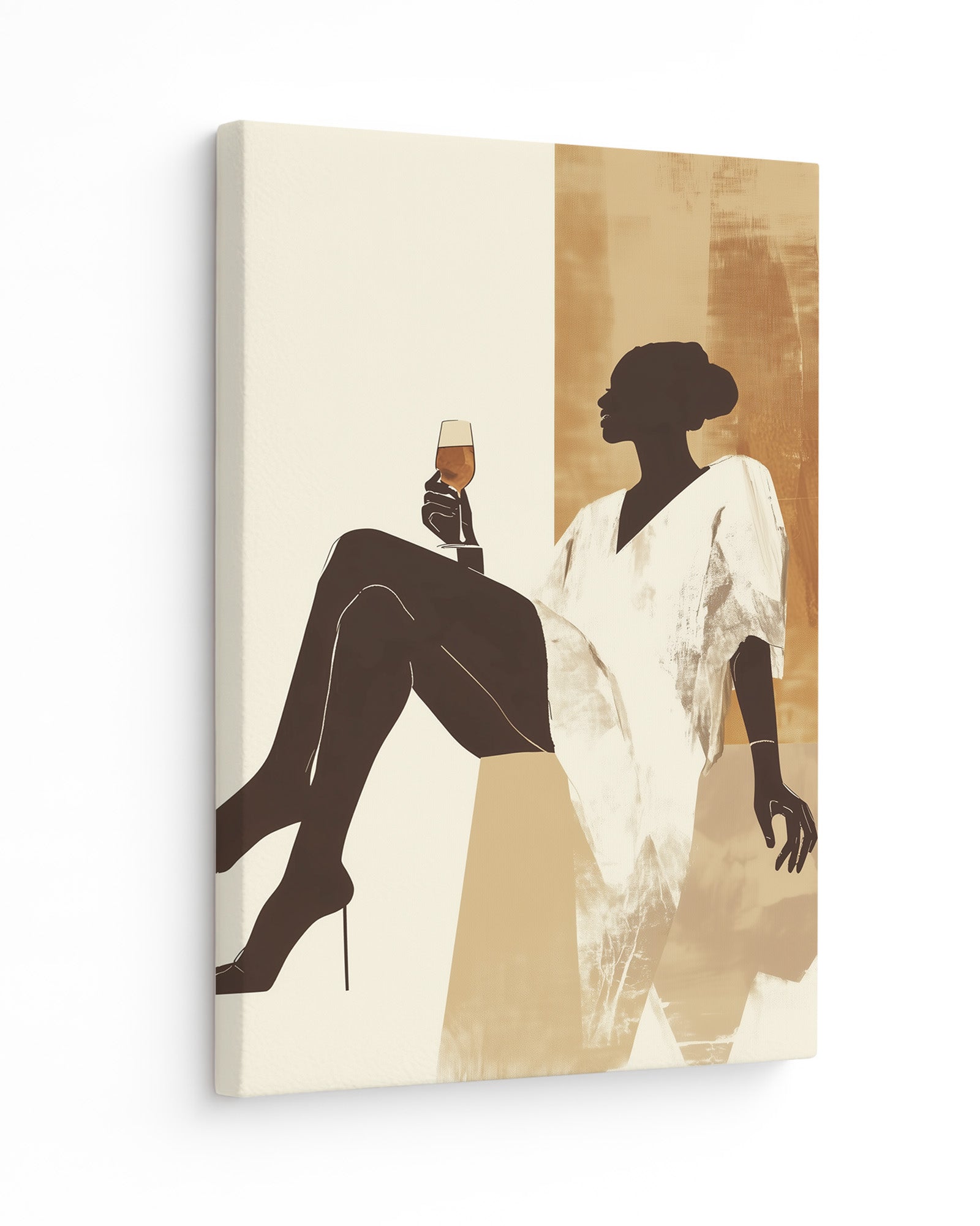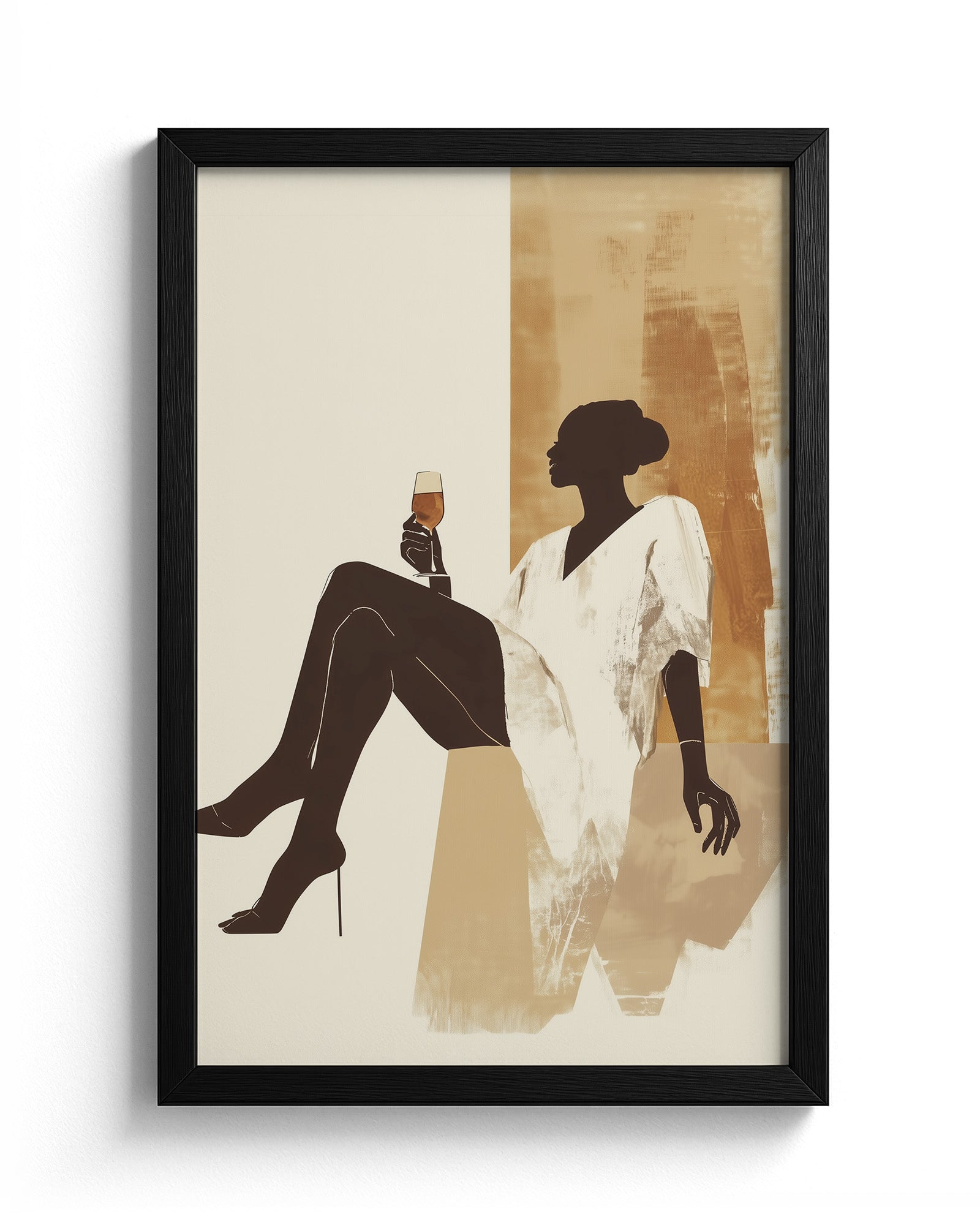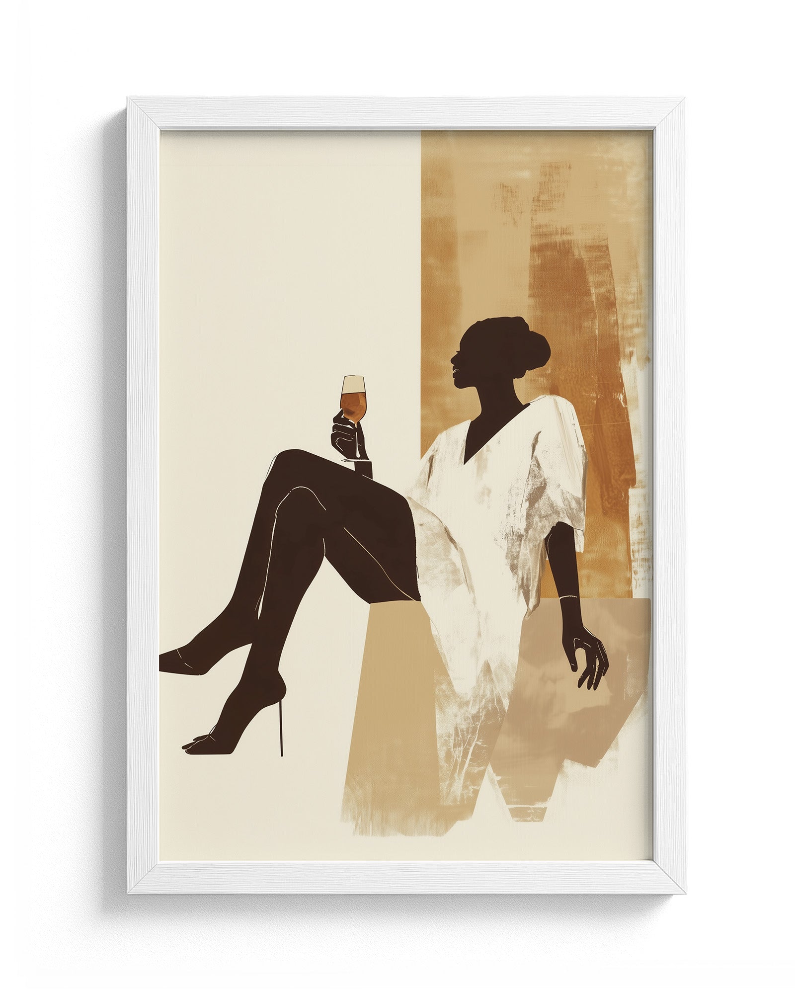 This modern minimalist artwork features a graceful woman lounging effortlessly with a glass of golden wine in hand, exuding calm, strength, and quiet luxury. Dressed in a flowing white robe and set against a warm, earthy-toned abstract background, the silhouette captures a perfect moment of pause and self-indulgence. The neutral palette of sandy beiges and ochre gold adds a sense of softness and sophistication, making it ideal for contemporary interiors.