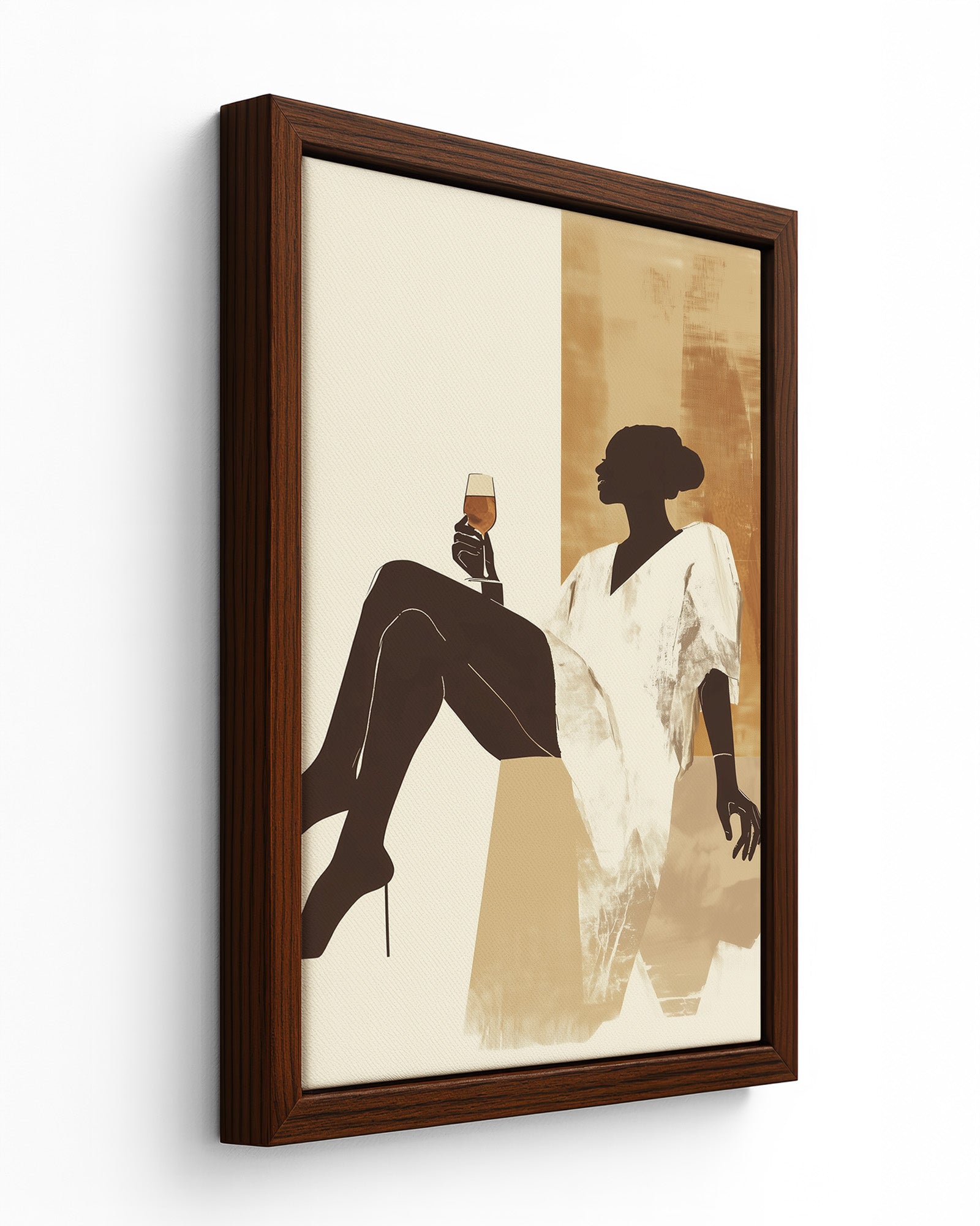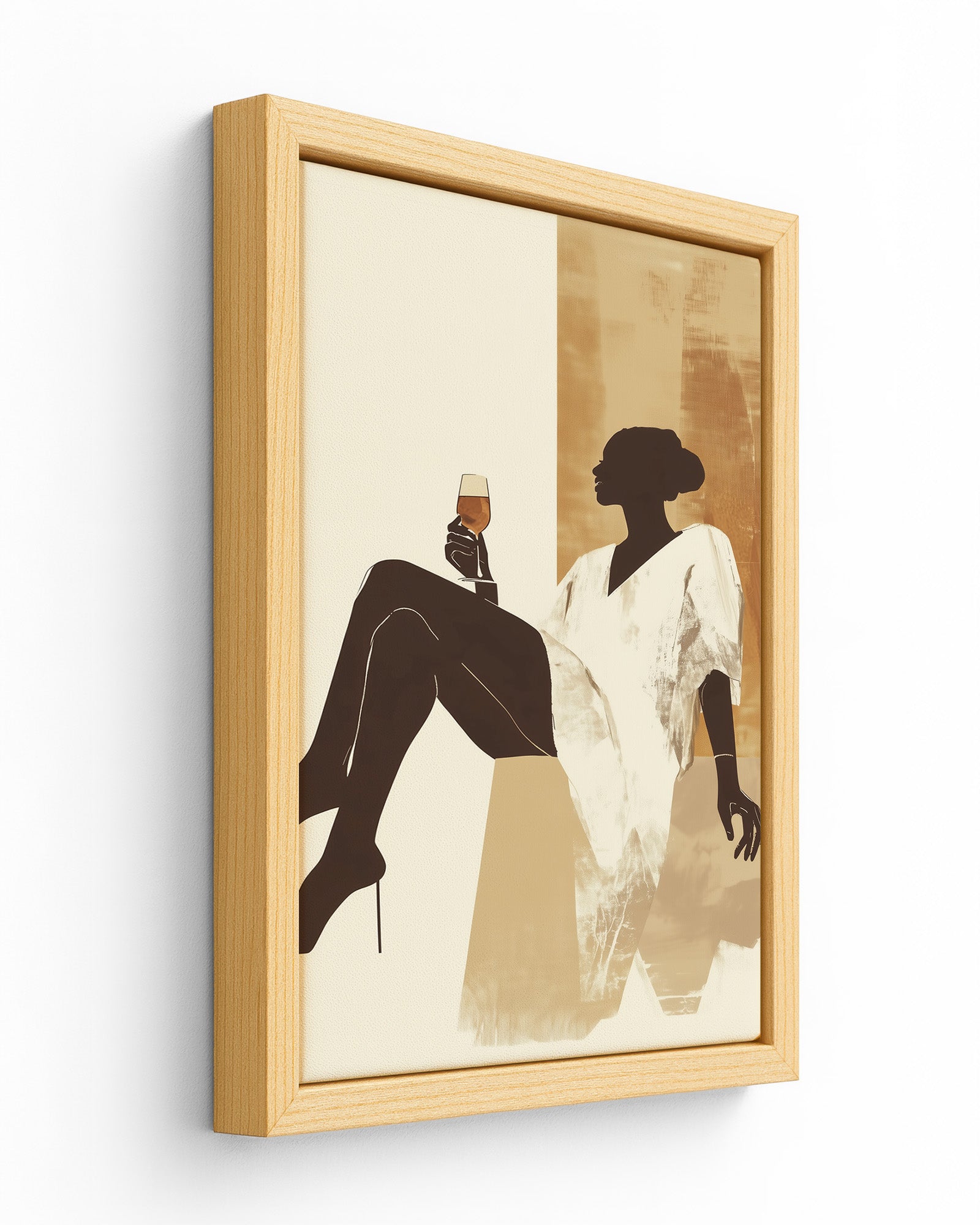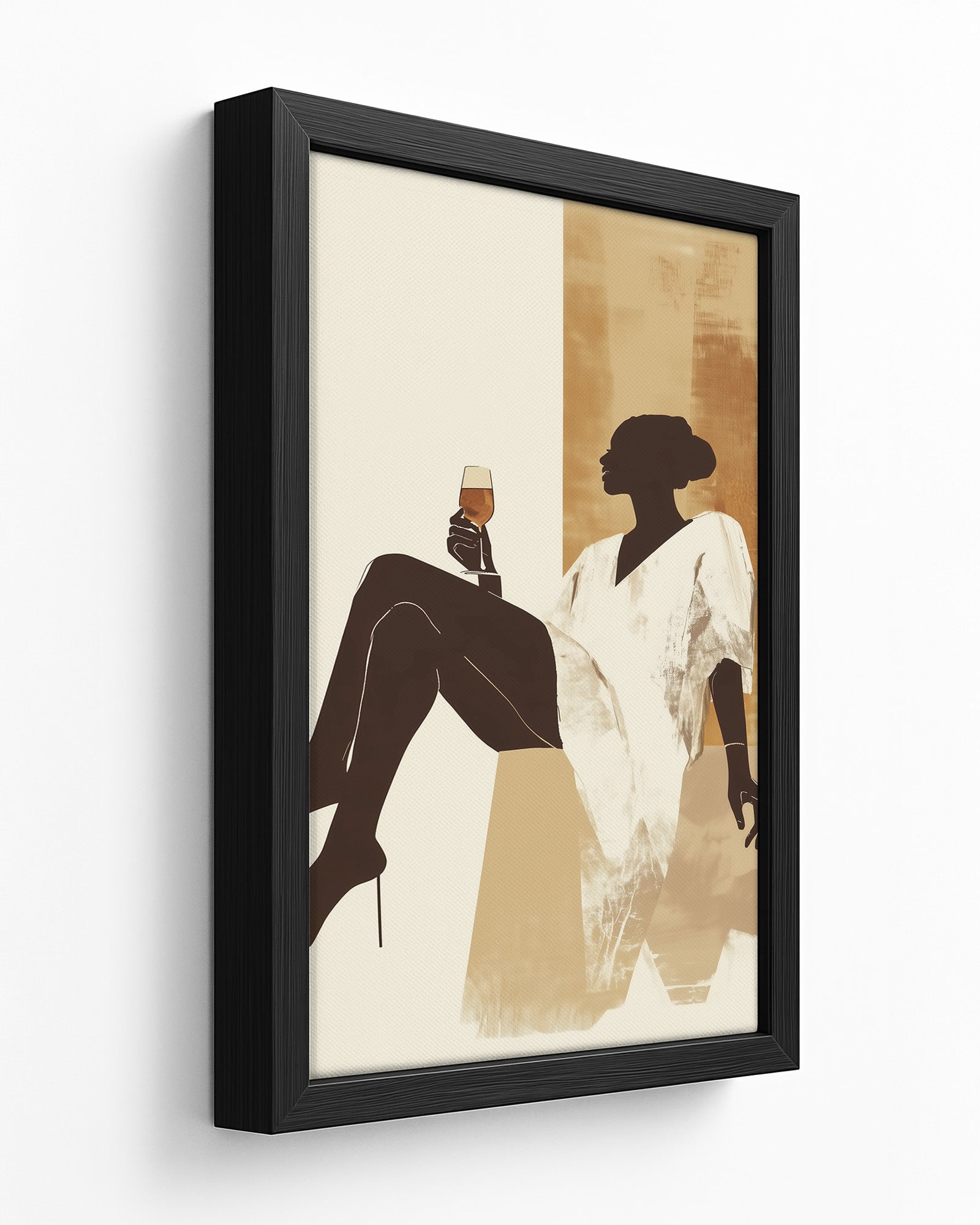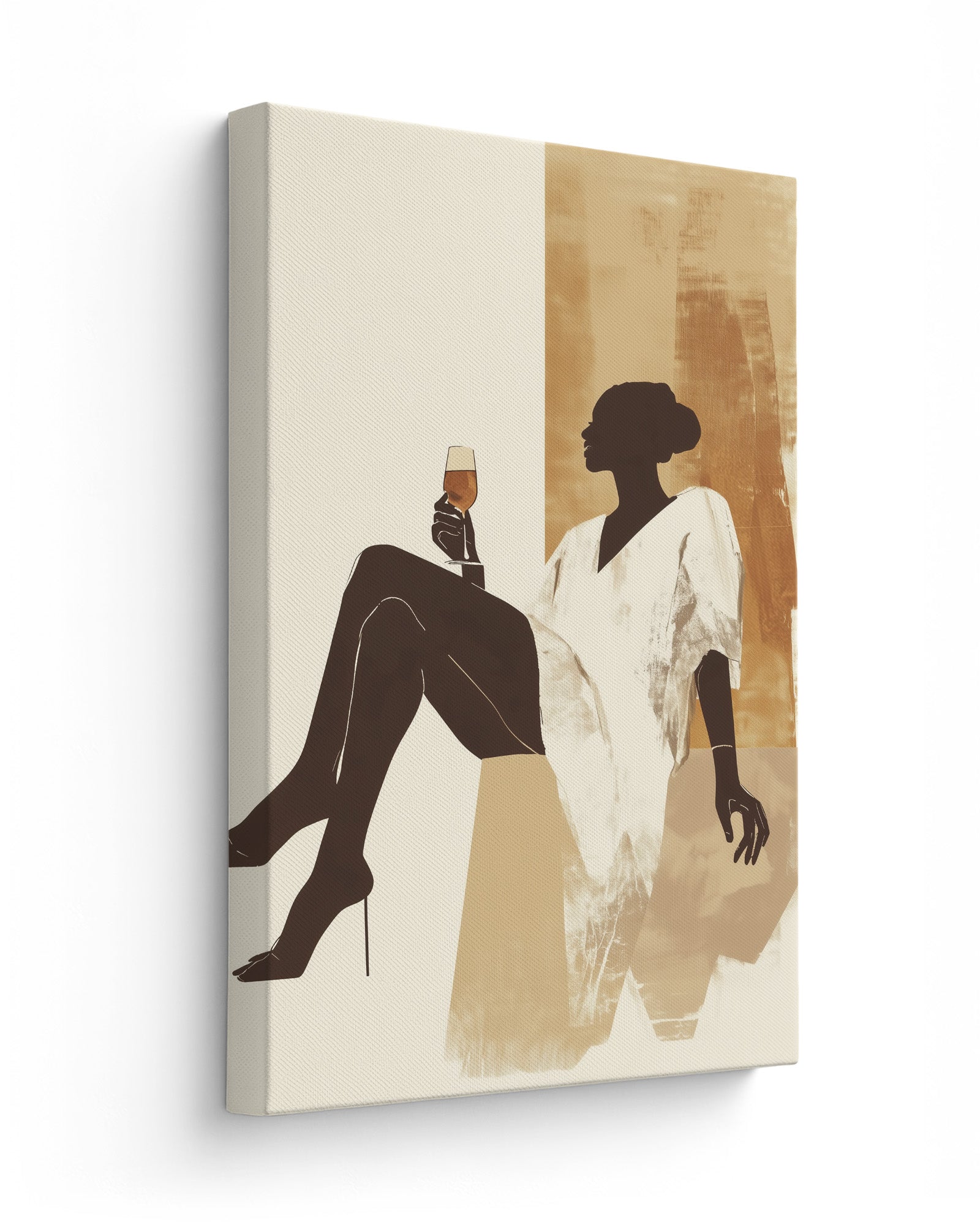 This modern minimalist artwork features a graceful woman lounging effortlessly with a glass of golden wine in hand, exuding calm, strength, and quiet luxury. Dressed in a flowing white robe and set against a warm, earthy-toned abstract background, the silhouette captures a perfect moment of pause and self-indulgence. The neutral palette of sandy beiges and ochre gold adds a sense of softness and sophistication, making it ideal for contemporary interiors.