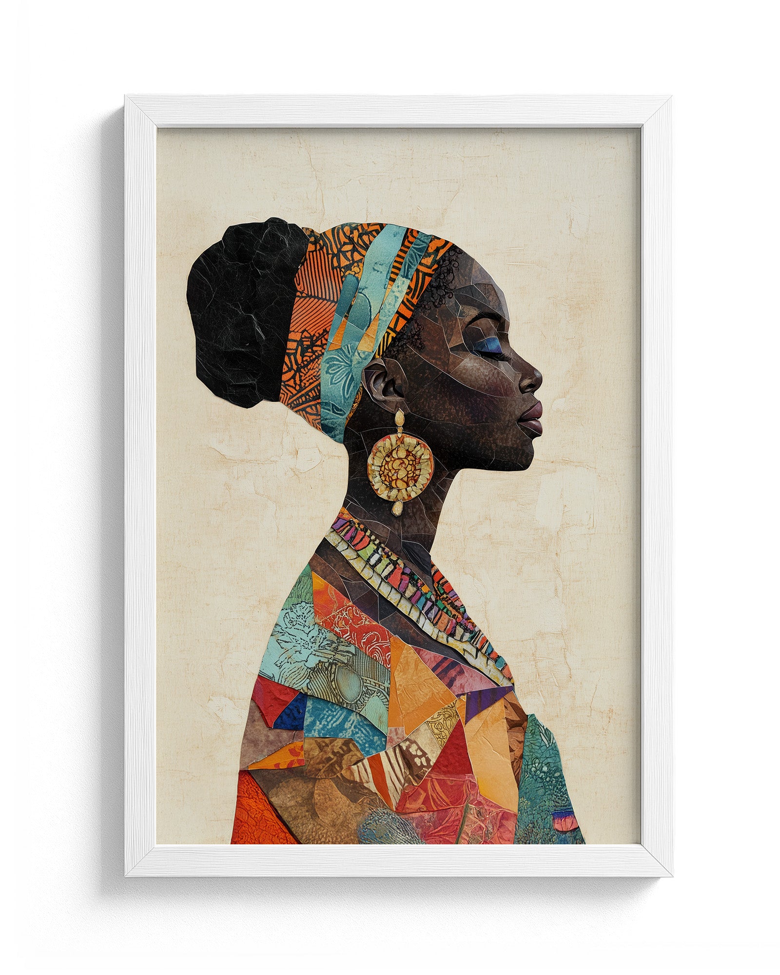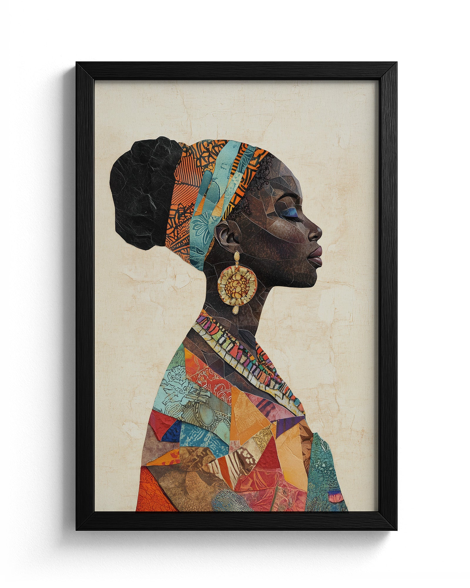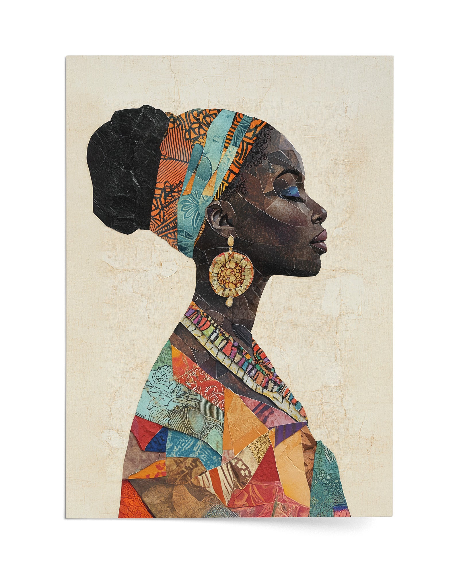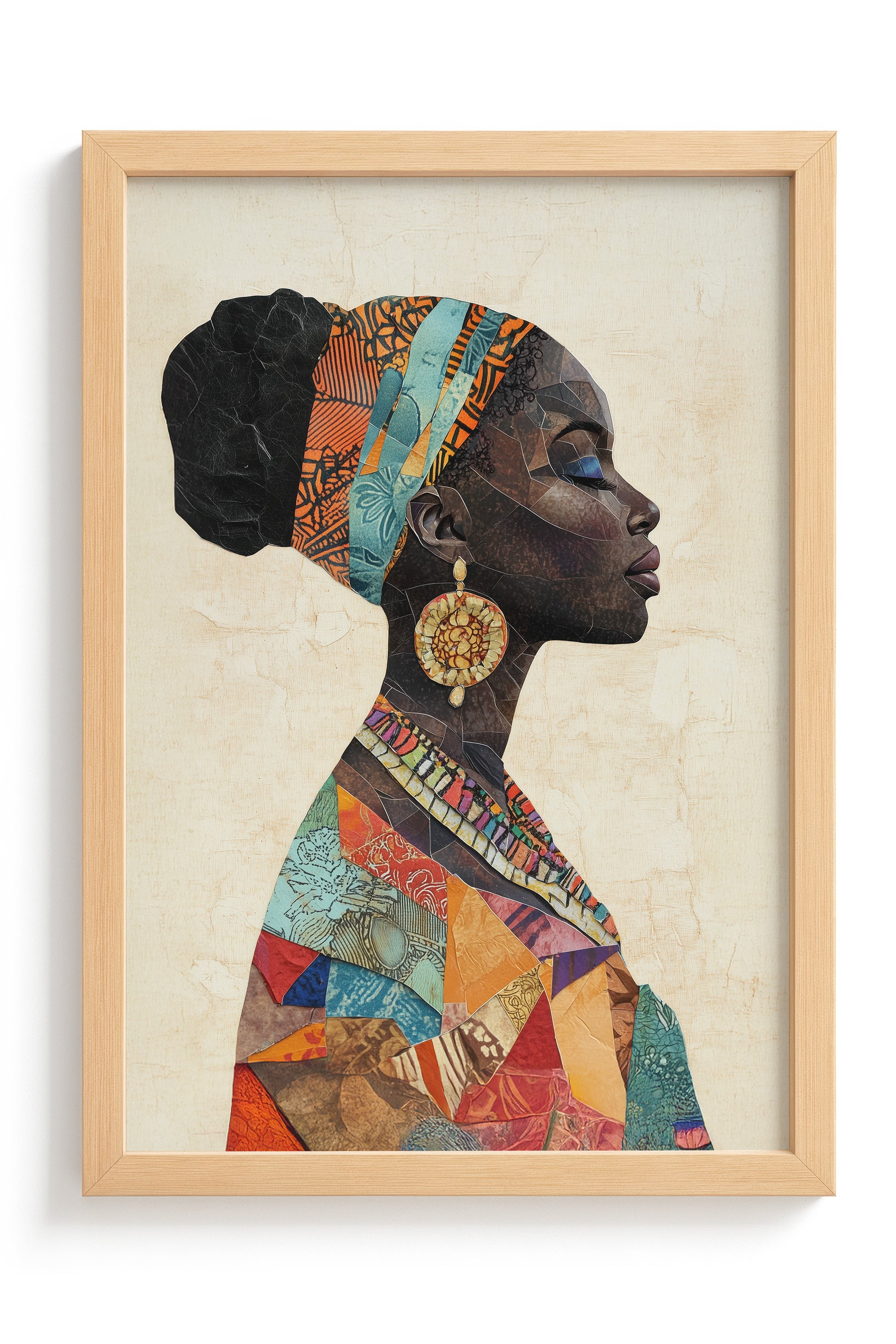Elevate your space with this stunning minimalist collage art, celebrating African heritage and timeless elegance. A regal African woman, her silhouette adorned in vibrant, torn-paper textures, stands against a warm beige canvas.
