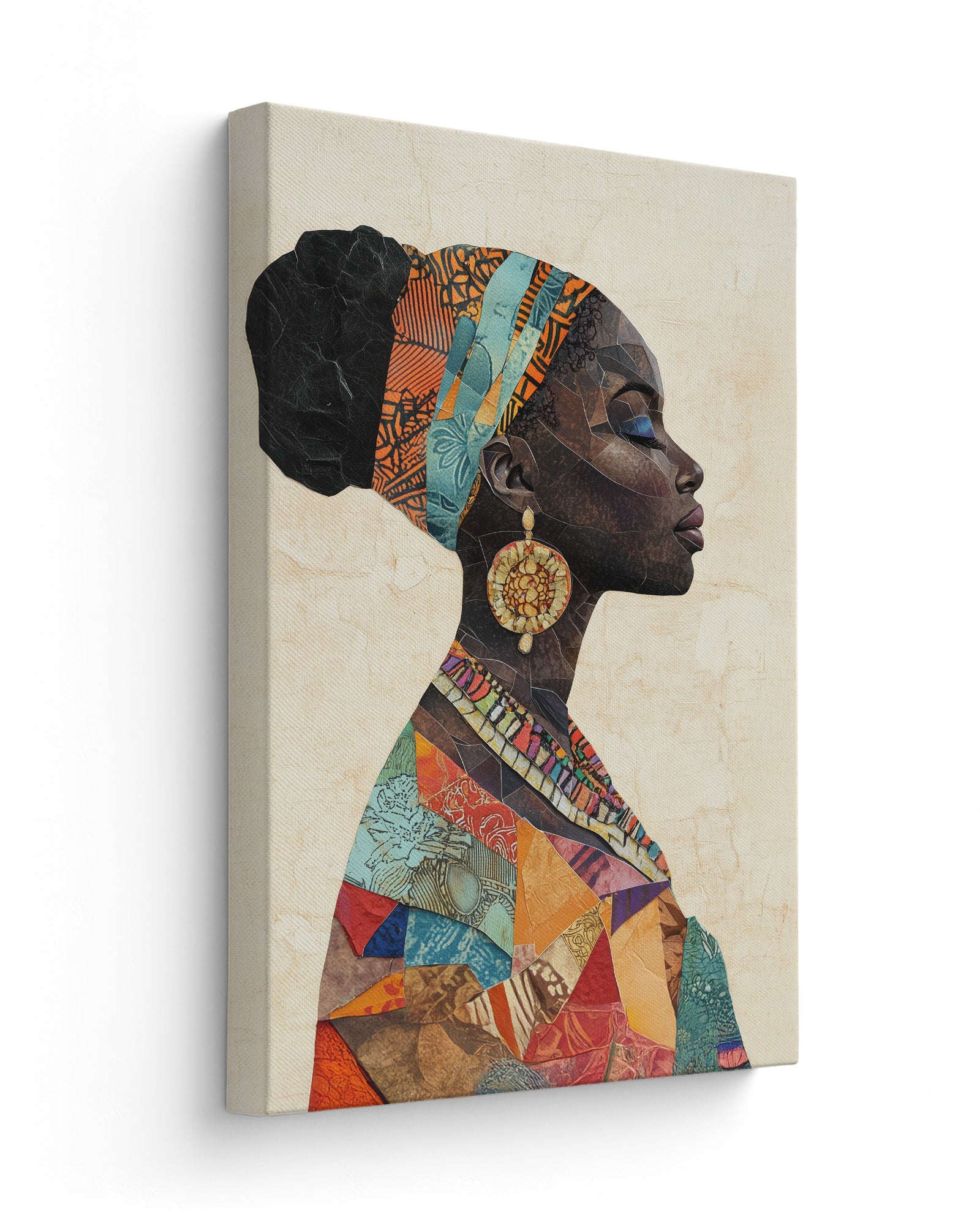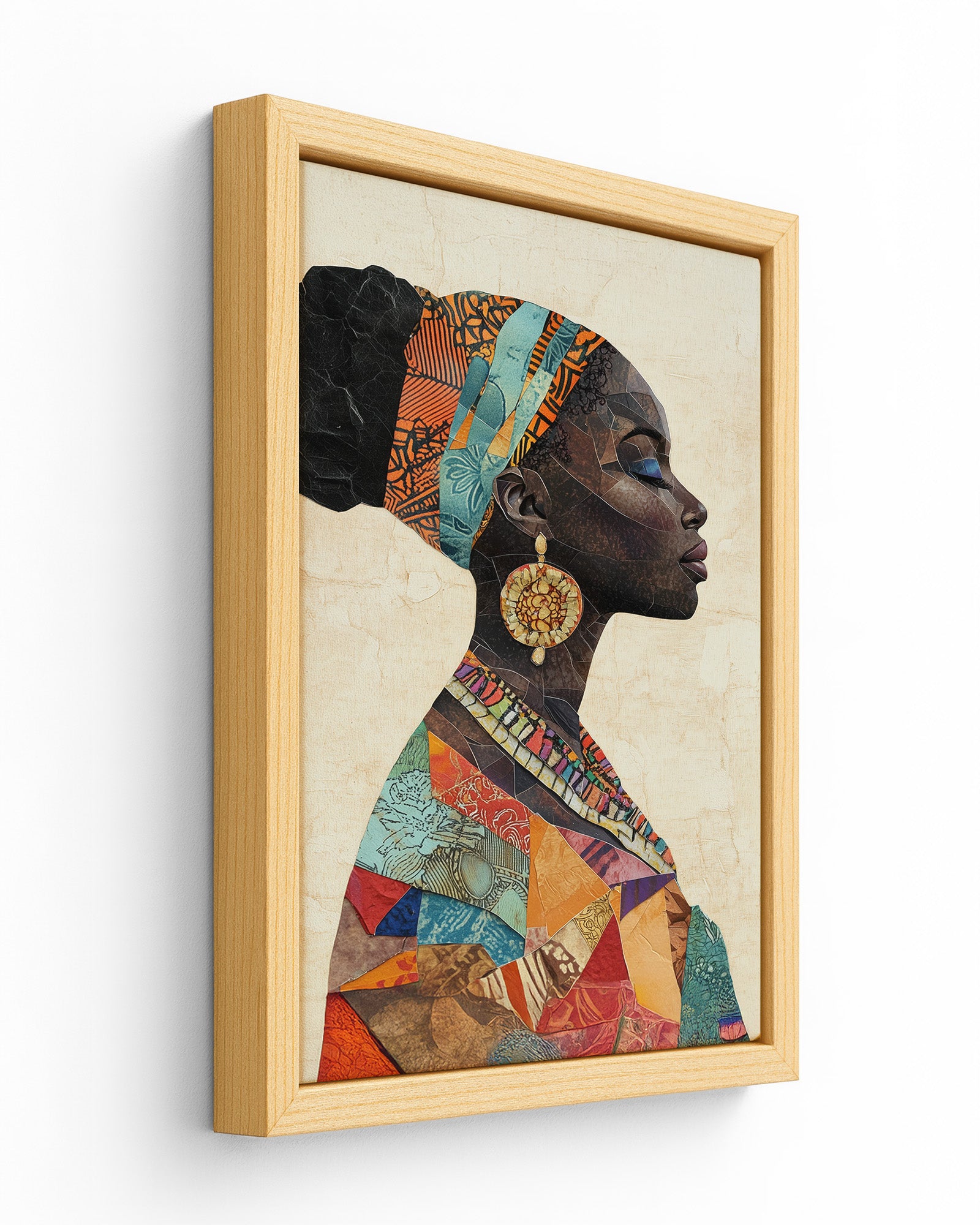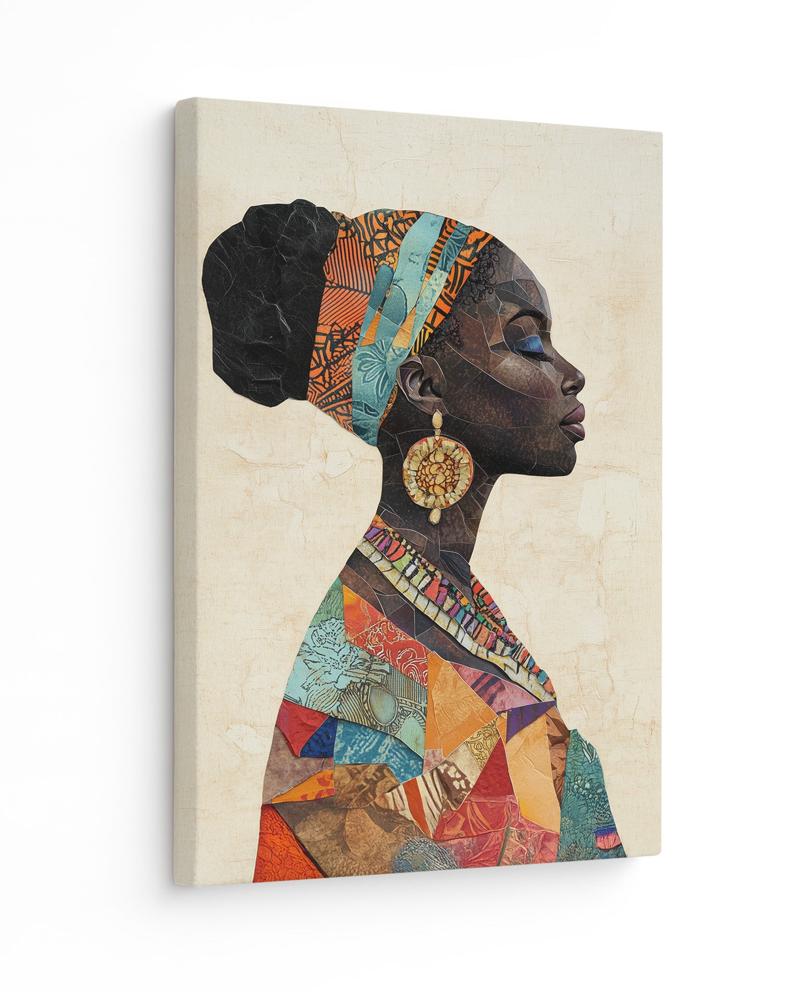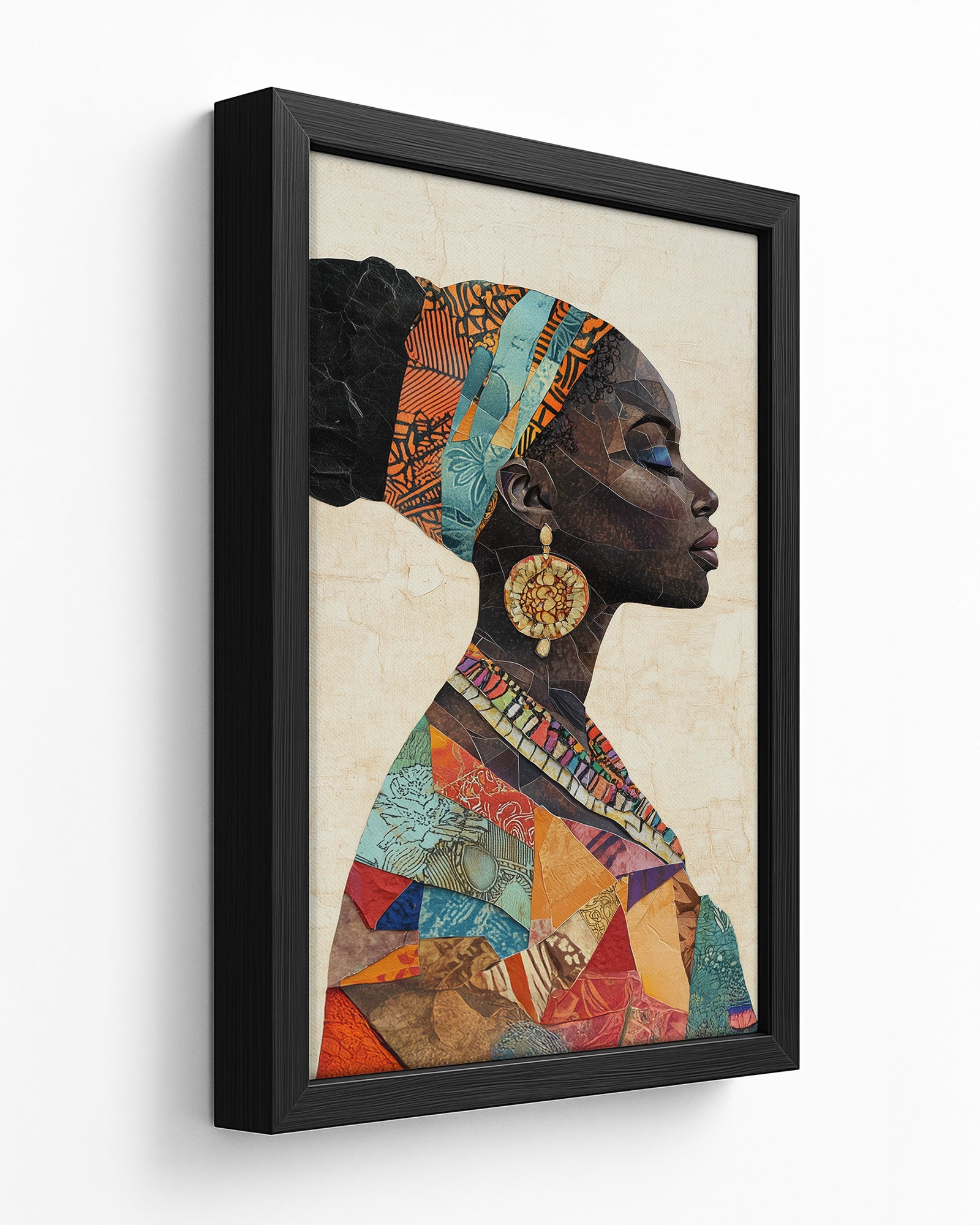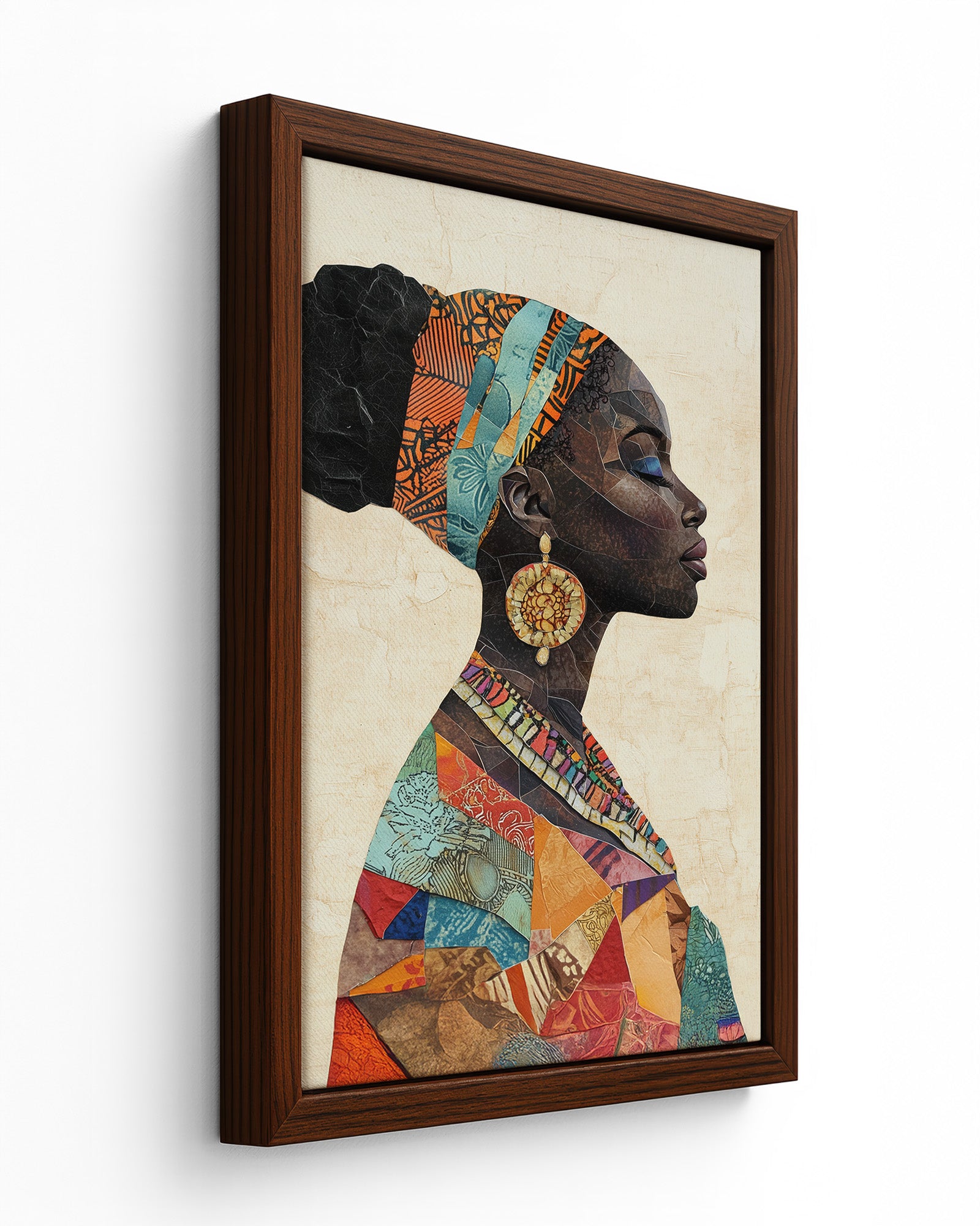 Elevate your space with this stunning minimalist collage art, celebrating African heritage and timeless elegance. A regal African woman, her silhouette adorned in vibrant, torn-paper textures, stands against a warm beige canvas.