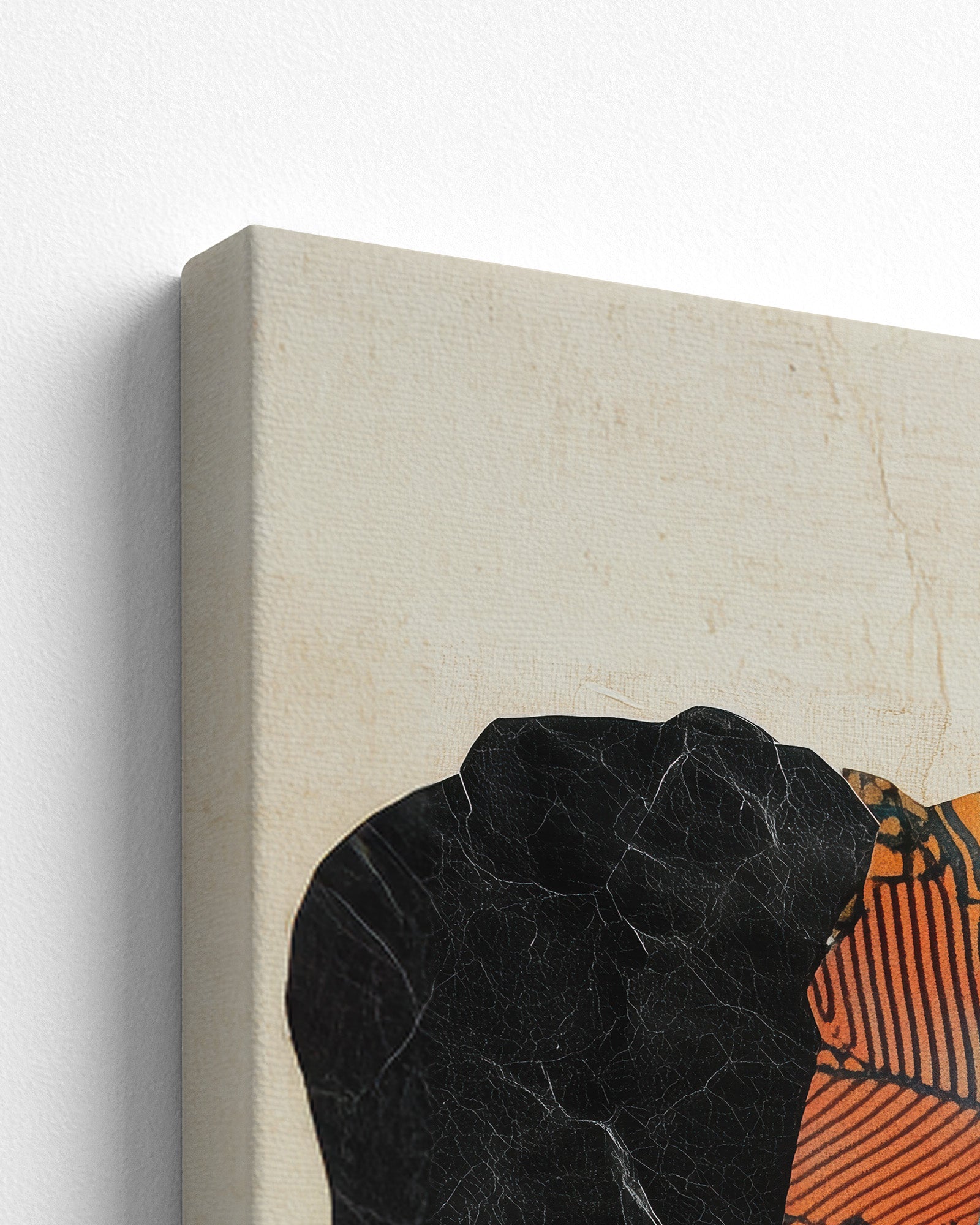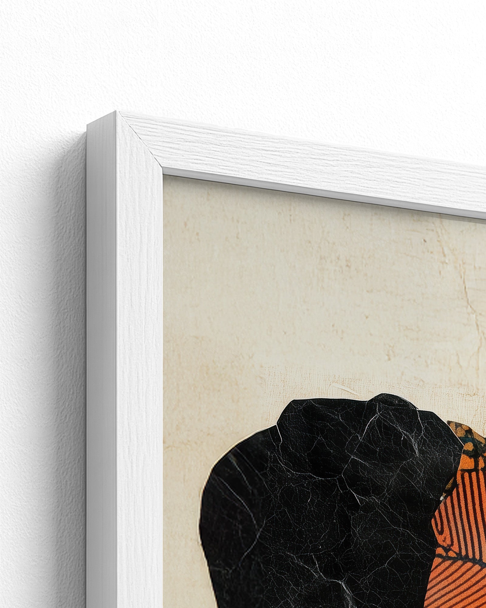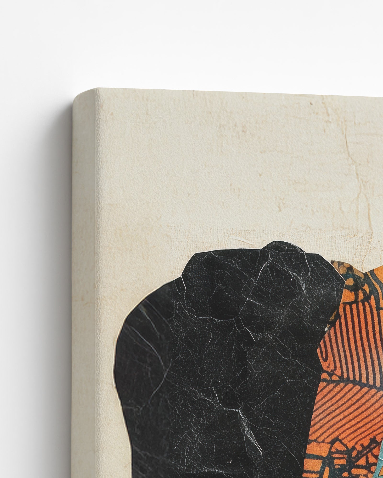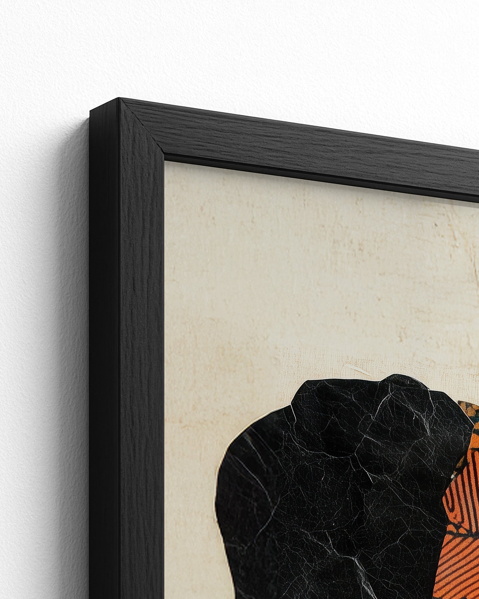 Elevate your space with this stunning minimalist collage art, celebrating African heritage and timeless elegance. A regal African woman, her silhouette adorned in vibrant, torn-paper textures, stands against a warm beige canvas.