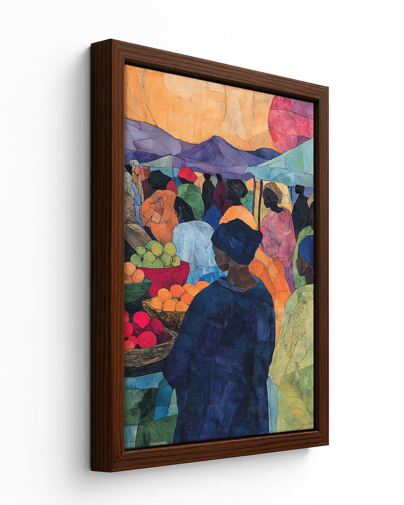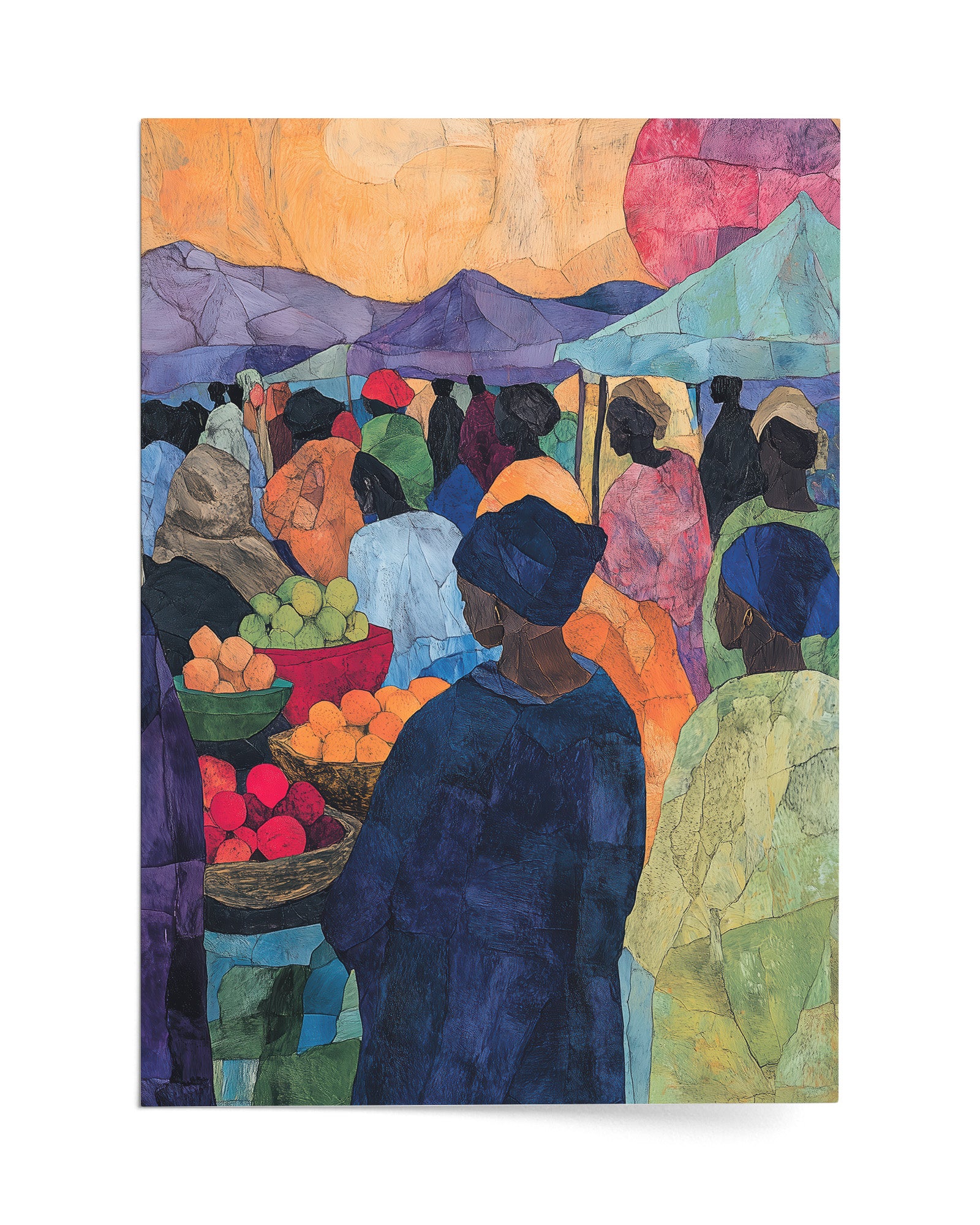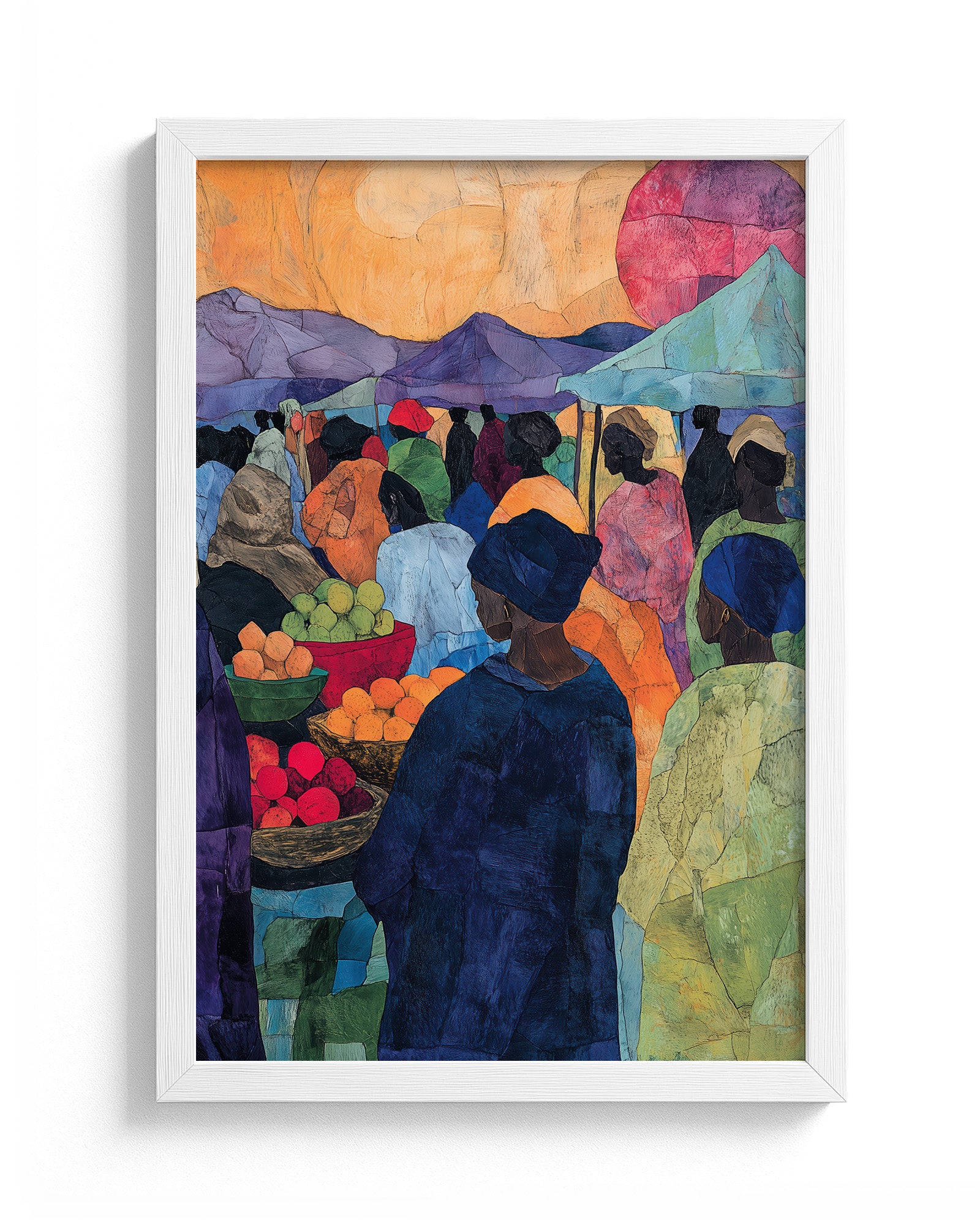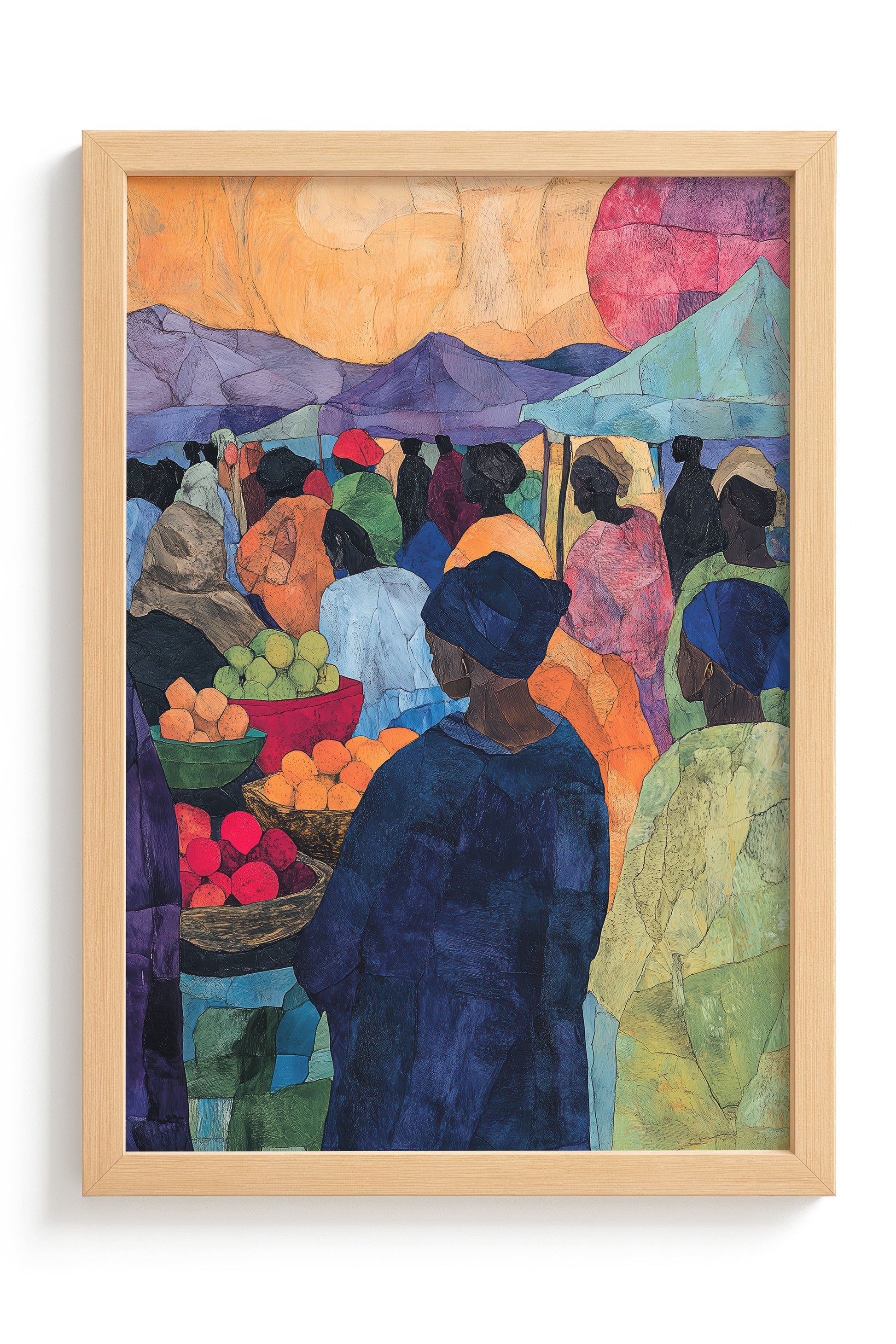 Step into the vibrant energy of an African market scene. Stalls brimming with fruits, fabrics, and pottery come alive under warm golden tones.