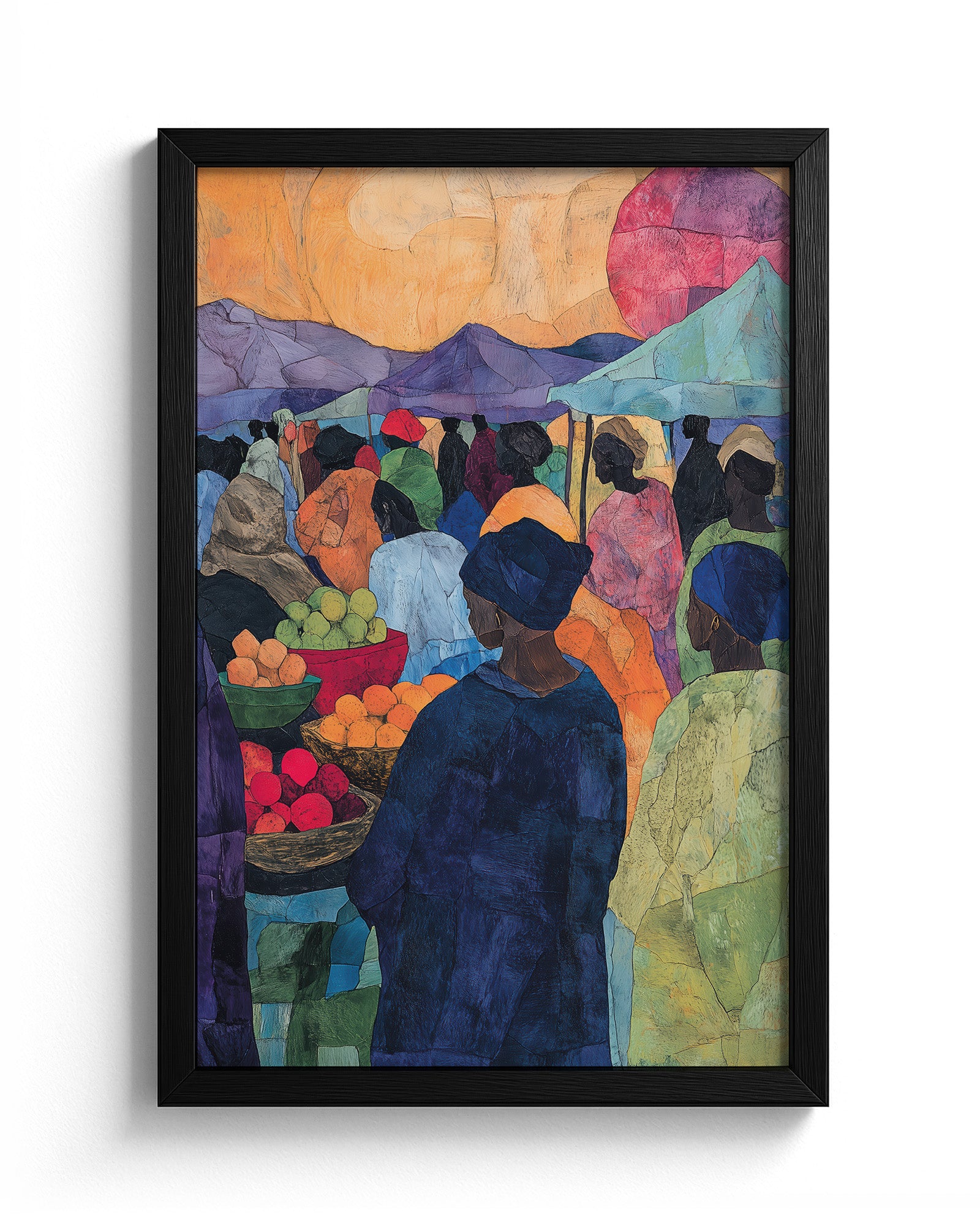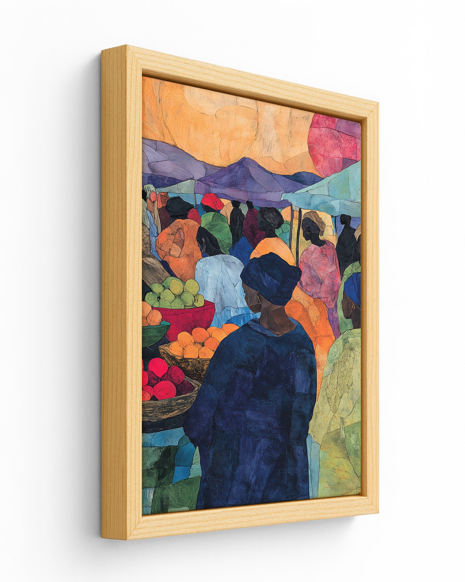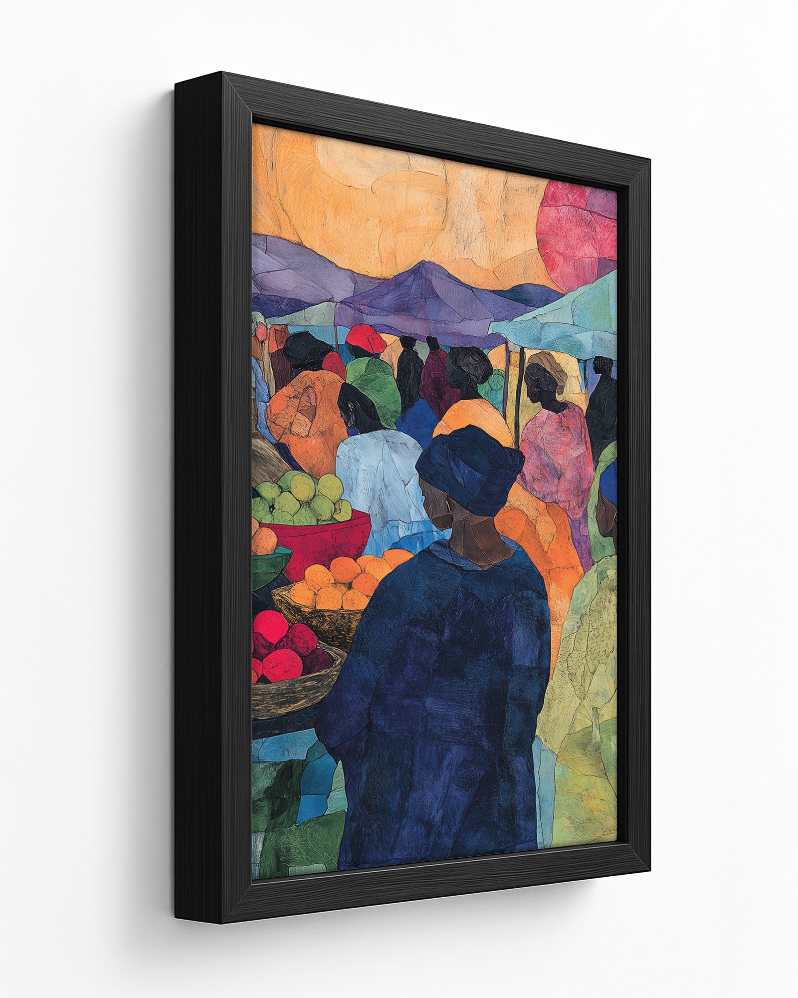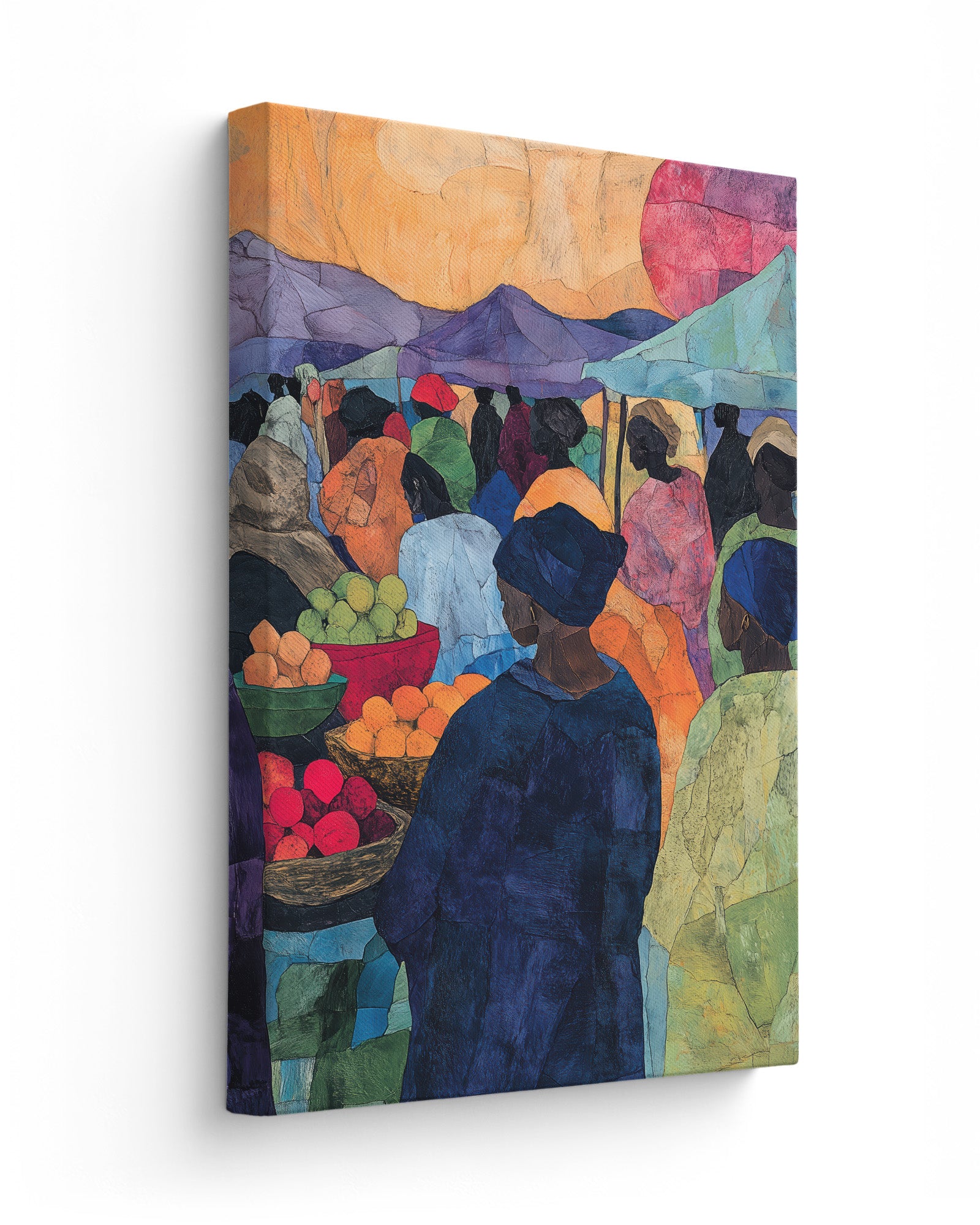 Step into the vibrant energy of an African market scene. Stalls brimming with fruits, fabrics, and pottery come alive under warm golden tones.