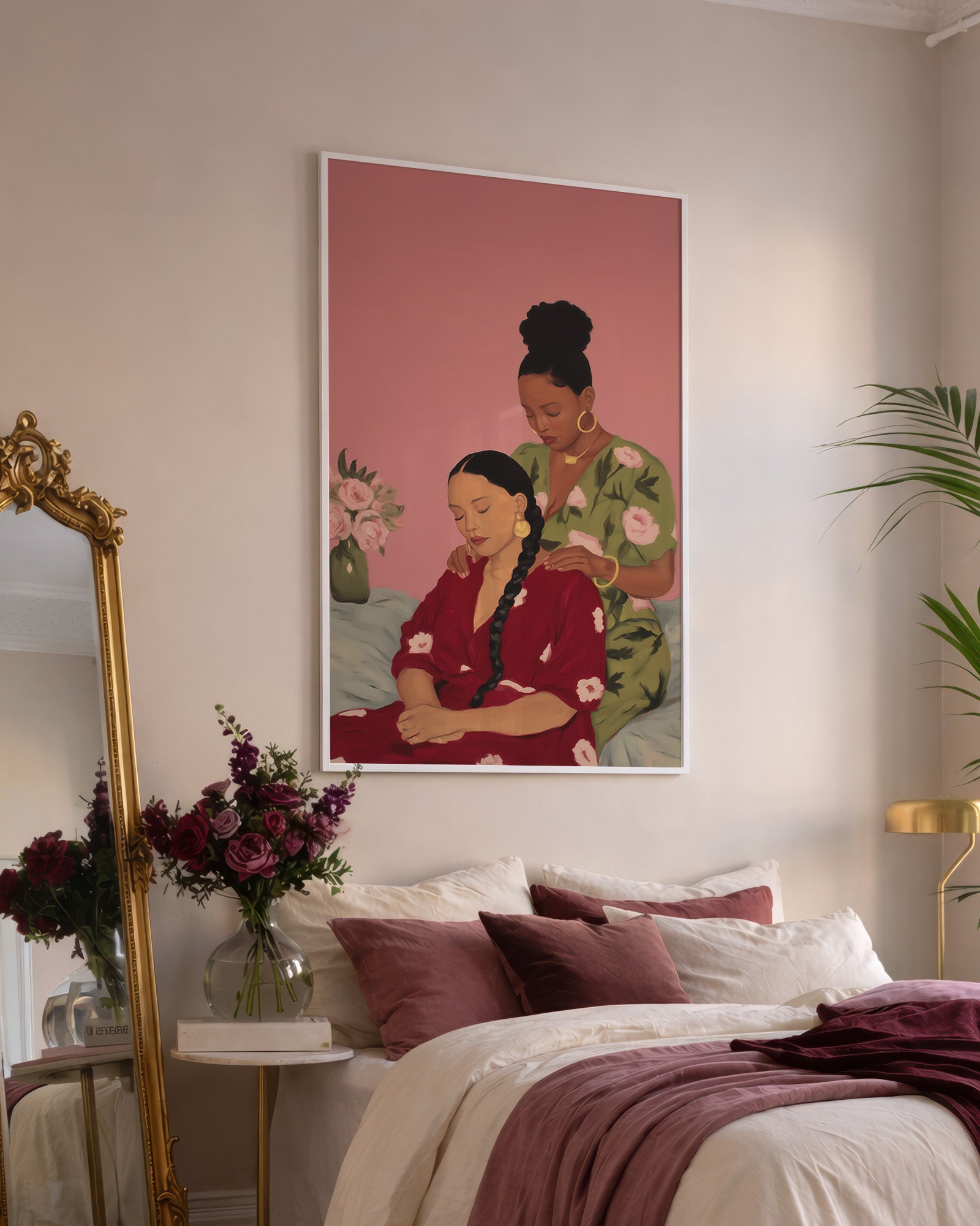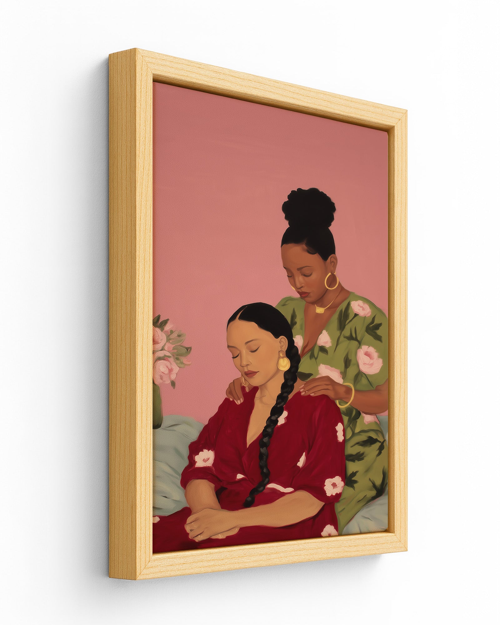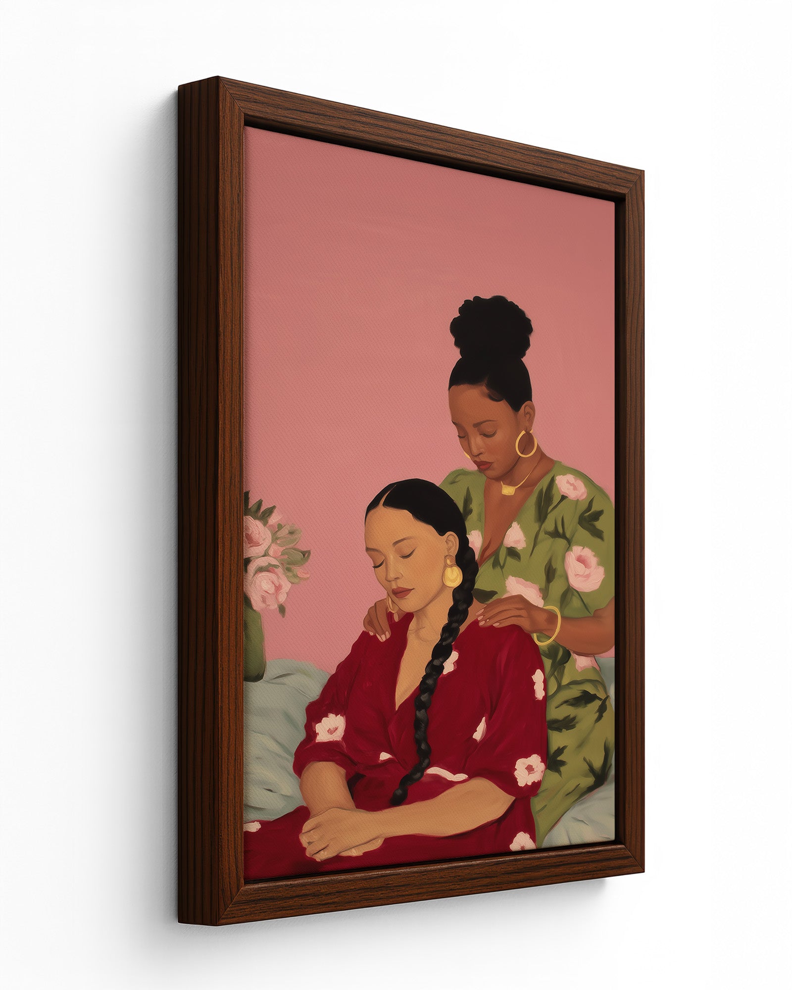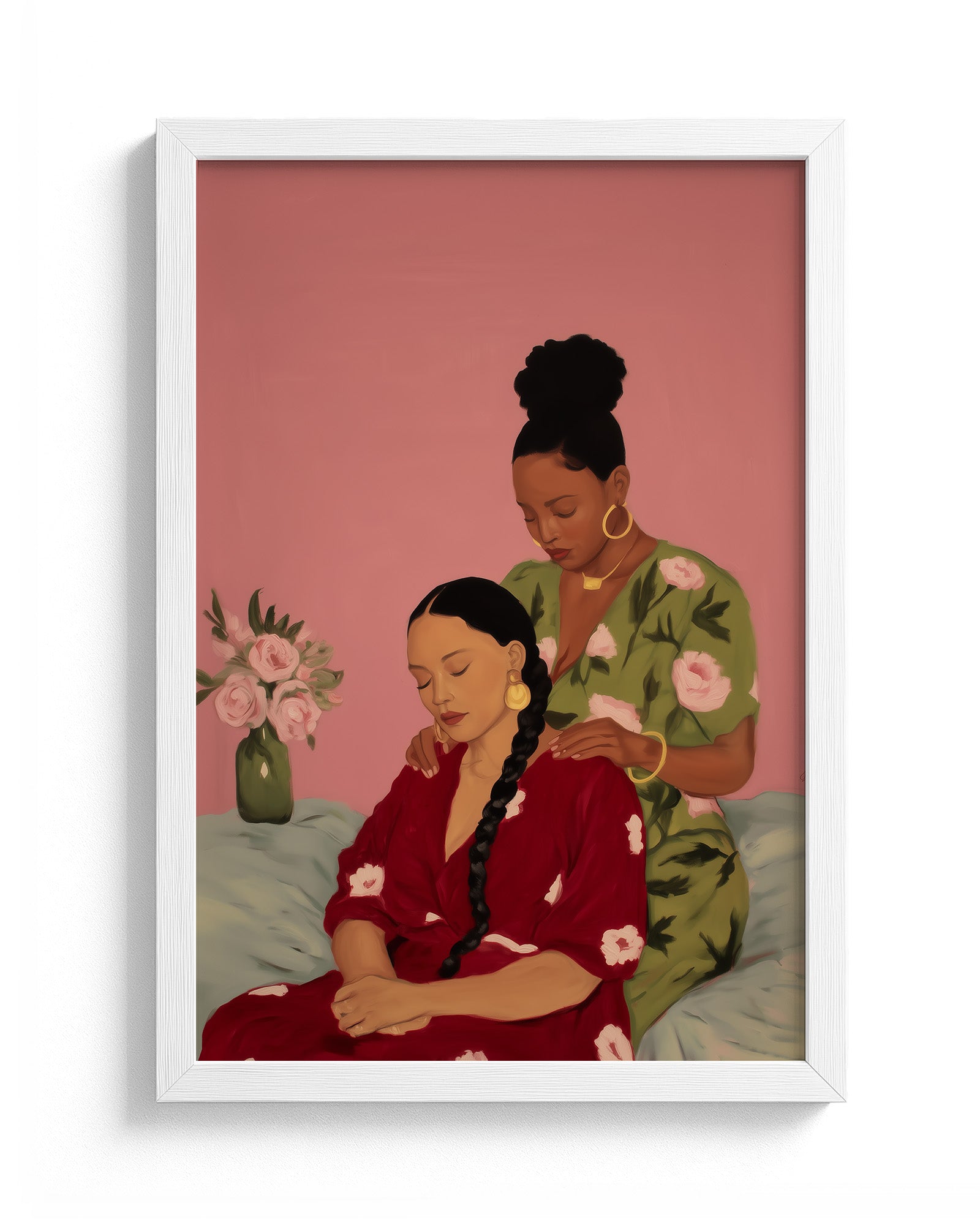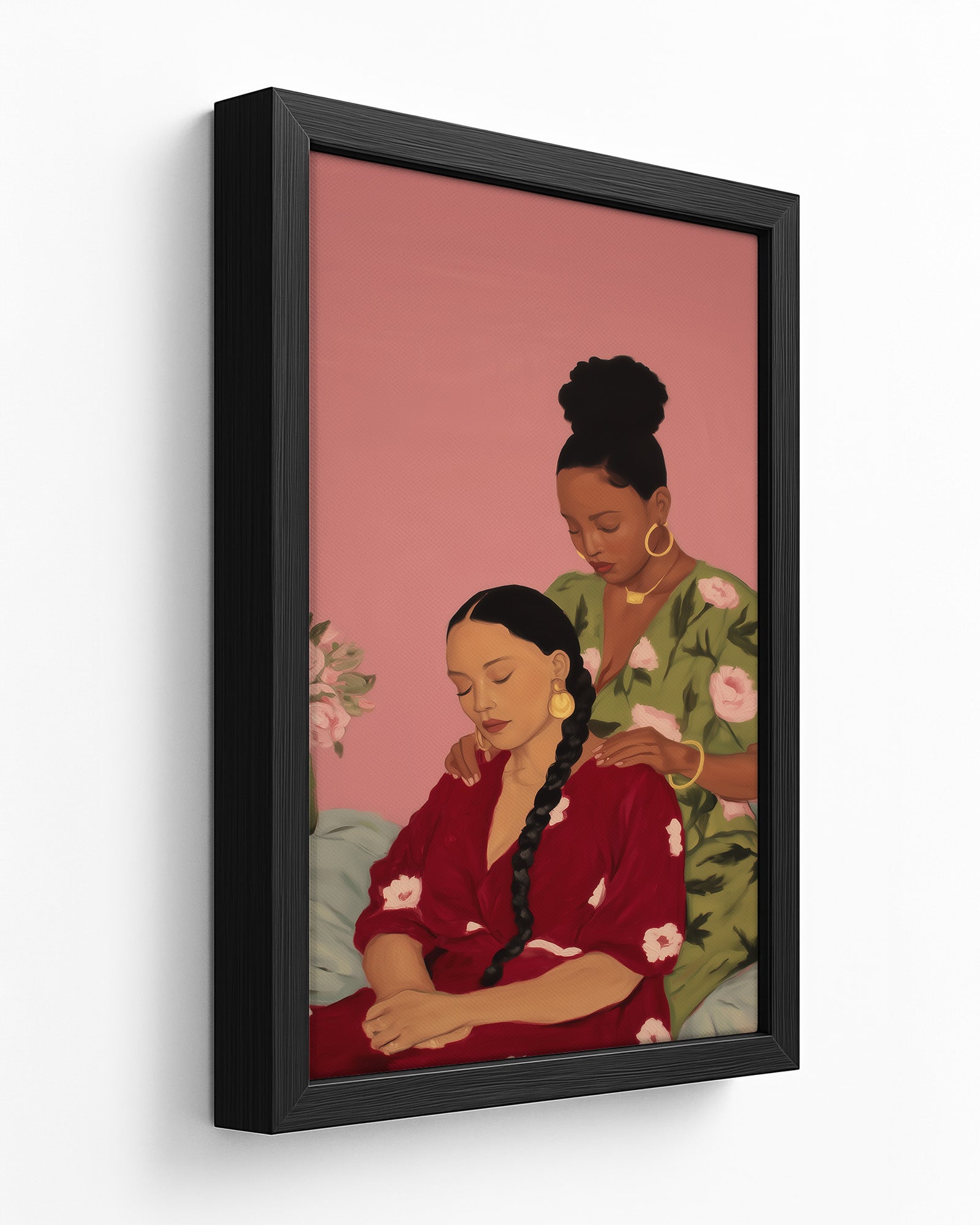 This poetic artwork embodies the essence of feminine solidarity Soft colors and tender gestures create a timeless piece celebrating the comfort one woman brings another, the trust between sisters, and the healing that happens when caring hands provide relief. This piece honors the women who offer healing touch to their sisters, friends, and loved ones, understanding that sometimes the greatest act of love is easing someone's burden.