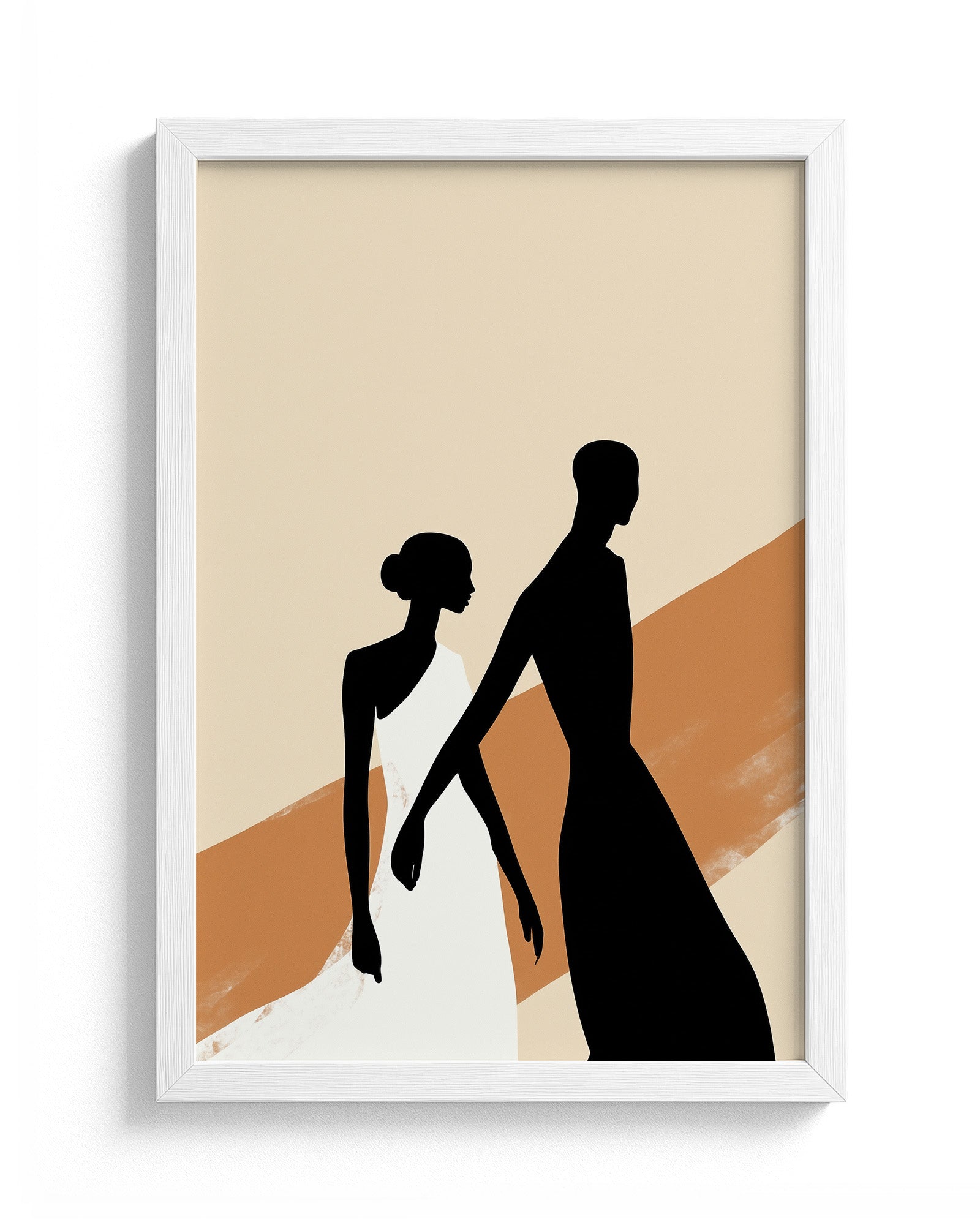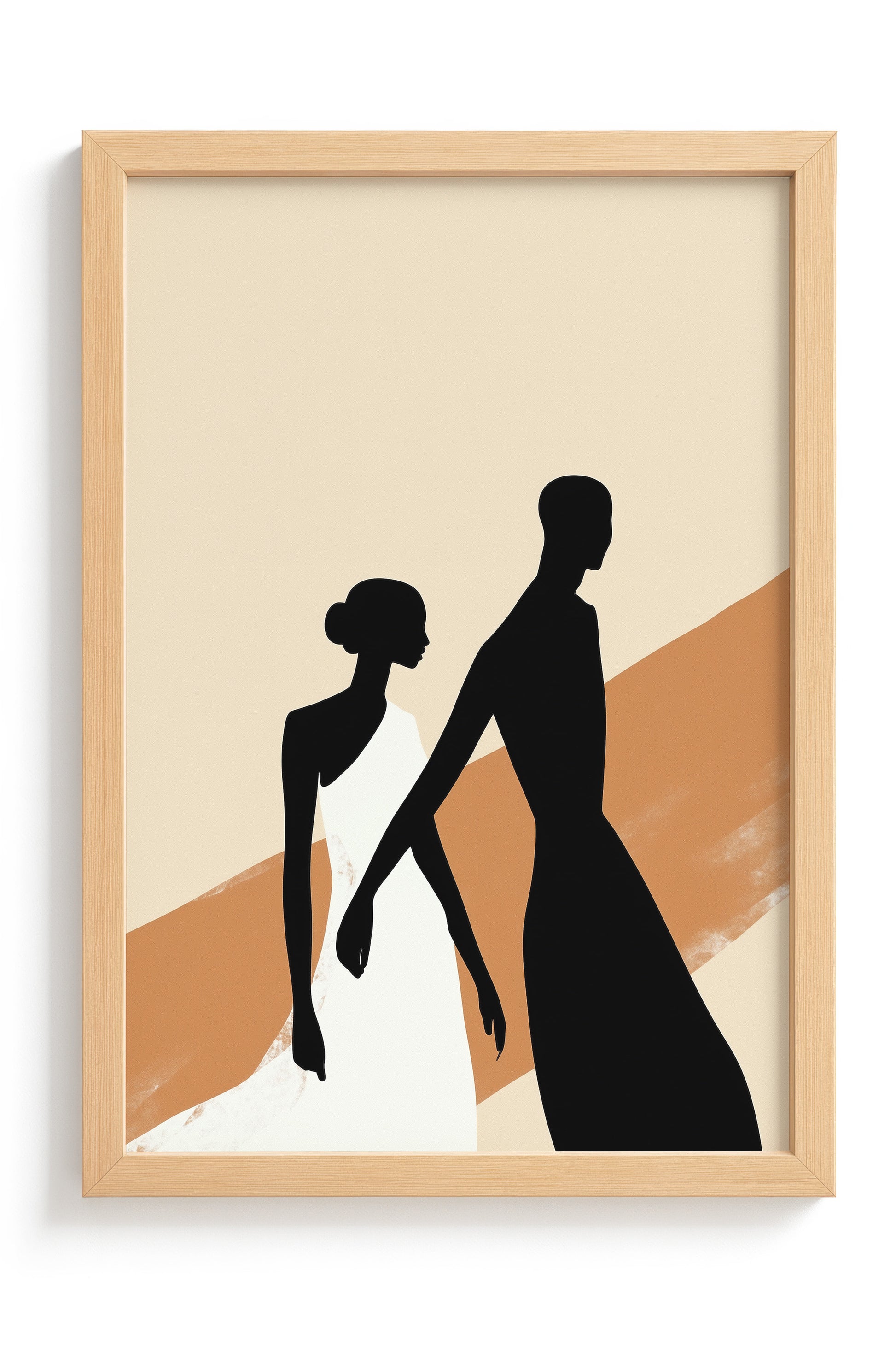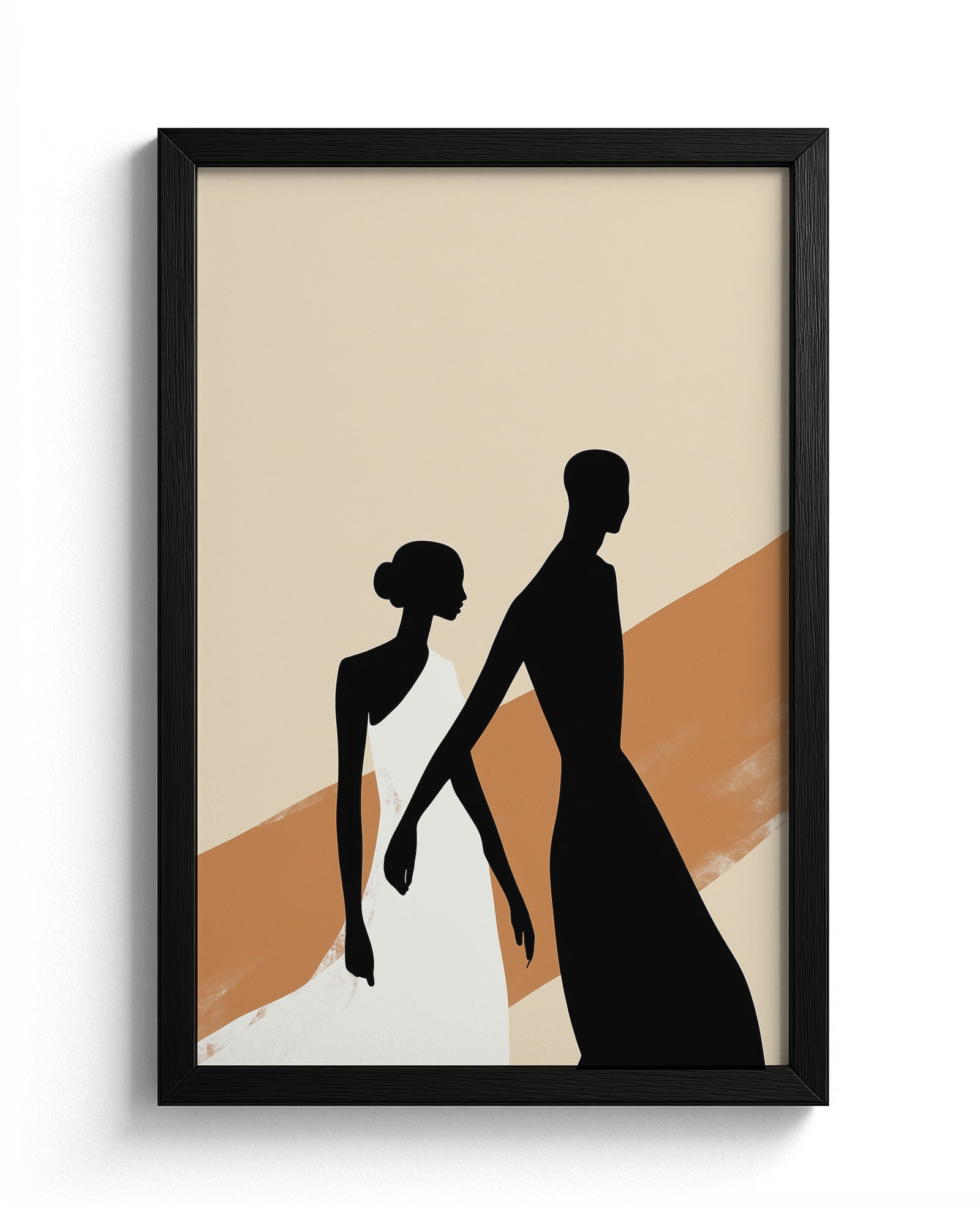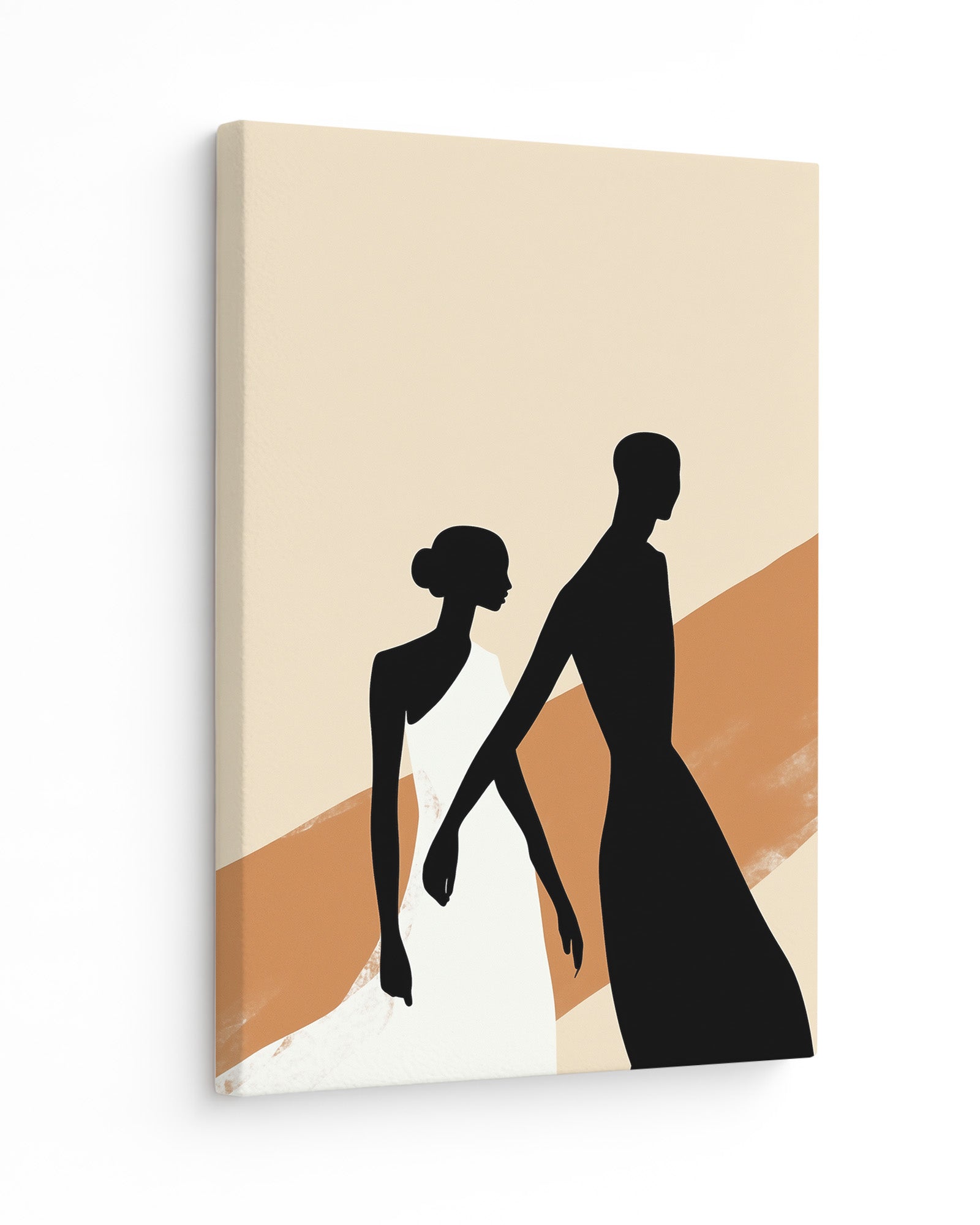 This striking contemporary artwork captures the powerful silhouettes of a male and female dancer against a vibrant orange and beige background with distinctive stripe patterns. The stark contrast between the fluid forms and the warm, textured backdrop creates a dramatic visual statement celebrating movement, relationship, and artistic expression.