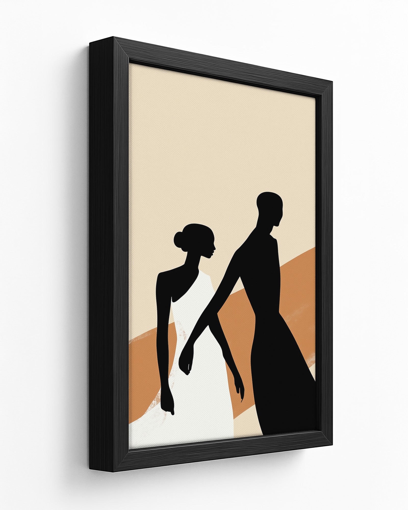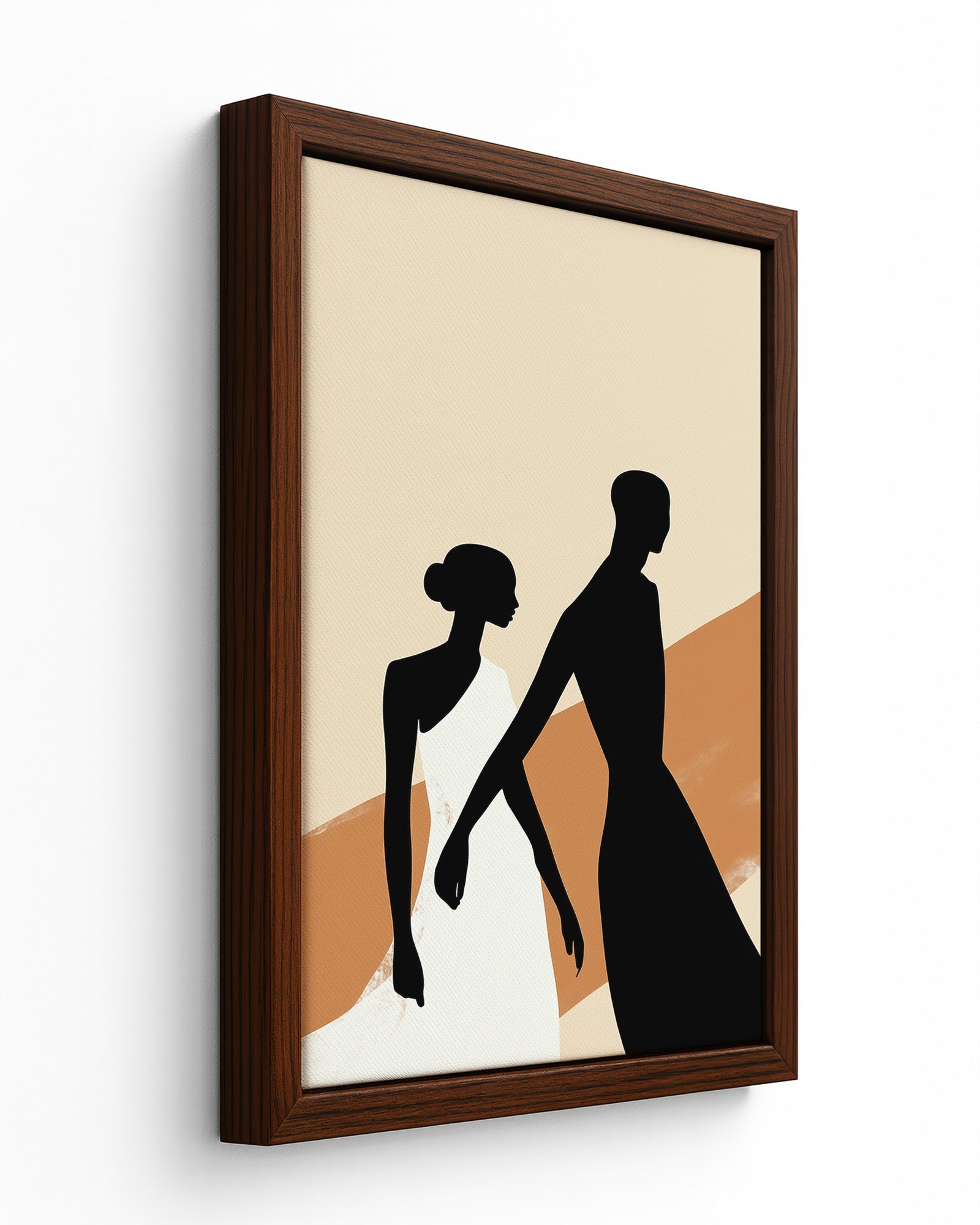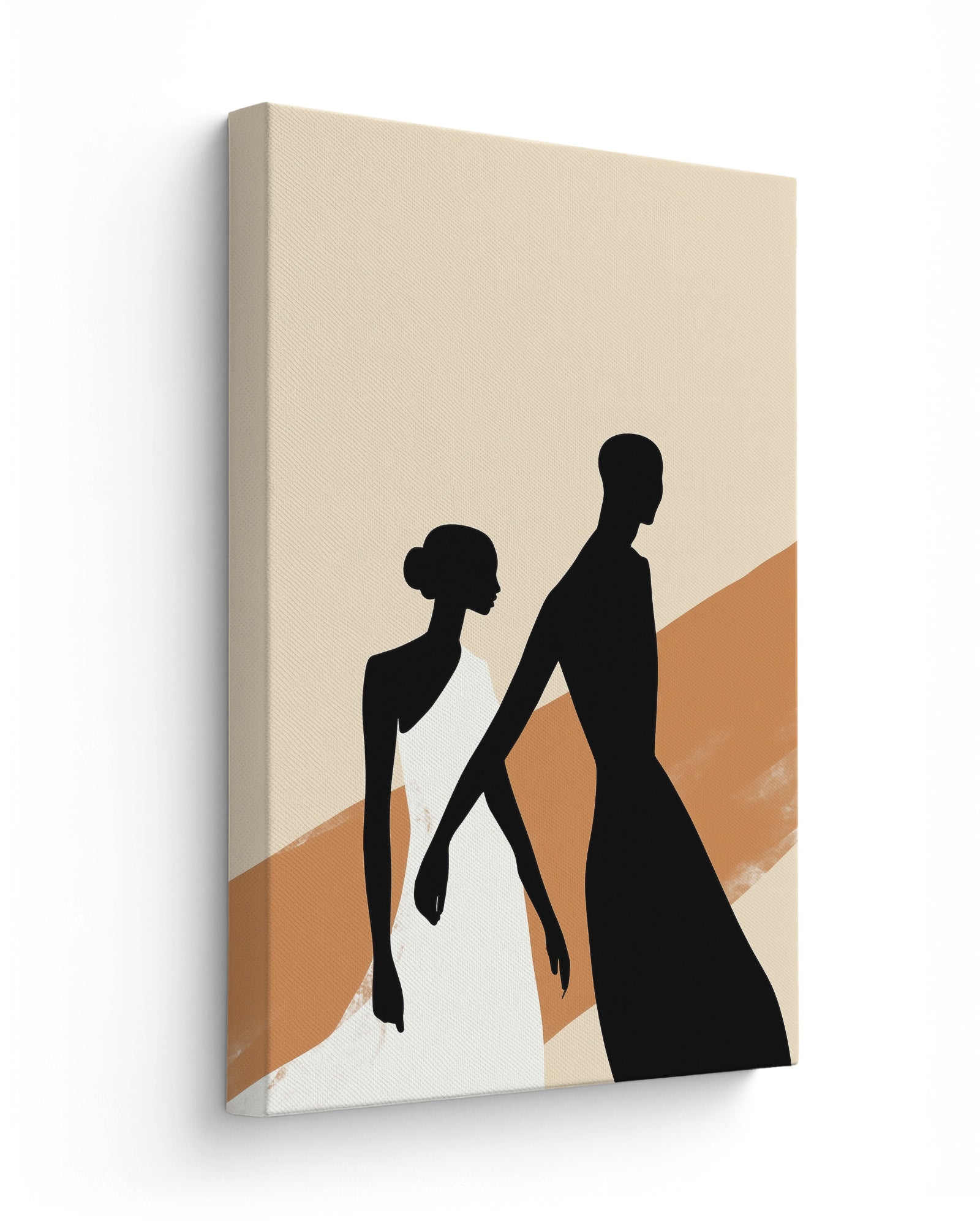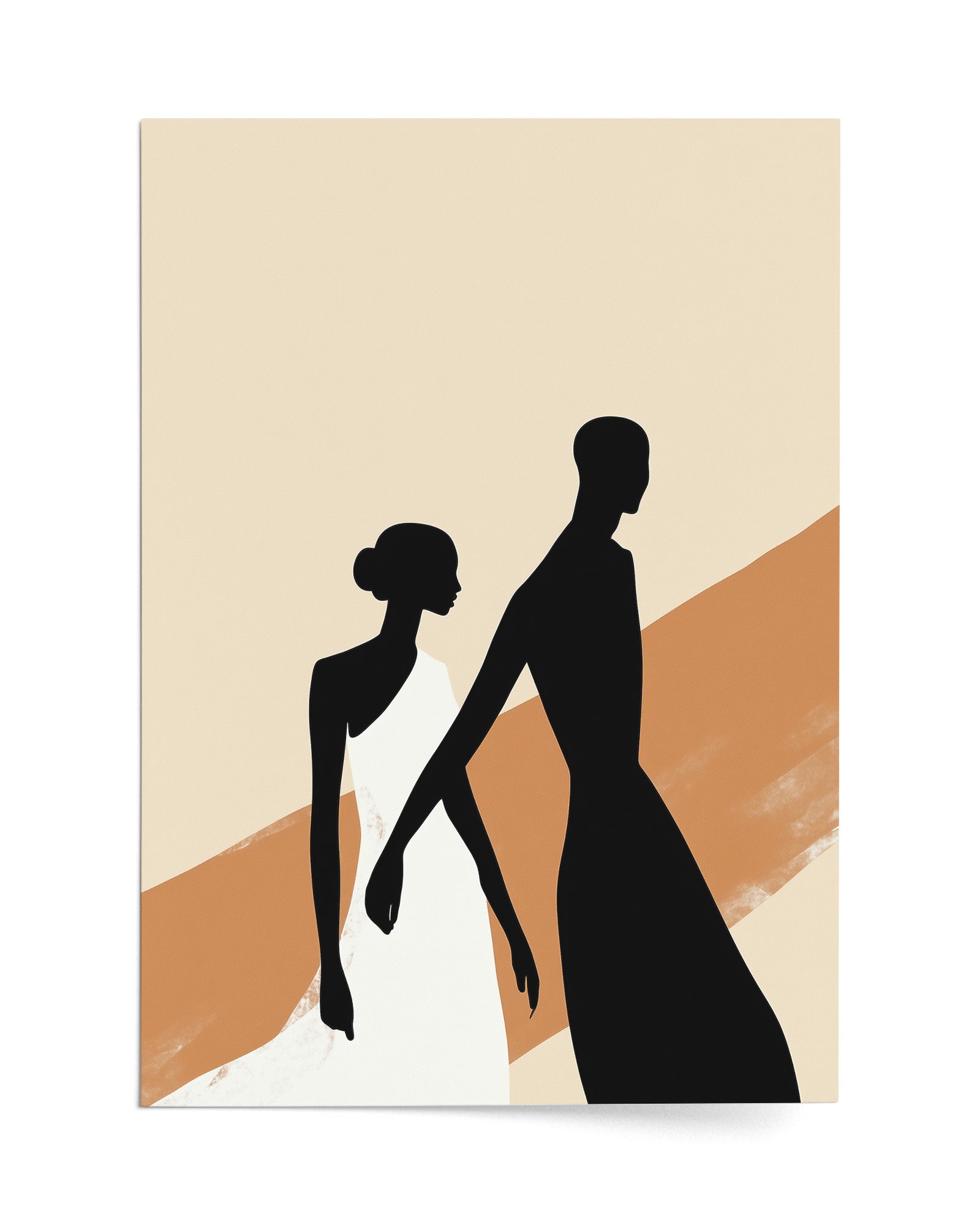 This striking contemporary artwork captures the powerful silhouettes of a male and female dancer against a vibrant orange and beige background with distinctive stripe patterns. The stark contrast between the fluid forms and the warm, textured backdrop creates a dramatic visual statement celebrating movement, relationship, and artistic expression.