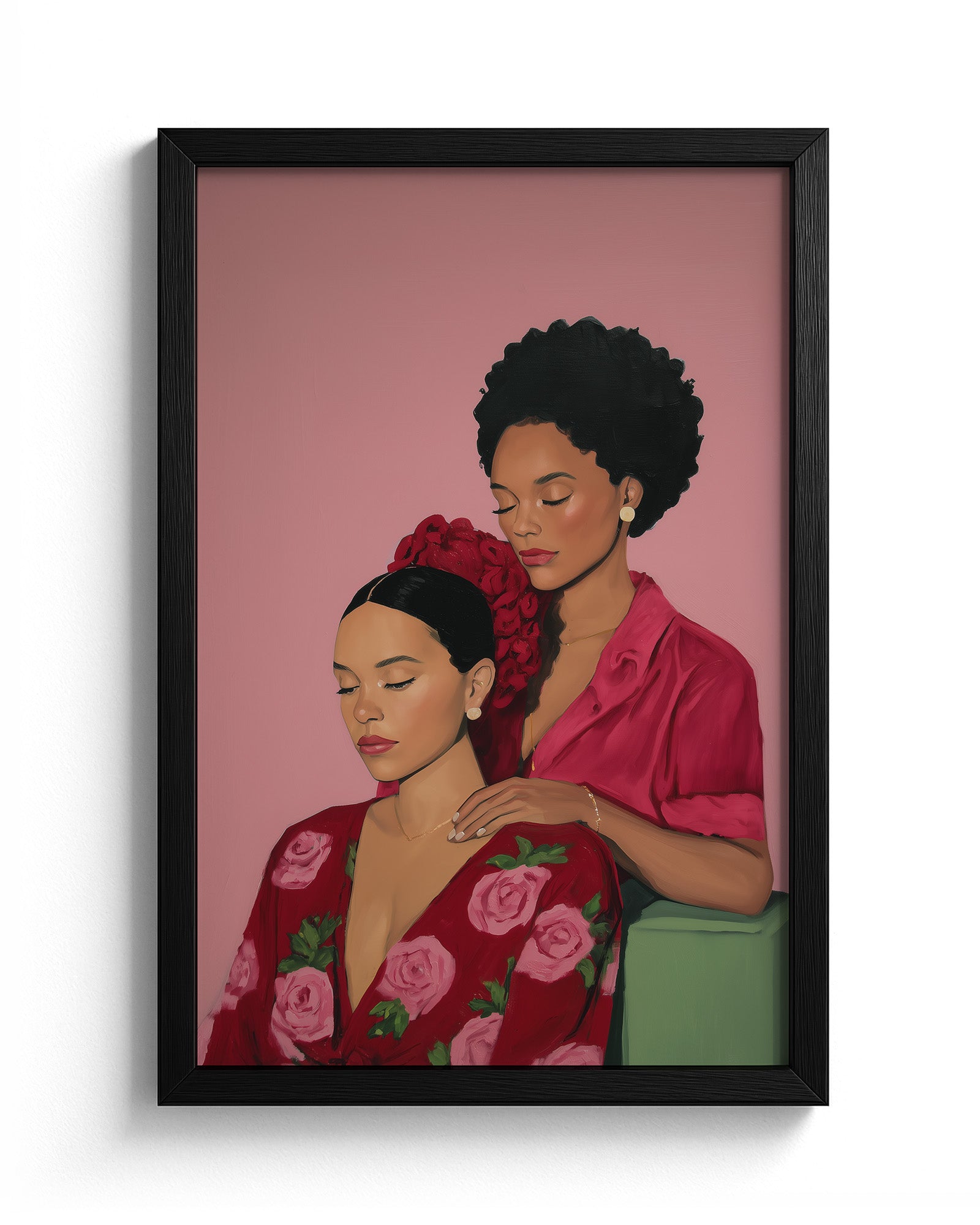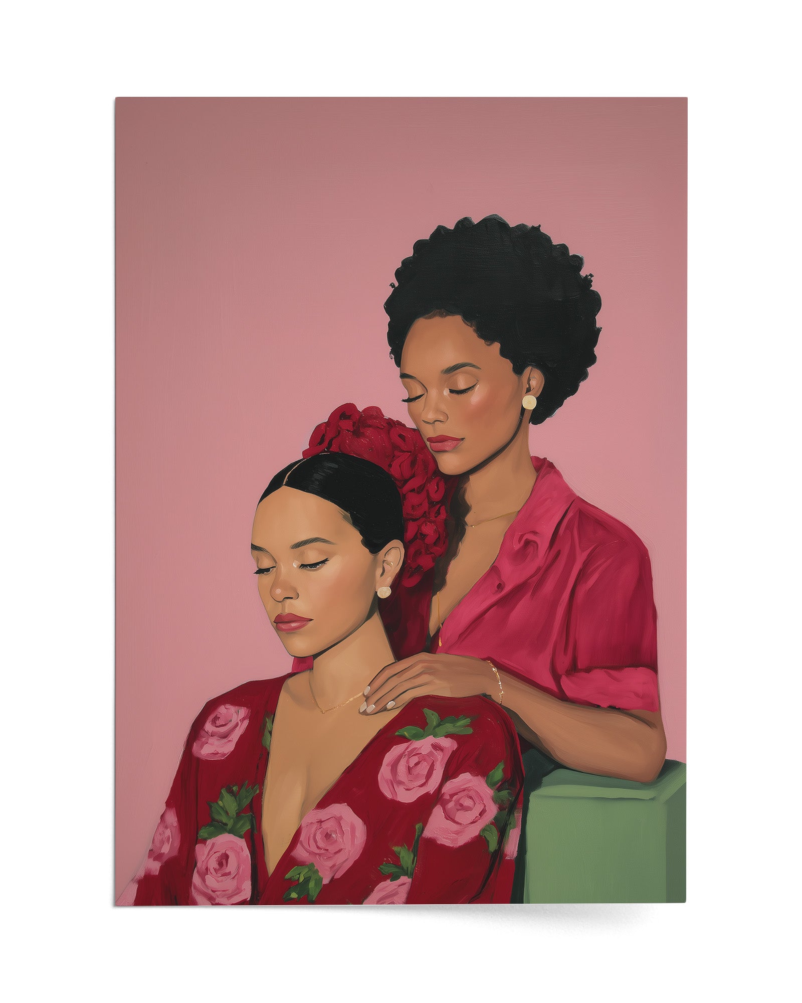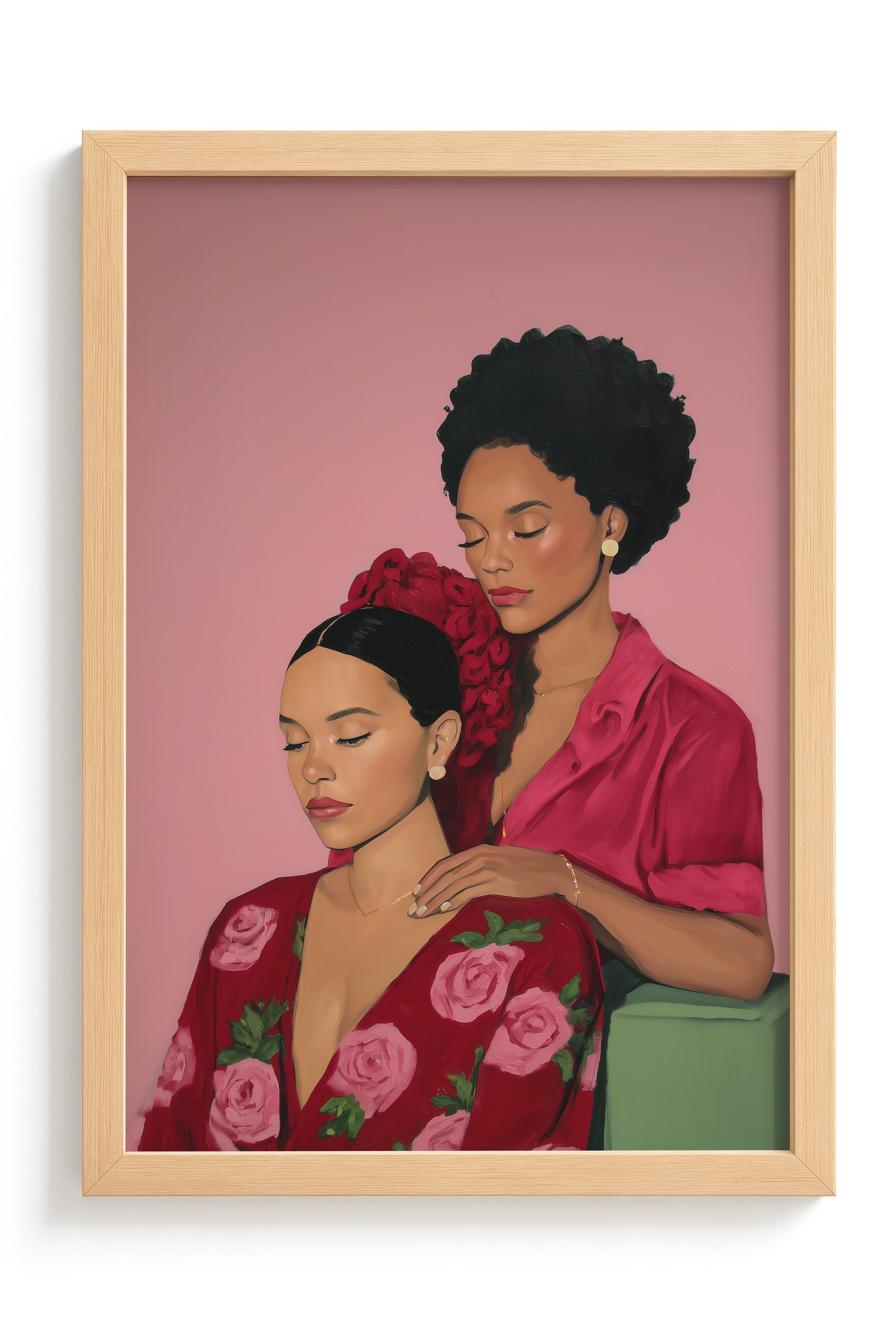 A tender artwork celebrating friendship and sisterhood, showing two women sharing a peaceful moment of care, trust, and deep emotional connection. The gentle gesture between them reflects safety, intimacy, and the beauty of being truly seen and supported by someone who understands you. This piece honors the softness of companionship and the strength found in vulnerability, reminding us that friendship is often expressed through quiet presence, nurturing touch, and shared stillness. It captures how meaningful bonds are built in moments of calm, love, and mutual respect.