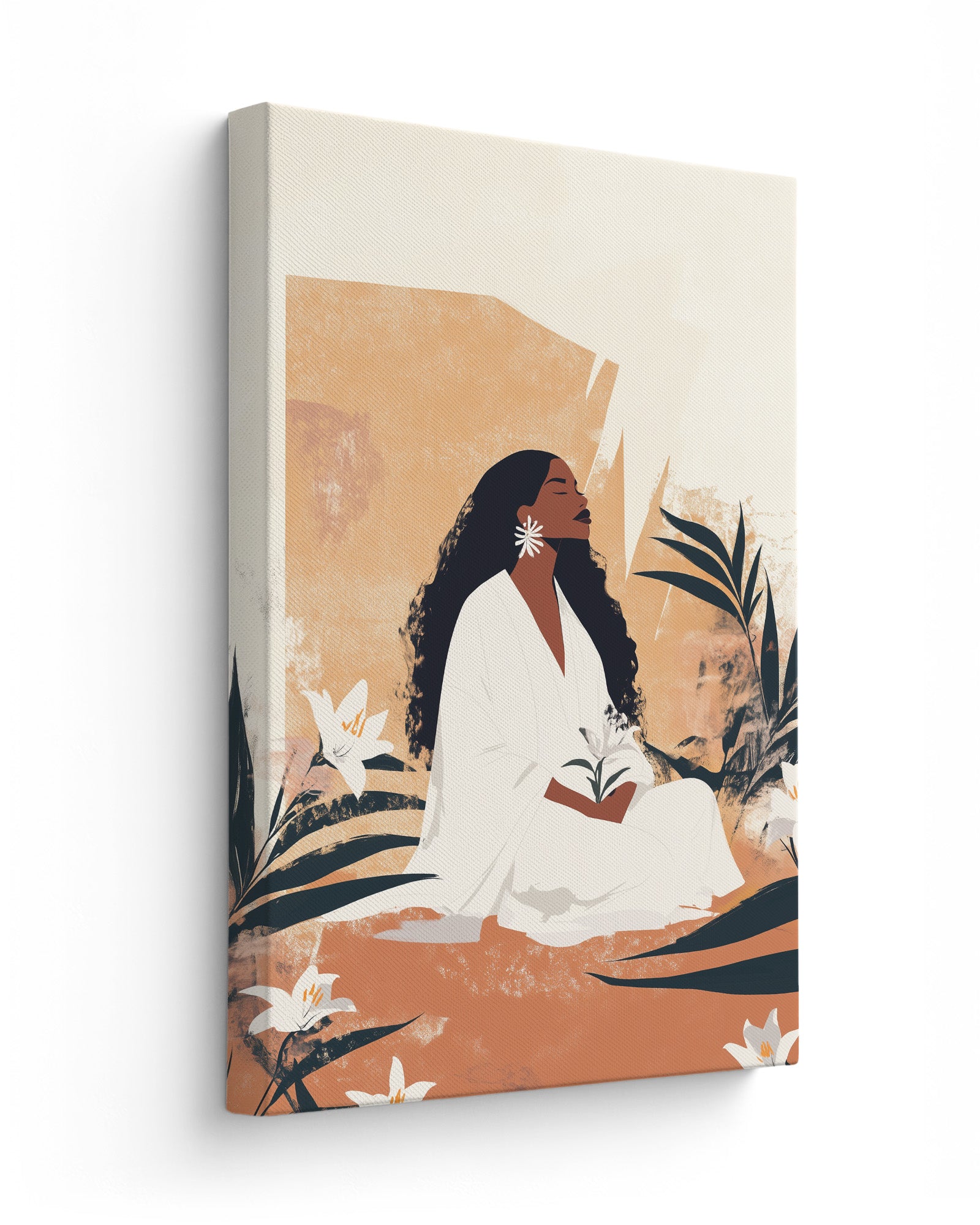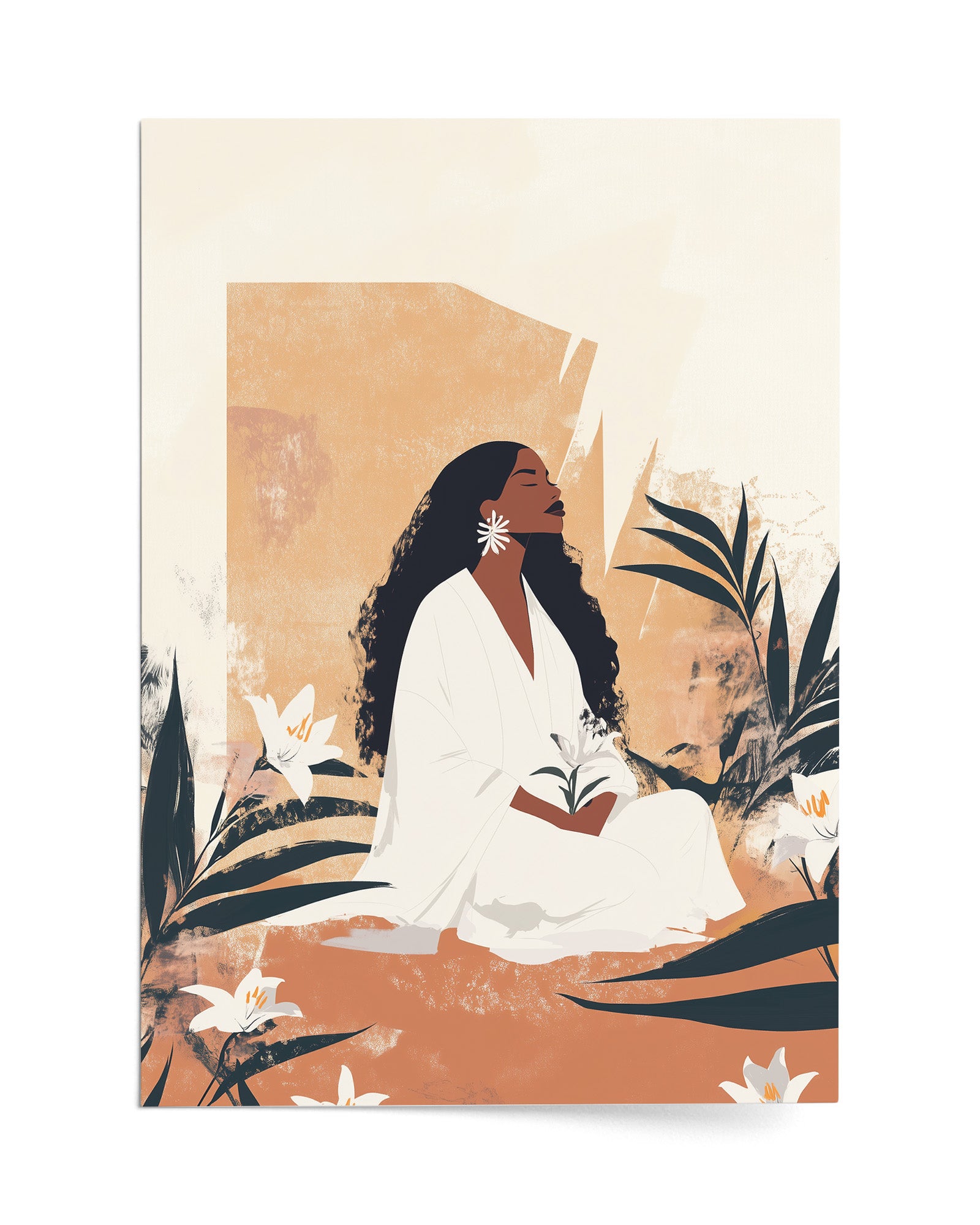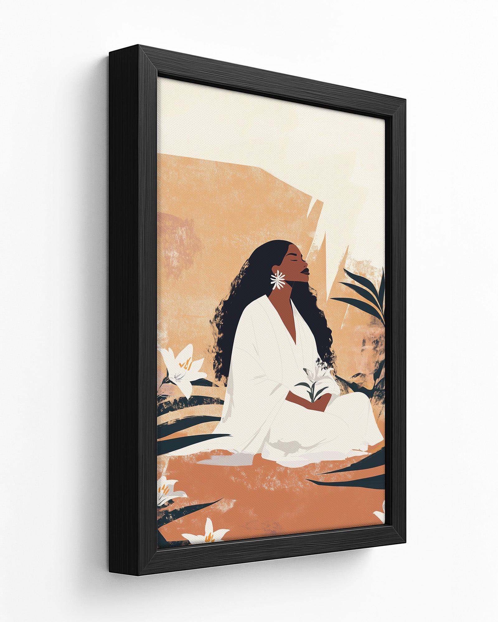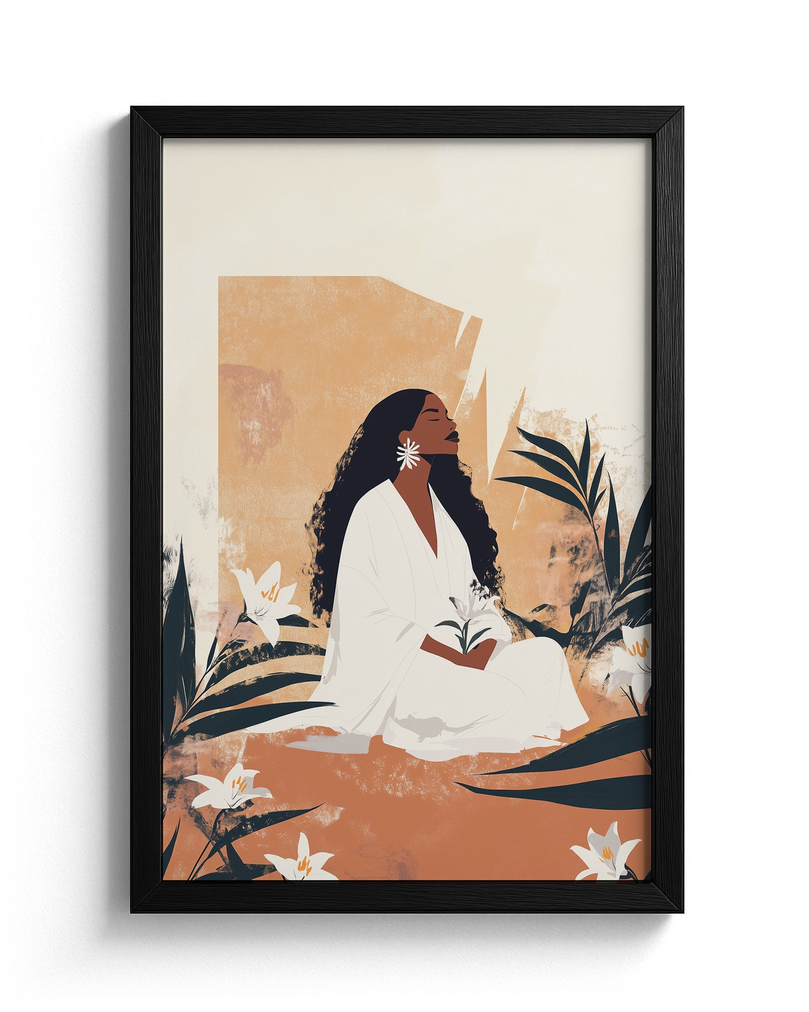 A timeless portrayal of serenity and strength, this artwork features a woman seated in sacred stillness, surrounded by blooming lilies and golden earth tones. Her peaceful presence radiates from the canvas, celebrating divine femininity, rootedness, and quiet resilience. A soulful tribute to Afro-Caribbean heritage and ancestral calm, this piece brings depth, warmth, and elegance to any room. Discover this and more from Kultured Art’s poetic collection.