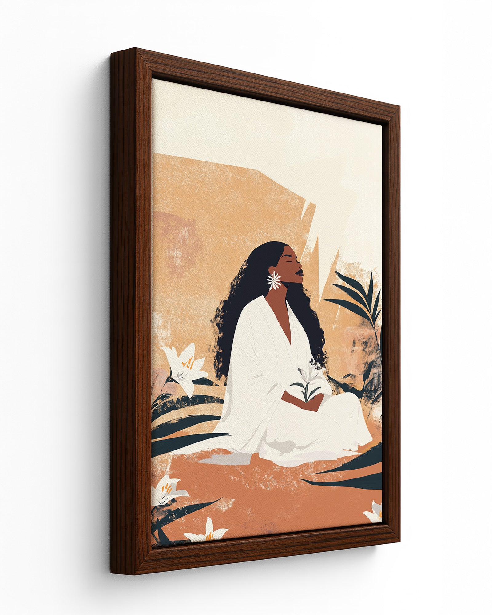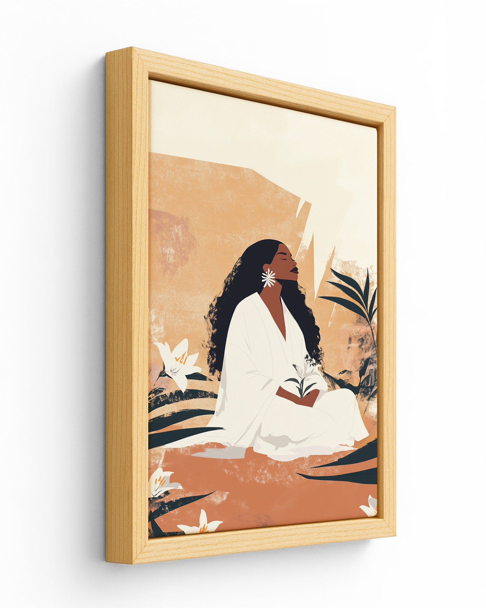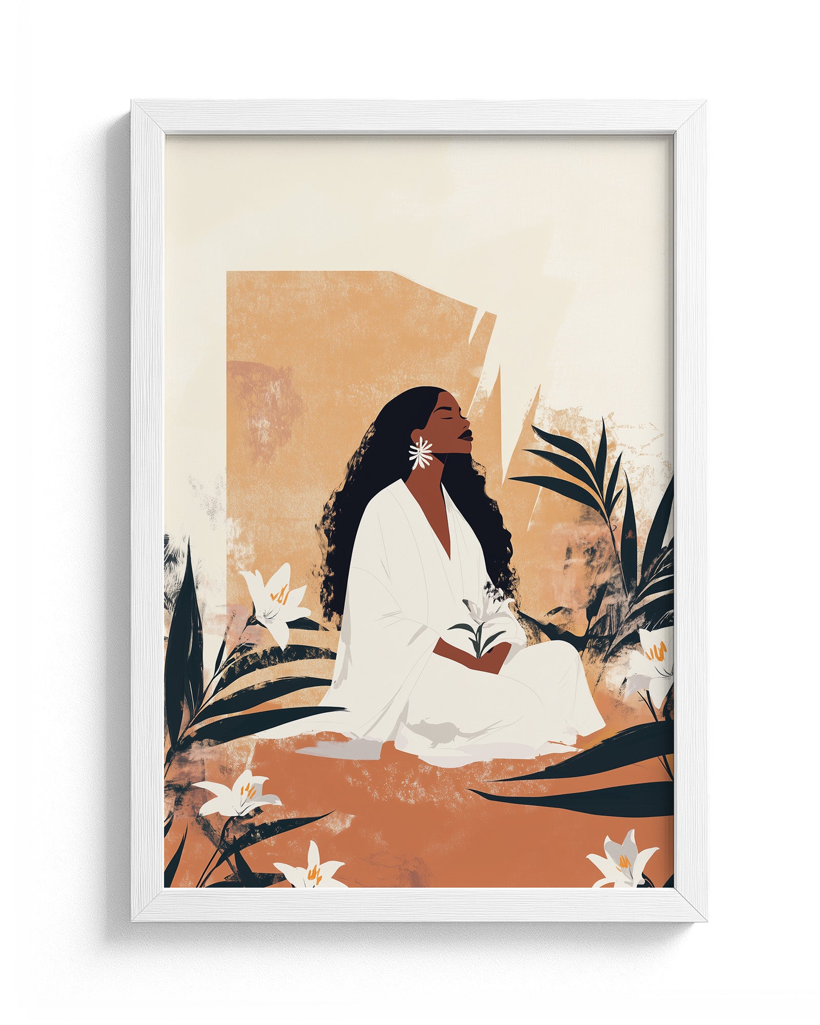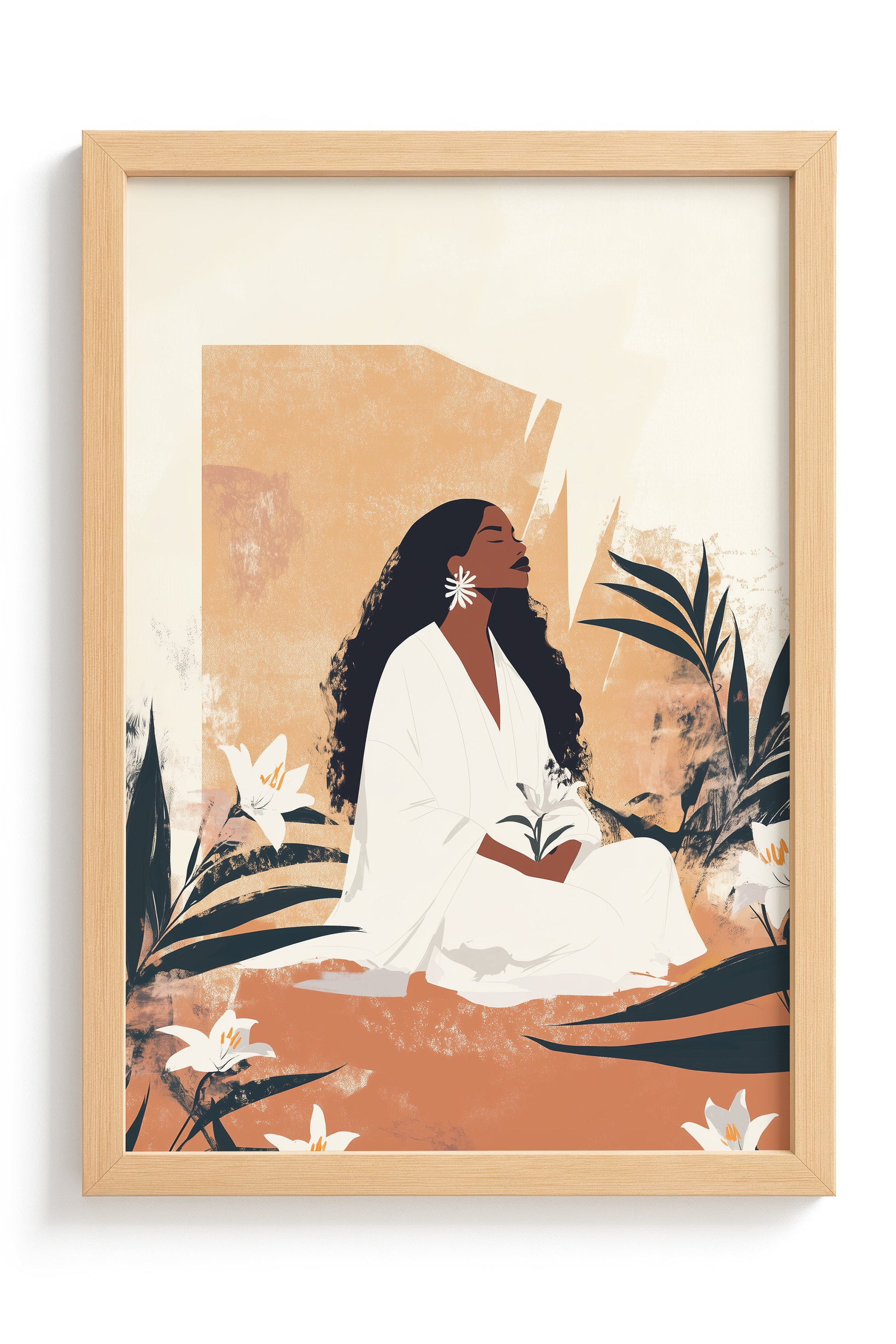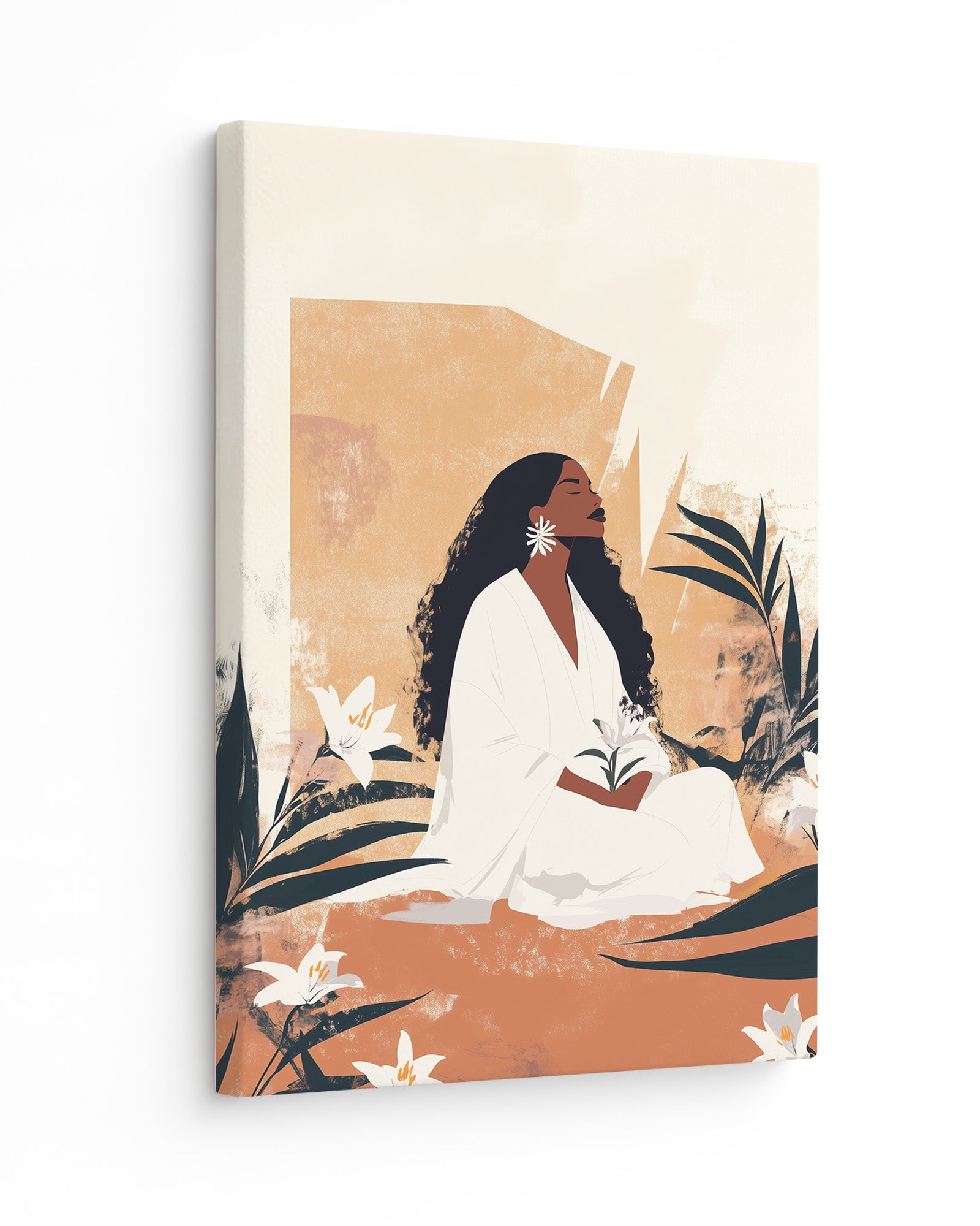 A timeless portrayal of serenity and strength, this artwork features a woman seated in sacred stillness, surrounded by blooming lilies and golden earth tones. Her peaceful presence radiates from the canvas, celebrating divine femininity, rootedness, and quiet resilience. A soulful tribute to Afro-Caribbean heritage and ancestral calm, this piece brings depth, warmth, and elegance to any room. Discover this and more from Kultured Art’s poetic collection.
