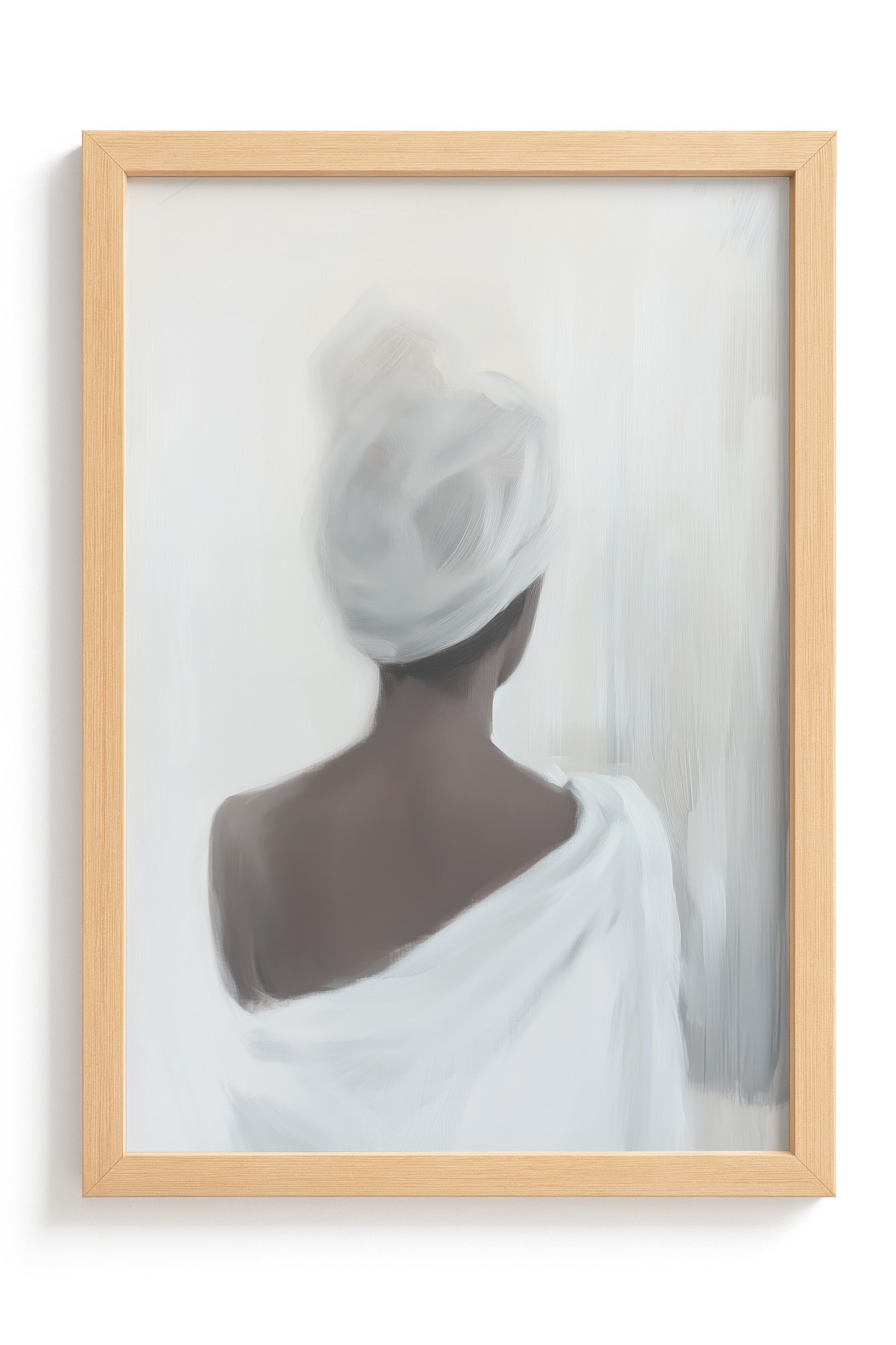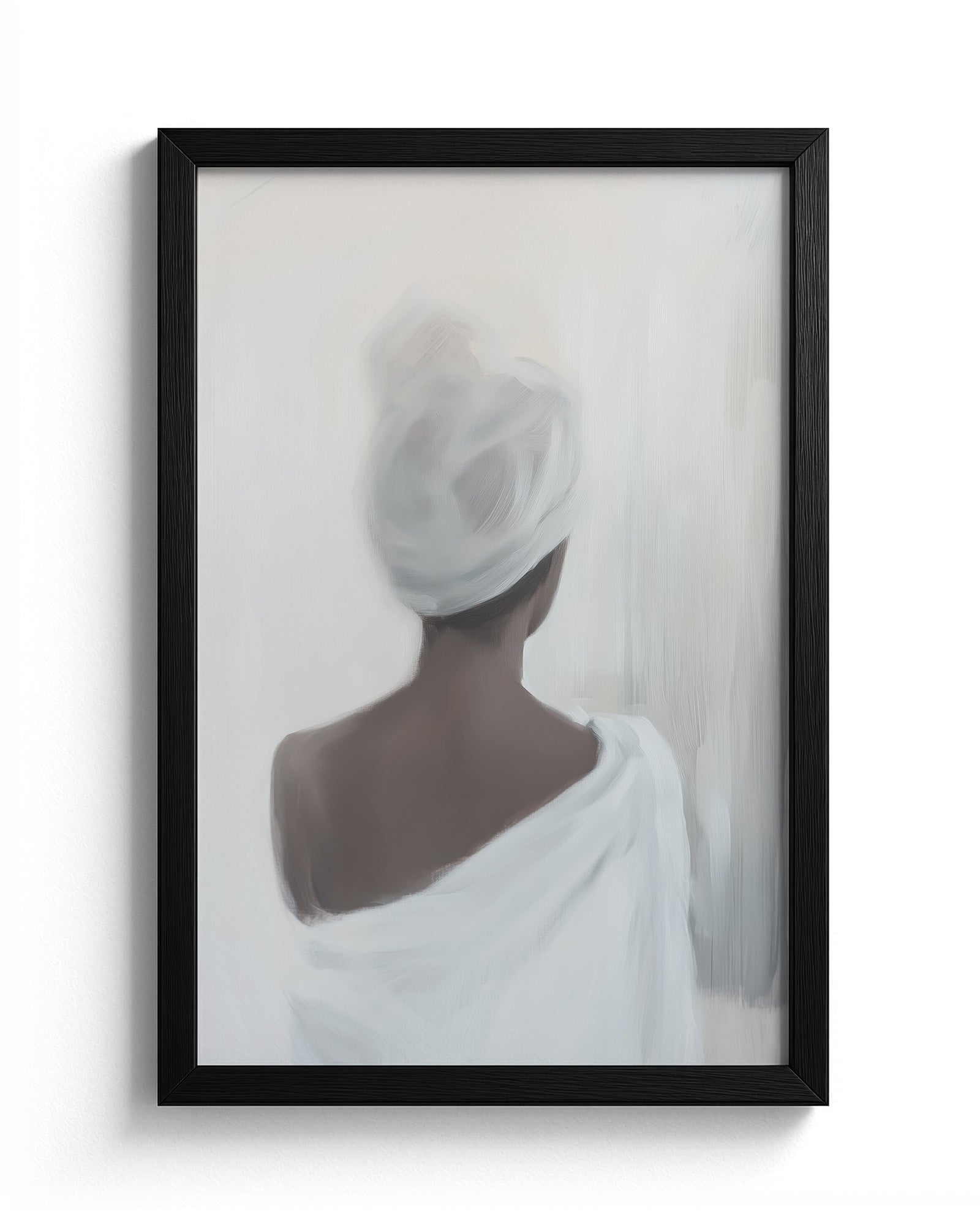 A delicate oil-style artwork capturing a woman’s quiet pause after the warmth of water. Wrapped in a robe, her figure soft against the fogged ambiance of a steamed-up bathroom, this portrait speaks to solitude, softness, and the beauty of the everyday ritual.