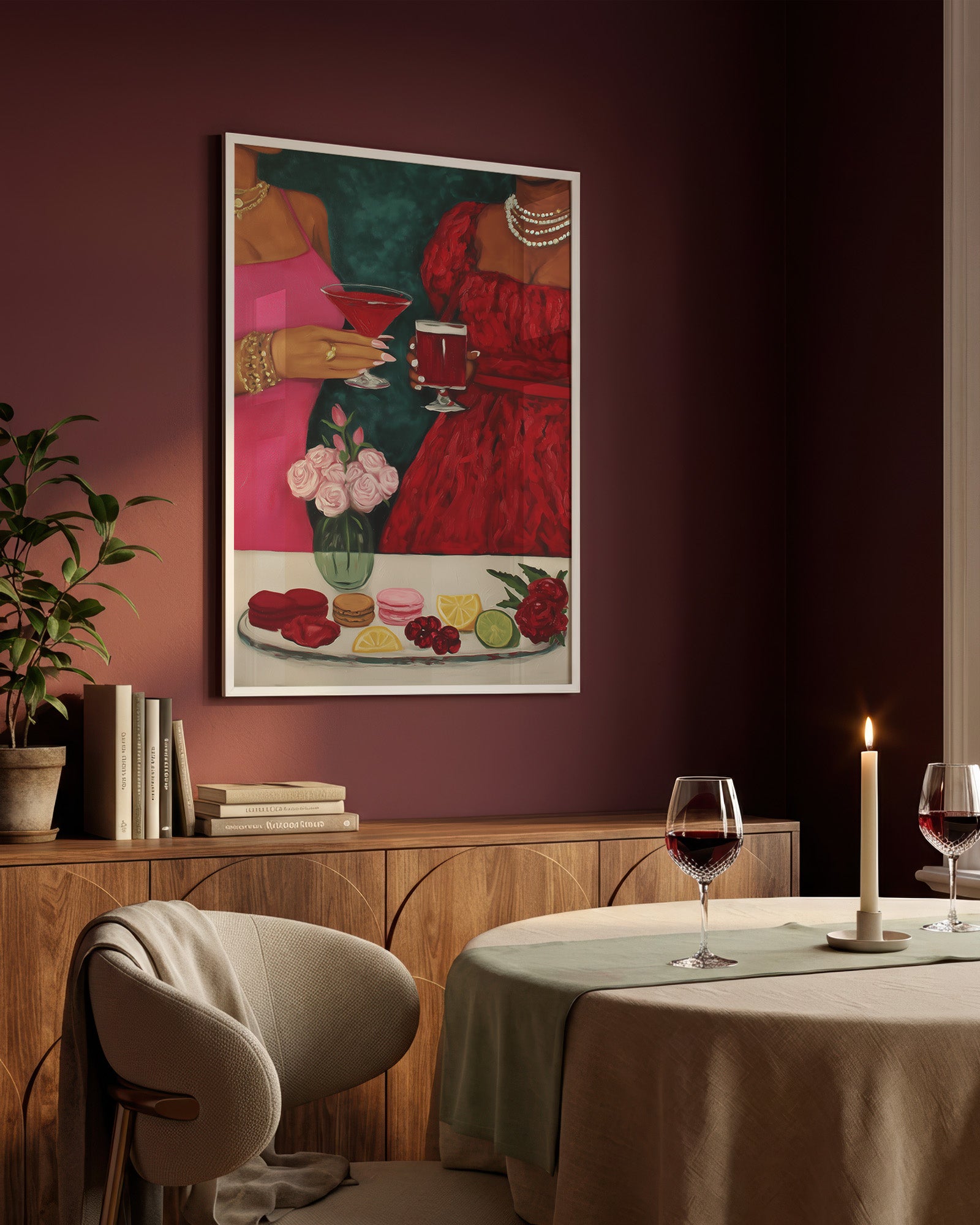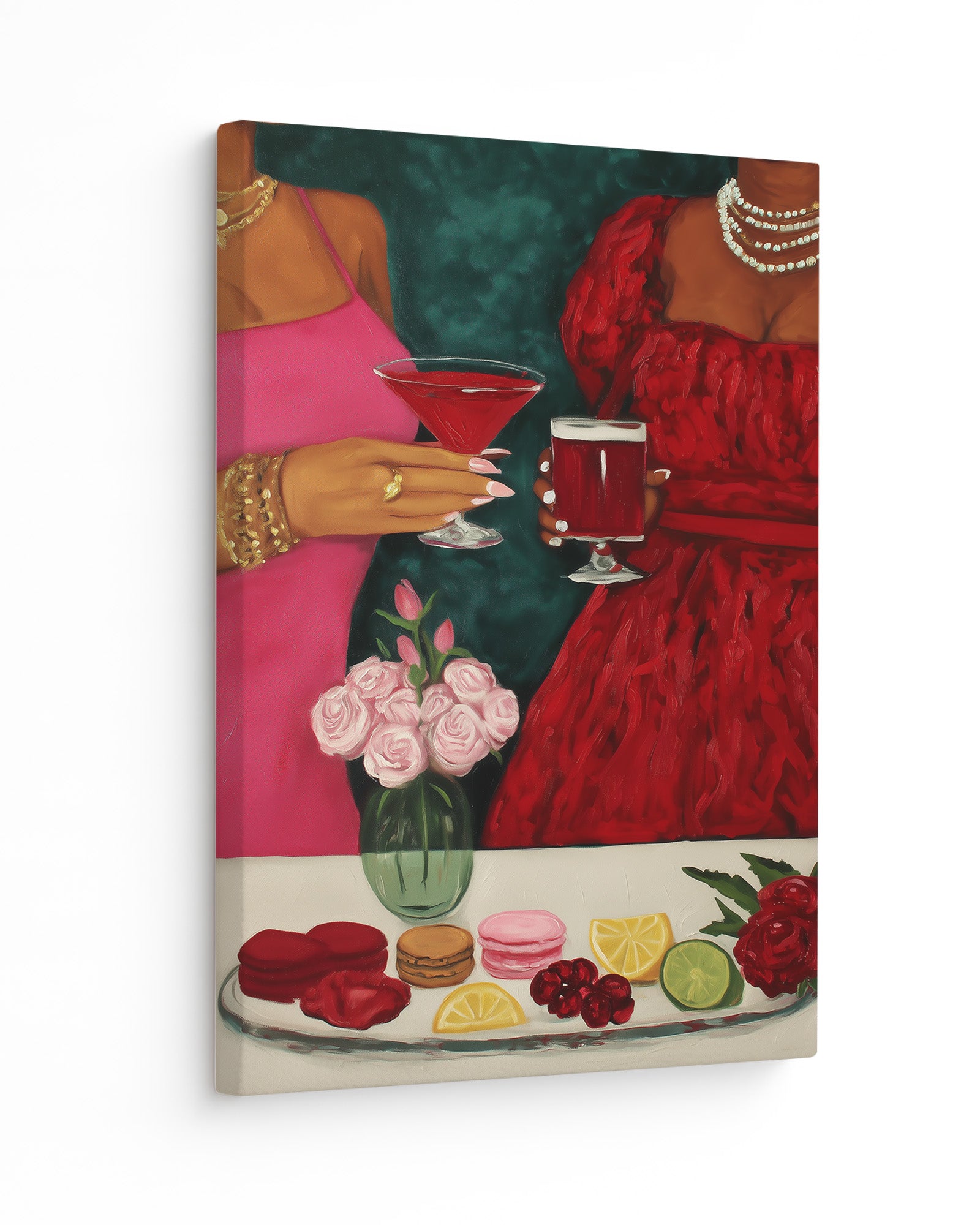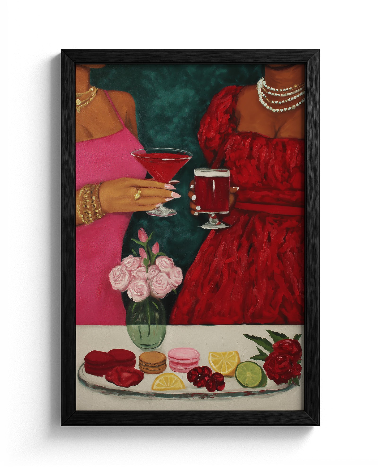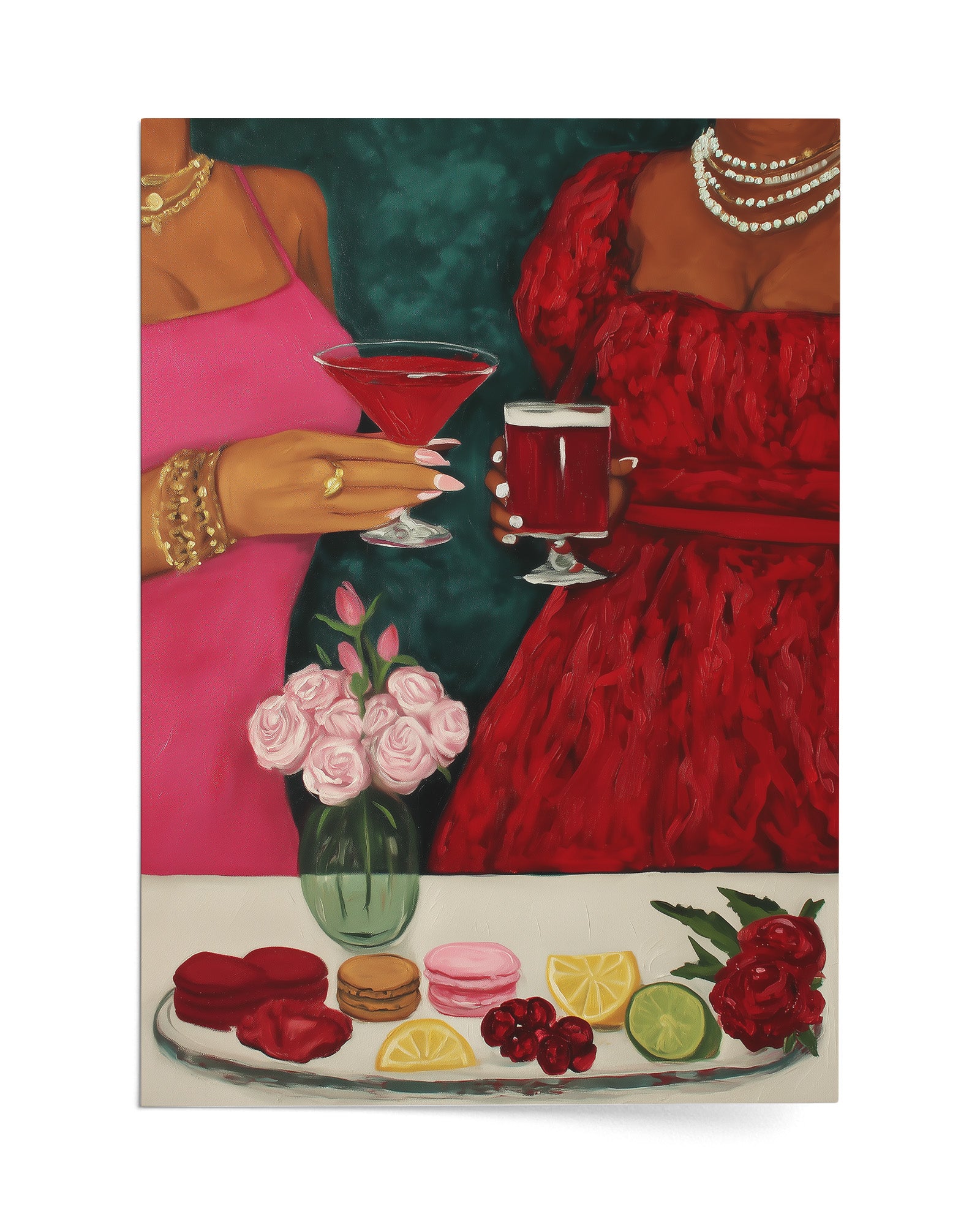 A joyful illustration of friendship, indulgence, and quality time, where shared treats and cocktails become symbols of connection and celebration. The scene captures the warmth of being present with one another, enjoying simple pleasures that turn into meaningful memories. It reflects how friendship is often built in moments of laughter, conversation, and shared delight, where elegance meets ease and togetherness feels natural. This artwork honors the beauty of slowing down, savoring the moment, and celebrating life in the company of those who uplift and understand you.