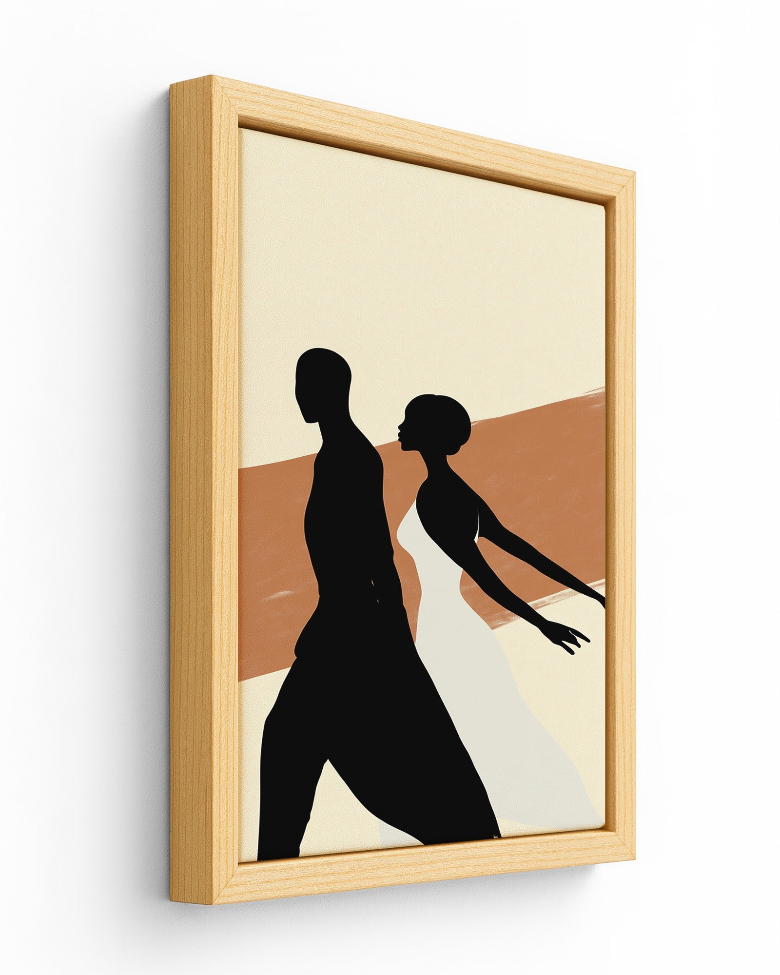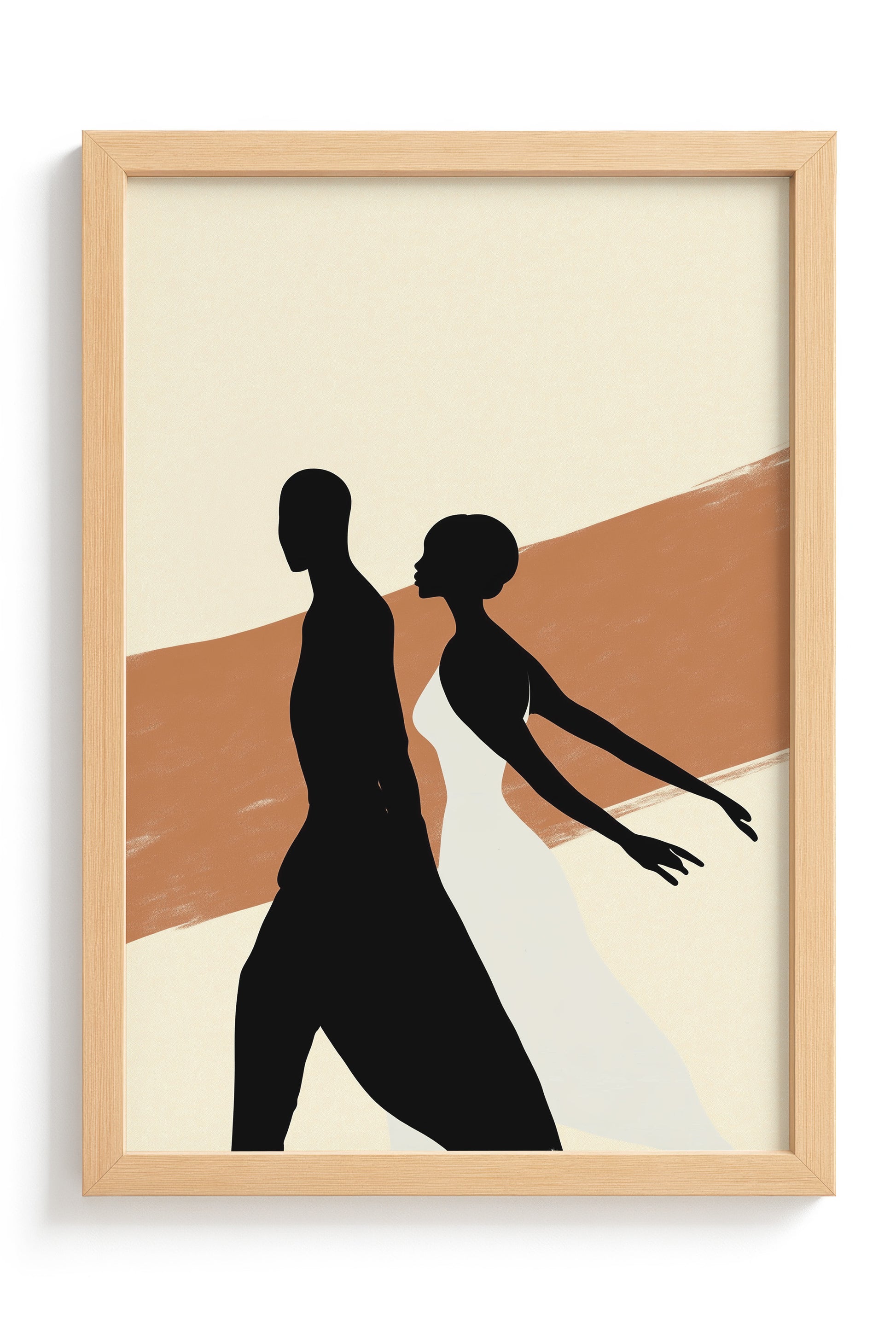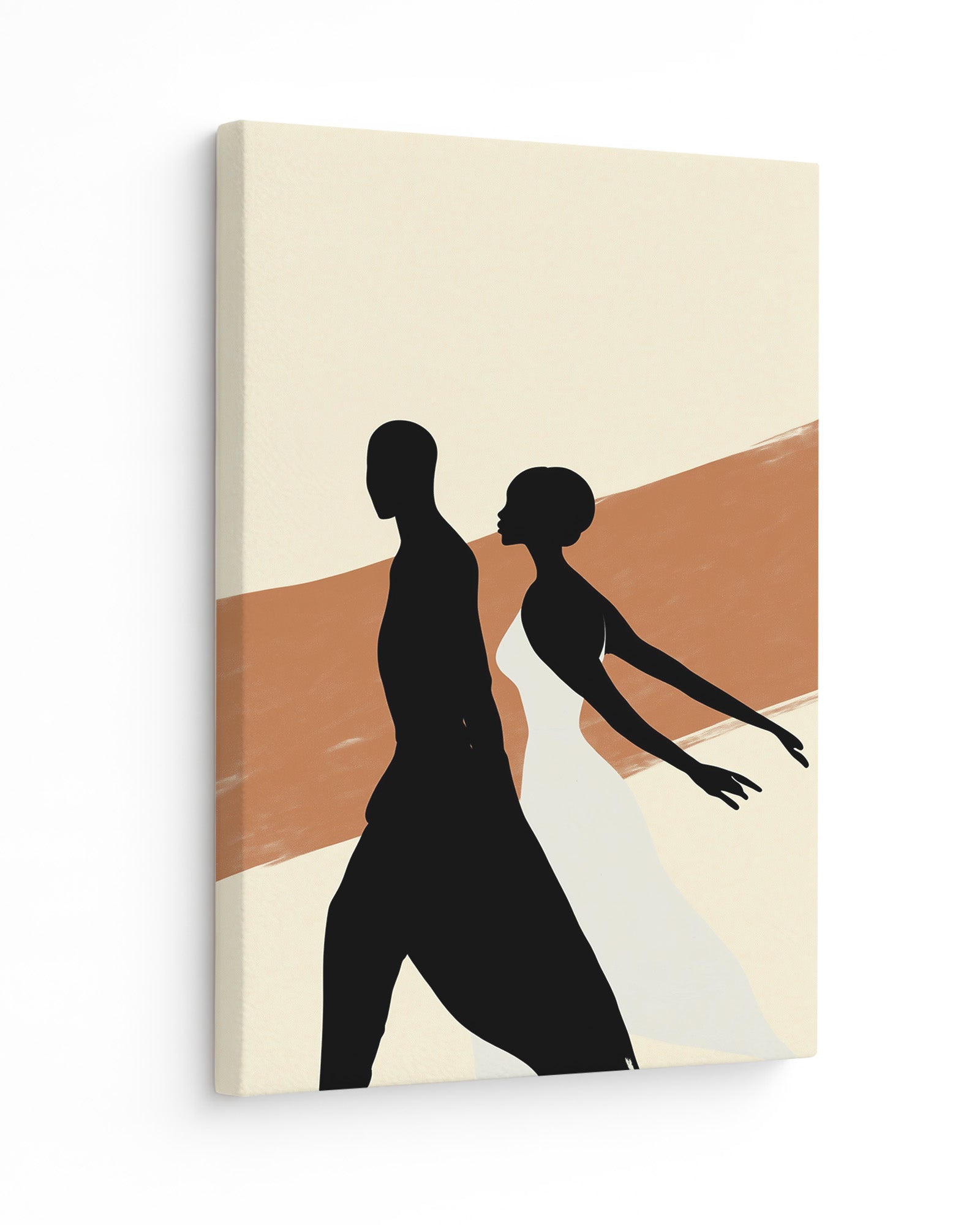This striking contemporary artwork captures the powerful silhouettes of a male and female dancer against a vibrant orange and beige background with distinctive stripe patterns. The stark contrast between the fluid forms and the warm, textured backdrop creates a dramatic visual statement celebrating movement, relationship, and artistic expression.