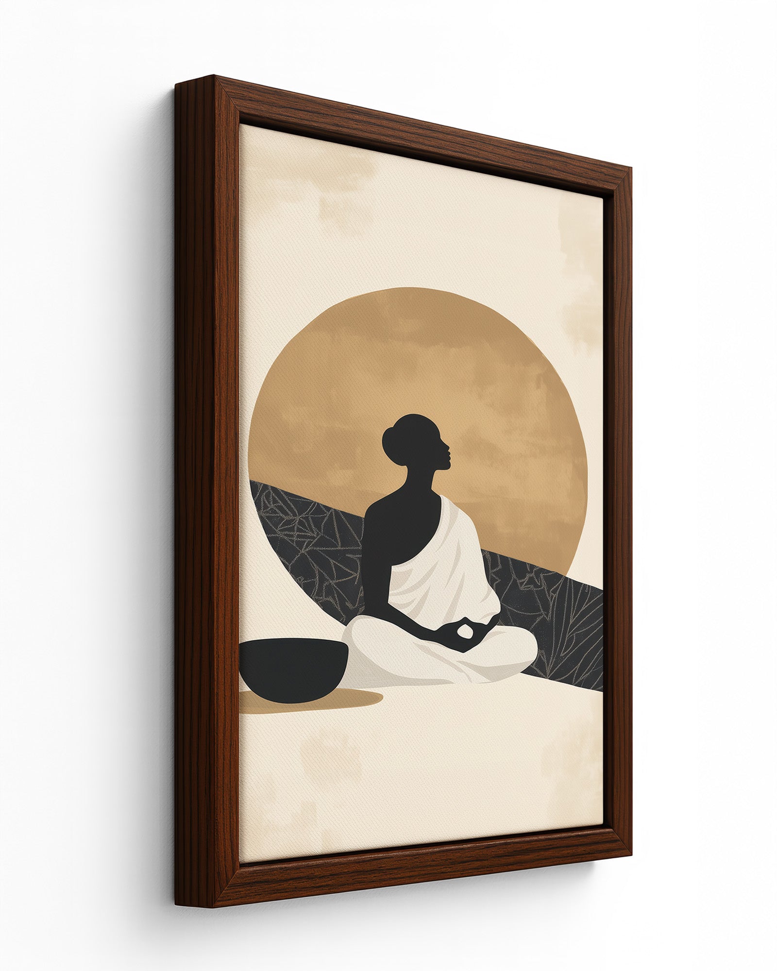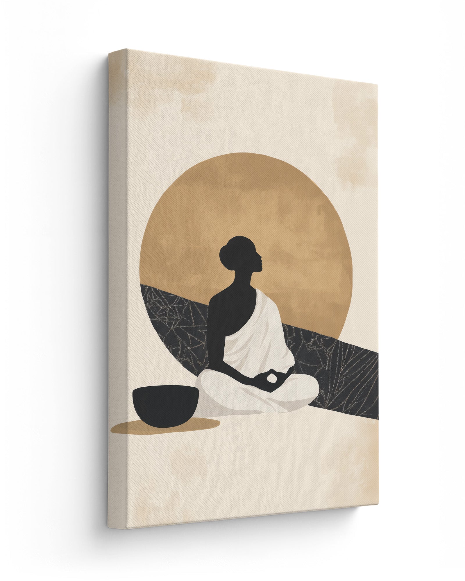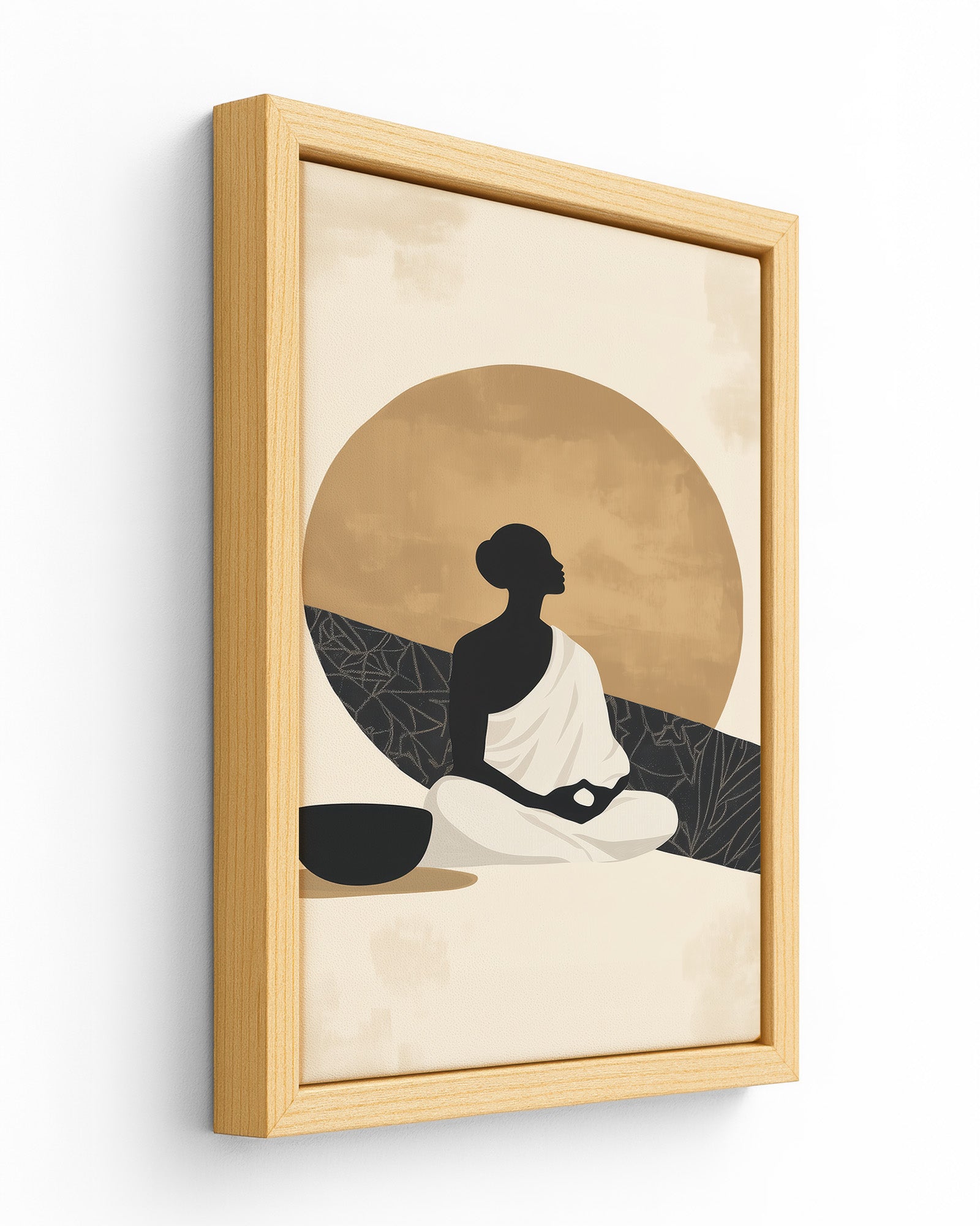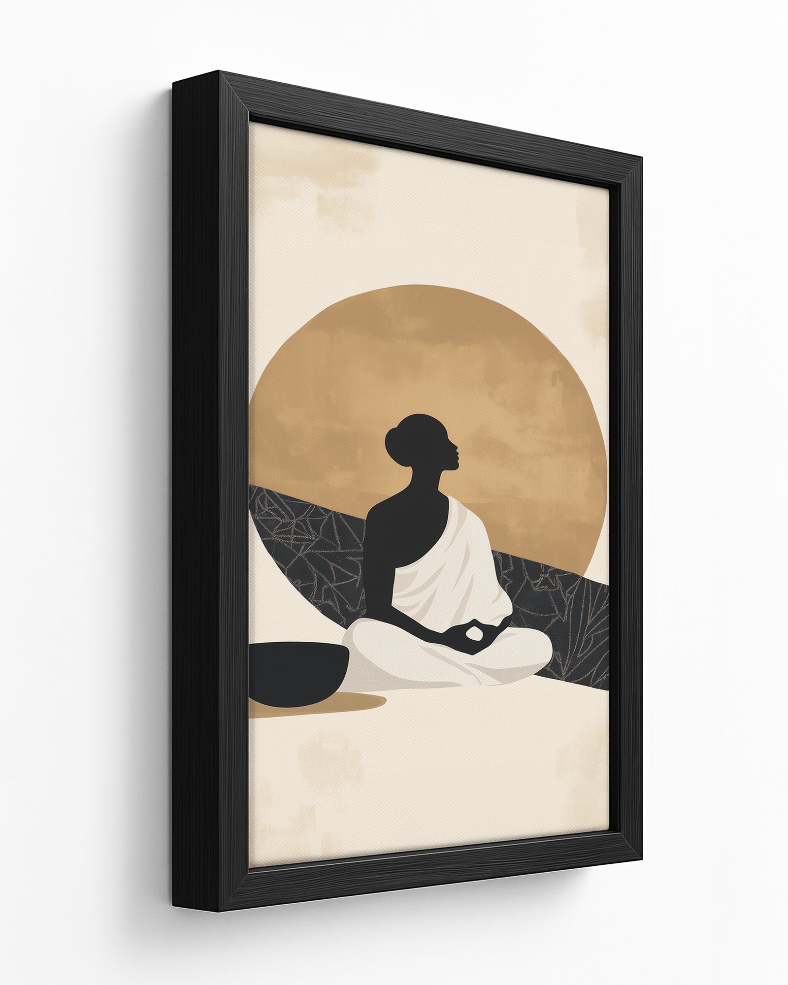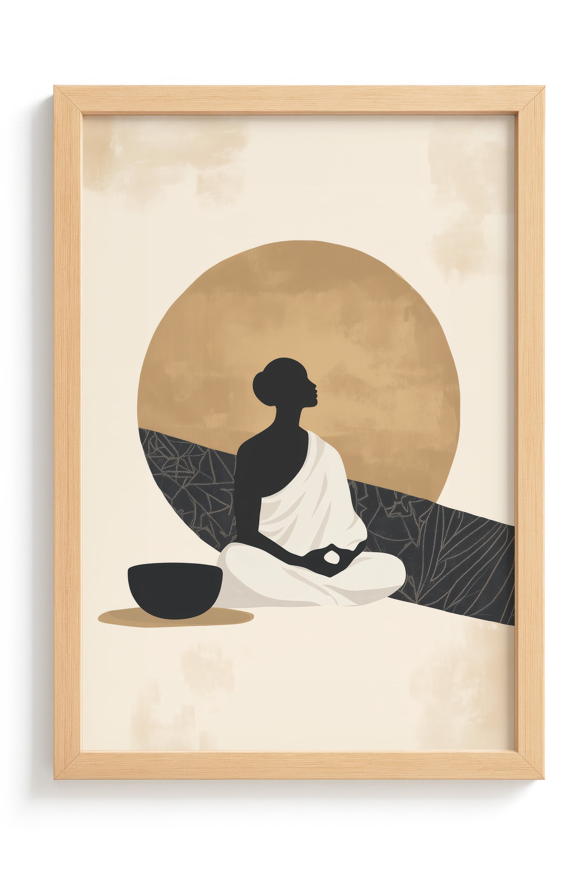 A graceful silhouette of a woman sits in silent meditation, her posture poised and calm beneath a glowing ochre sun. Draped in white robes and centred beside a minimalist black bowl, she embodies presence, peace, and the sacred art of stillness. The textured backdrop of abstract lines and soft neutrals brings both modern depth and timeless symbolism to the piece. Perfect for zen spaces, yoga rooms, or any interior seeking soulful elegance and calm.