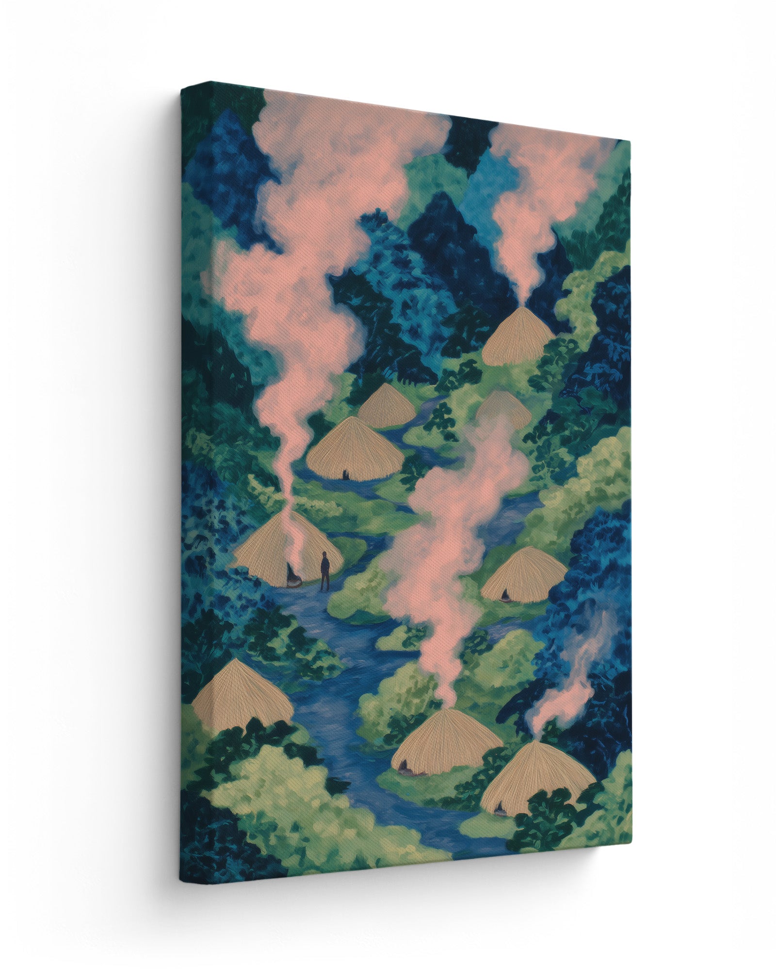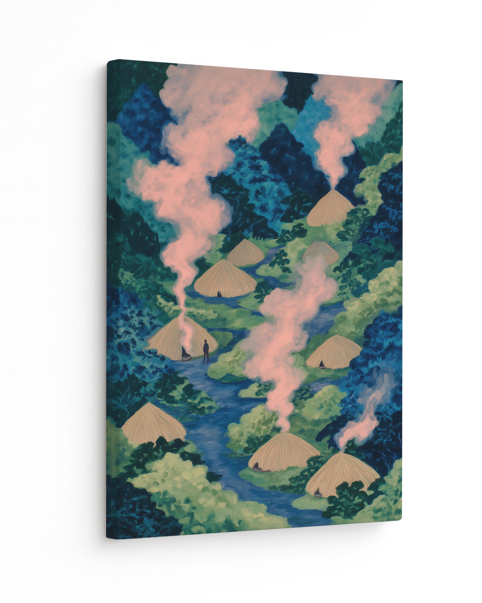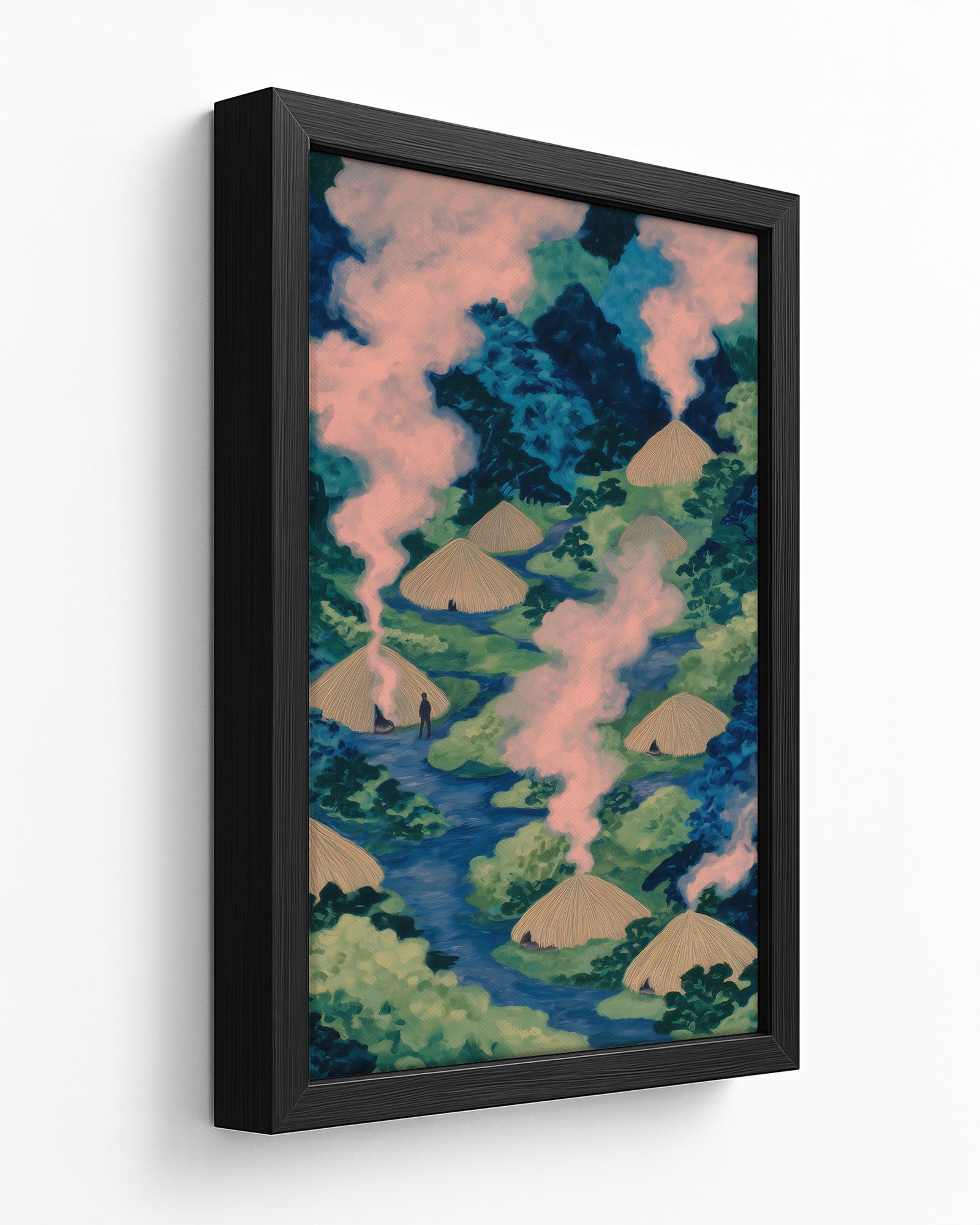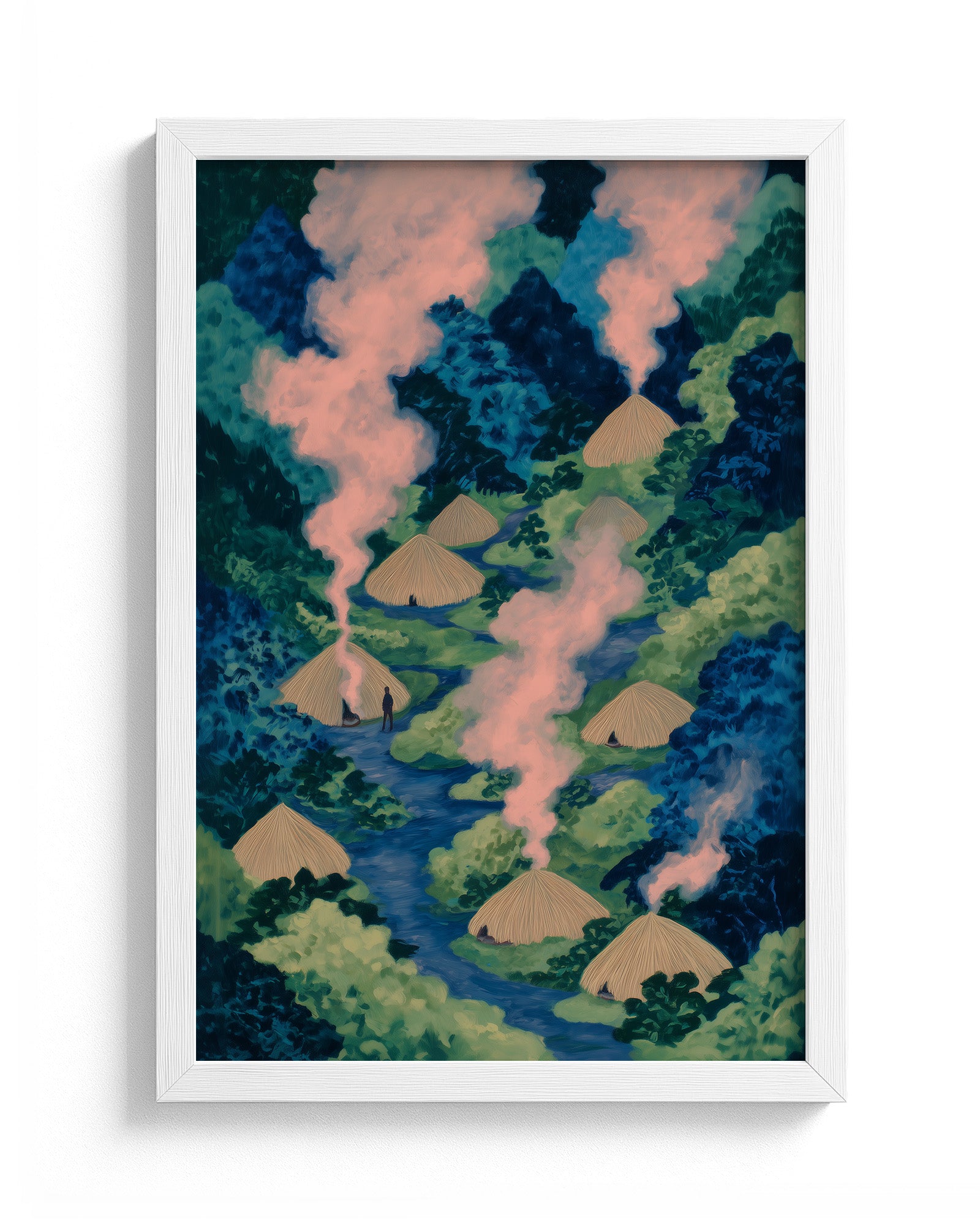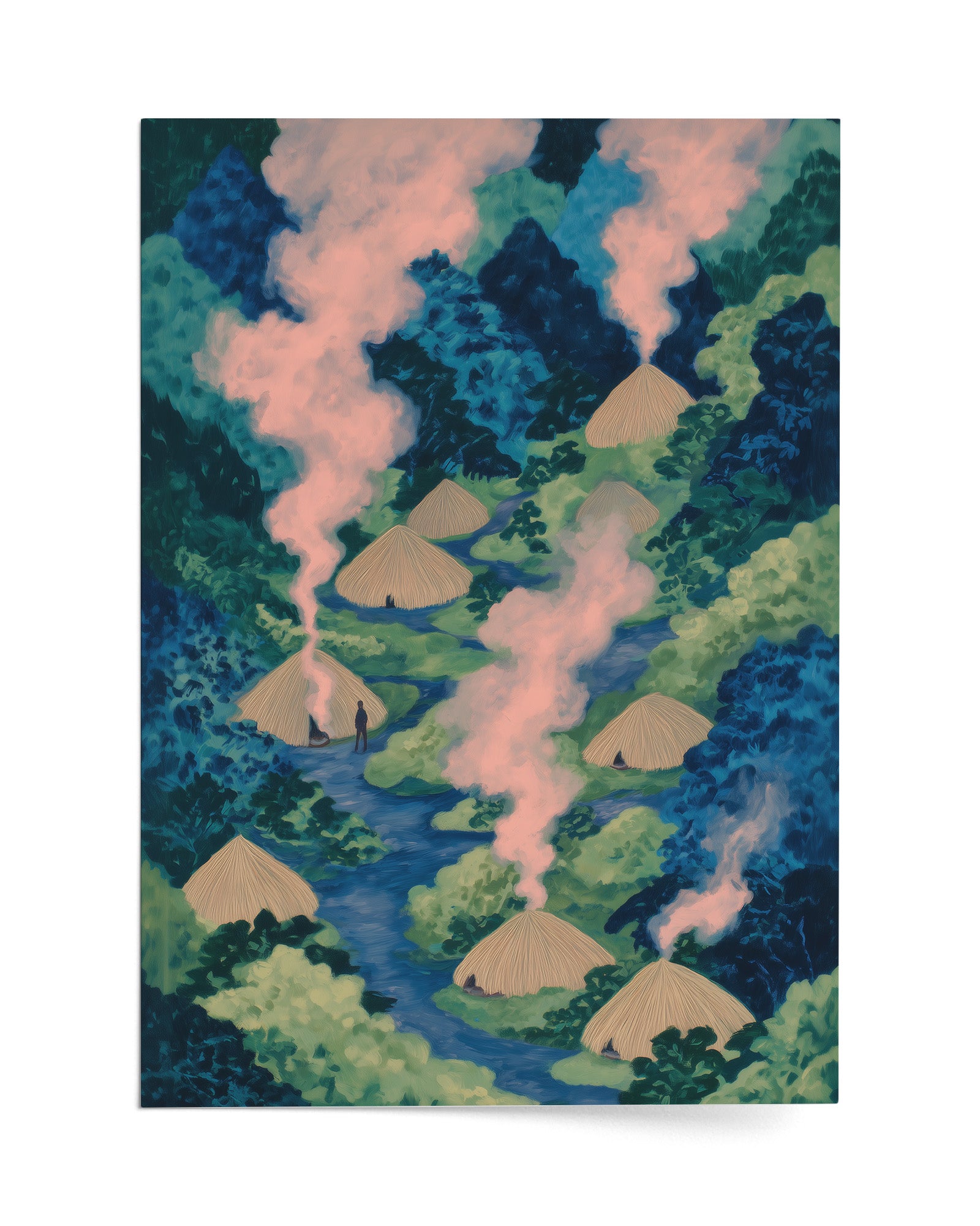 Life Inside the Ituri: Art on Congo's Indigenous Community, Forest Living, and the Sacred Right of Pygmy Peoples to Maintain Traditional Village Life. This striking composition captures a Pygmy village nestled deep within Congo's rainforest, revealing how indigenous communities have developed ways of living in complete harmony with the forest ecosystem for thousands of years.