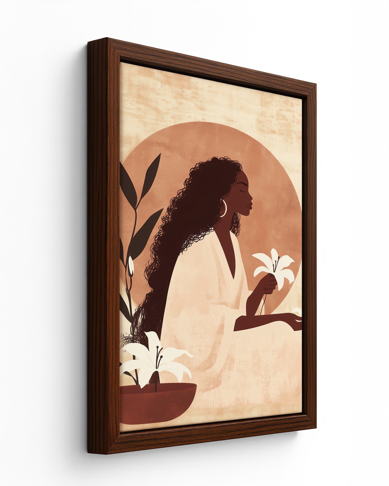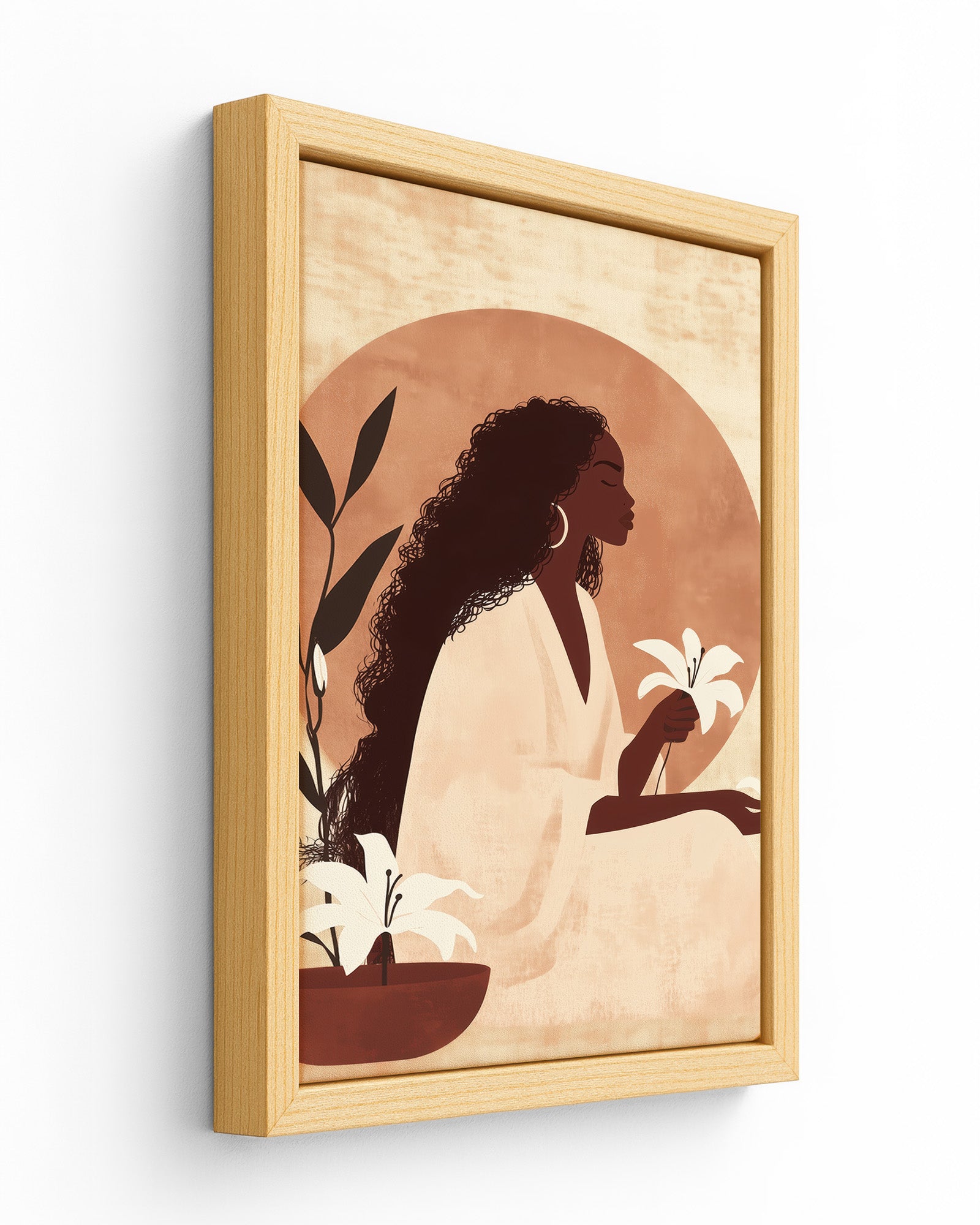 Immerse your space in quiet strength and sacred femininity with this serene artwork capturing a woman in soulful meditation, surrounded by lilies and warm earthy tones. Inspired by African and Caribbean traditions of inner reflection, this piece evokes harmony, resilience, and the quiet rituals of womanhood. A perfect addition for those seeking peace, meaning, and beauty in their home.