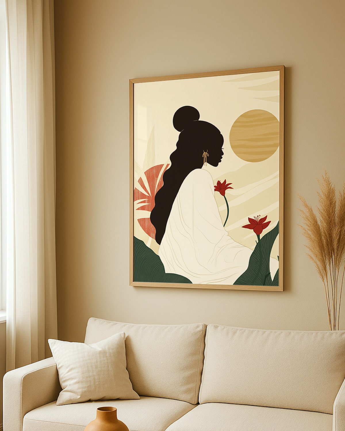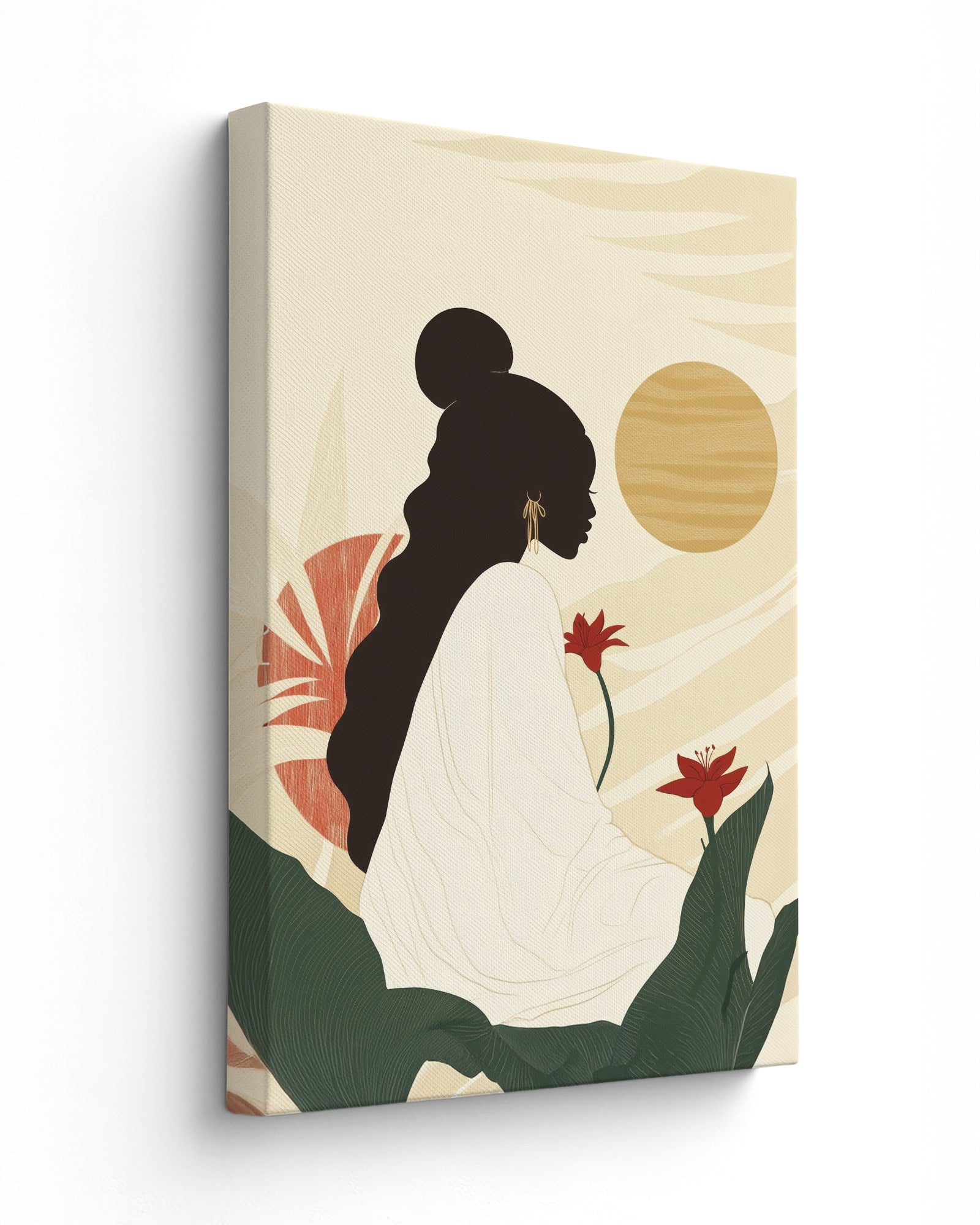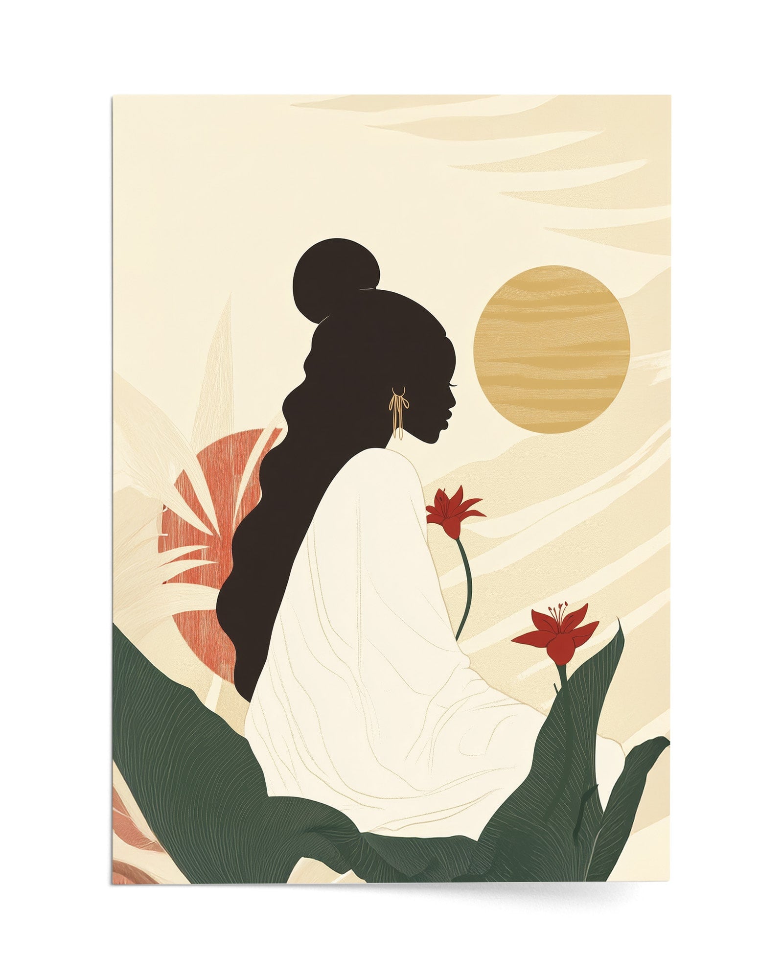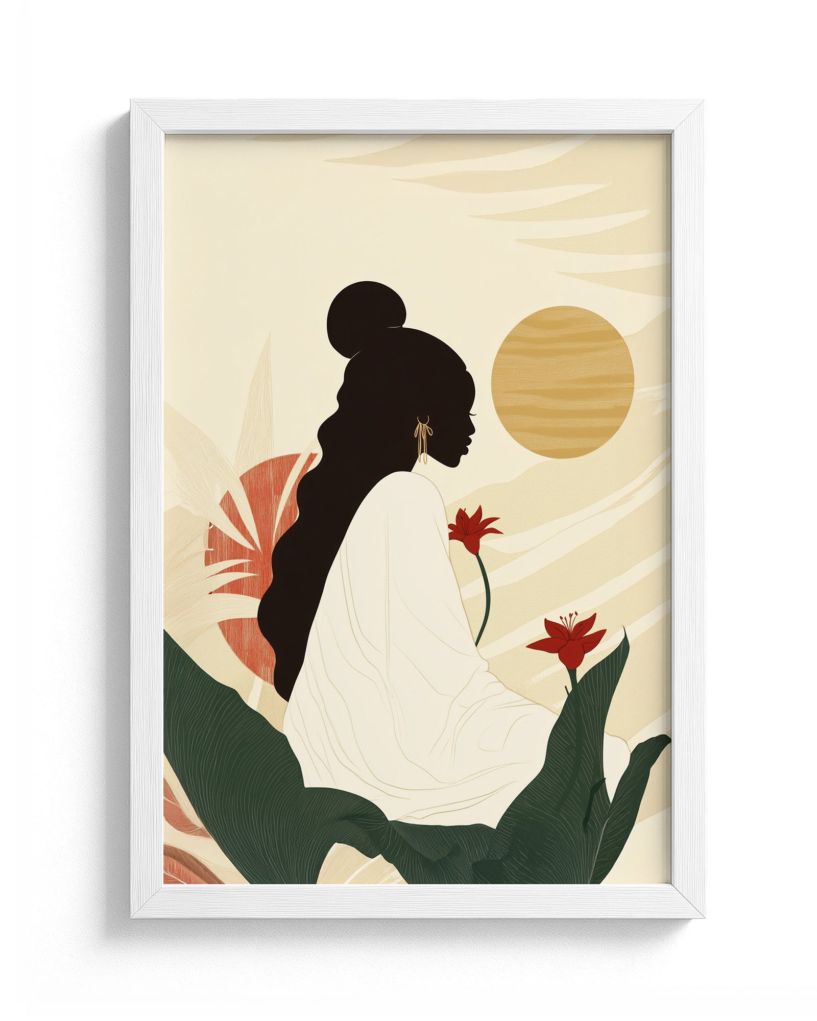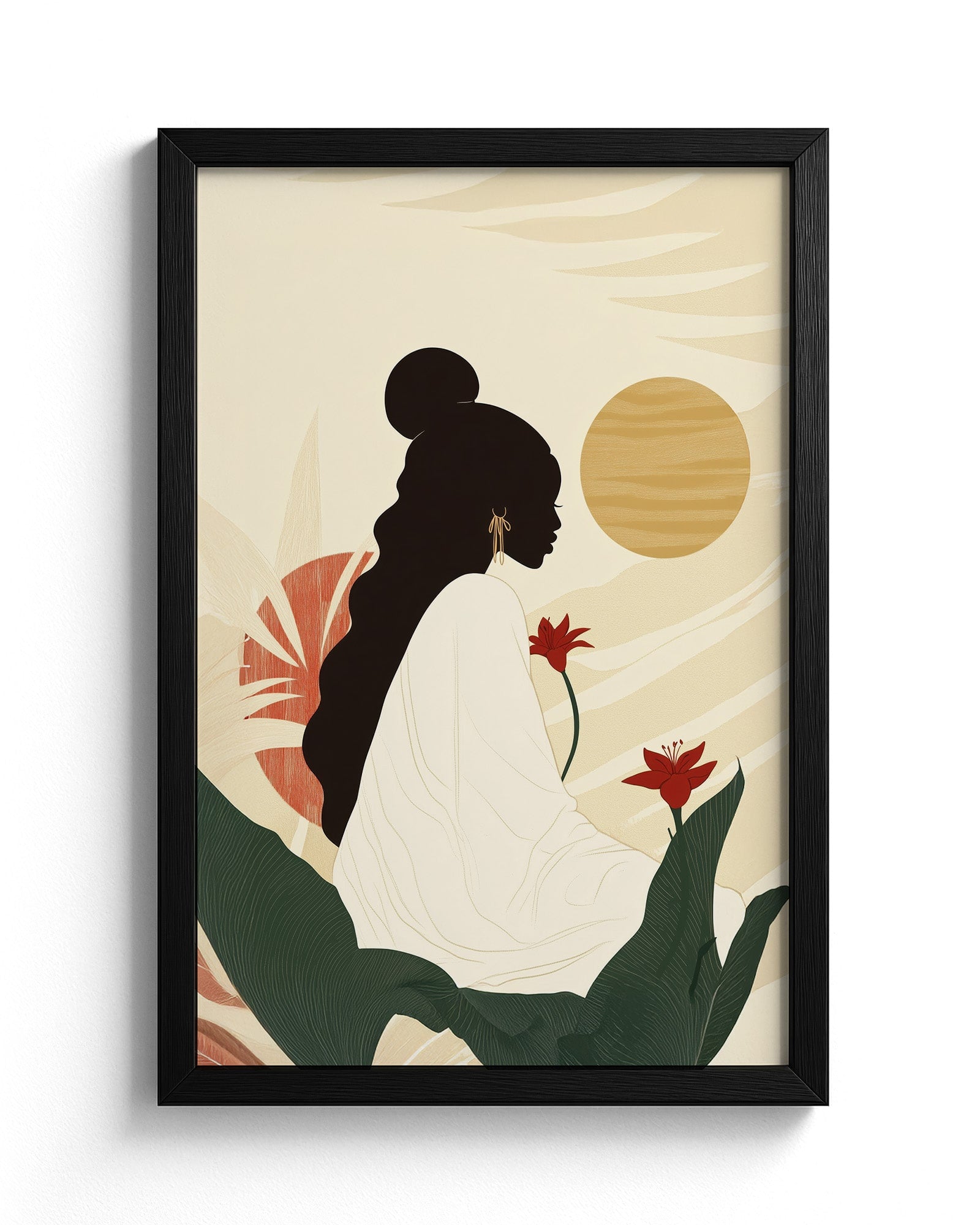 This is a soulful art collection celebrating the quiet strength, sacred beauty, and ancestral spirit of women of African and Caribbean heritage. Each piece captures a moment of stillness — a breath, a bloom, a gaze toward the sun — wrapped in earthy tones, florals, and symbolic shapes.