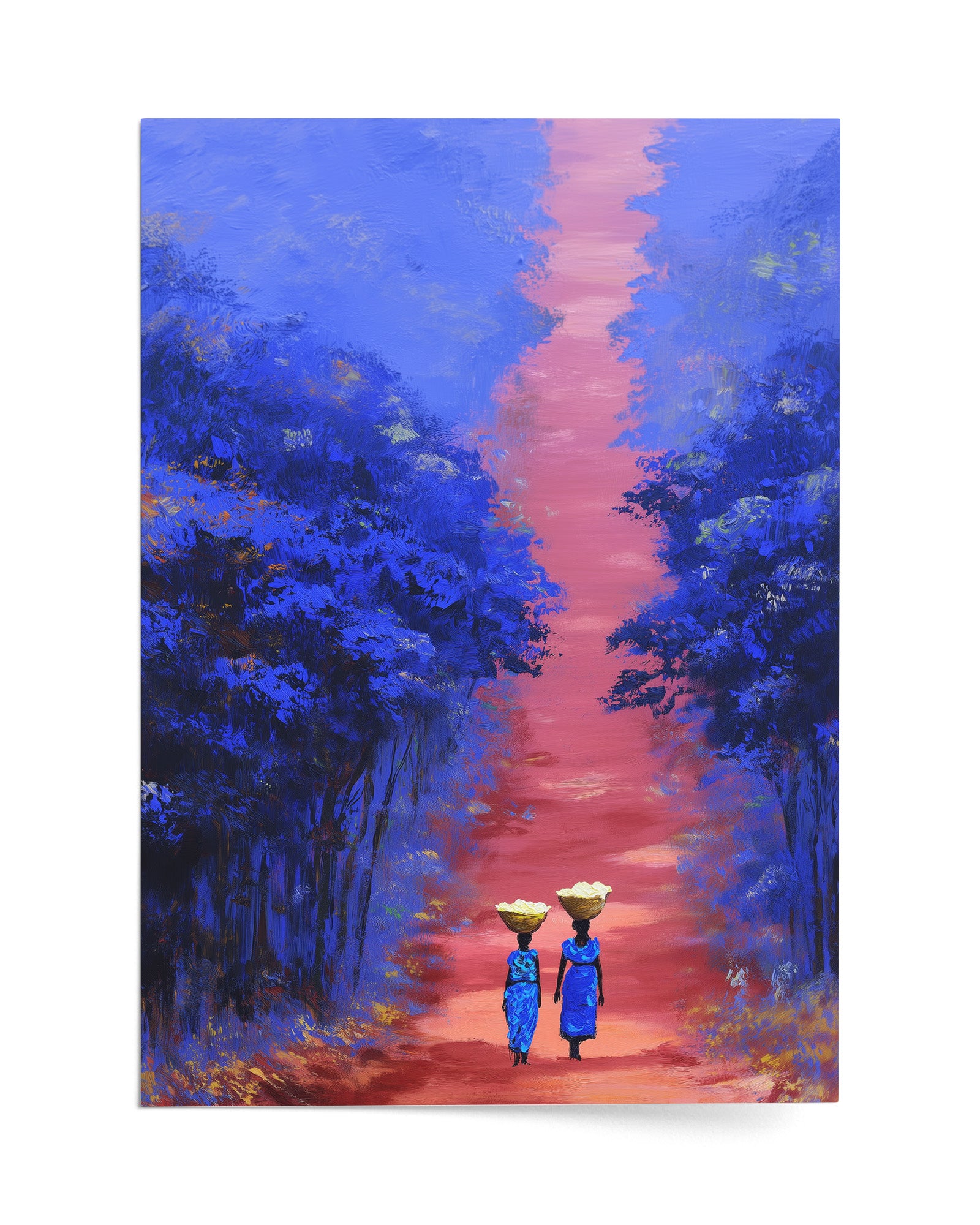 Manioc Road: Art on Congo's Food Security, Women's Agricultural Labor, and the Sacred Work of Cassava Cultivation in Congo Villages. This striking composition captures Congolese women carrying baskets of cassava root on their heads along a red Congo earth path, revealing how women's agricultural labor remains invisible backbone sustaining Congo's food security and village economies.