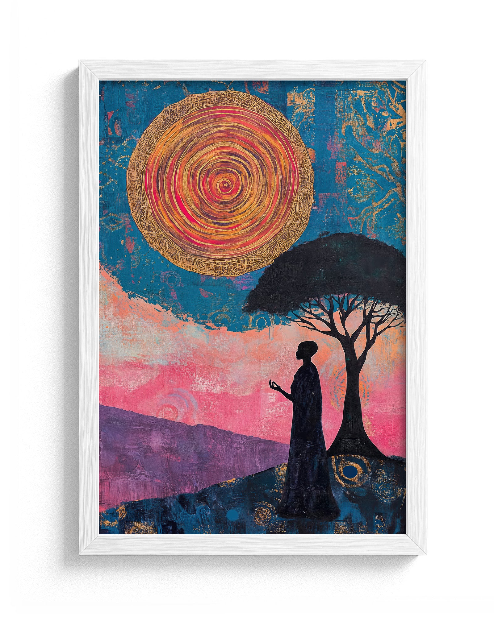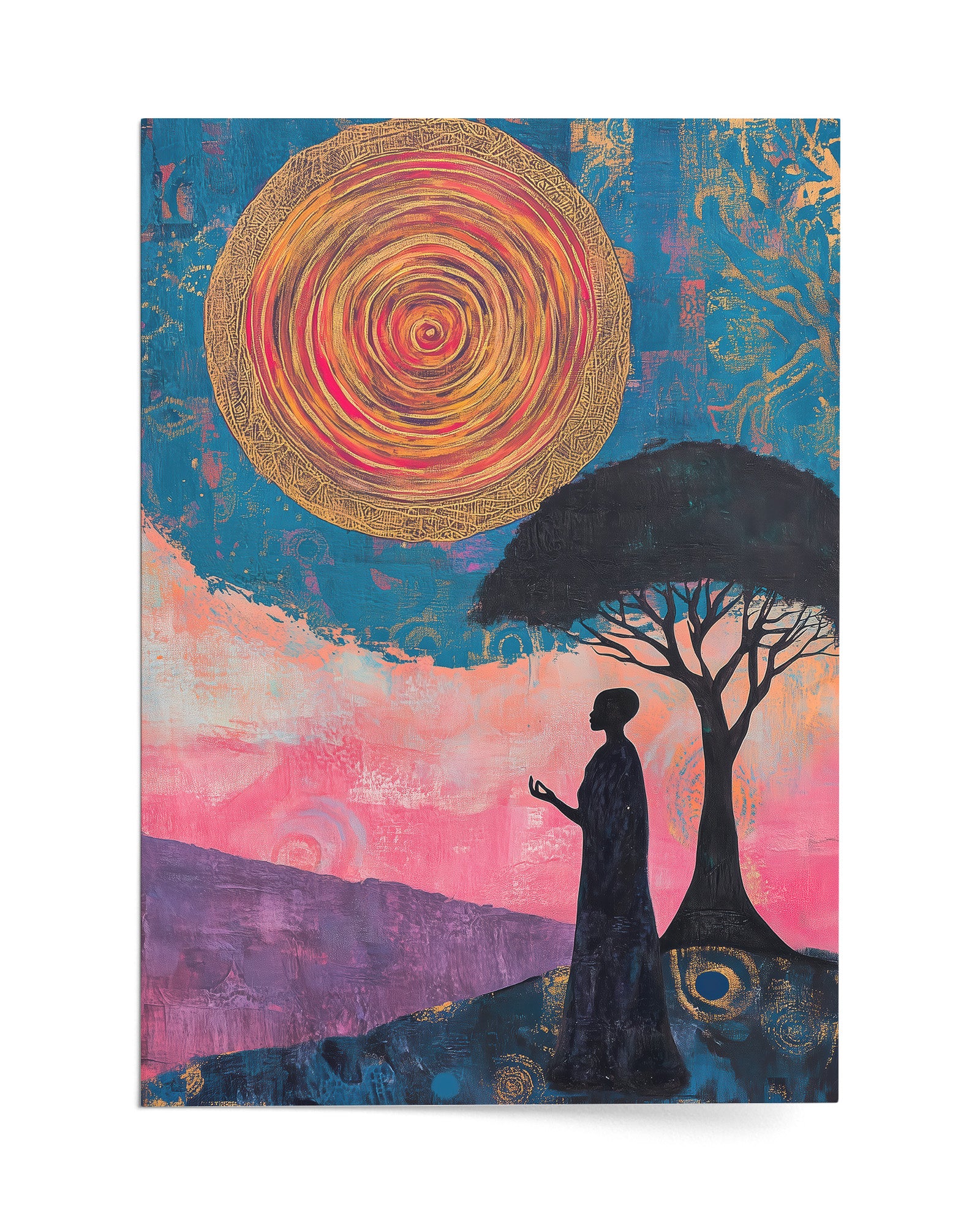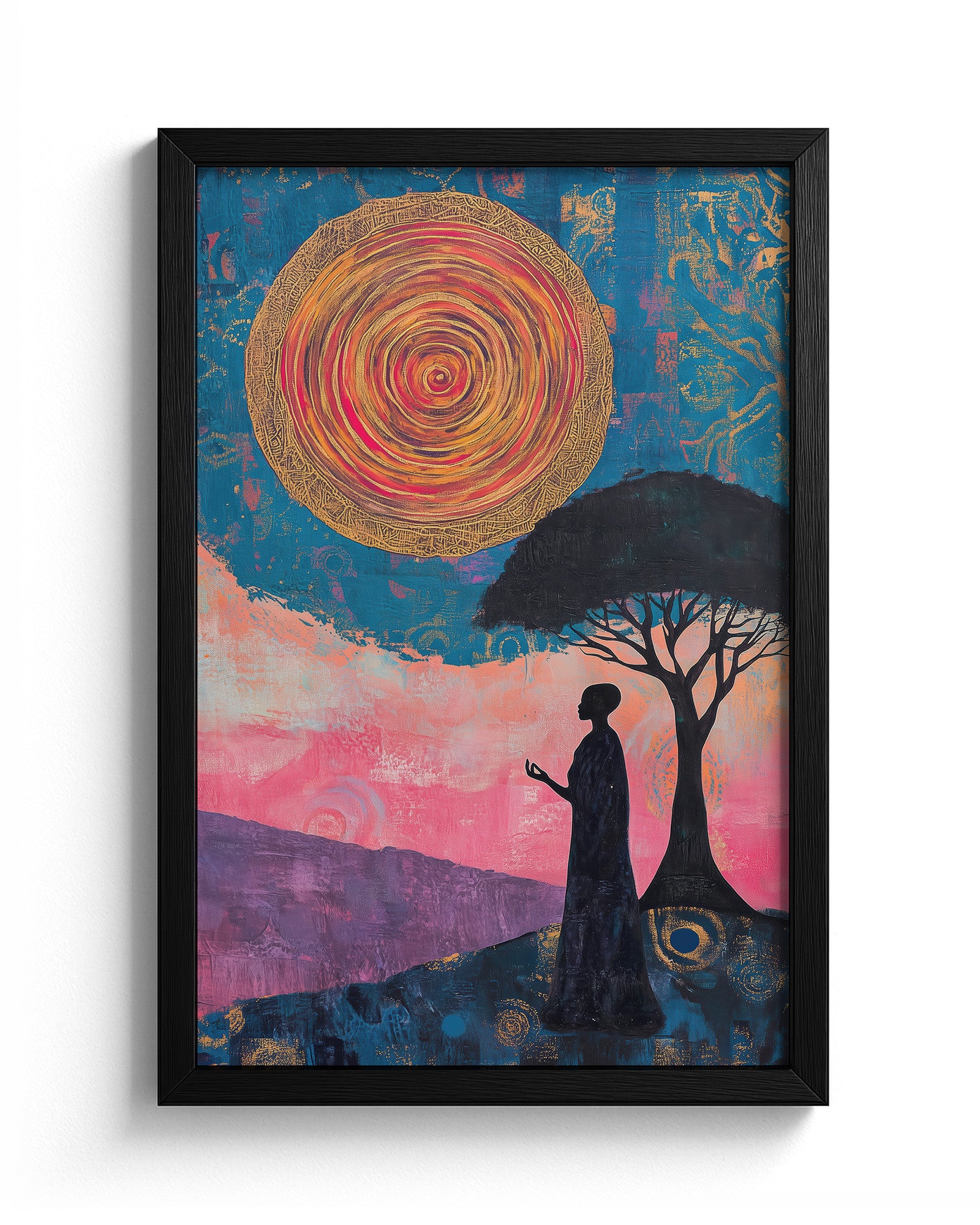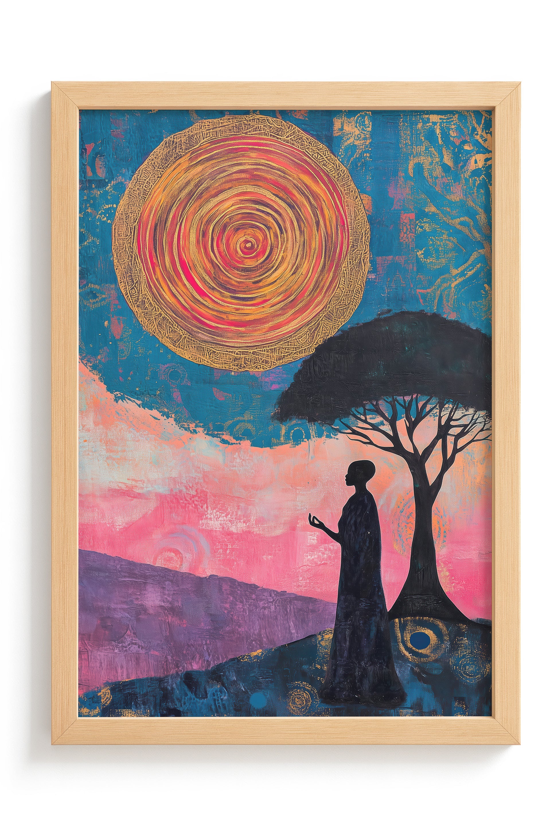 This stunning depiction of meditation and cosmic connection. An African woman stands beneath a luminous baobab tree, her aura weaving vibrant tribal patterns that merge with abstract swirls of earth.