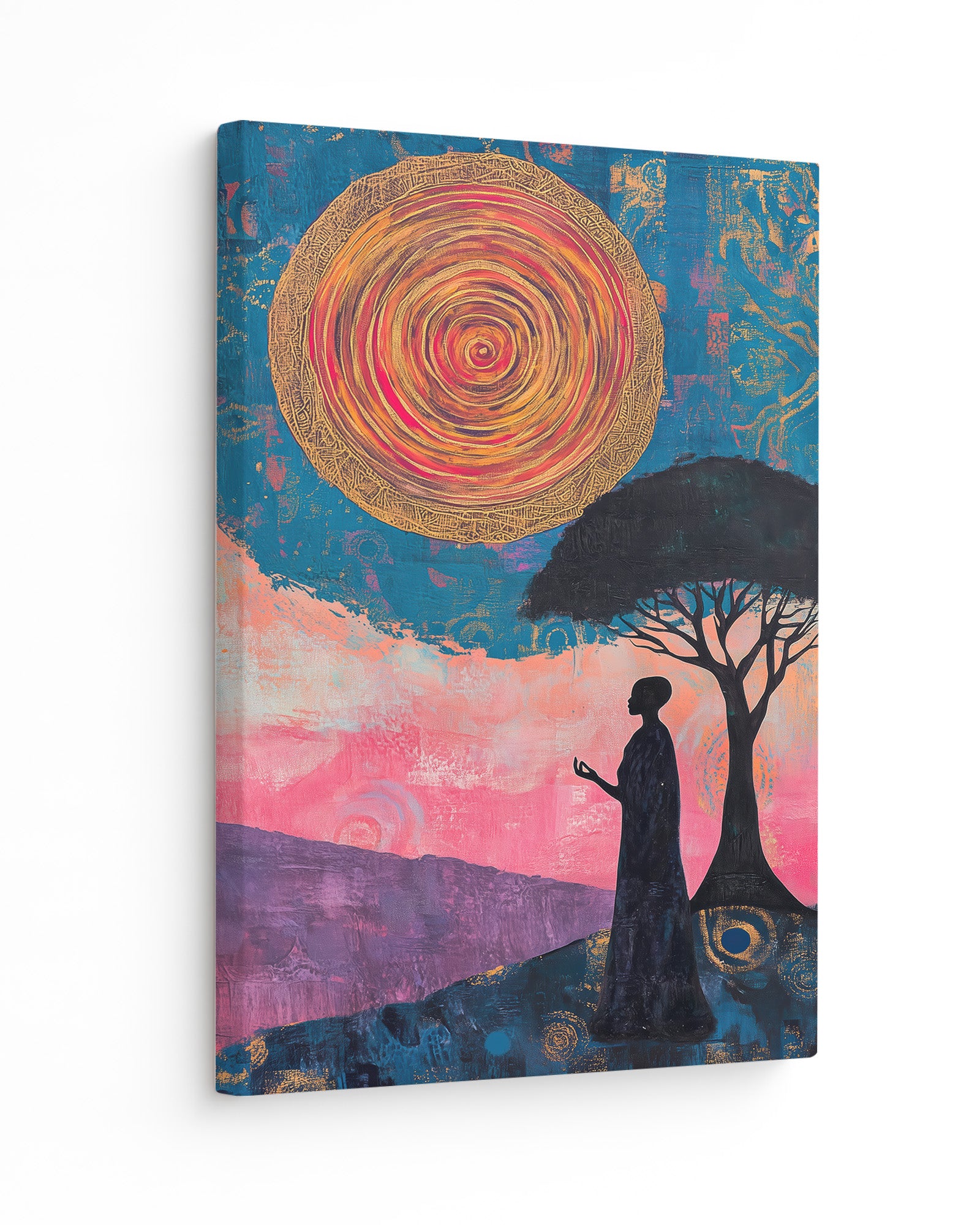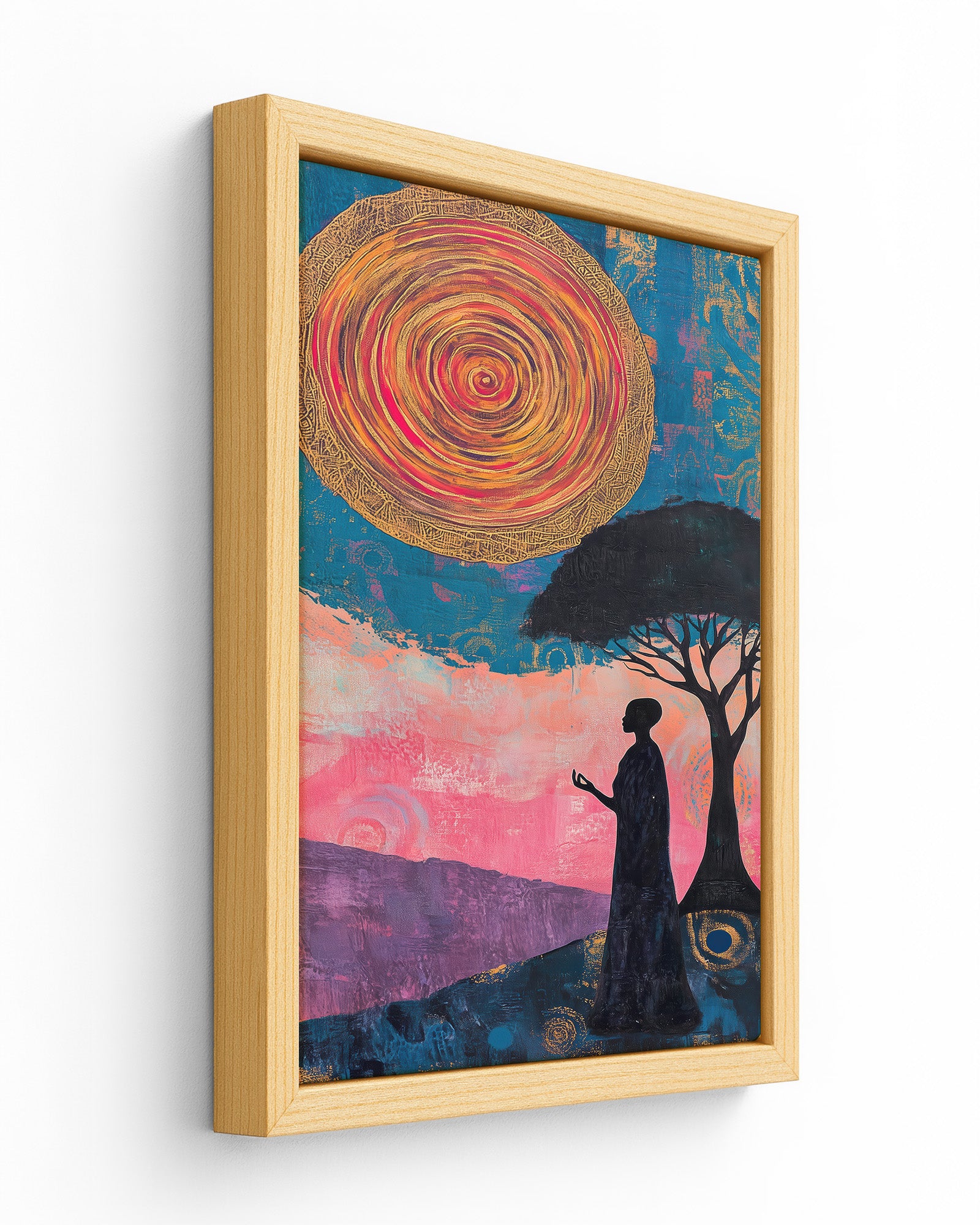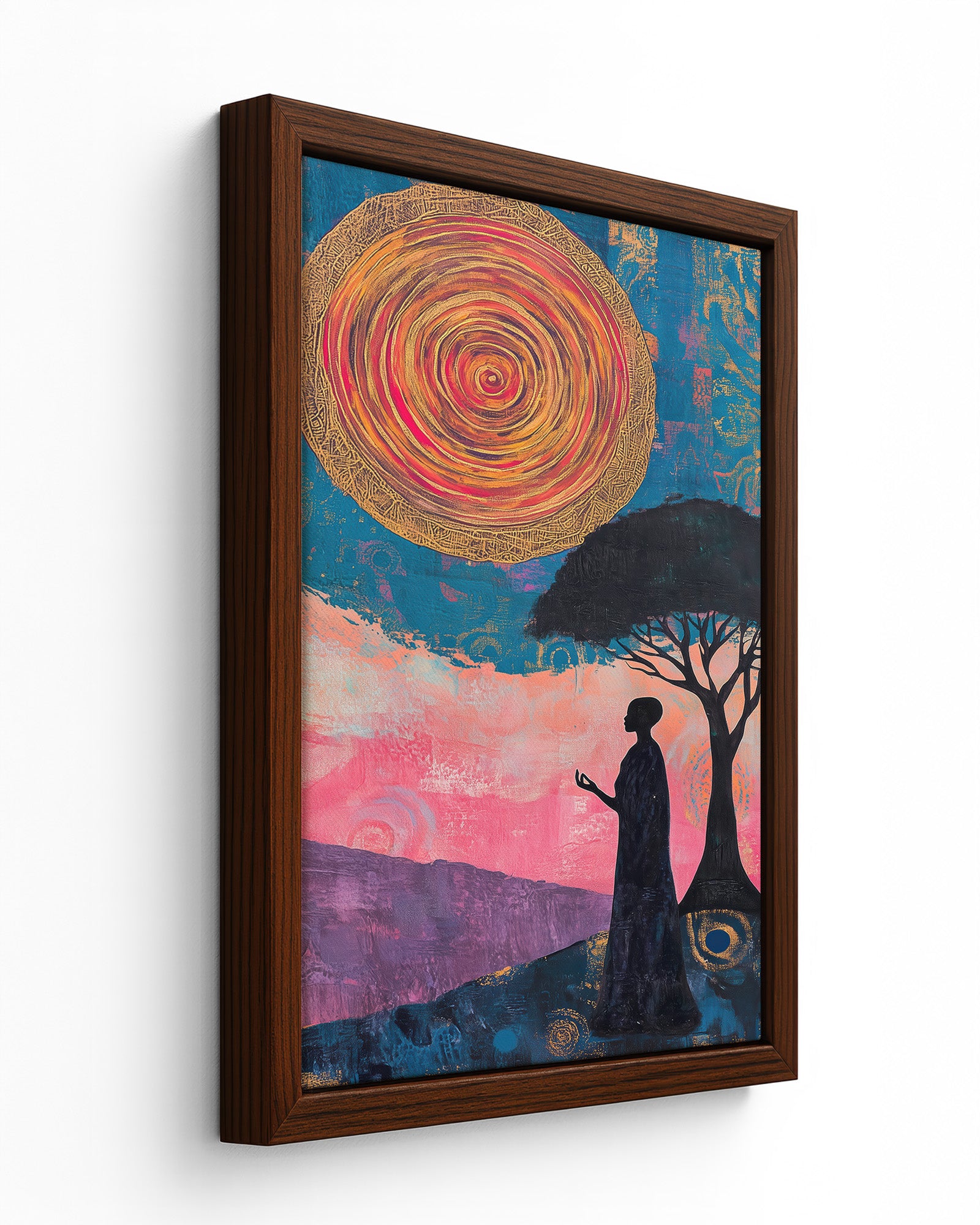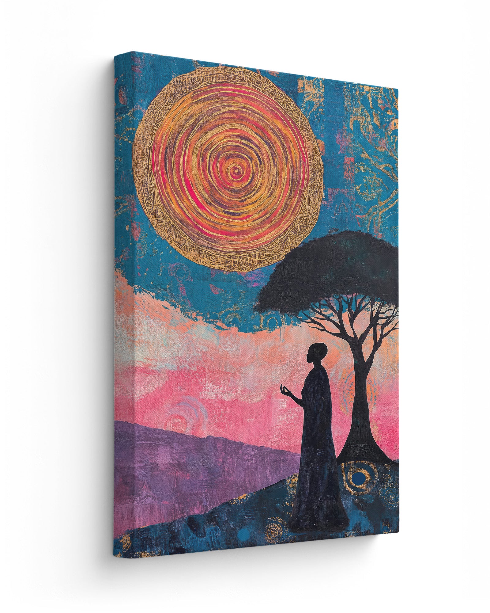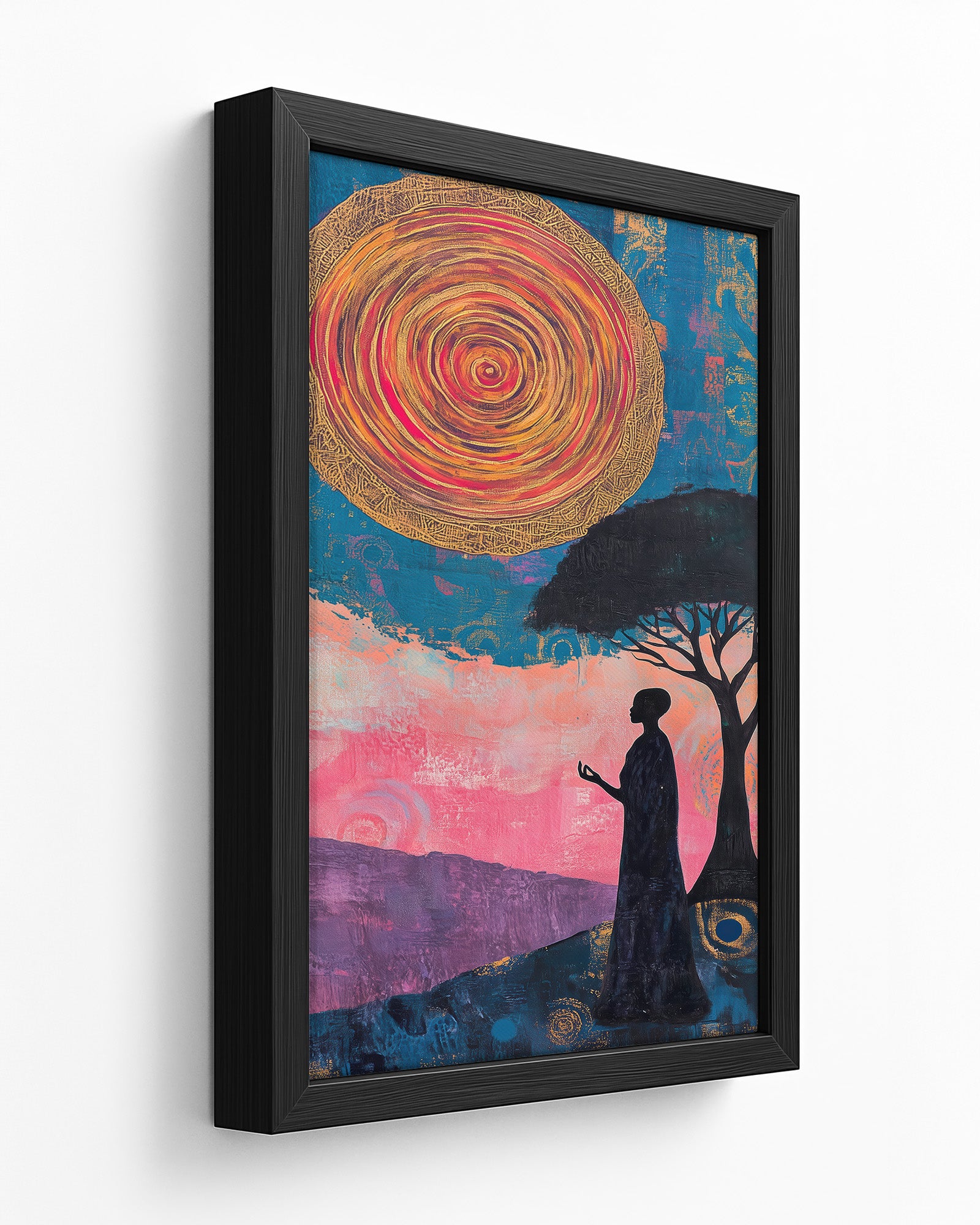 This stunning depiction of meditation and cosmic connection. An African woman stands beneath a luminous baobab tree, her aura weaving vibrant tribal patterns that merge with abstract swirls of earth.