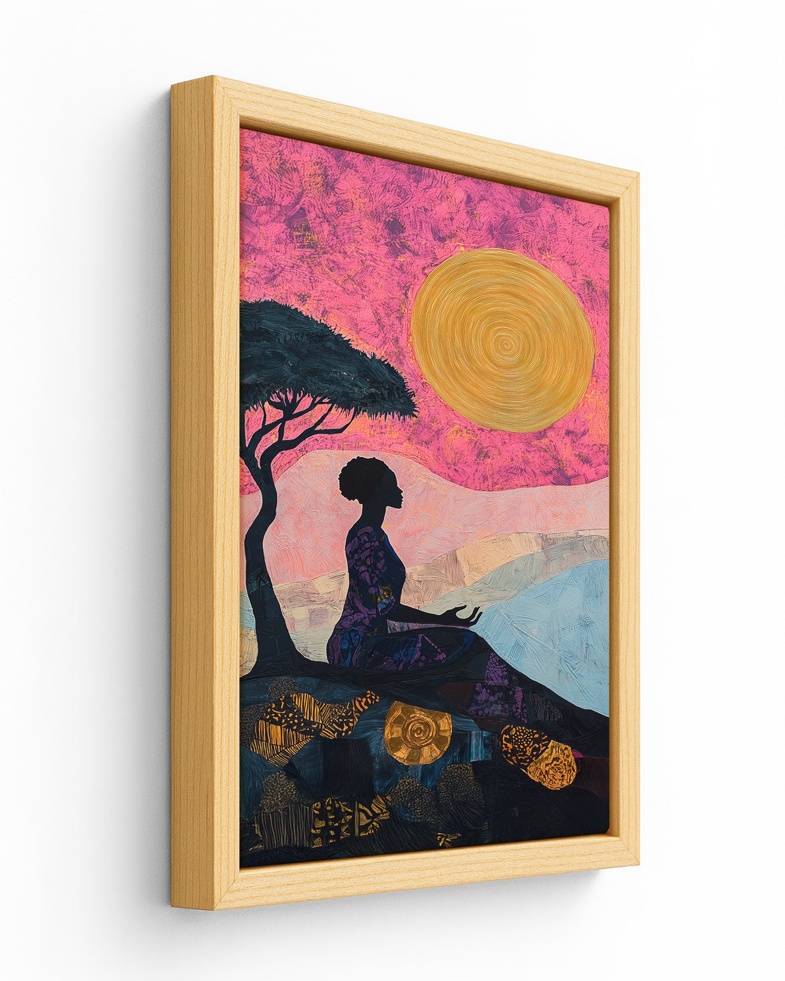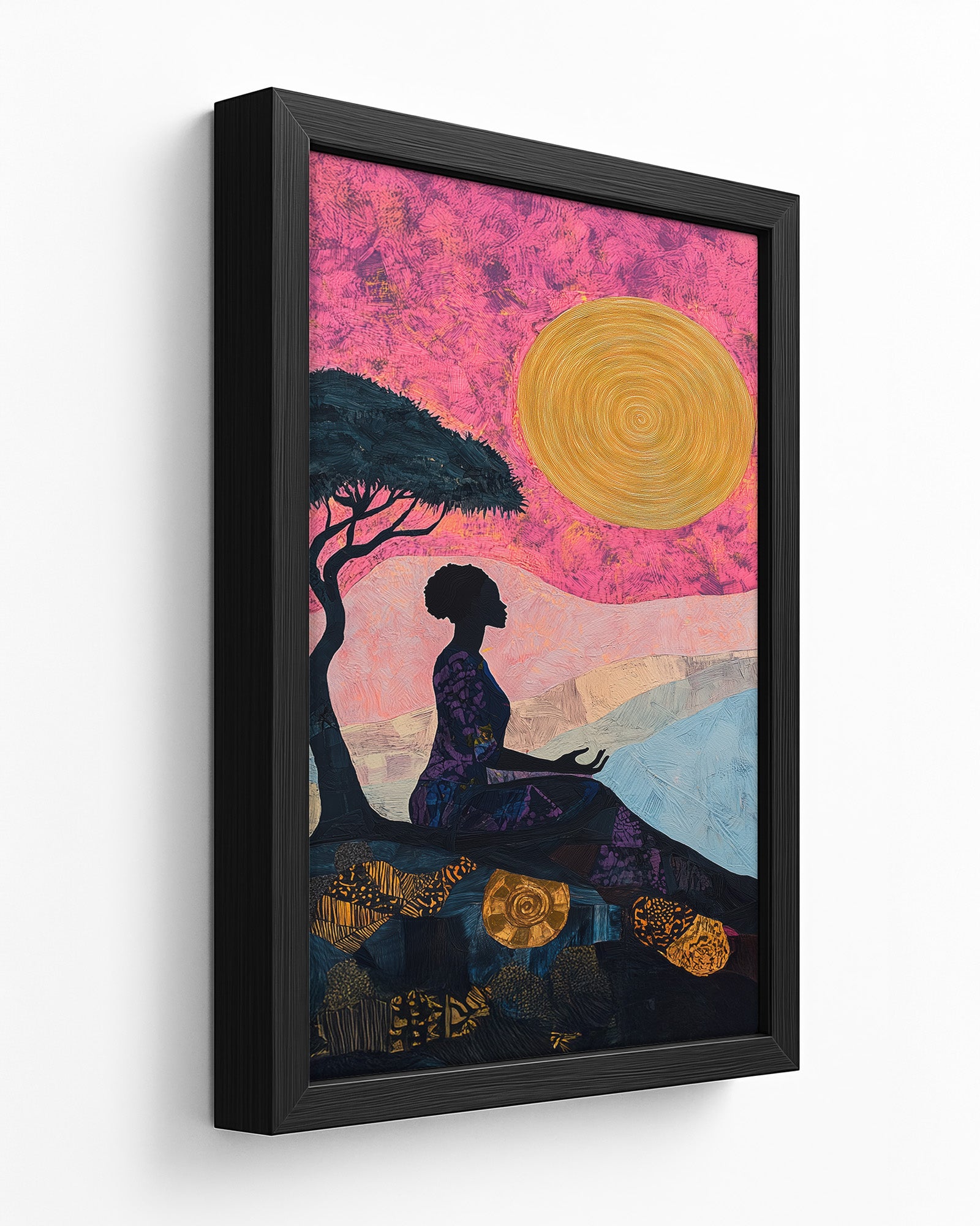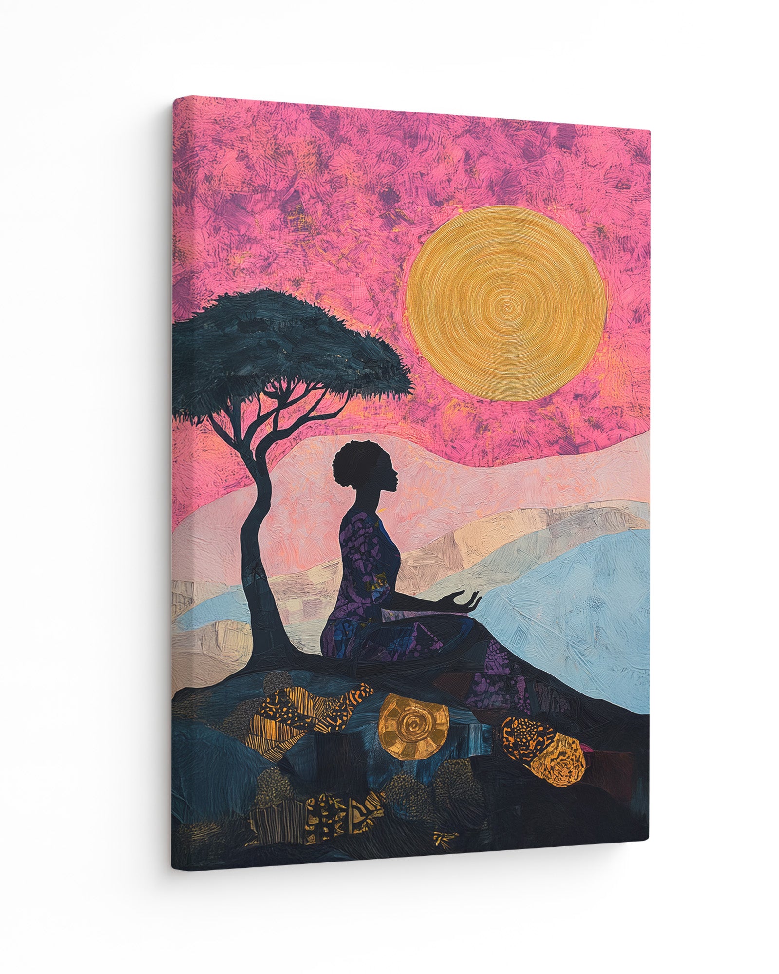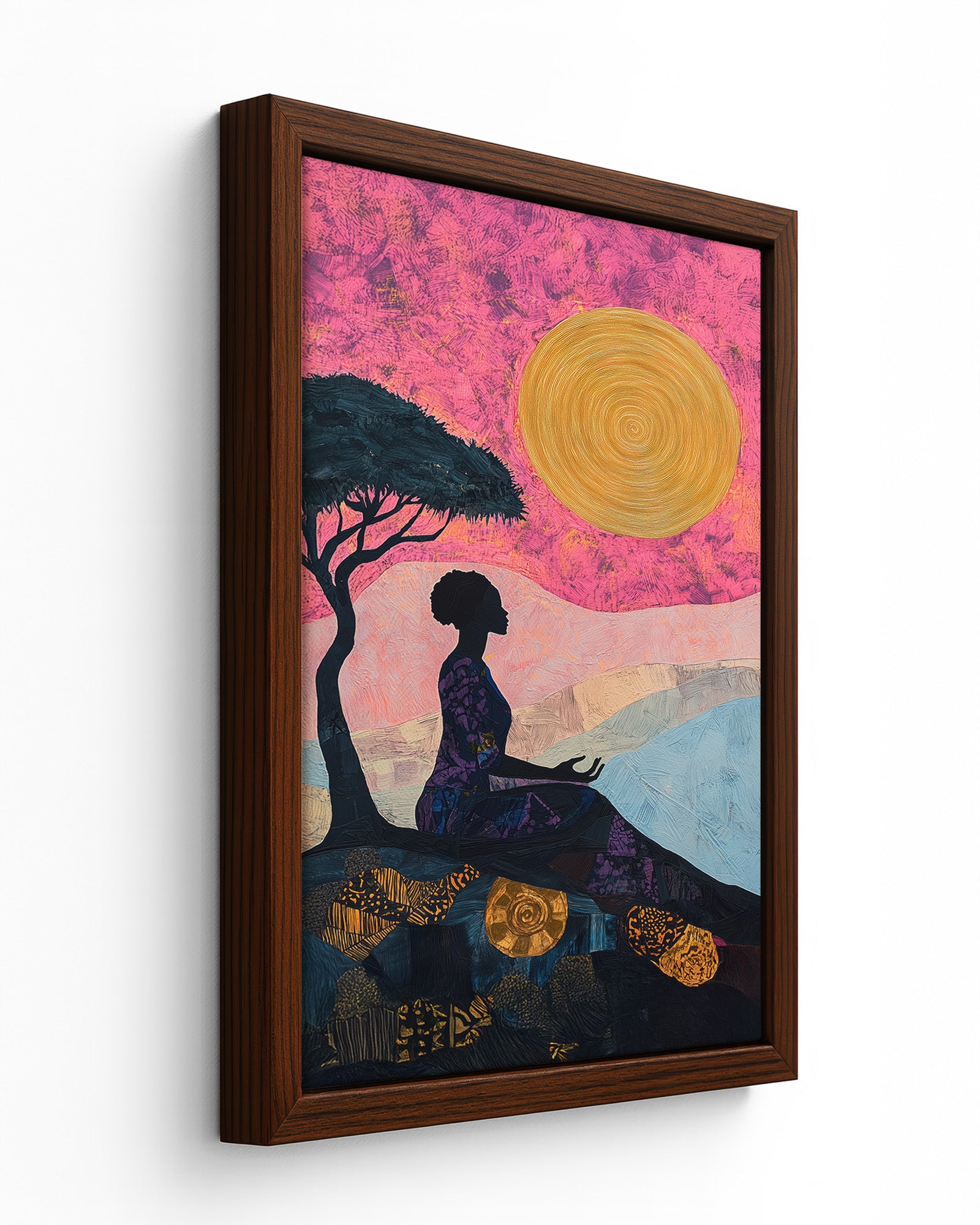 Experience the mystical beauty of an African woman meditating under a glowing baobab tree. Her vibrant aura spirals into the cosmos with tribal patterns, blending earthy tones, radiant blues, and pinks.