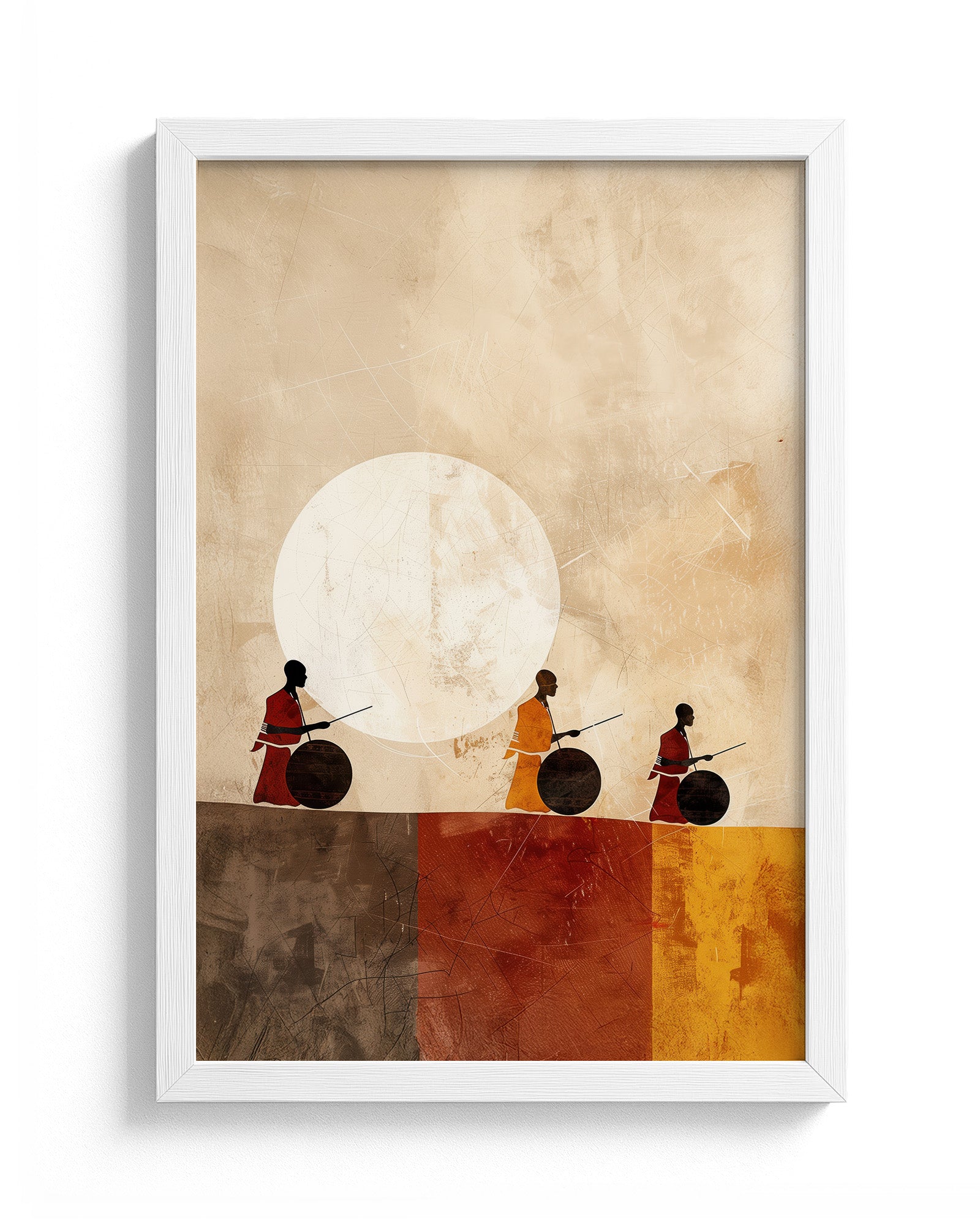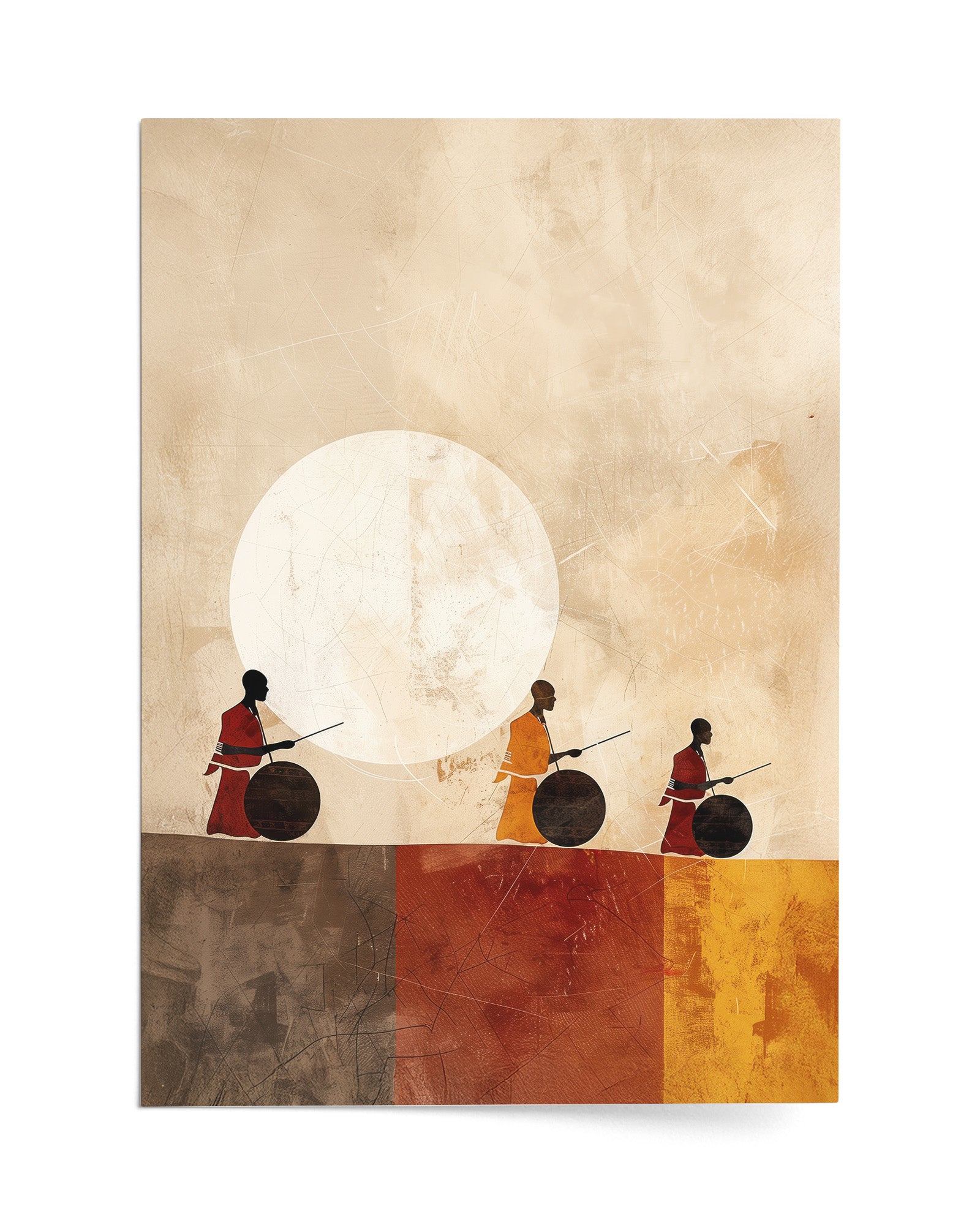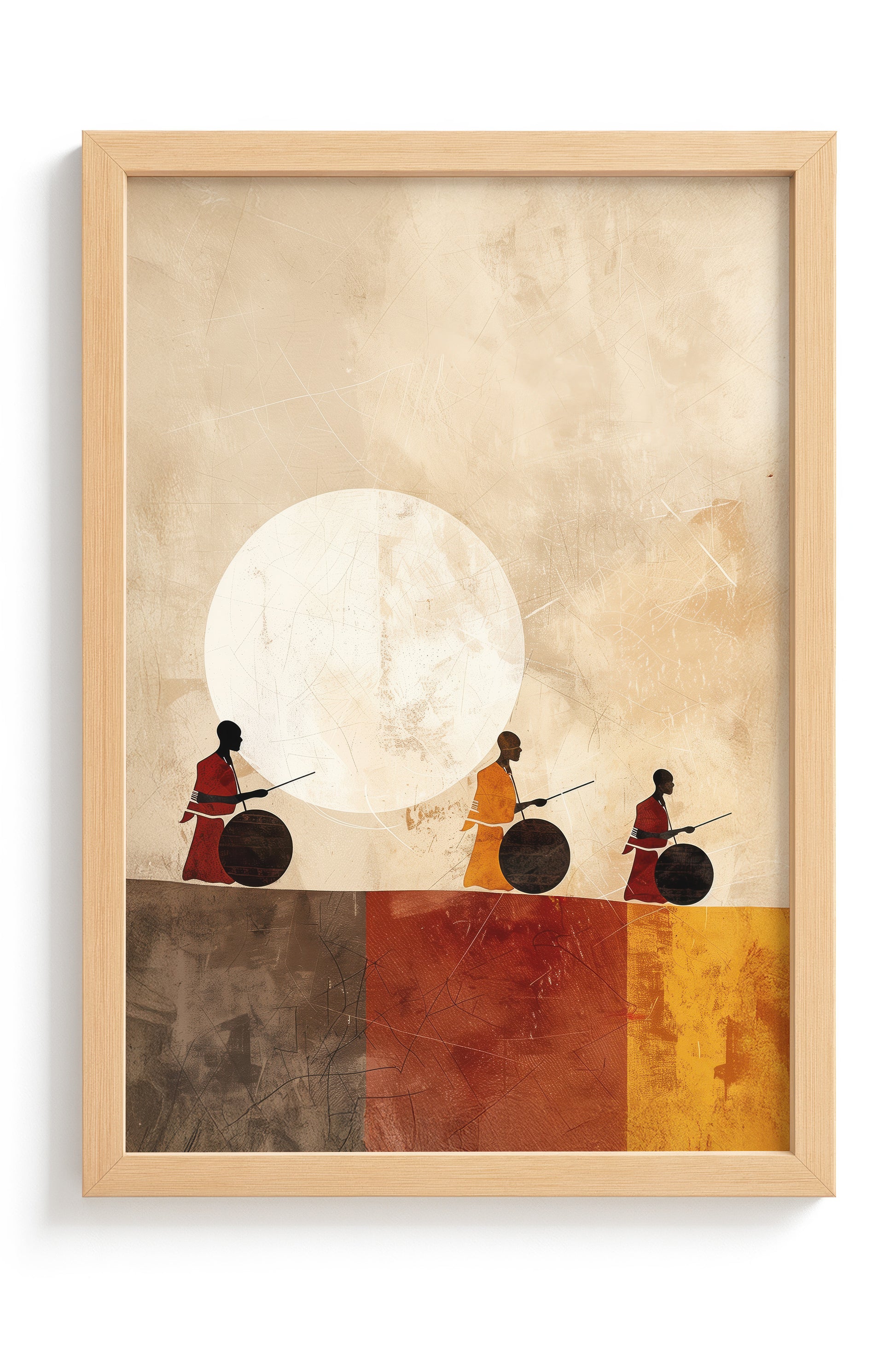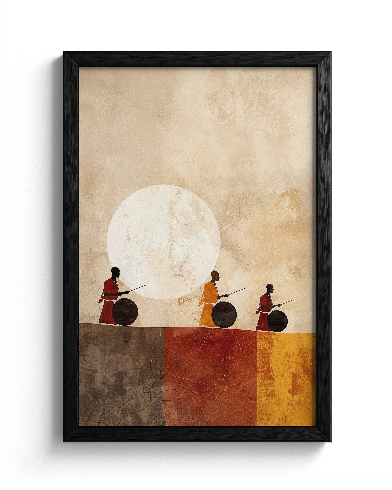 Immerse yourself in the soulful rhythm of African heritage with this minimalist art piece. Featuring a serene scene of drummers in muted earth tones, the artwork captures subtle motion and cultural celebration in an elegant, understated style.