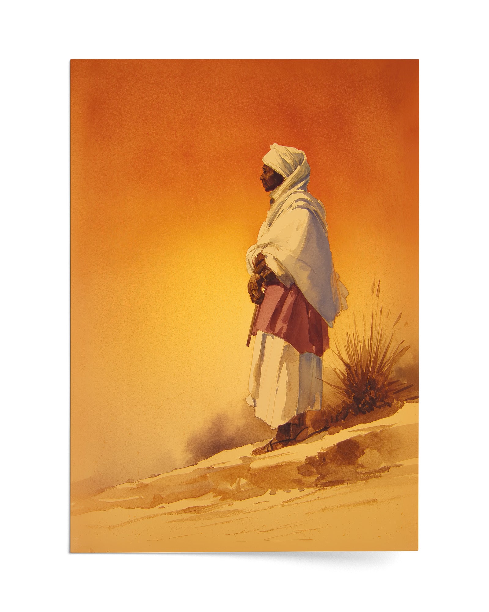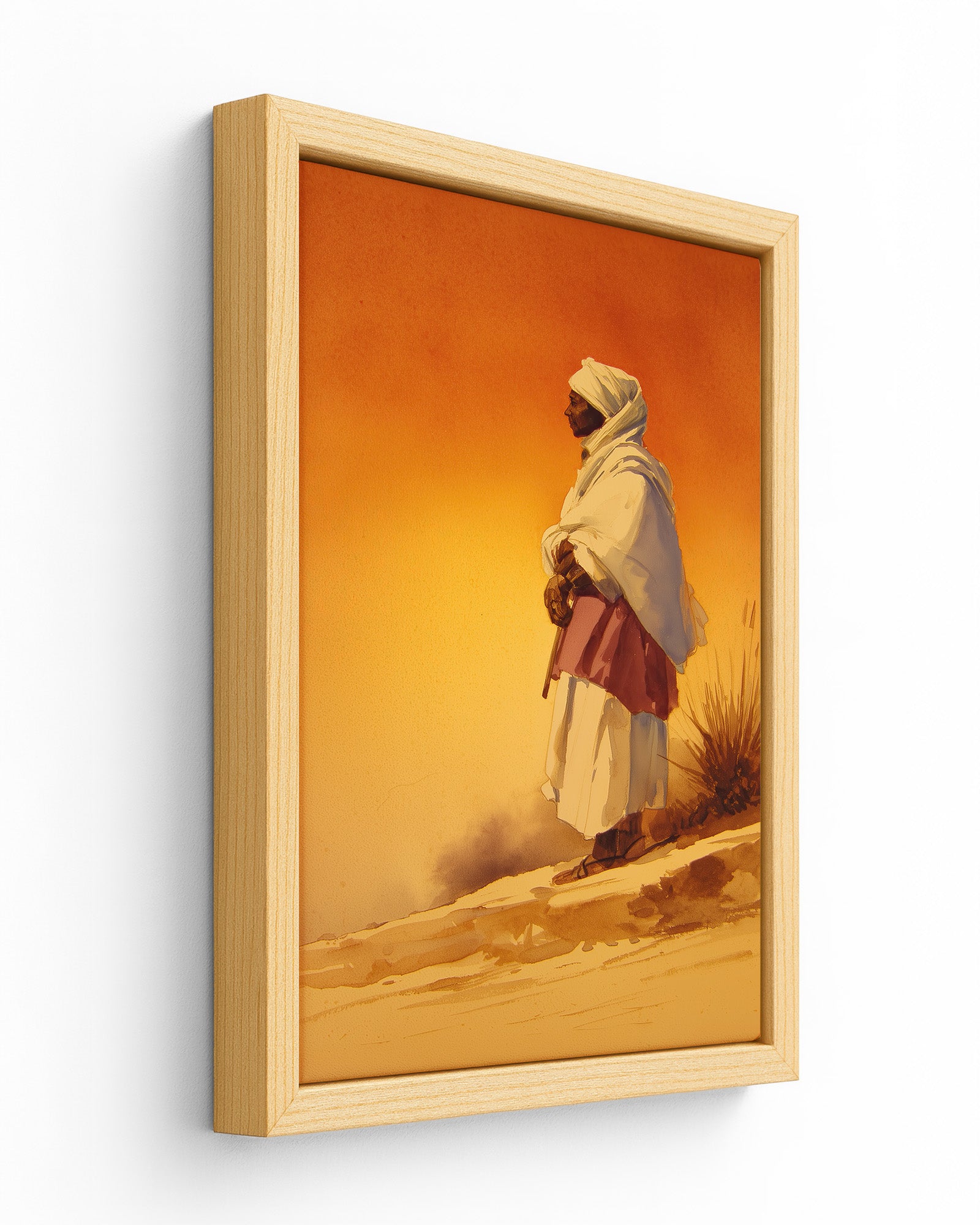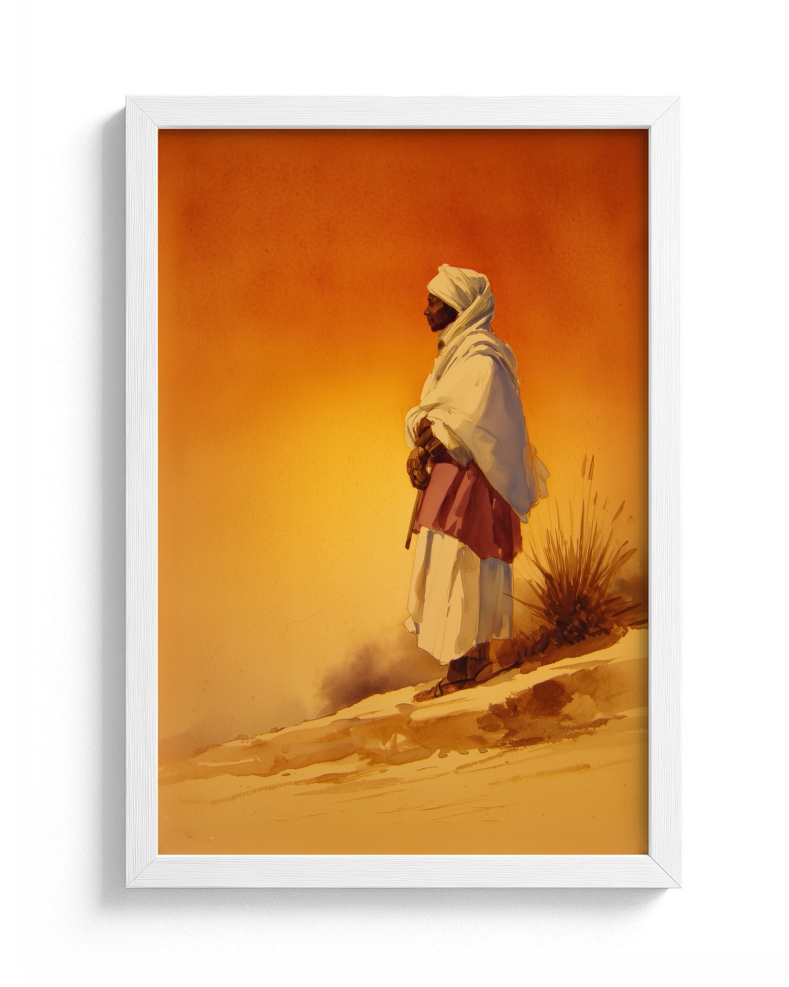 Wrapped in soft white cloth, a woman stands quietly on a rocky hillside as the warm light of the horizon surrounds her. The minimal composition and gentle brushwork capture a moment of quiet devotion and reflection. Set against distant mountains and a glowing sky, the piece evokes themes of faith, resilience, and the calm strength found in stillness.