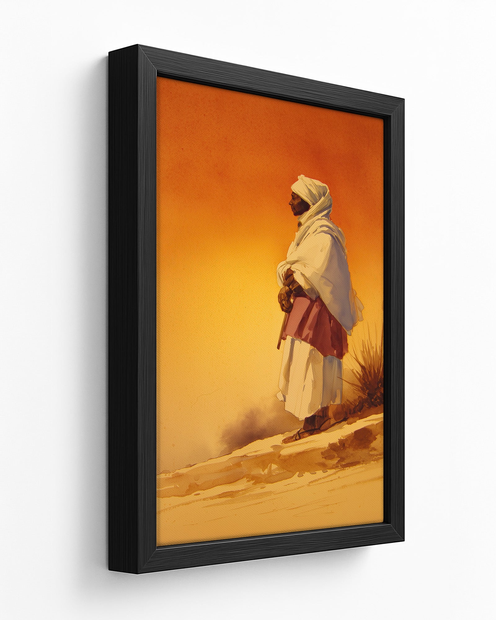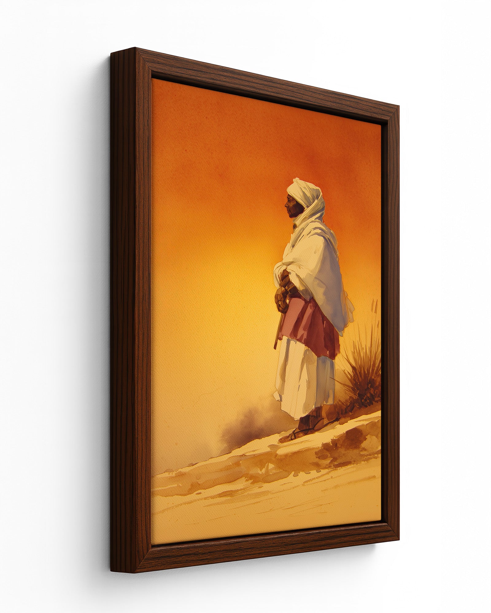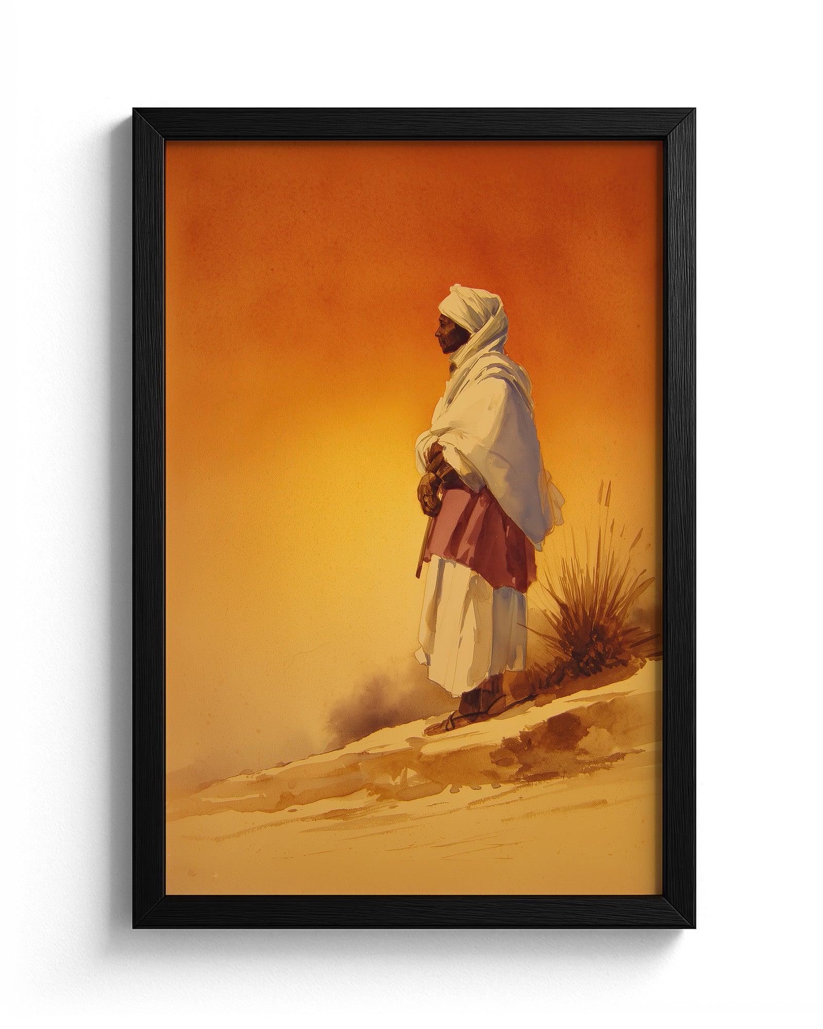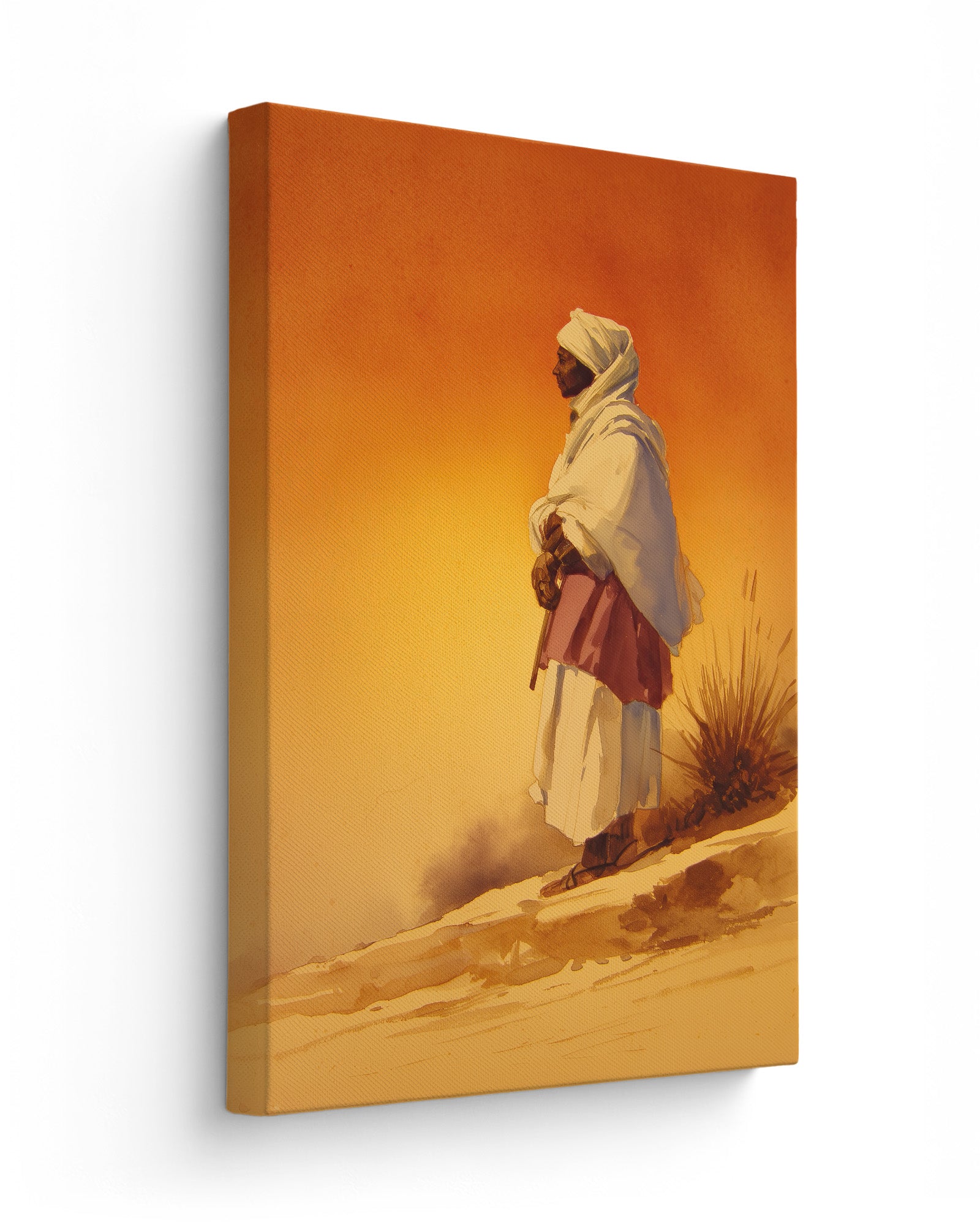 Wrapped in soft white cloth, a woman stands quietly on a rocky hillside as the warm light of the horizon surrounds her. The minimal composition and gentle brushwork capture a moment of quiet devotion and reflection. Set against distant mountains and a glowing sky, the piece evokes themes of faith, resilience, and the calm strength found in stillness.