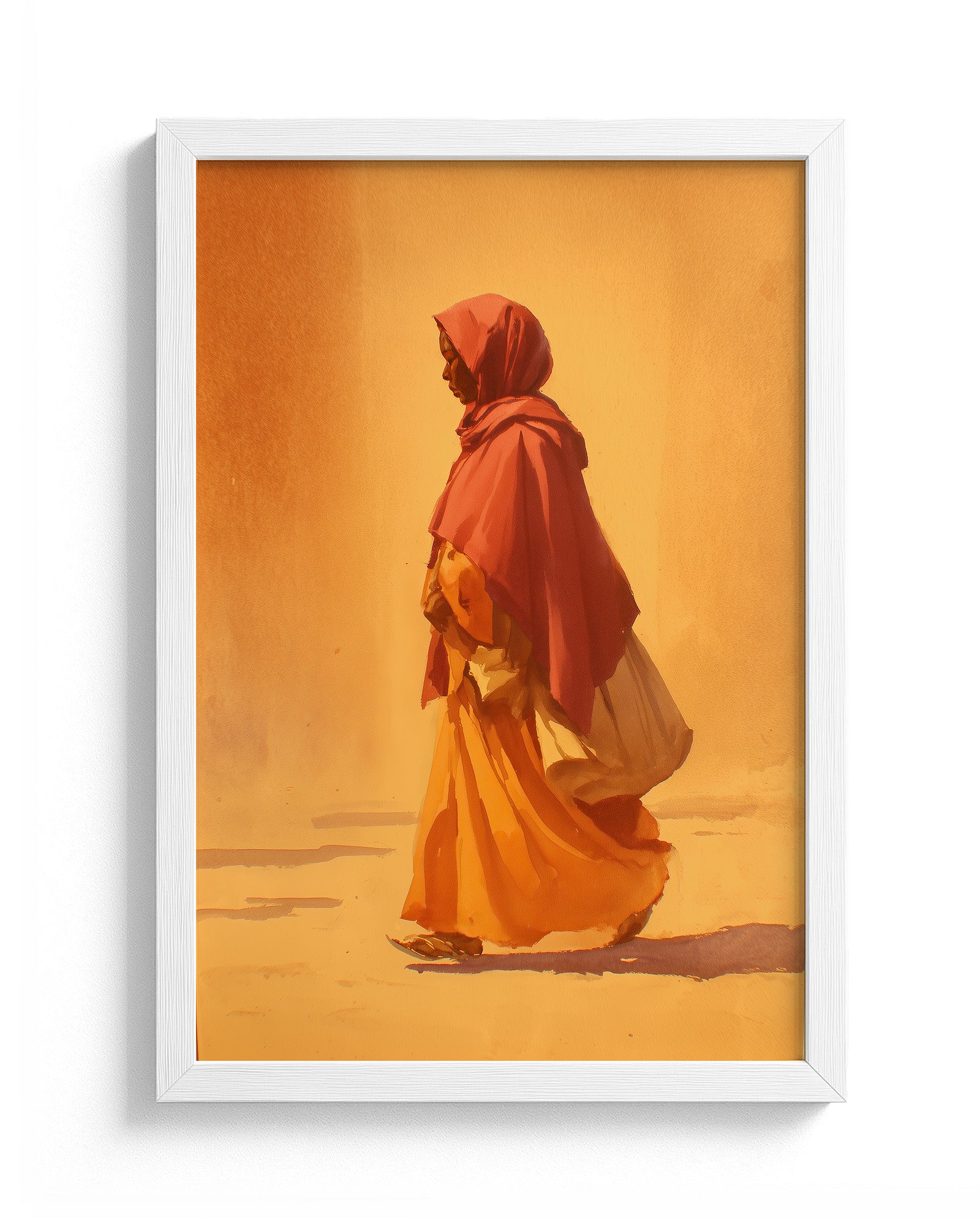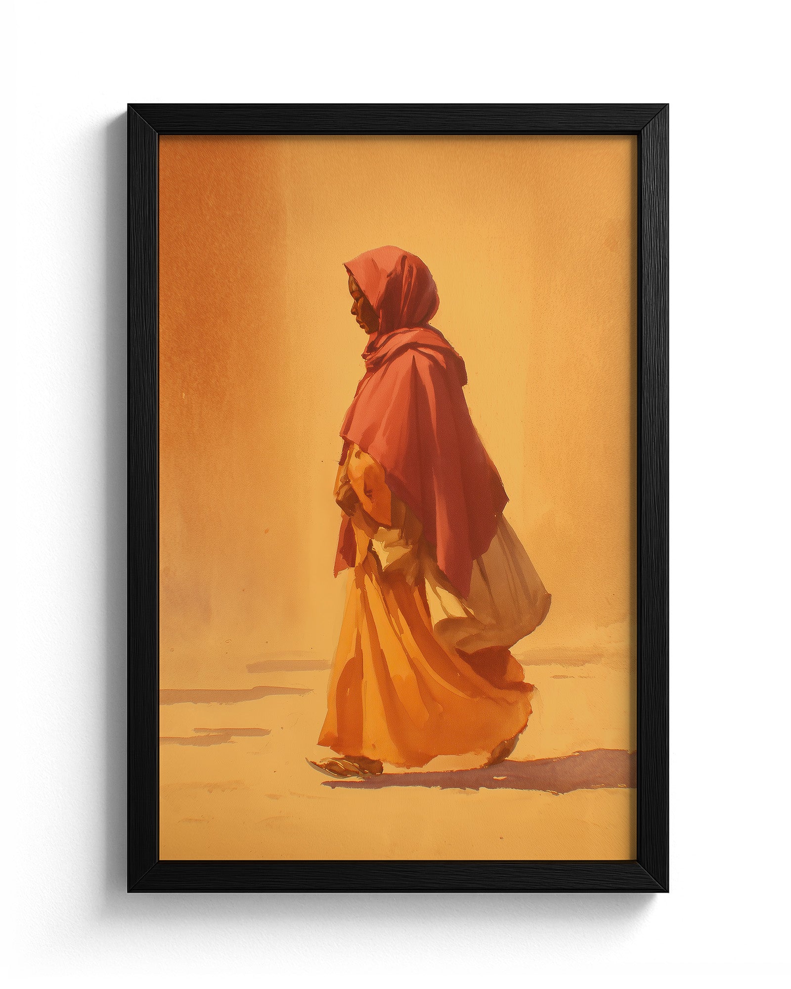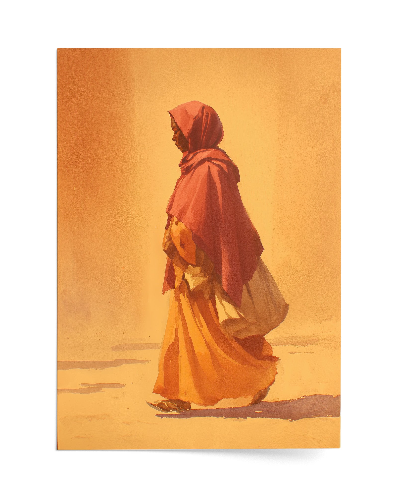 A woman walks quietly through a landscape bathed in warm morning light, her flowing garments moving gently with each step. The minimal composition and soft brushwork create a sense of calm and movement, capturing a moment of quiet purpose. The piece reflects themes of journey, resilience, and the everyday rhythms of life.