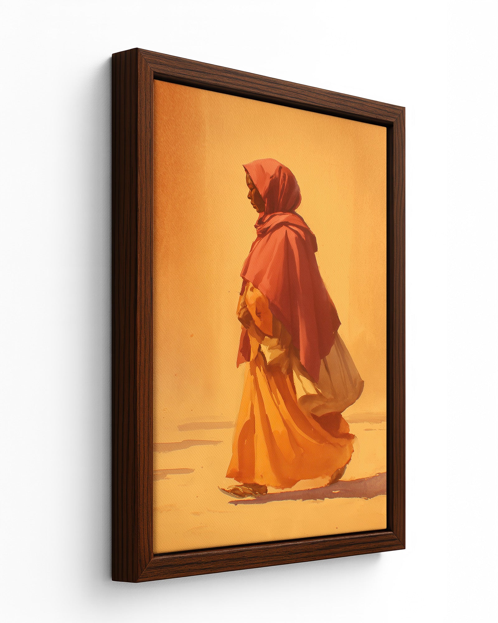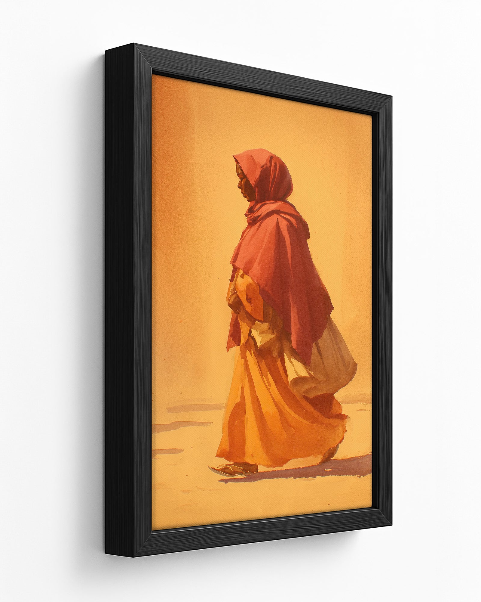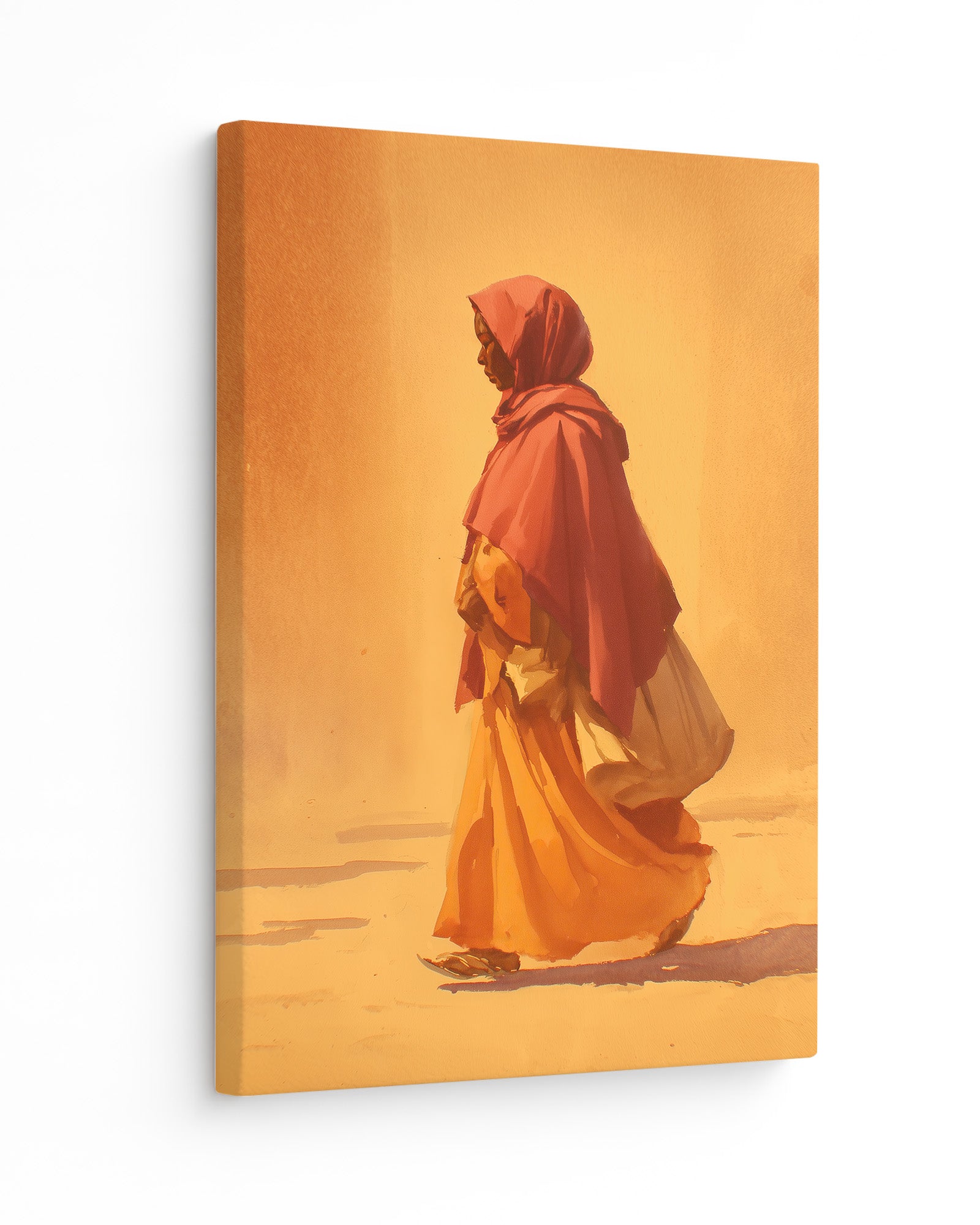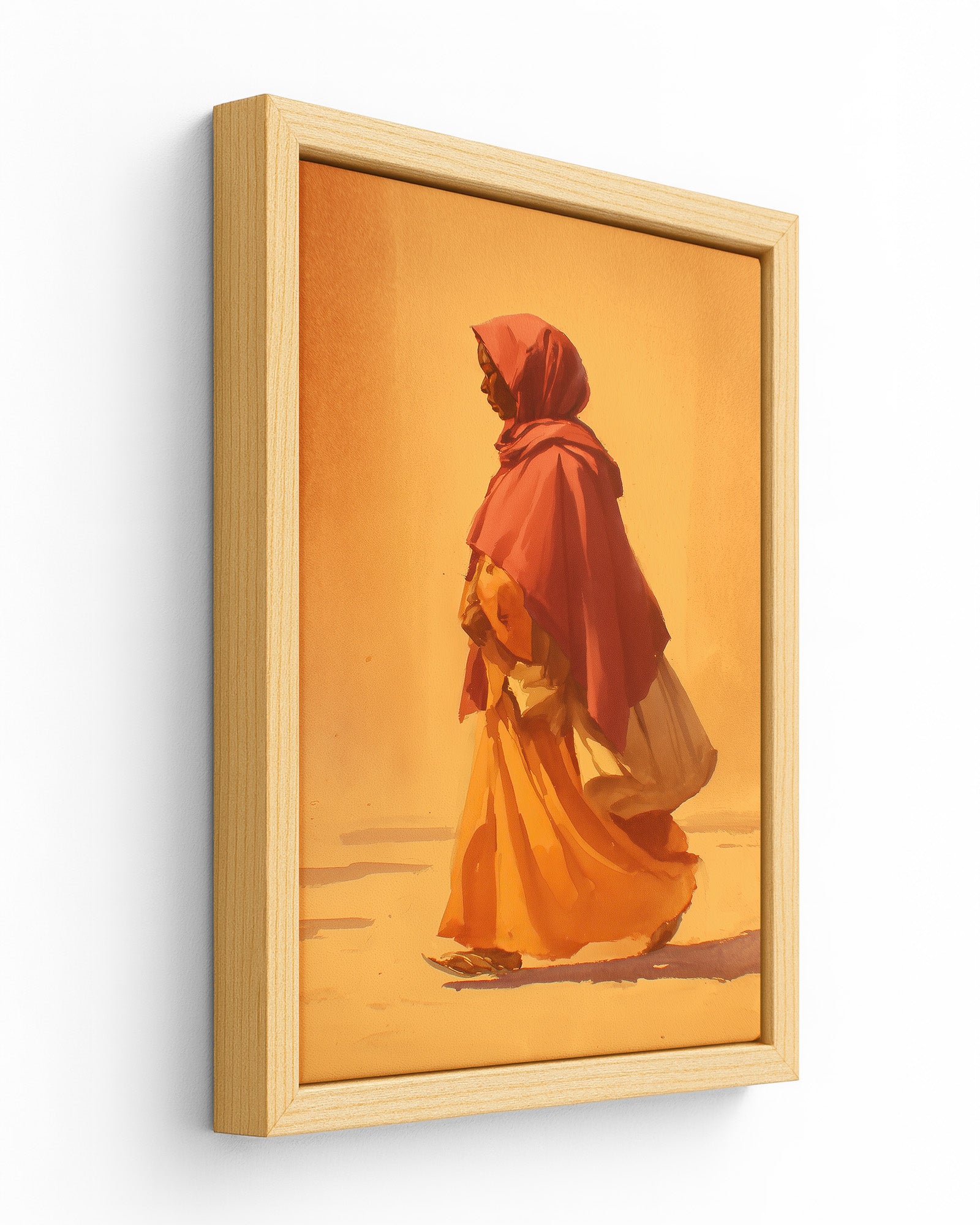 A woman walks quietly through a landscape bathed in warm morning light, her flowing garments moving gently with each step. The minimal composition and soft brushwork create a sense of calm and movement, capturing a moment of quiet purpose. The piece reflects themes of journey, resilience, and the everyday rhythms of life.