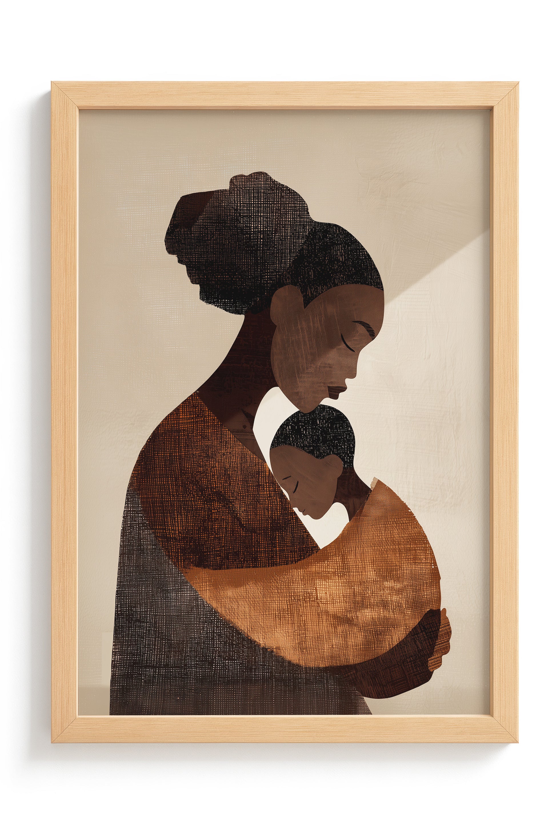 "African Motherhood Portraiture: The Sacred Bond Between Mother and Child in Contemporary Ghanaian Art" celebrates the profound spiritual, emotional, and cultural significance of the mother-child relationship as foundational to African family structures and cultural continuity. This powerful artwork depicts a mother and child rendered in overlapping profile silhouettes against a warm neutral background that emphasizes their intimate physical and emotional connection.