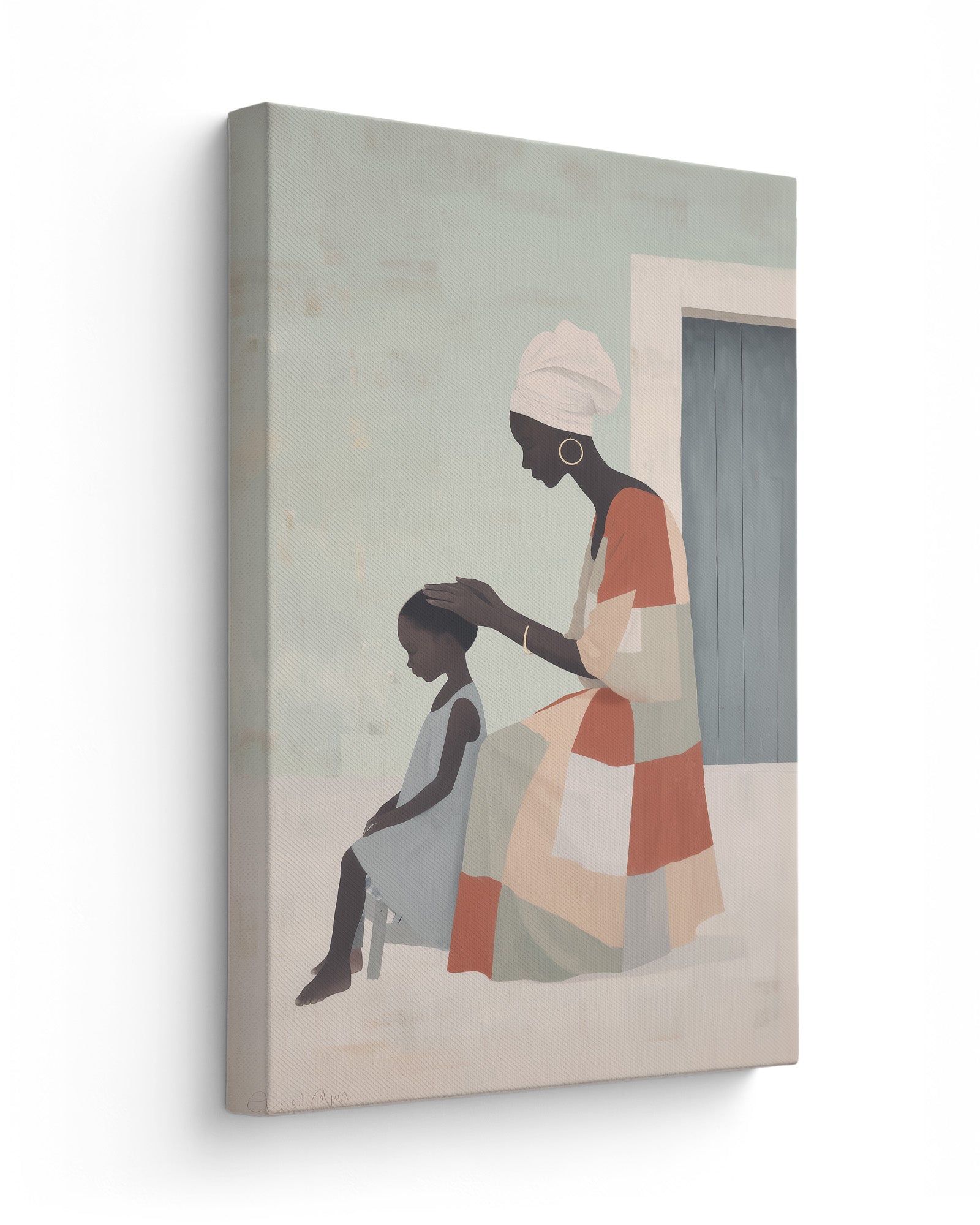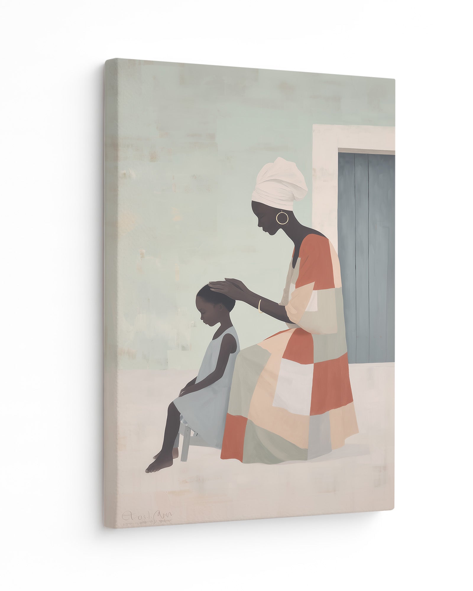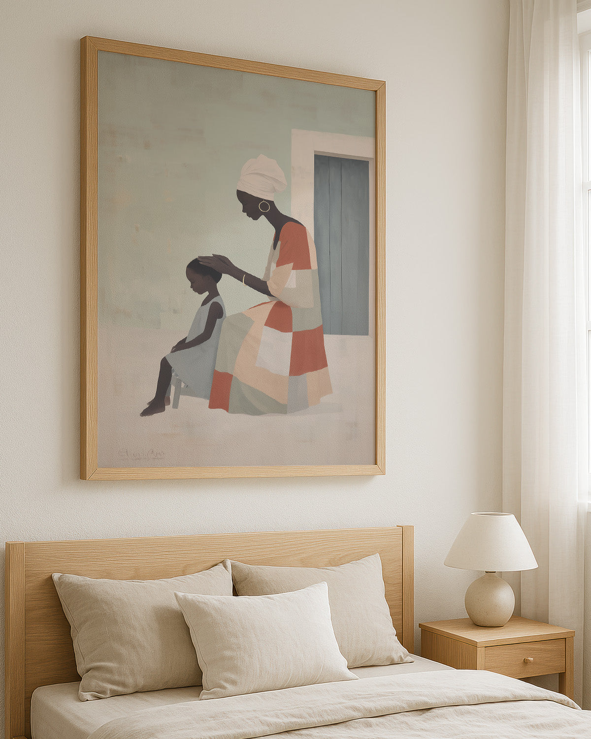Mothers Touch: Contemporary Art on Maternal Devotion, Hair Care Tradition, and Generational Knowledge. This powerful piece explores how mothers practice hair care as act of love and responsibility, transforming living room or bedroom into space where cultural tradition lives through hands and oil. The ease between them and the evident focus suggest that this is rooted in deep maternal knowledge and commitment to daughters' wellbeing, a way of saying your hair is part of your heritage and I will care for it with reverence, and that home is where daughters learn that their crowns deserve this kind of consistent, loving attention.