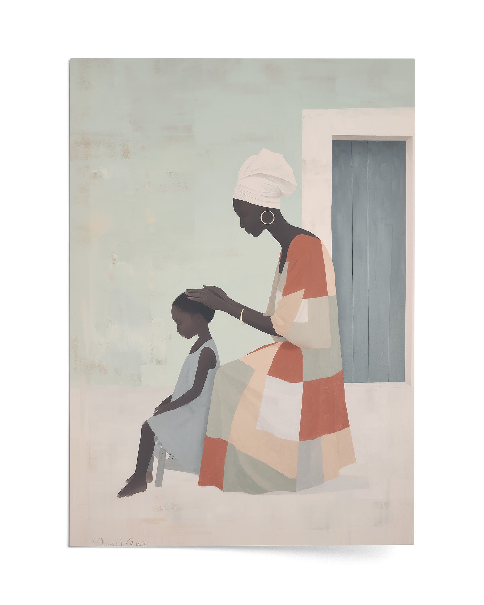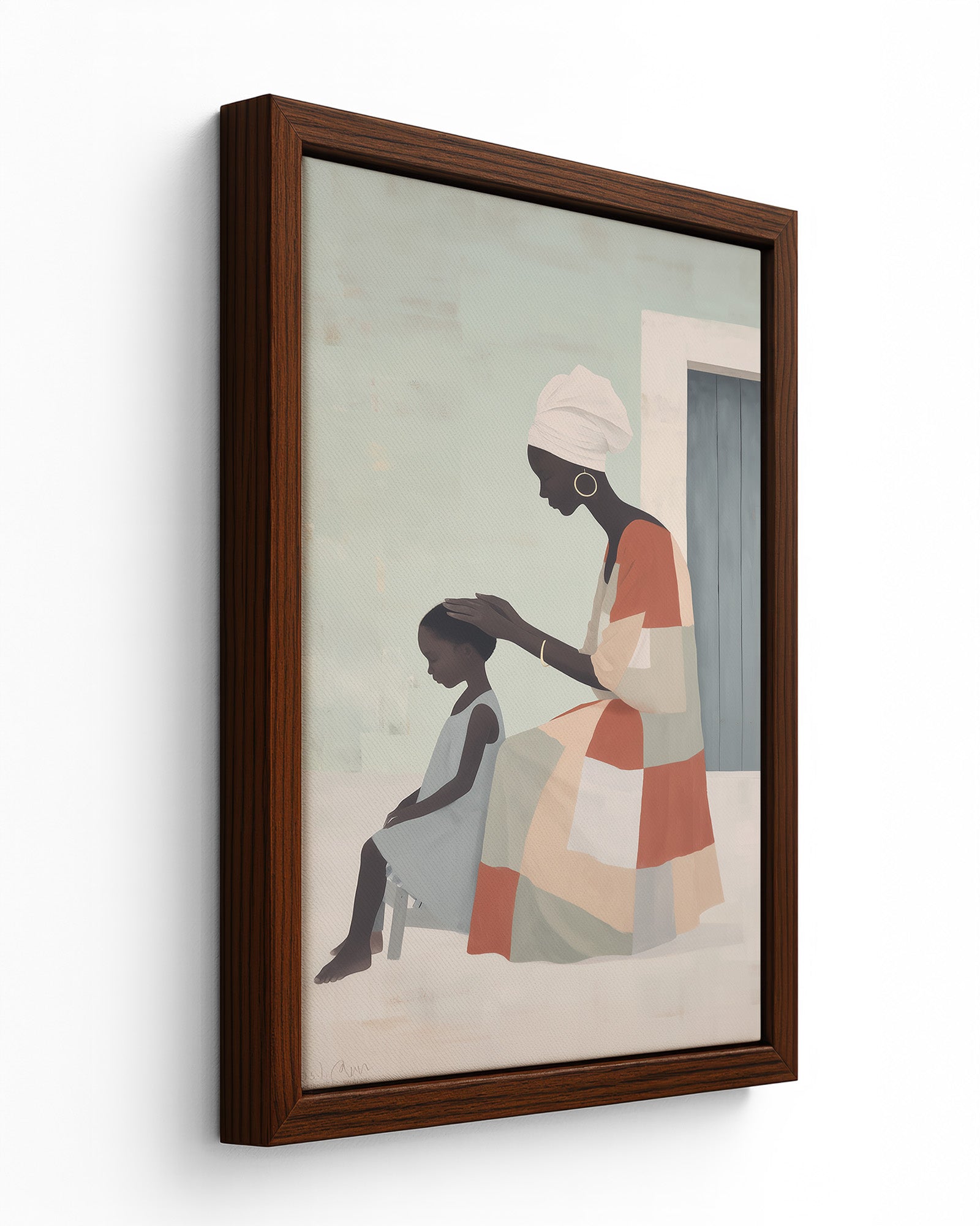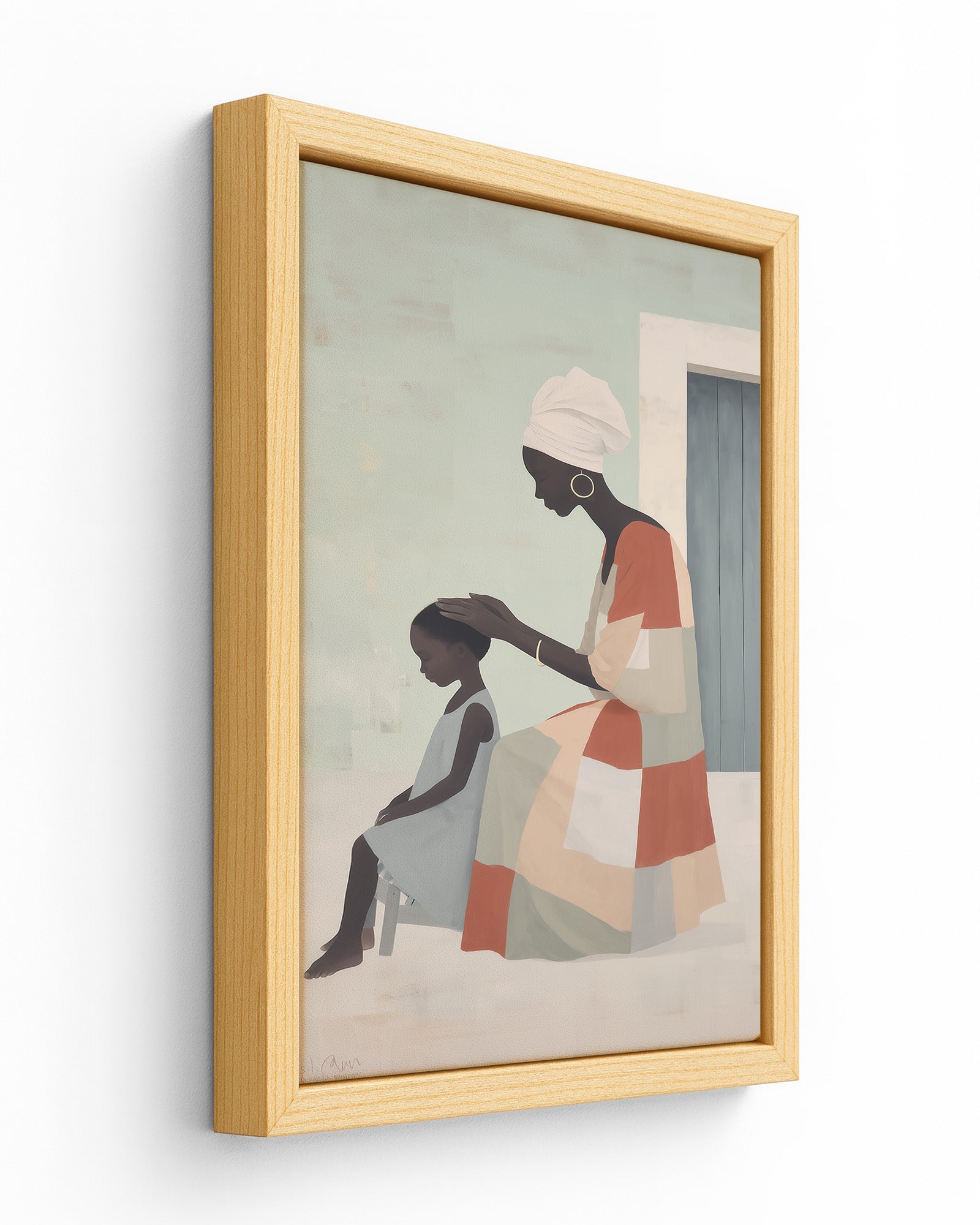 Mothers Touch: Contemporary Art on Maternal Devotion, Hair Care Tradition, and Generational Knowledge. This powerful piece explores how mothers practice hair care as act of love and responsibility, transforming living room or bedroom into space where cultural tradition lives through hands and oil. The ease between them and the evident focus suggest that this is rooted in deep maternal knowledge and commitment to daughters' wellbeing, a way of saying your hair is part of your heritage and I will care for it with reverence, and that home is where daughters learn that their crowns deserve this kind of consistent, loving attention.
