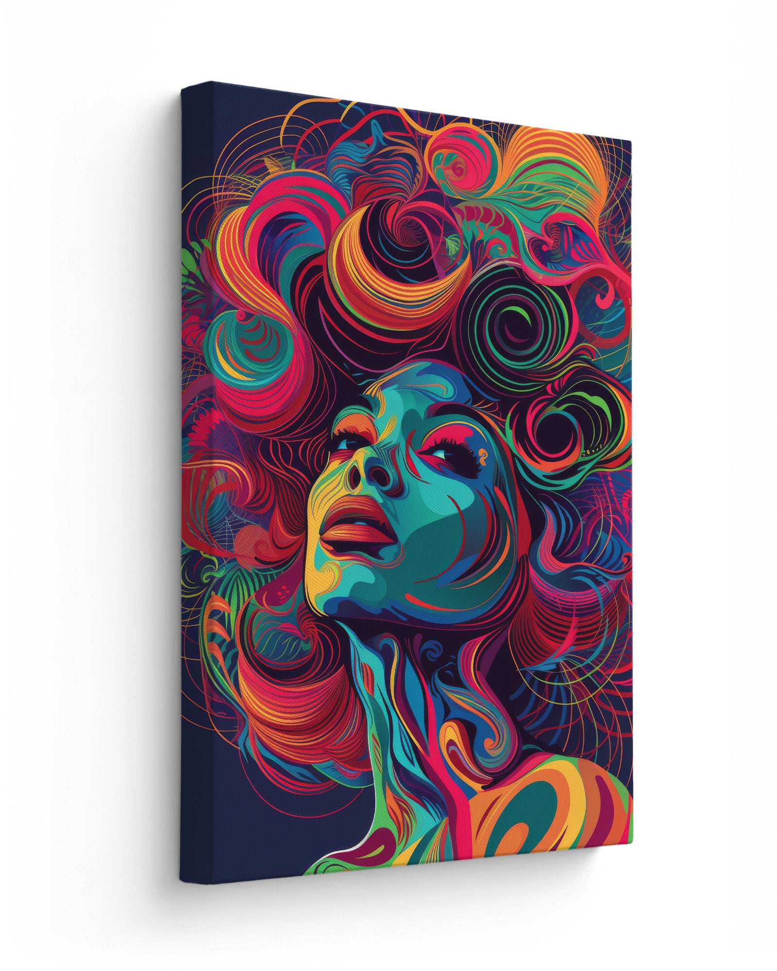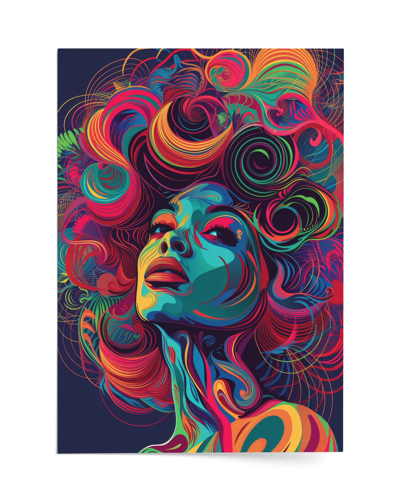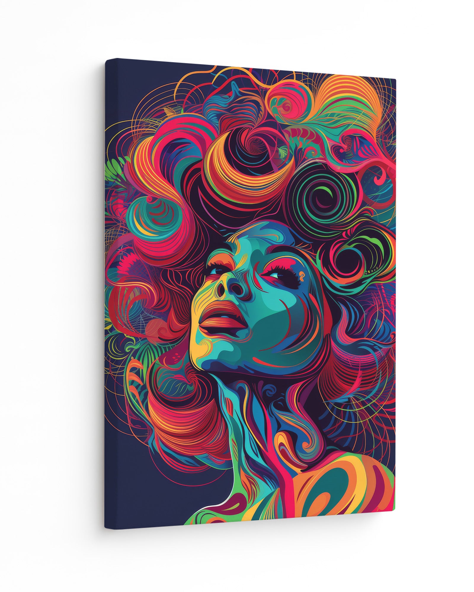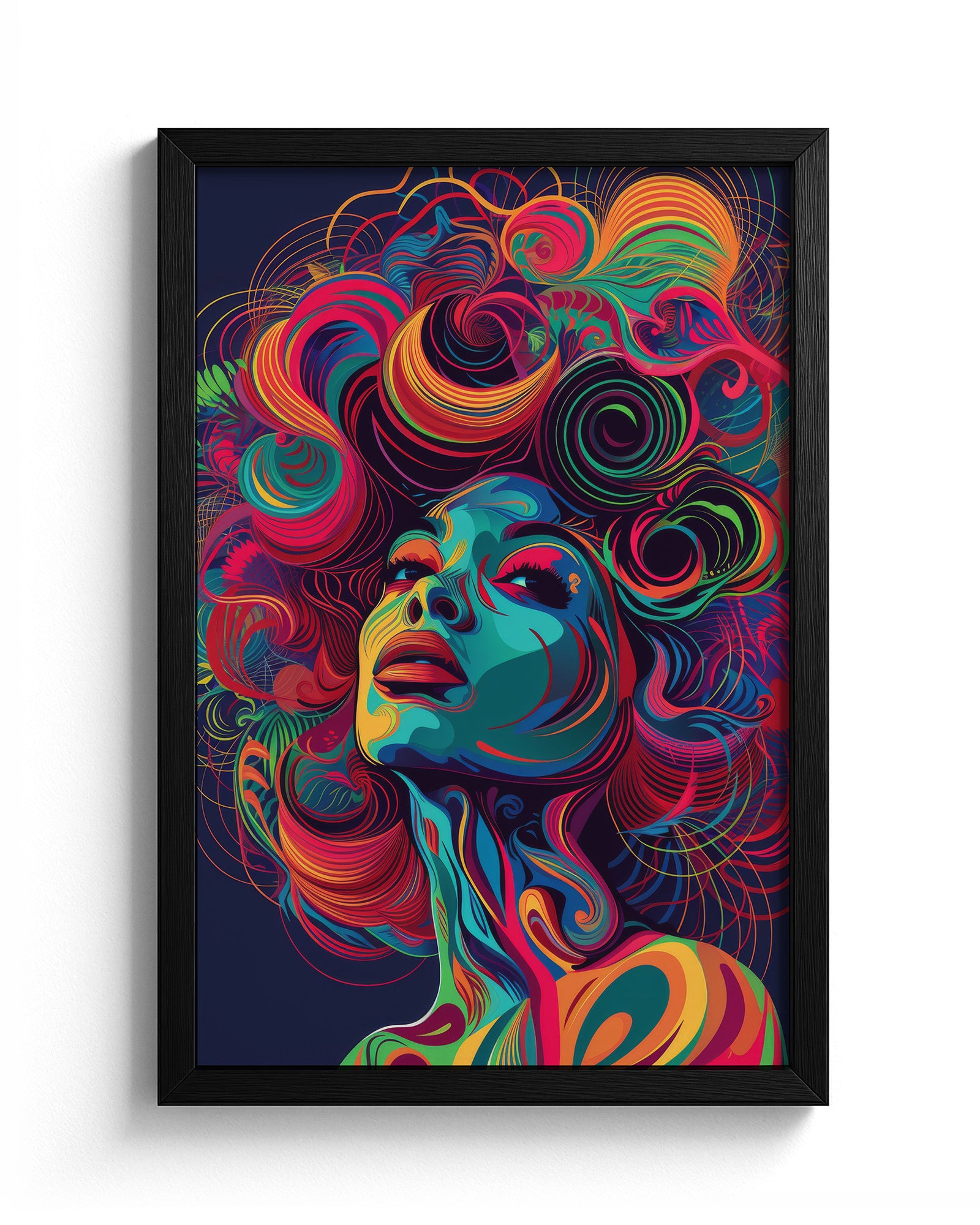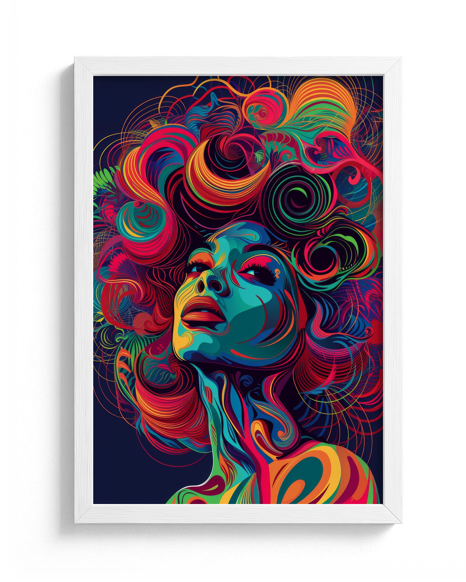 Illuminate your space with the vibrant energy of our Woman with Neon Hair Oil Painting. This striking artwork captures the essence of modern beauty and cultural pride, featuring a woman with vividly colourful neon hair set against a deep black background.