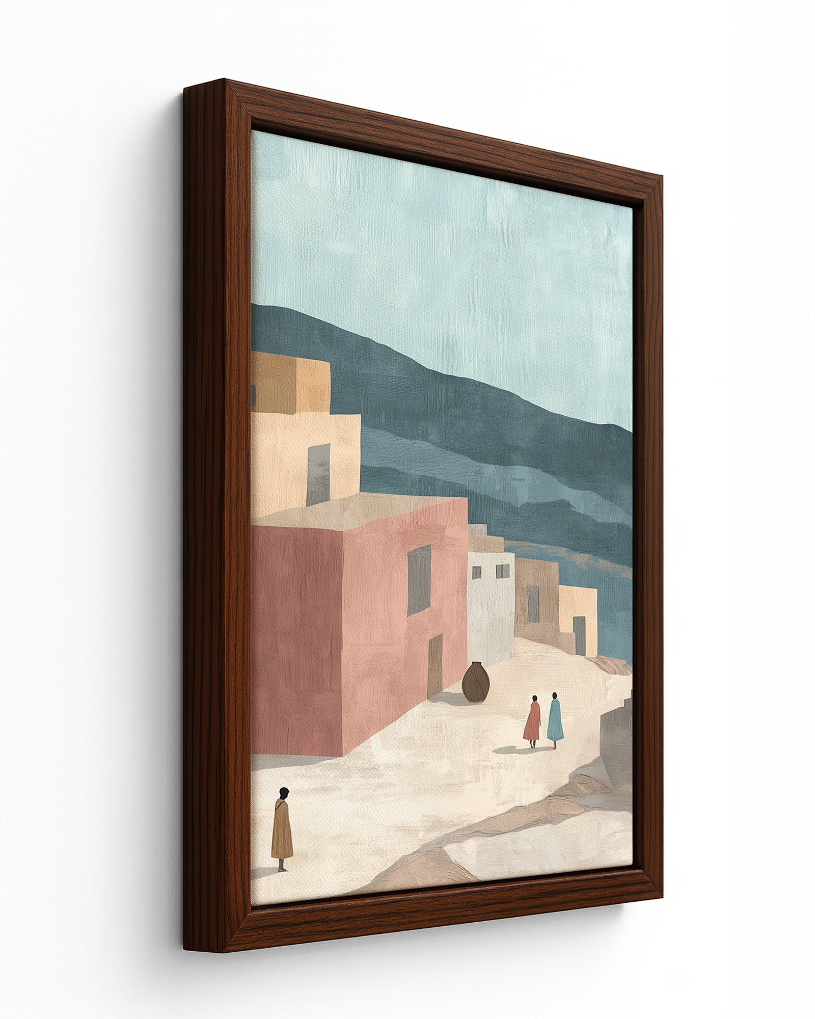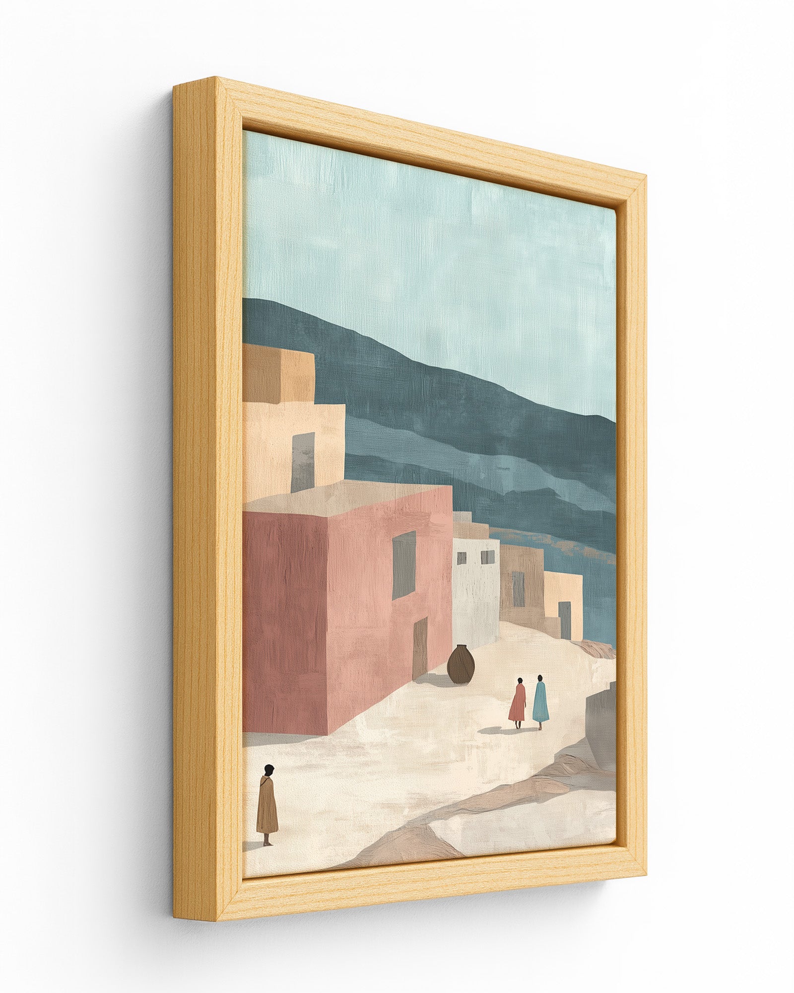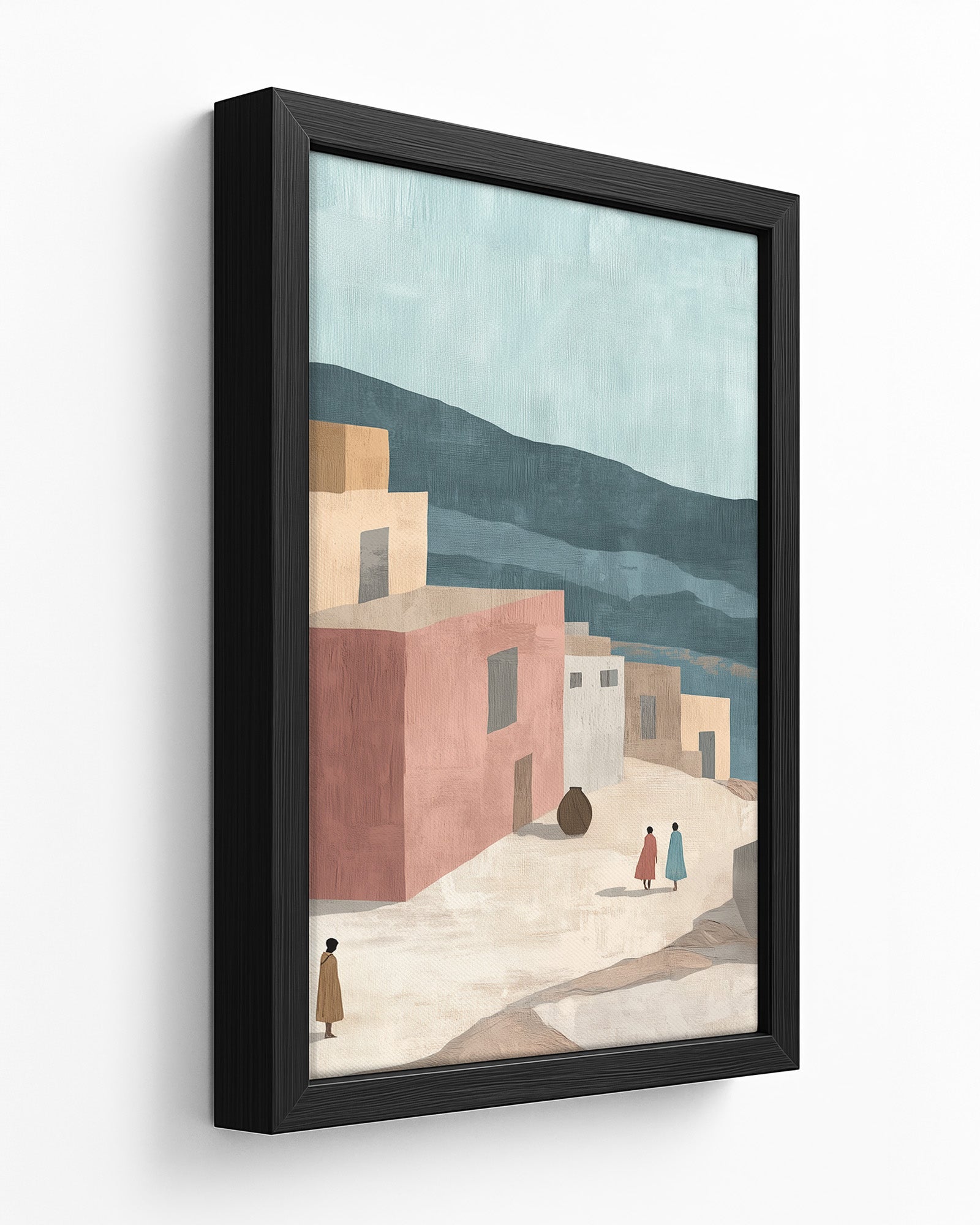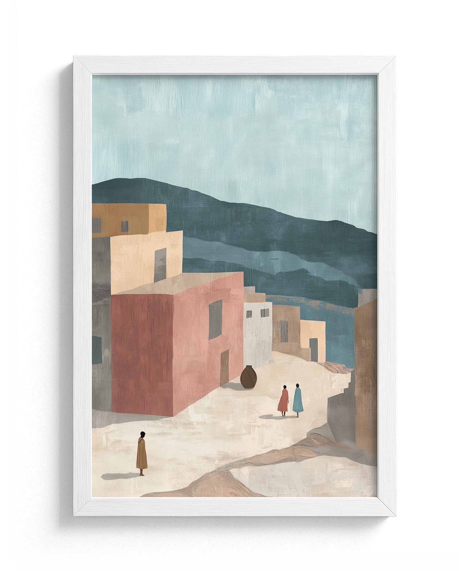 Bring the soul of Addis Ababa into your home with this minimalist wall art. Featuring muted tones of terracotta, sandy beige, and warm grey, this piece captures the essence of a simplified ancient Ethiopian street.